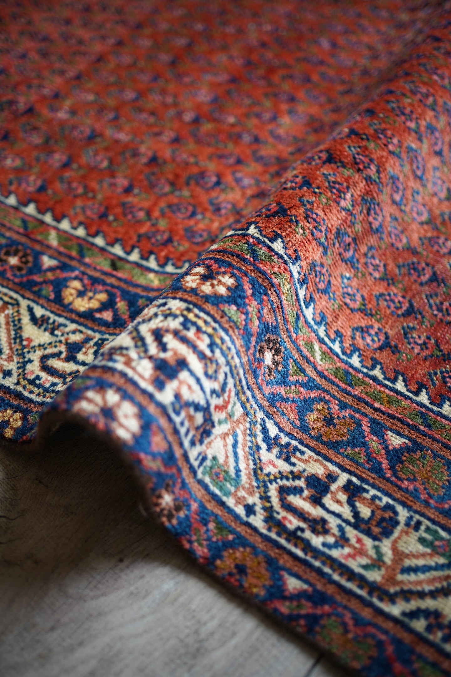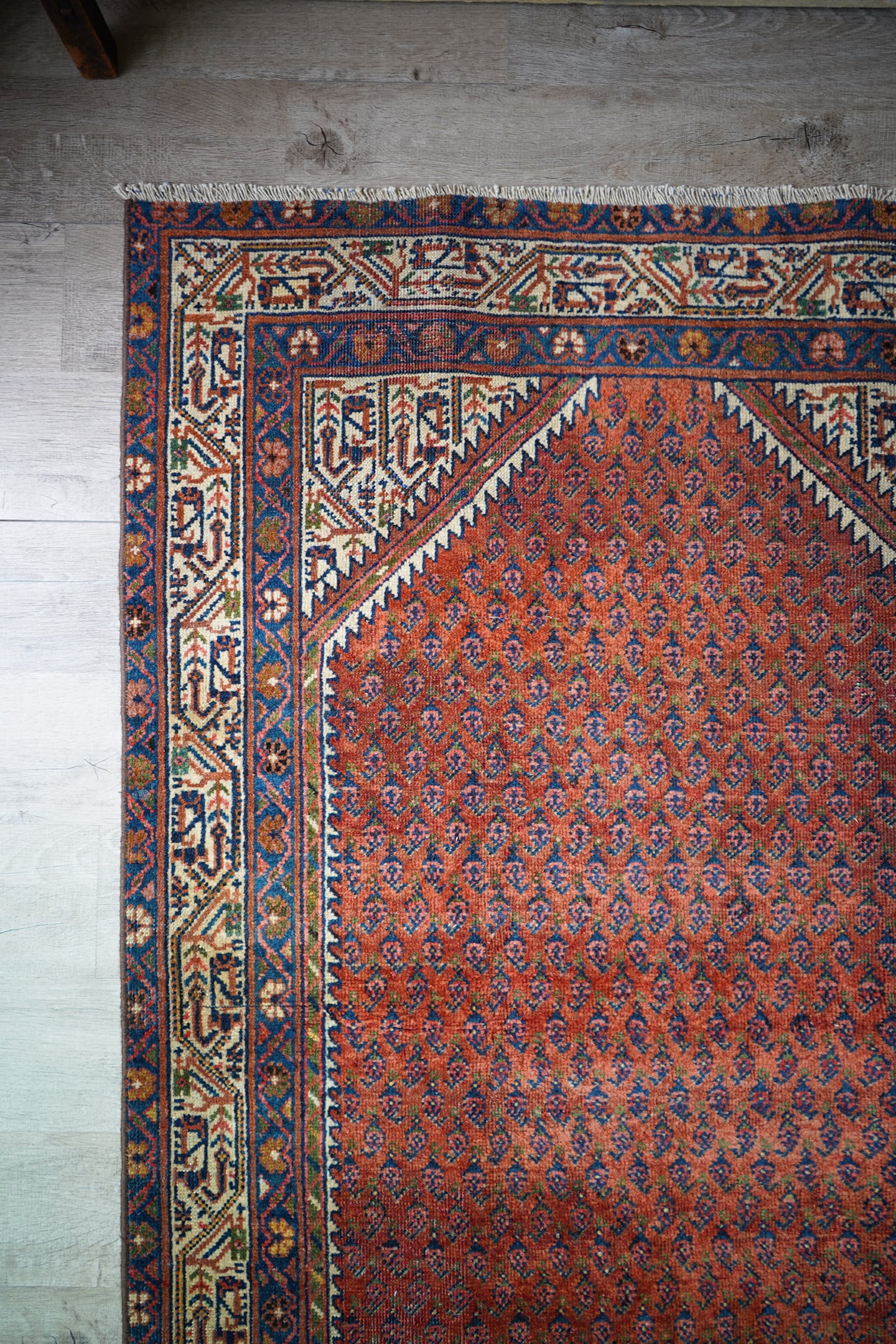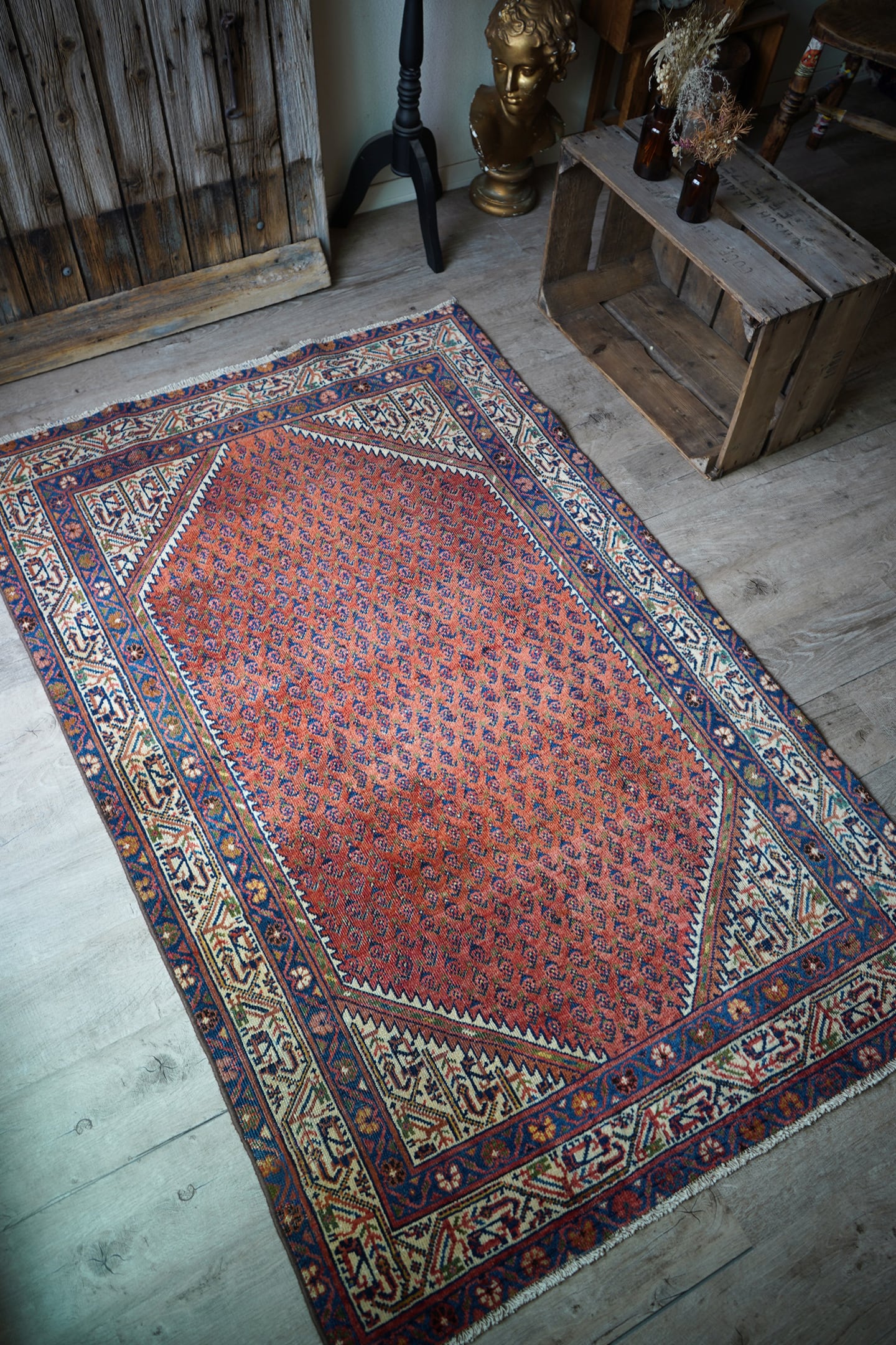 イラン中西部のアラークの南西にあるセラバンド地域で作られた経年約60年のヴィンテージラグ。セラバンドは町や村の名ではなく、山間の地域を指す名称です。ボテ(ペイズリー)文様を簡素化したとされる"ミール文様(松ぼっくり)"がフィールド一面に配されたデザイン。淡いピンクにも見える退色したような柔らかい赤色をしており、その他ホワイトベージュやピンクベージュ、モスグリーンなどの優しい色合いが非常に素敵です。またパイル全体に美しい艶も見受けられます。パイルは低めですが、毛並みも少し残っているため表面はサラサラとしつつも、ほんのりフワっとしたしなやかさを持ち合わせているため、通年で快適に敷ける質感かと思います。厚みは6mmほど。コンディションとしては1箇所補修した跡がありますが、言われてみないとわからないほど綺麗に修理されています。全体的には状態も大変良好な一枚です。リビングや寝室などお好きなスペースにどうぞ♫