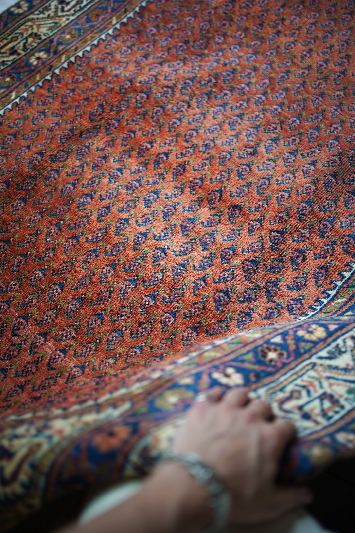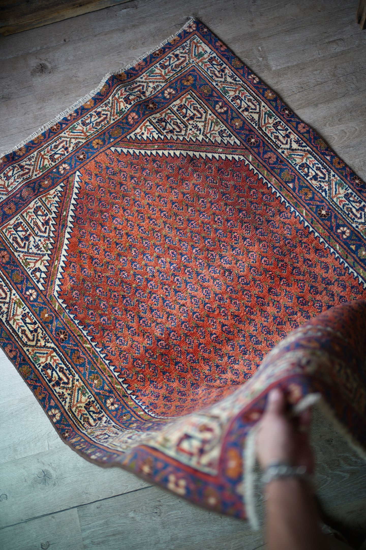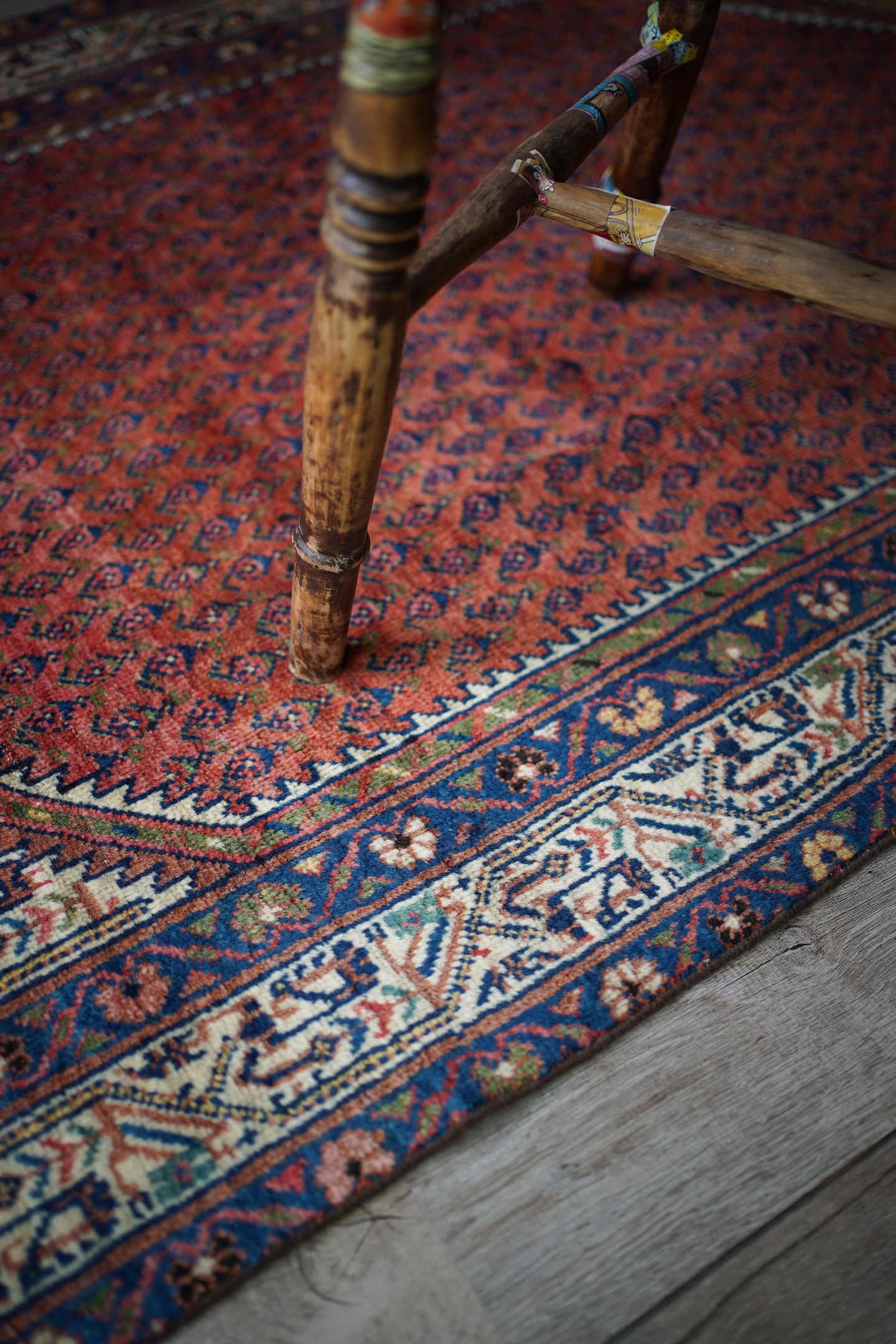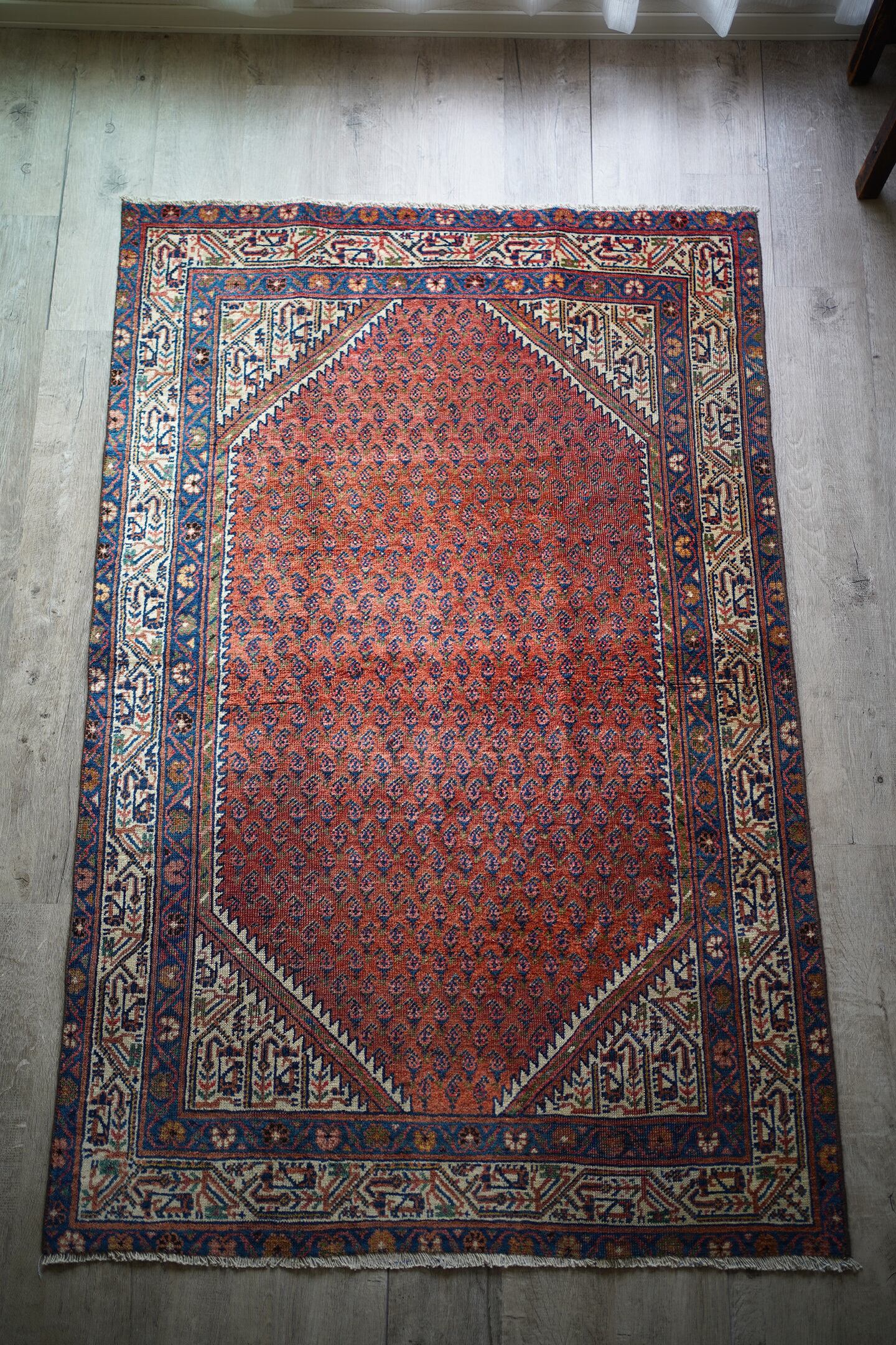 イラン中西部のアラークの南西にあるセラバンド地域で作られた経年約60年のヴィンテージラグ。セラバンドは町や村の名ではなく、山間の地域を指す名称です。ボテ(ペイズリー)文様を簡素化したとされる"ミール文様(松ぼっくり)"がフィールド一面に配されたデザイン。淡いピンクにも見える退色したような柔らかい赤色をしており、その他ホワイトベージュやピンクベージュ、モスグリーンなどの優しい色合いが非常に素敵です。またパイル全体に美しい艶も見受けられます。パイルは低めですが、毛並みも少し残っているため表面はサラサラとしつつも、ほんのりフワっとしたしなやかさを持ち合わせているため、通年で快適に敷ける質感かと思います。厚みは6mmほど。コンディションとしては1箇所補修した跡がありますが、言われてみないとわからないほど綺麗に修理されています。全体的には状態も大変良好な一枚です。リビングや寝室などお好きなスペースにどうぞ♫