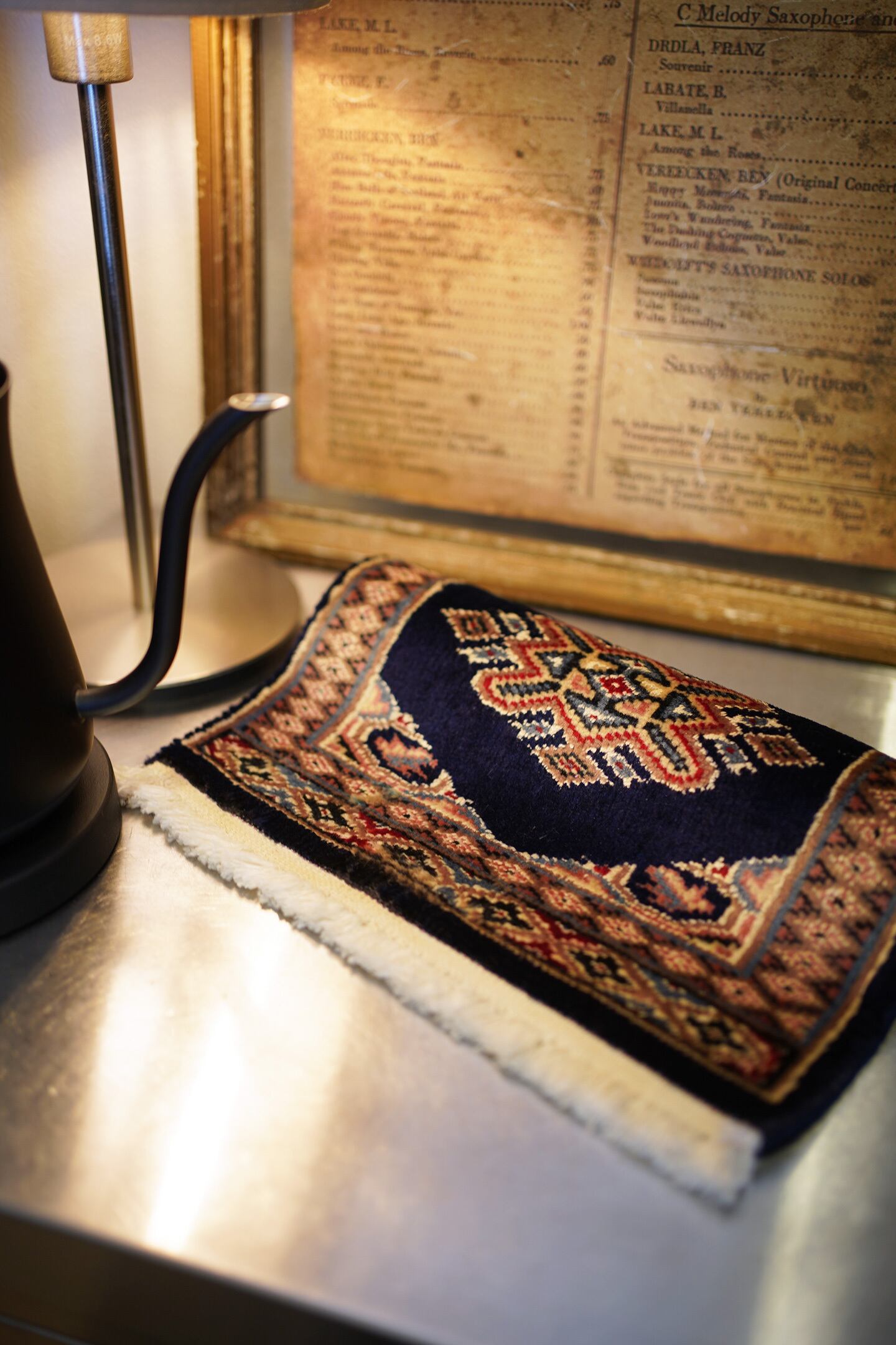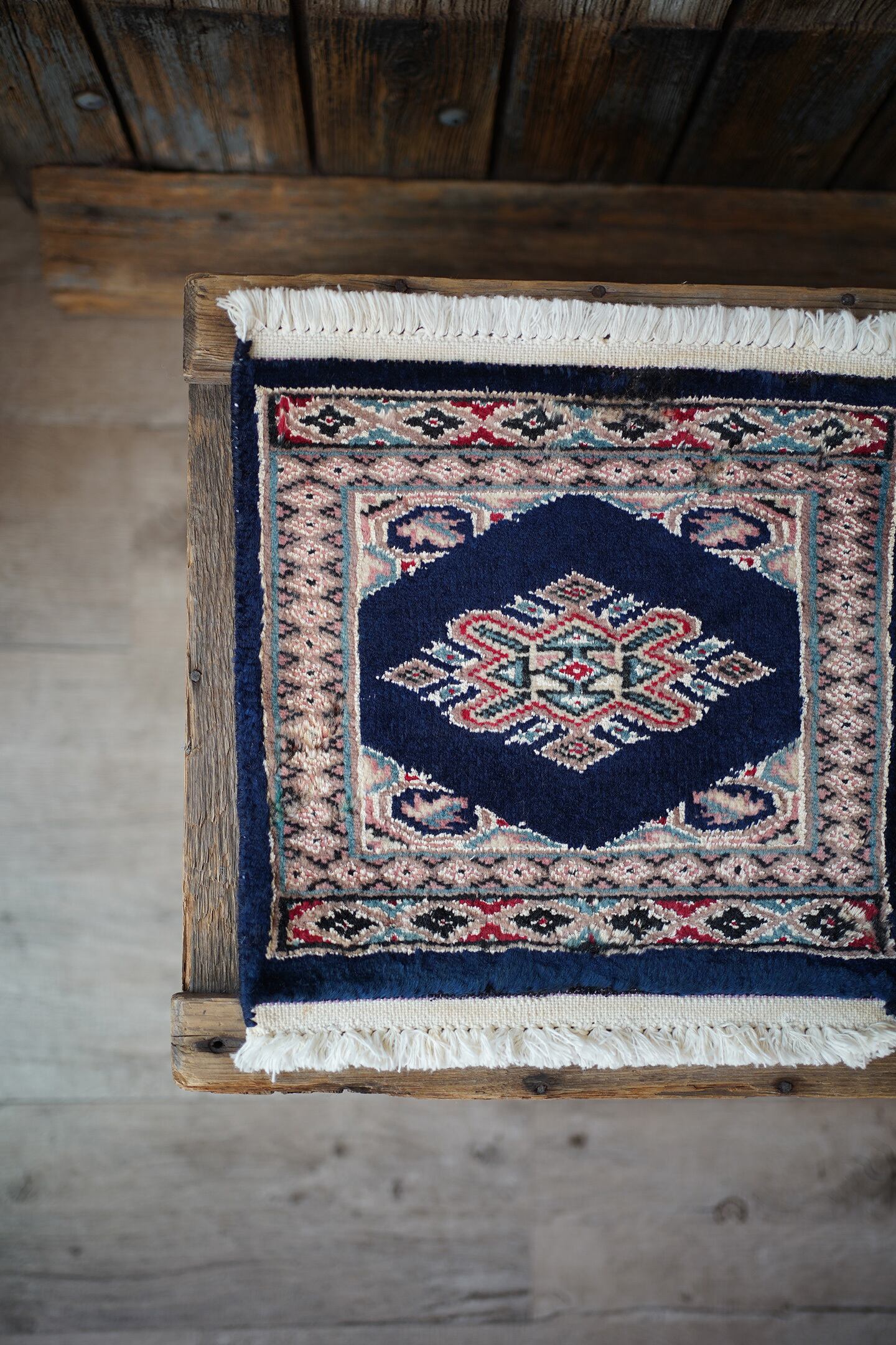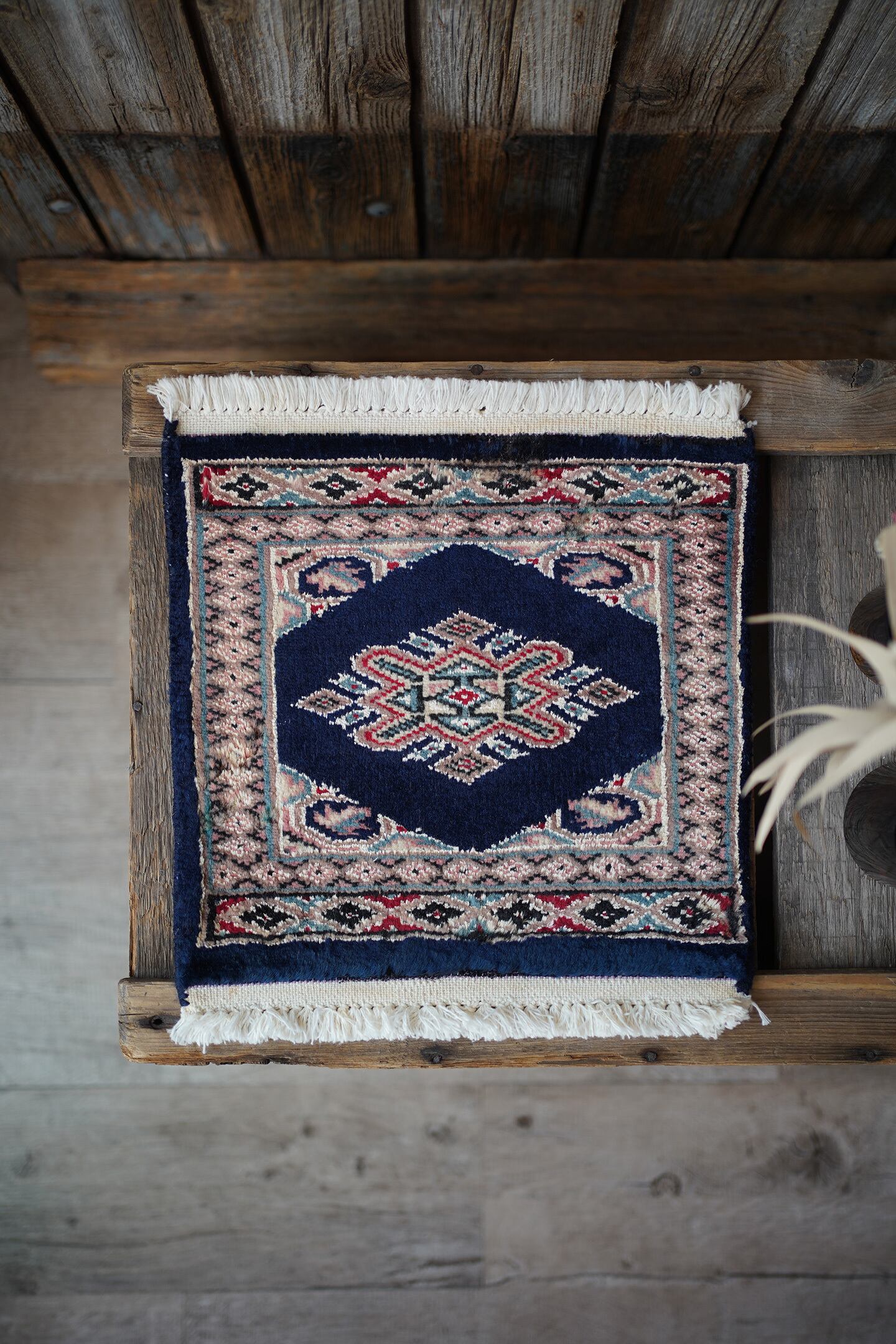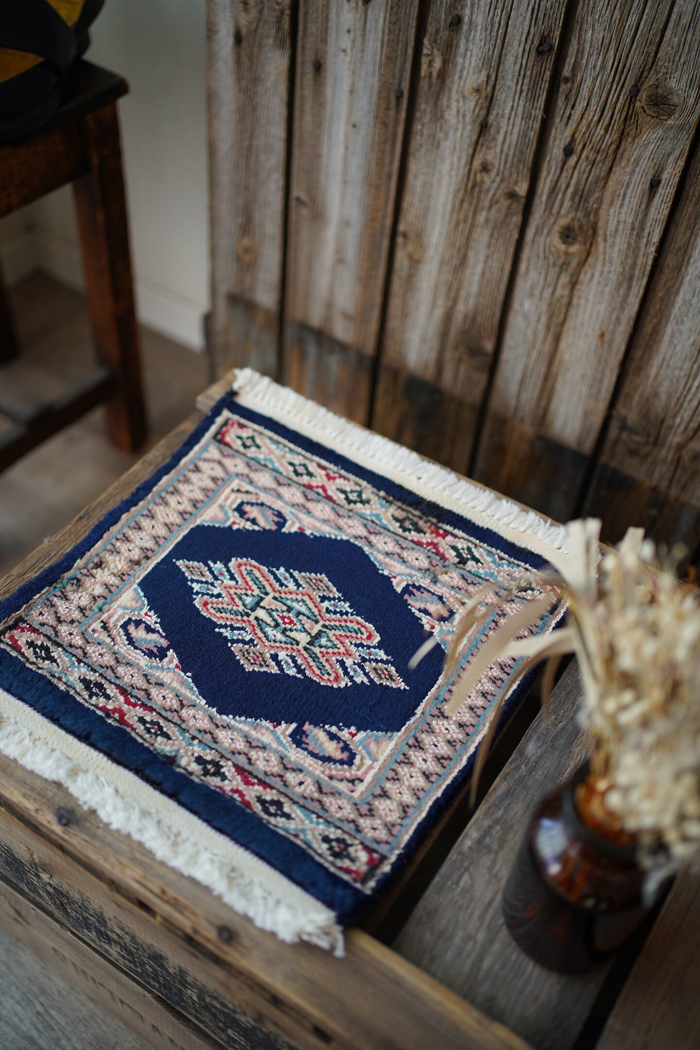 約30年前に織られたパキスタン産のミニラグです。配色はネイビー、赤、ブルーグリーン、淡いピンク、ベージュなど。厚みは6mm〜7mm程度で、表面はソフトウールで、ふわっと気持ちの良い肌触りをしています。一部目立たない補修跡がありますのでお写真最後をご参照ください。棚やテーブルの上に敷いて、小物や花瓶などを乗せればお気に入りの空間がとってもオシャレに。タペストリーとして壁に飾っても素敵かと思います♪