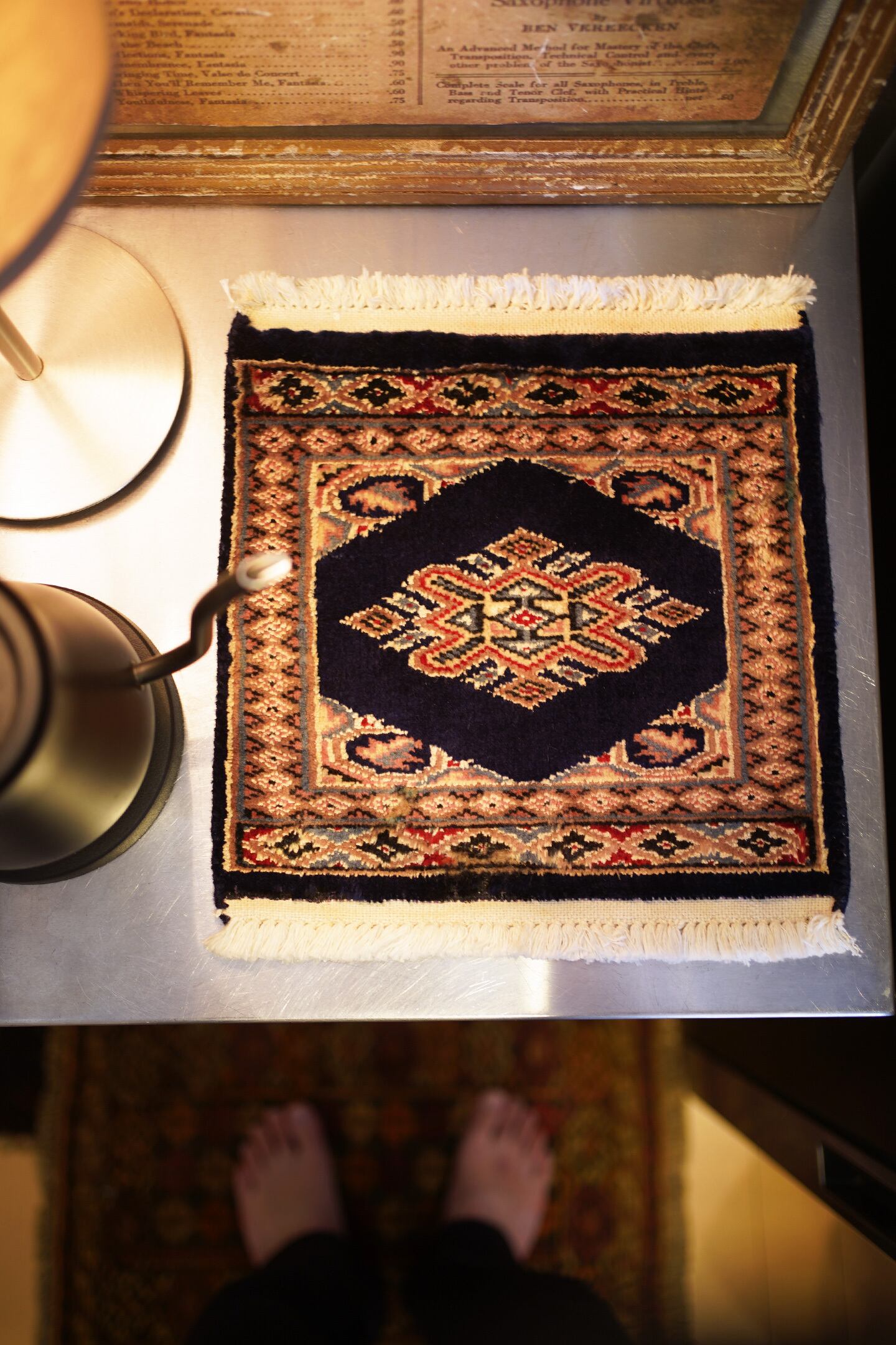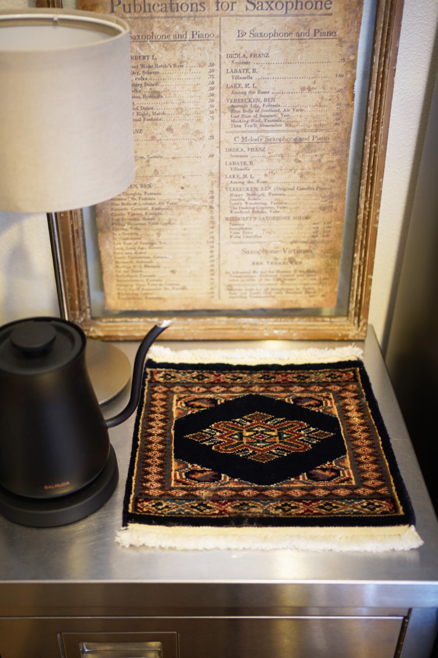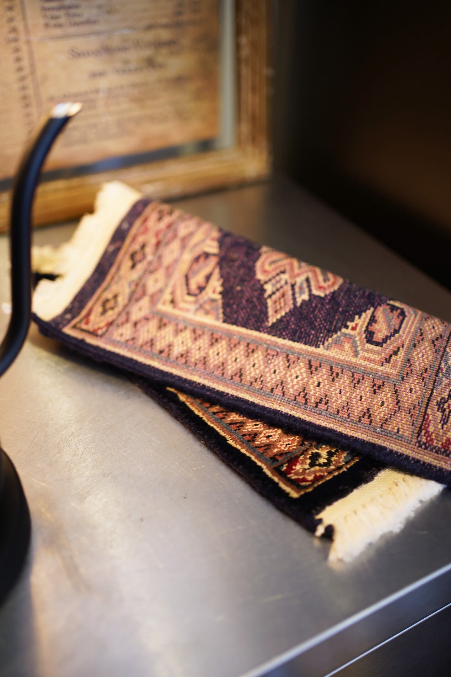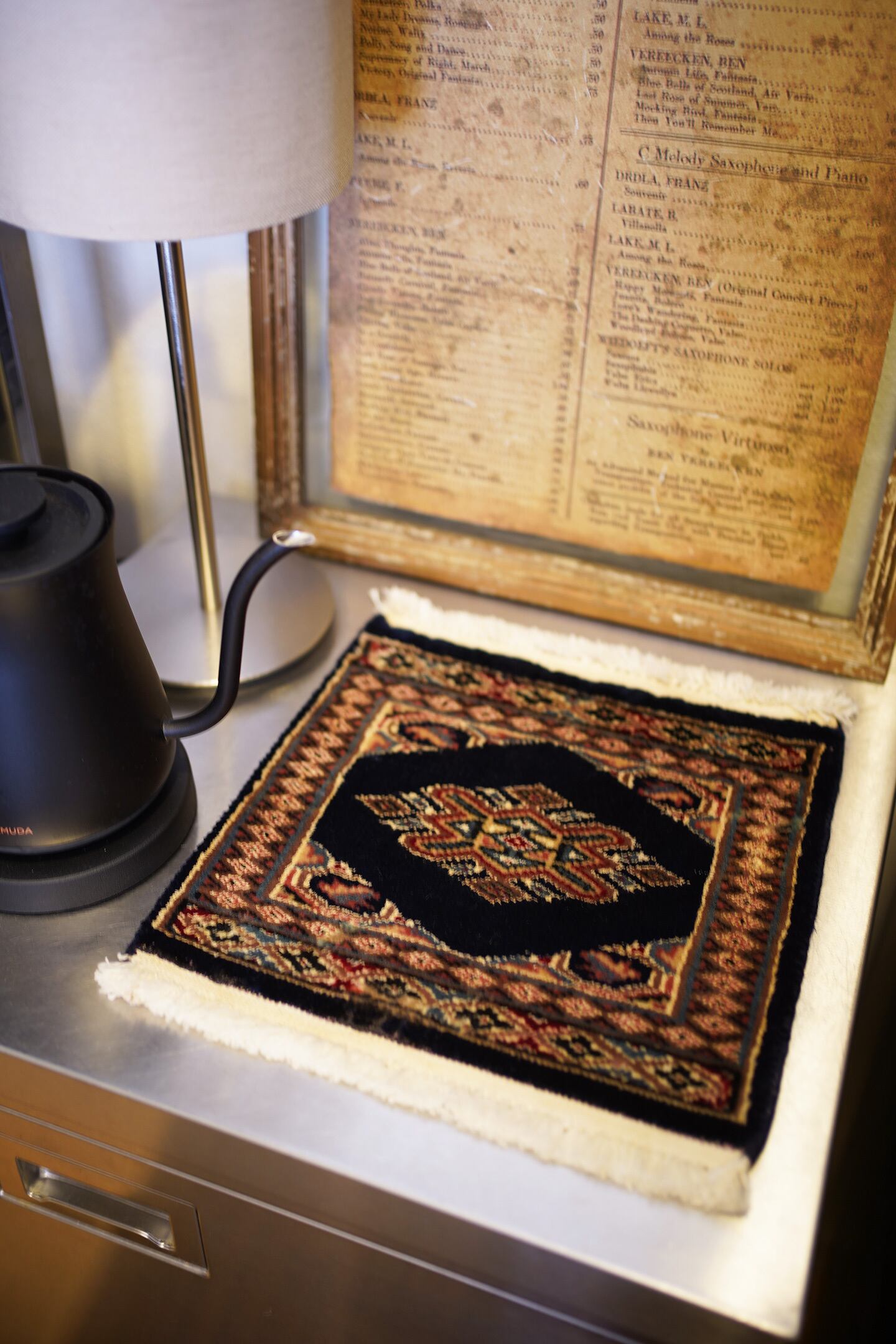約30年前に織られたパキスタン産のミニラグです。配色はネイビー、赤、ブルーグリーン、淡いピンク、ベージュなど。厚みは6mm〜7mm程度で、表面はソフトウールで、ふわっと気持ちの良い肌触りをしています。一部目立たない補修跡がありますのでお写真最後をご参照ください。棚やテーブルの上に敷いて、小物や花瓶などを乗せればお気に入りの空間がとってもオシャレに。タペストリーとして壁に飾っても素敵かと思います♪