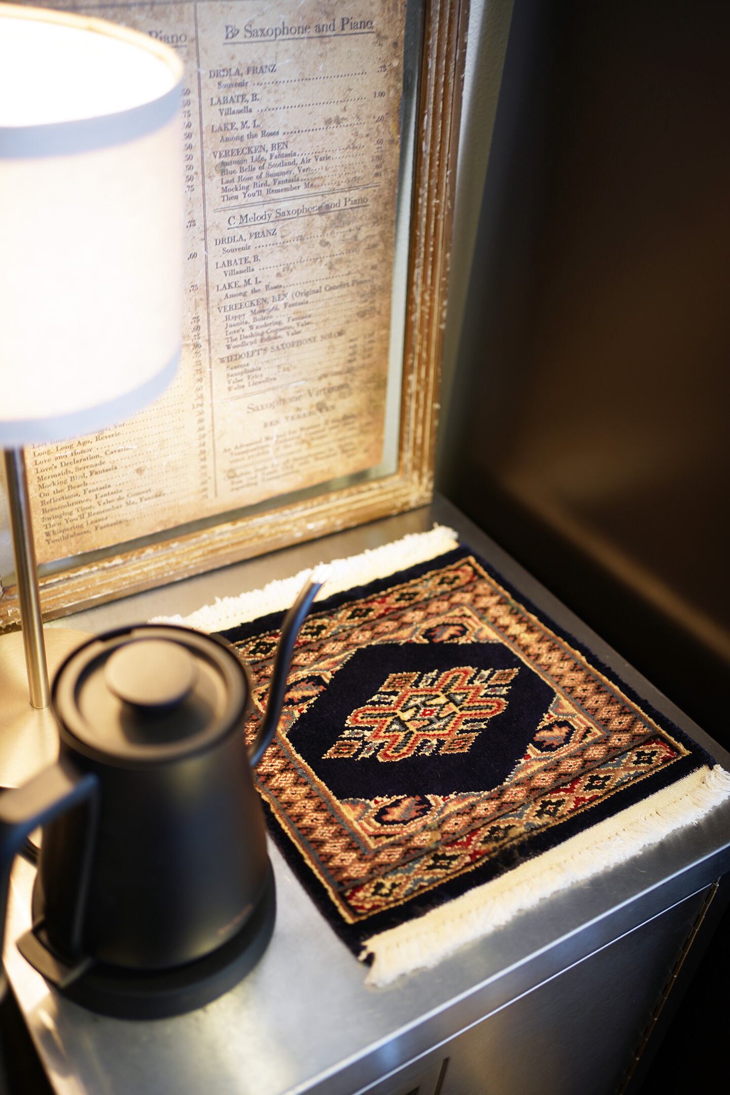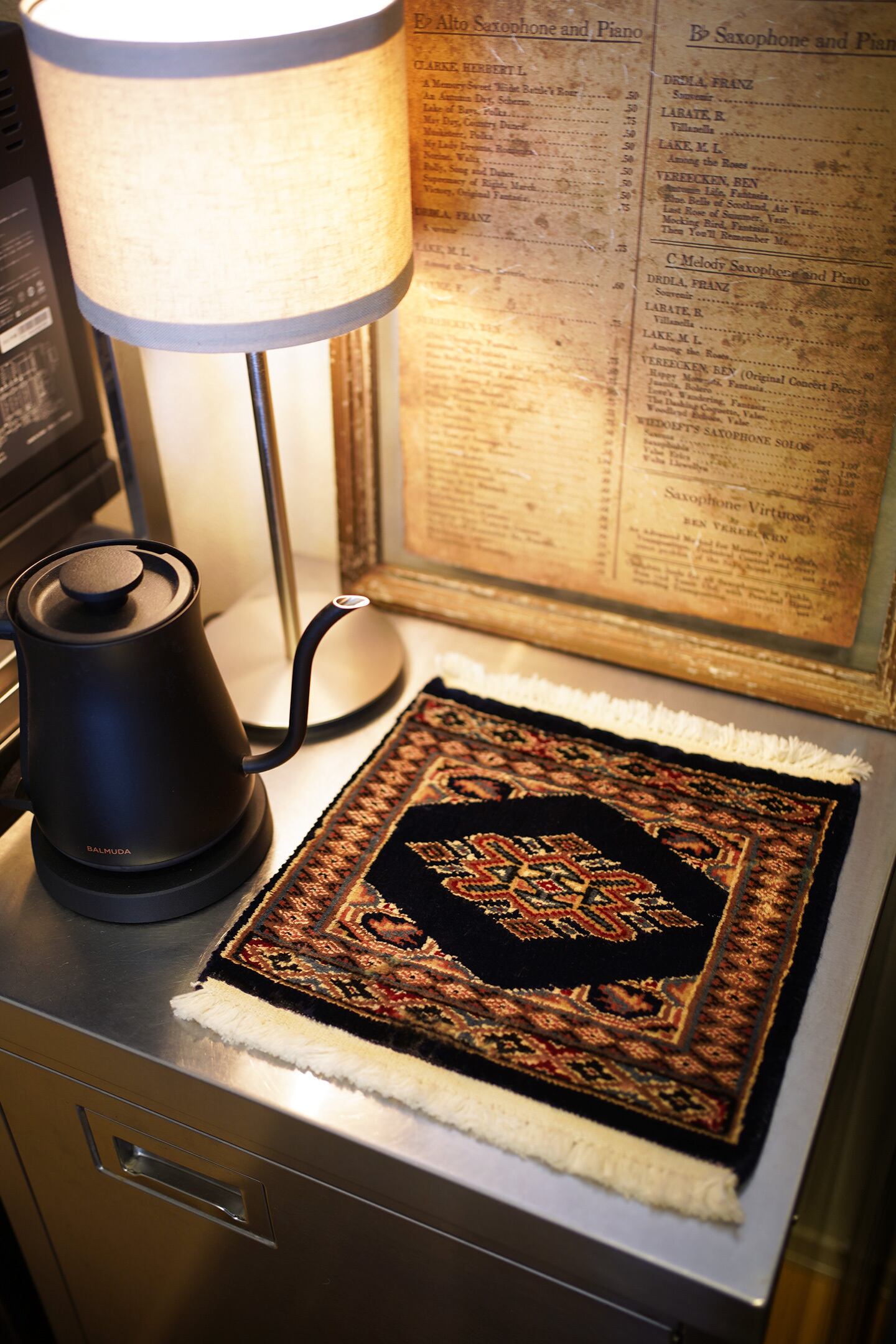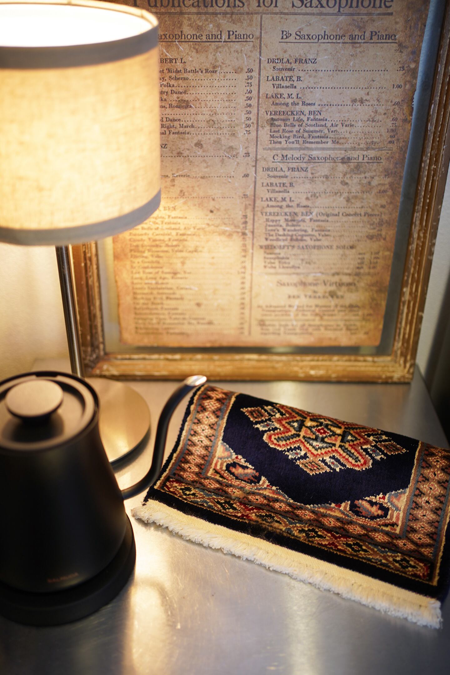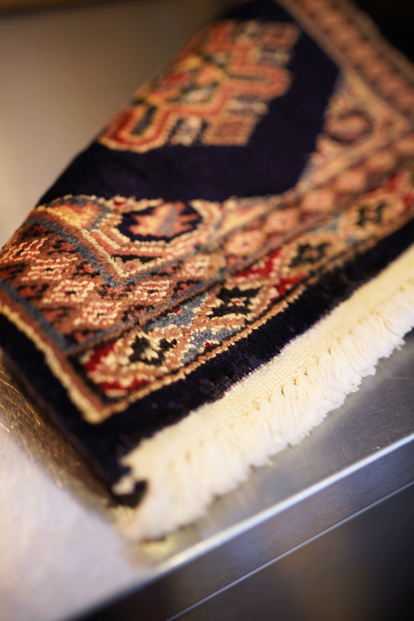 約30年前に織られたパキスタン産のミニラグです。配色はネイビー、赤、ブルーグリーン、淡いピンク、ベージュなど。厚みは6mm〜7mm程度で、表面はソフトウールで、ふわっと気持ちの良い肌触りをしています。一部目立たない補修跡がありますのでお写真最後をご参照ください。棚やテーブルの上に敷いて、小物や花瓶などを乗せればお気に入りの空間がとってもオシャレに。タペストリーとして壁に飾っても素敵かと思います♪