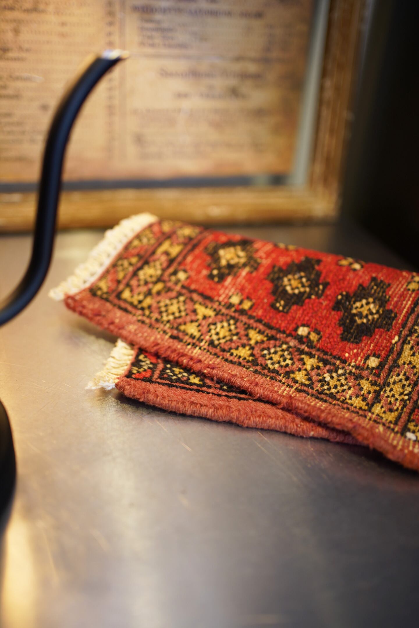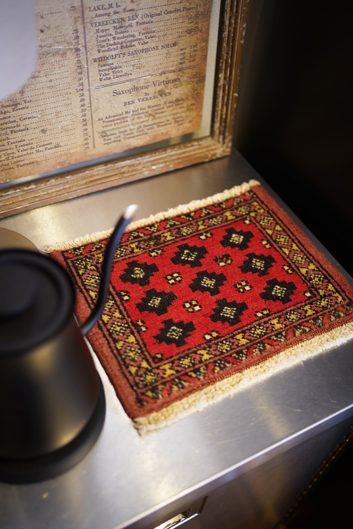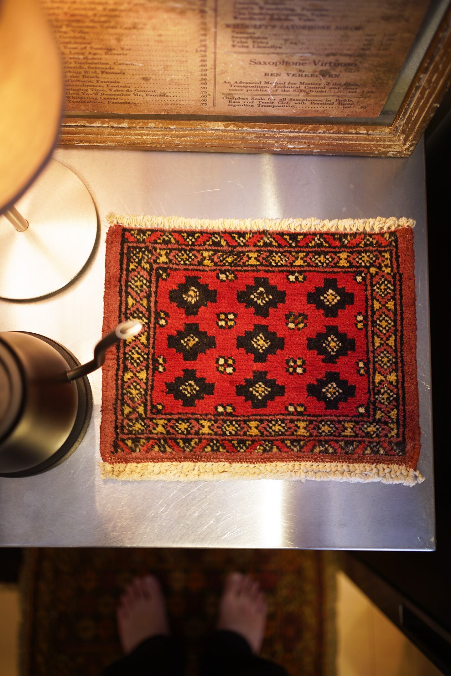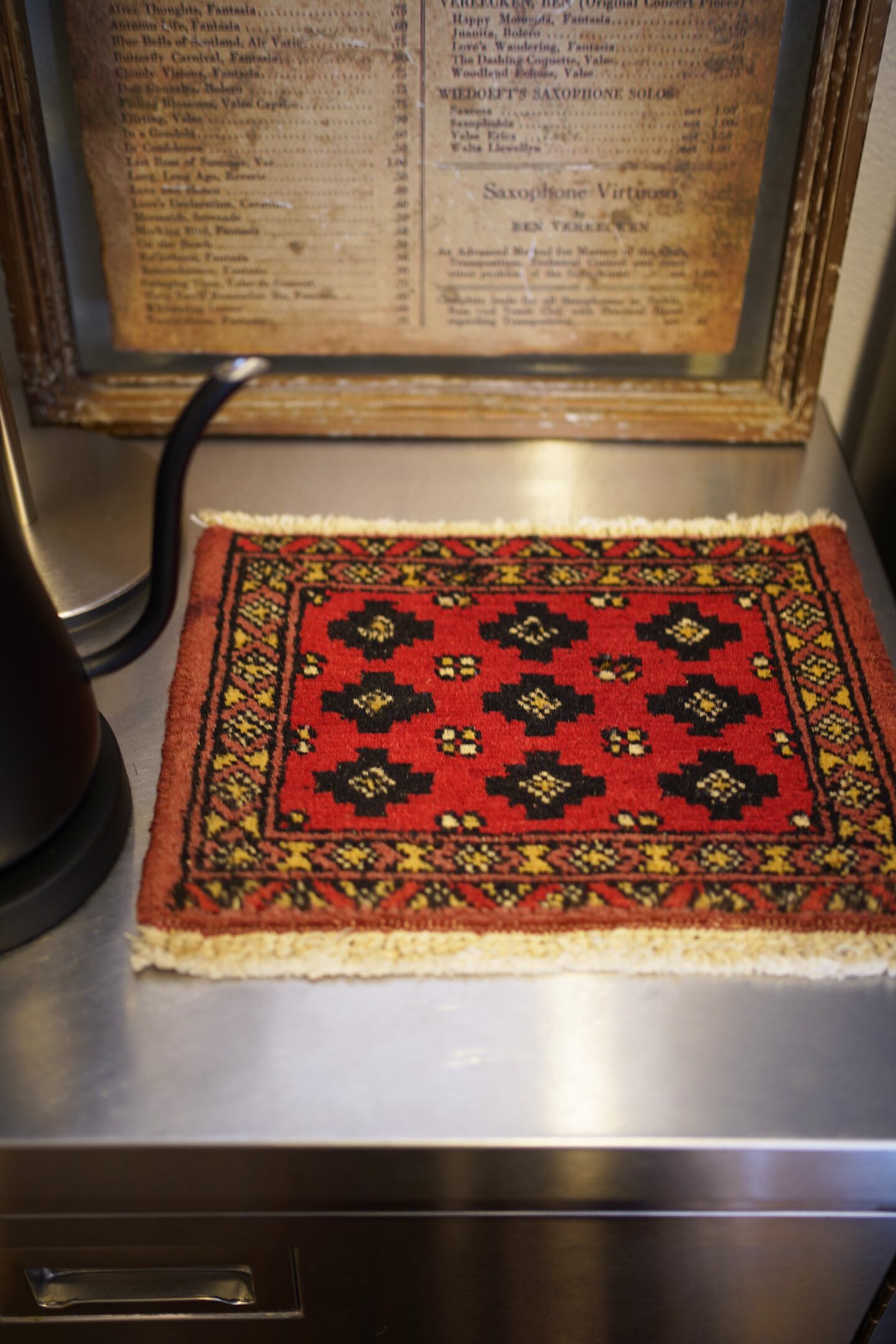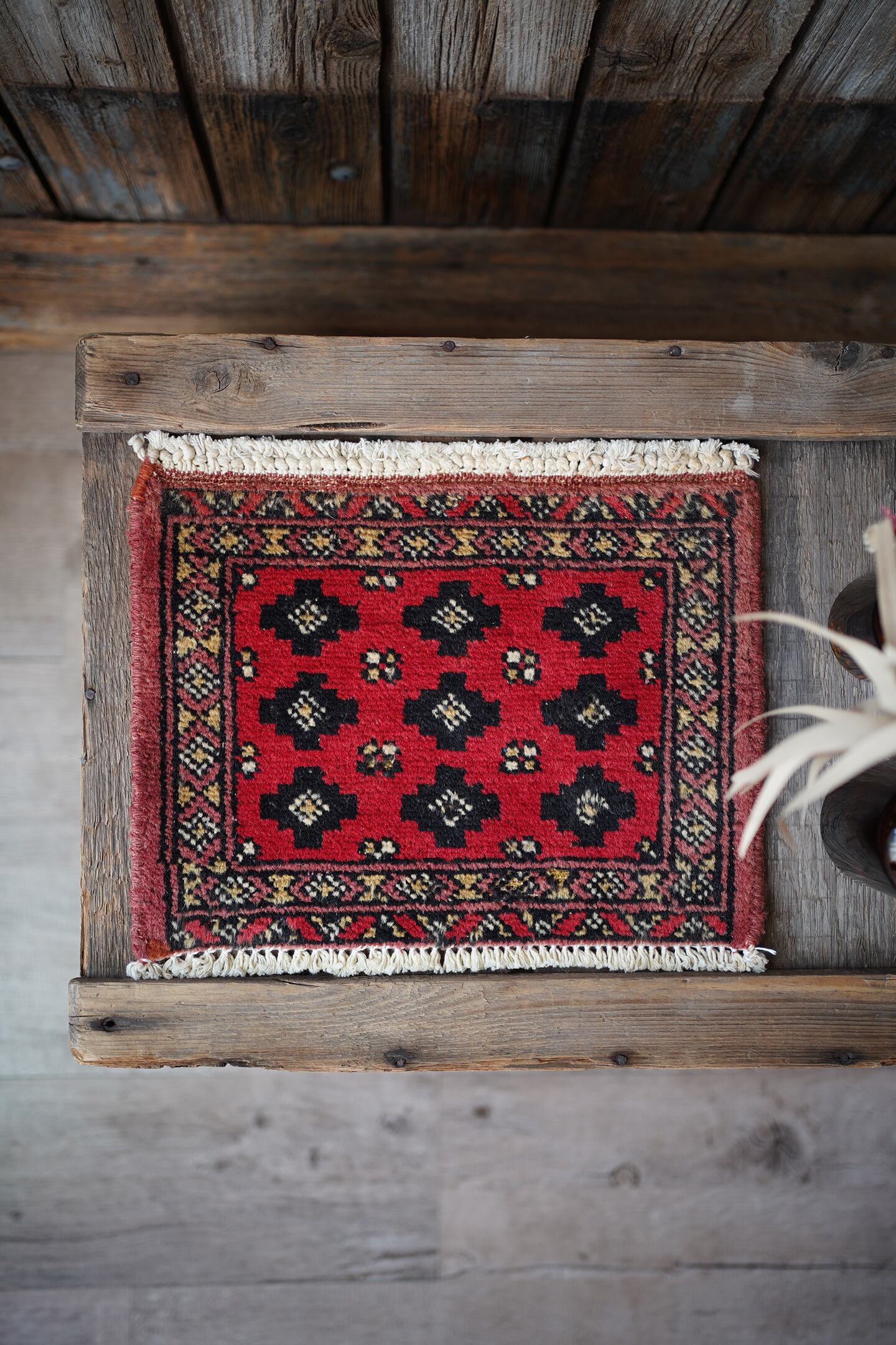 約30年前に織られたパキスタン産のミニラグです。配色は赤、黒、ベージュ、薄い赤茶など。厚みは5mm〜6mm程度で、表面はサラッと滑らかな肌触りをしています。一部目立たないパイル抜けがありますので、お写真最後の2枚をご参照ください。棚やテーブルの上に敷いて、小物や花瓶などを乗せればお気に入りの空間がとってもオシャレに。タペストリーとして壁に飾っても素敵かと思います♪