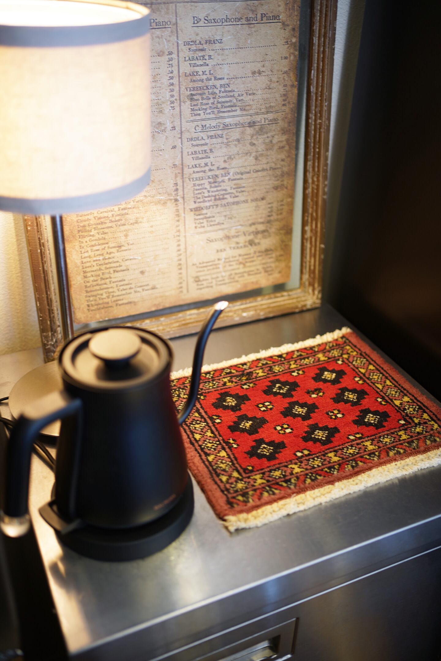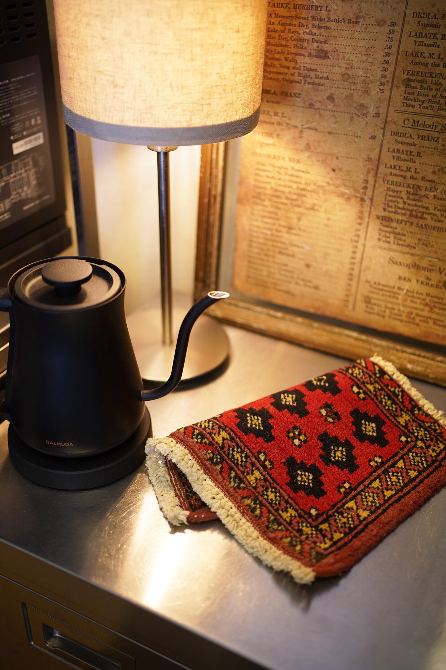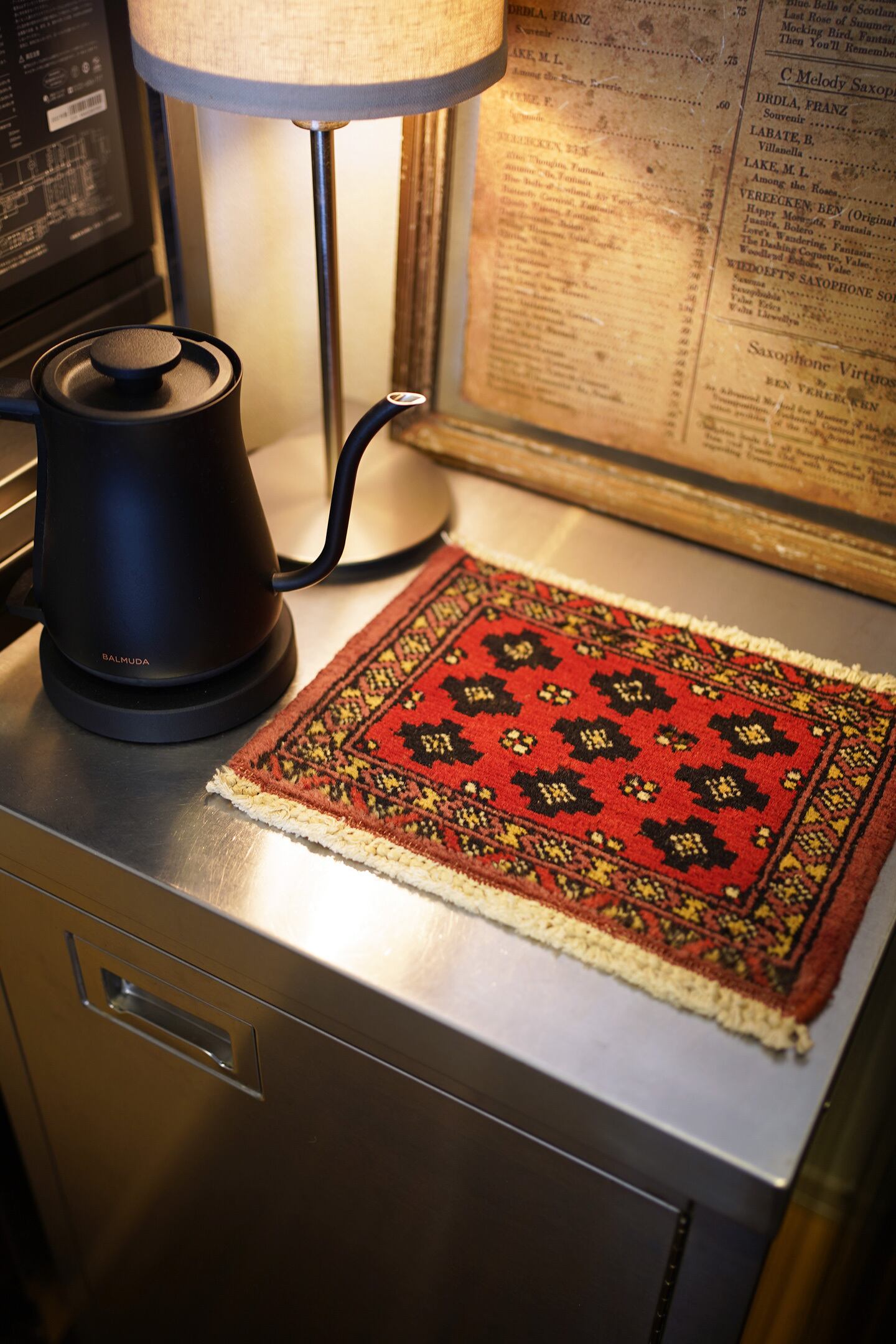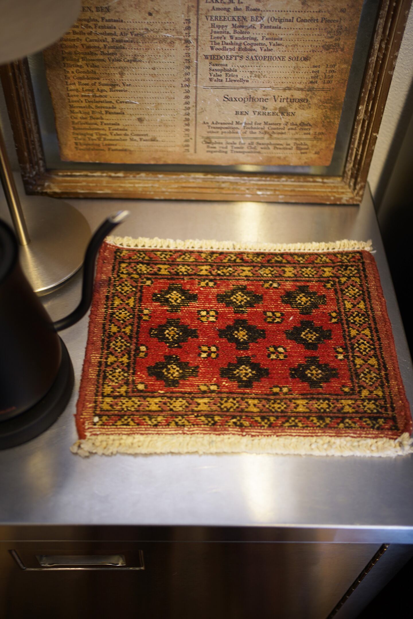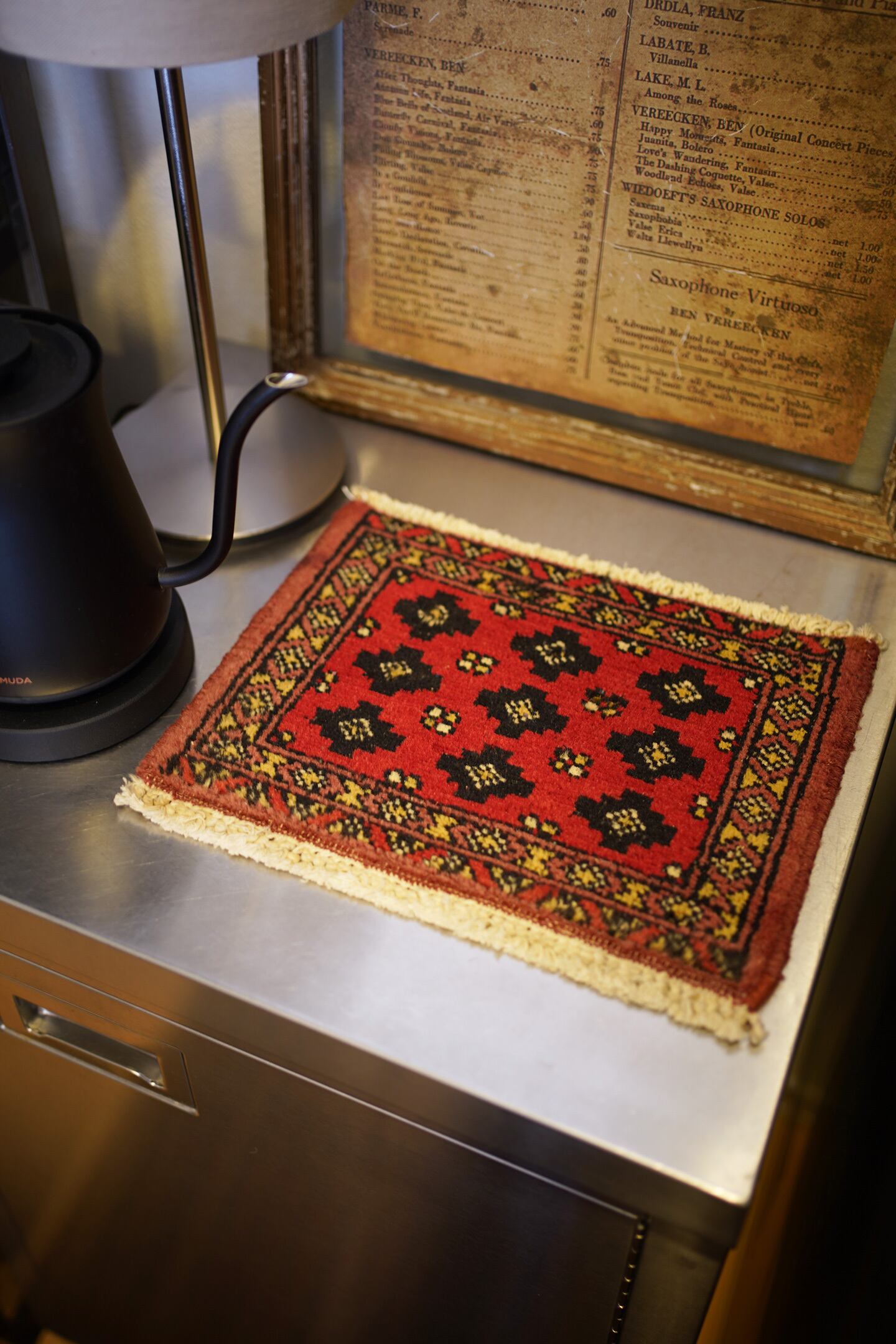 約30年前に織られたパキスタン産のミニラグです。配色は赤、黒、ベージュ、薄い赤茶など。厚みは5mm〜6mm程度で、表面はサラッと滑らかな肌触りをしています。一部目立たないパイル抜けがありますので、お写真最後の2枚をご参照ください。棚やテーブルの上に敷いて、小物や花瓶などを乗せればお気に入りの空間がとってもオシャレに。タペストリーとして壁に飾っても素敵かと思います♪