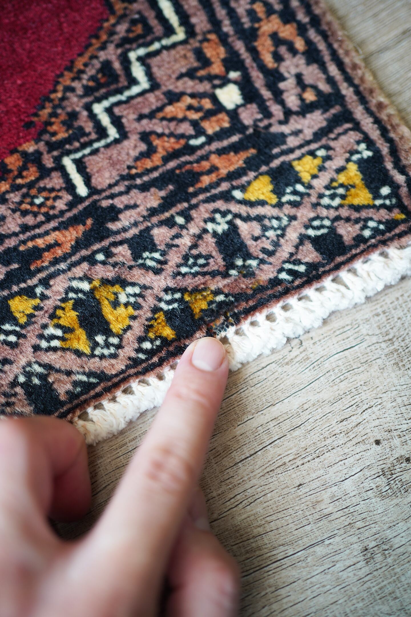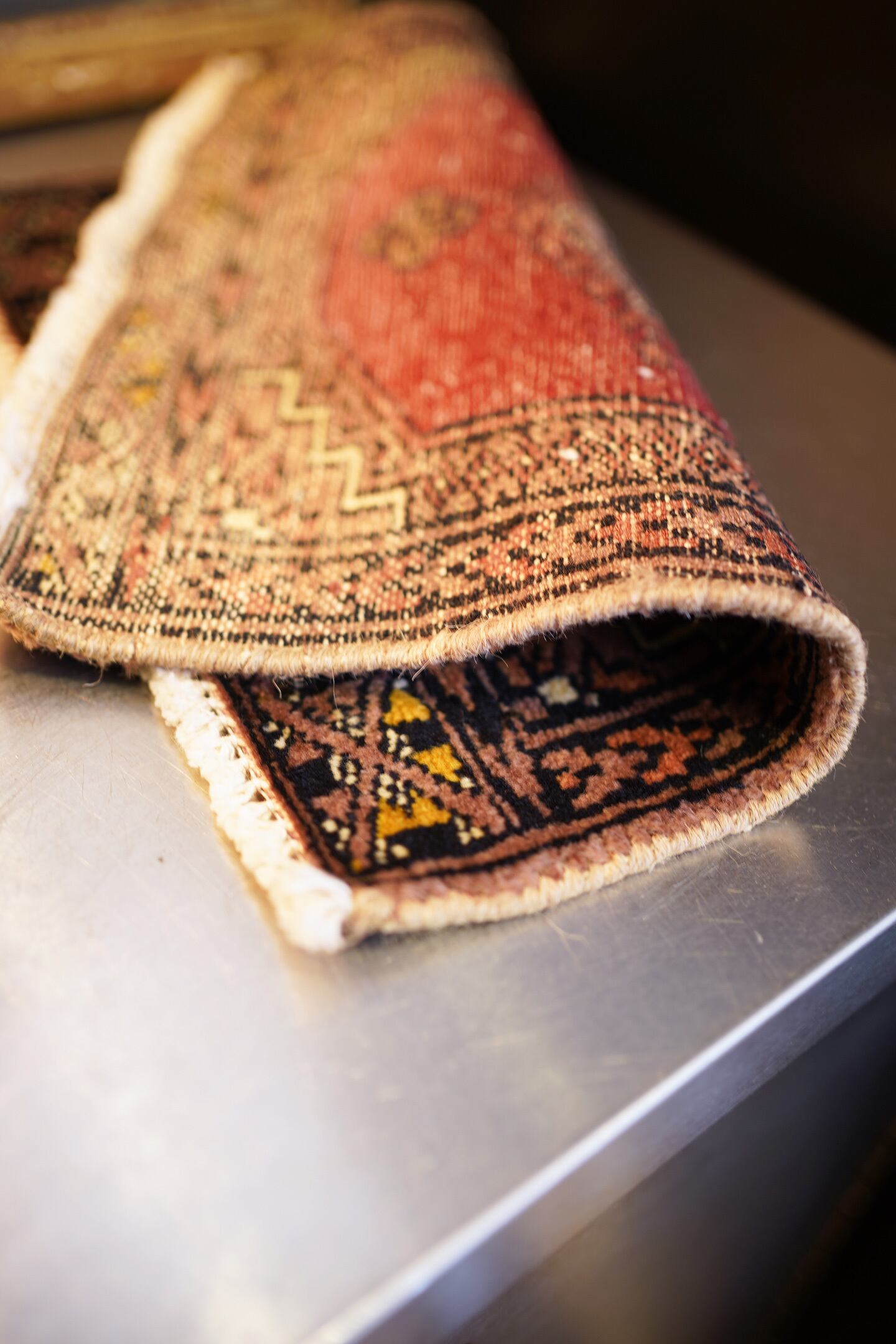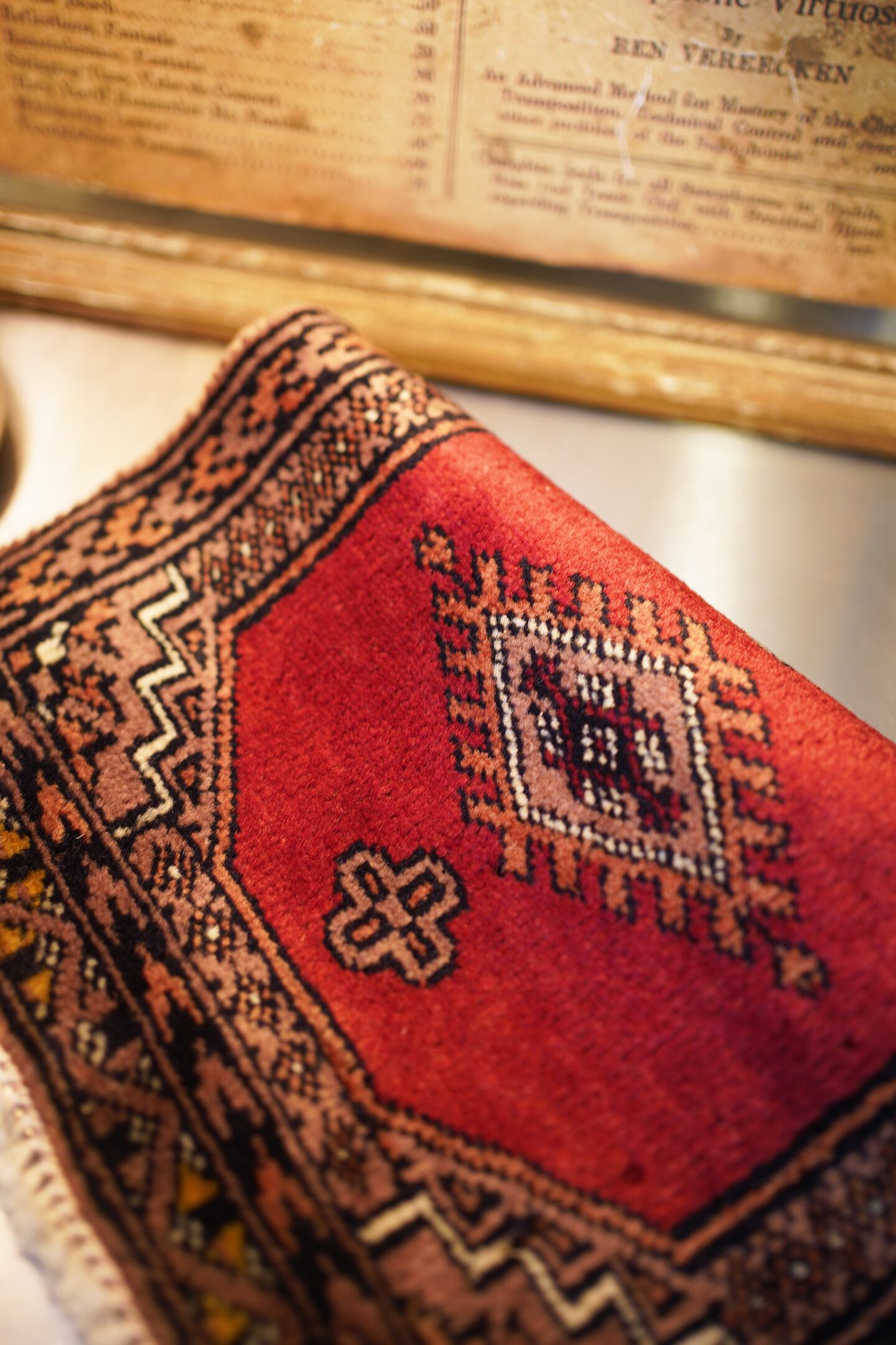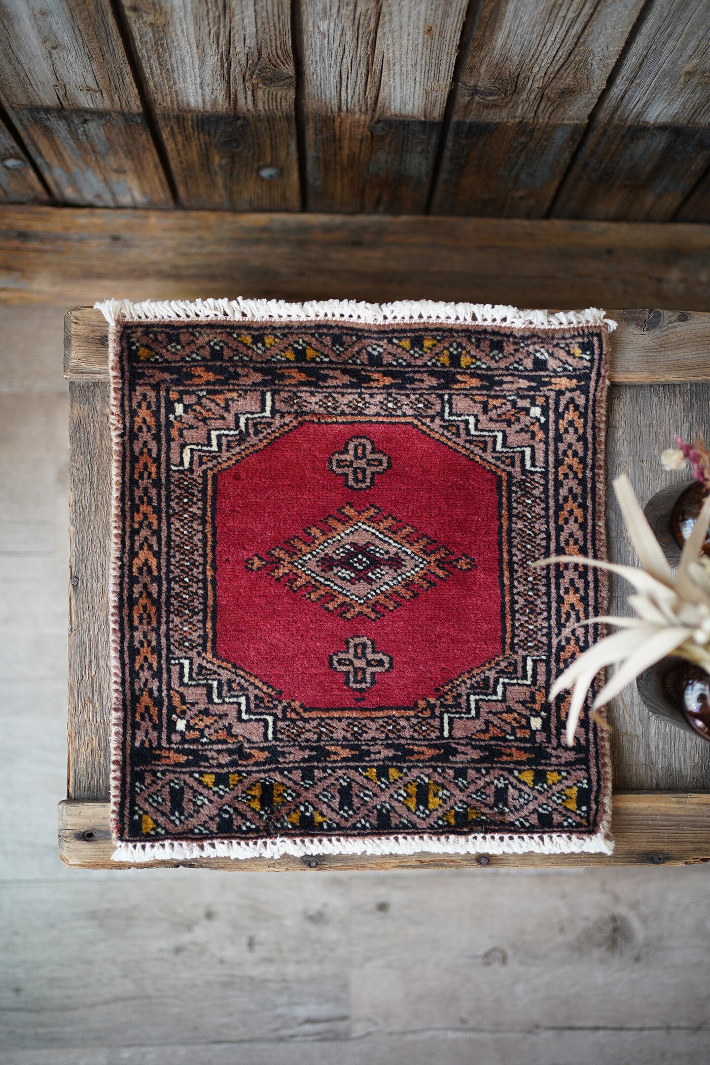 約30年前に織られたパキスタン産のミニラグです。配色は濃い赤、ブラウン、薄いオレンジ、黄土色など。厚みは5mm〜6mm程度で、表面はふわっと優しい肌触りをしています。2箇所、目立たないパイル抜けがありますので、お写真最後の2枚をご参照ください。棚やテーブルの上に敷いて、小物や花瓶などを乗せればお気に入りの空間がとってもオシャレに。タペストリーとして壁に飾っても素敵かと思います♪