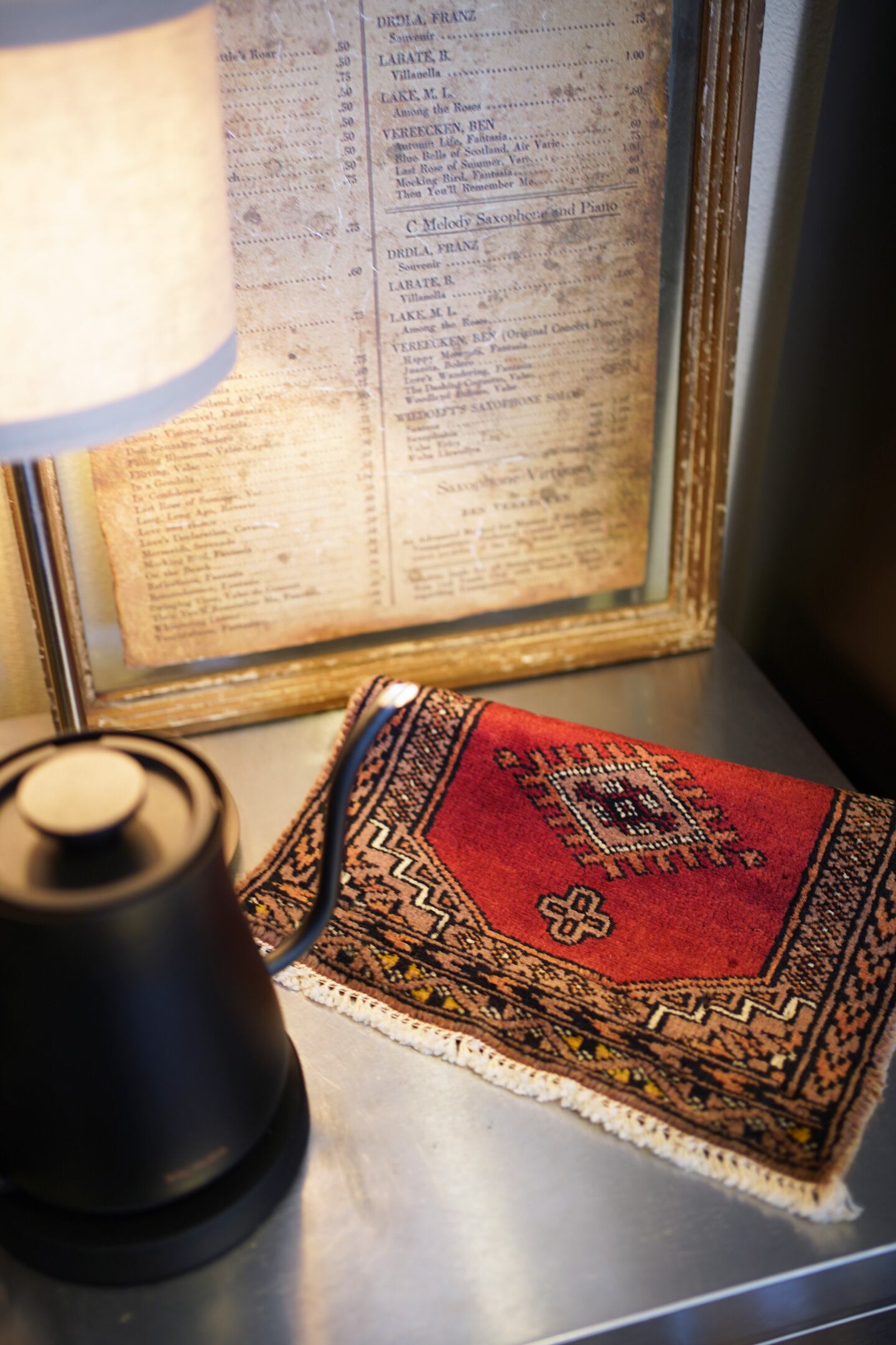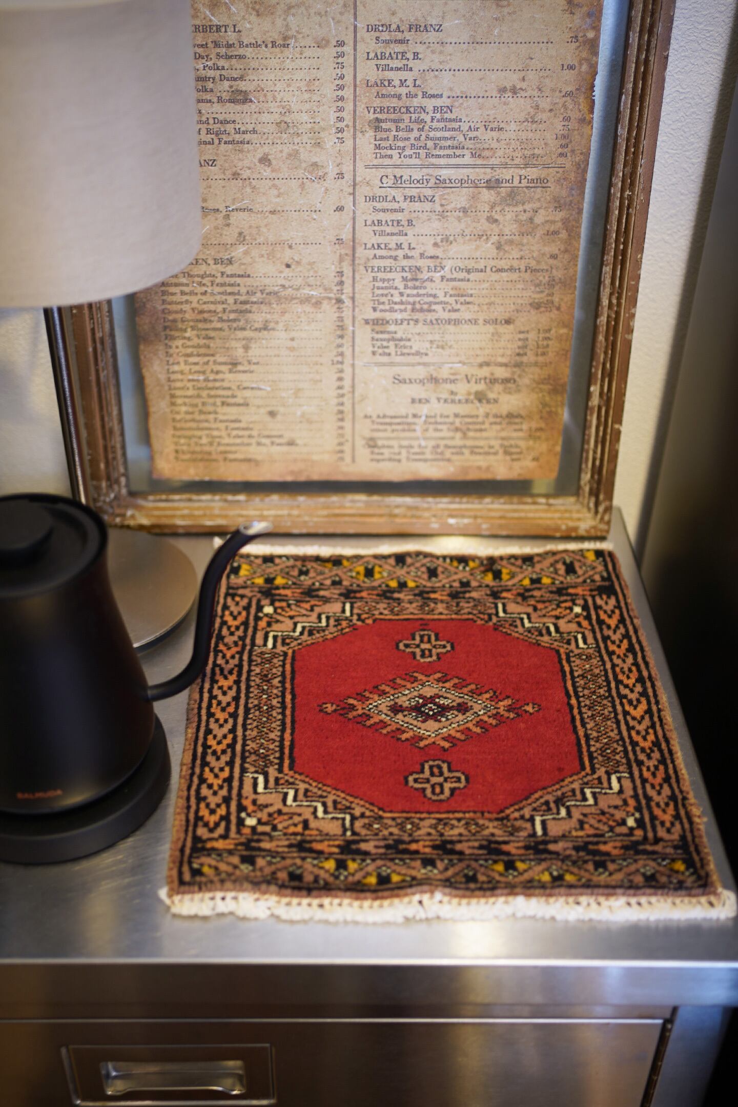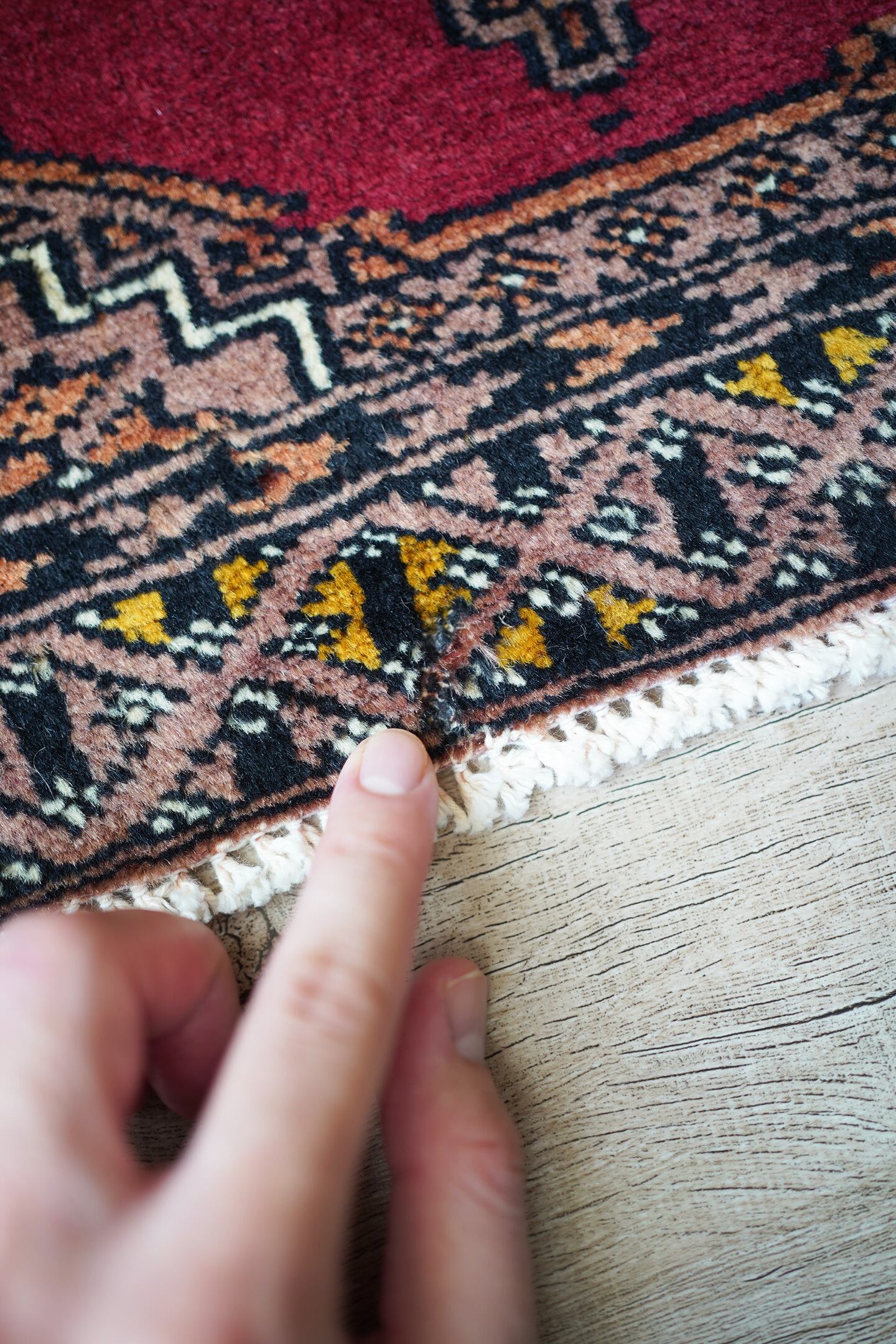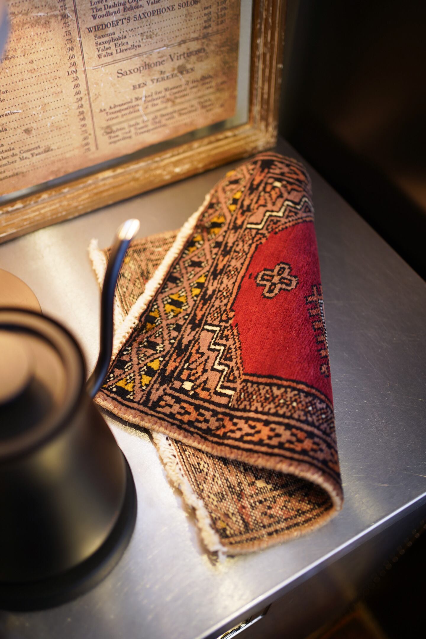 約30年前に織られたパキスタン産のミニラグです。配色は濃い赤、ブラウン、薄いオレンジ、黄土色など。厚みは5mm〜6mm程度で、表面はふわっと優しい肌触りをしています。2箇所、目立たないパイル抜けがありますので、お写真最後の2枚をご参照ください。棚やテーブルの上に敷いて、小物や花瓶などを乗せればお気に入りの空間がとってもオシャレに。タペストリーとして壁に飾っても素敵かと思います♪