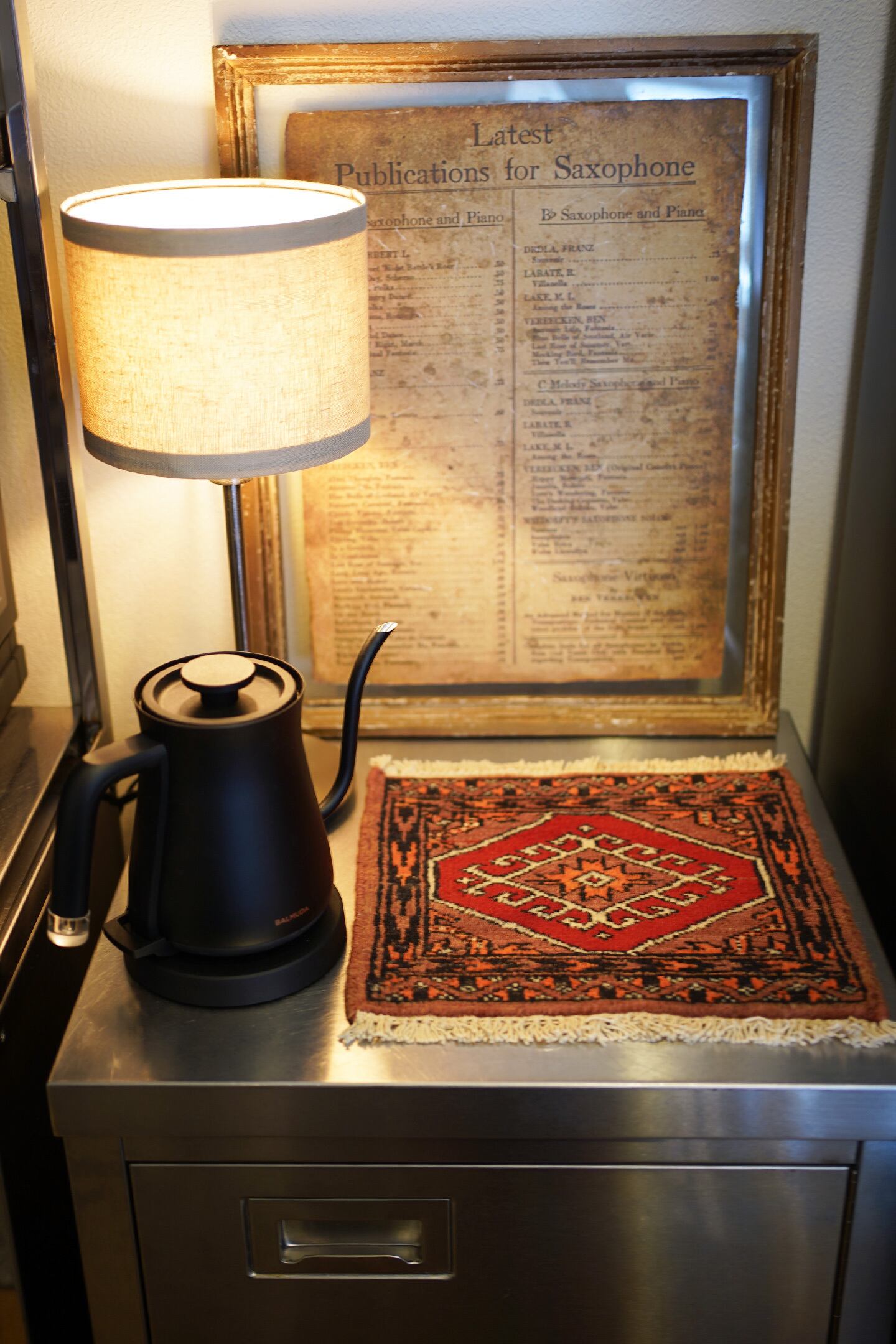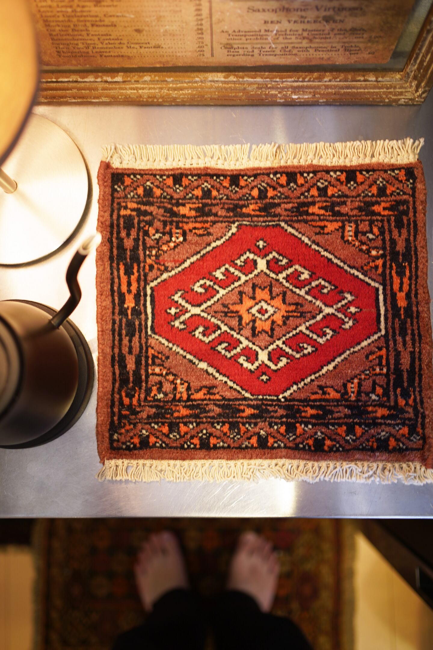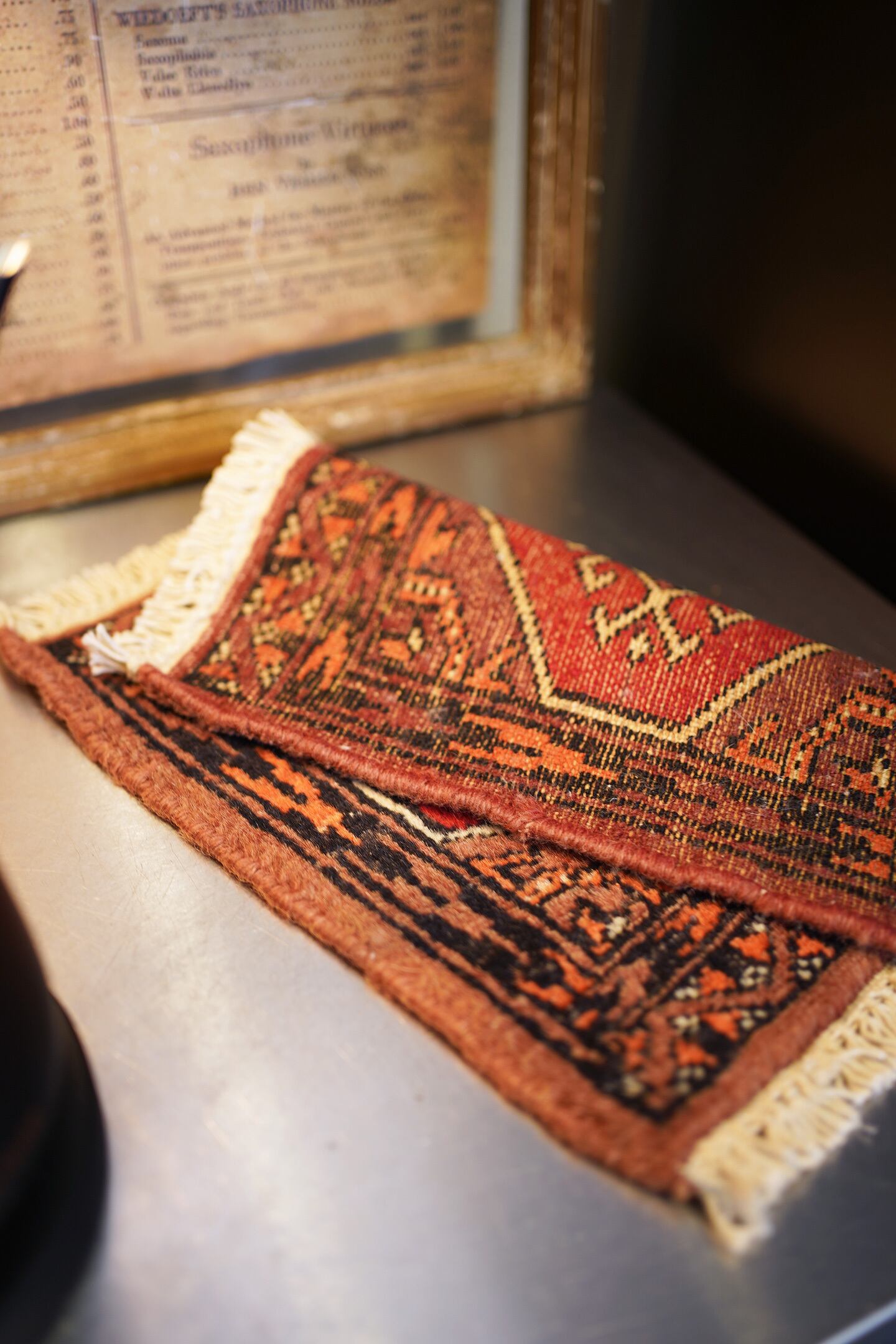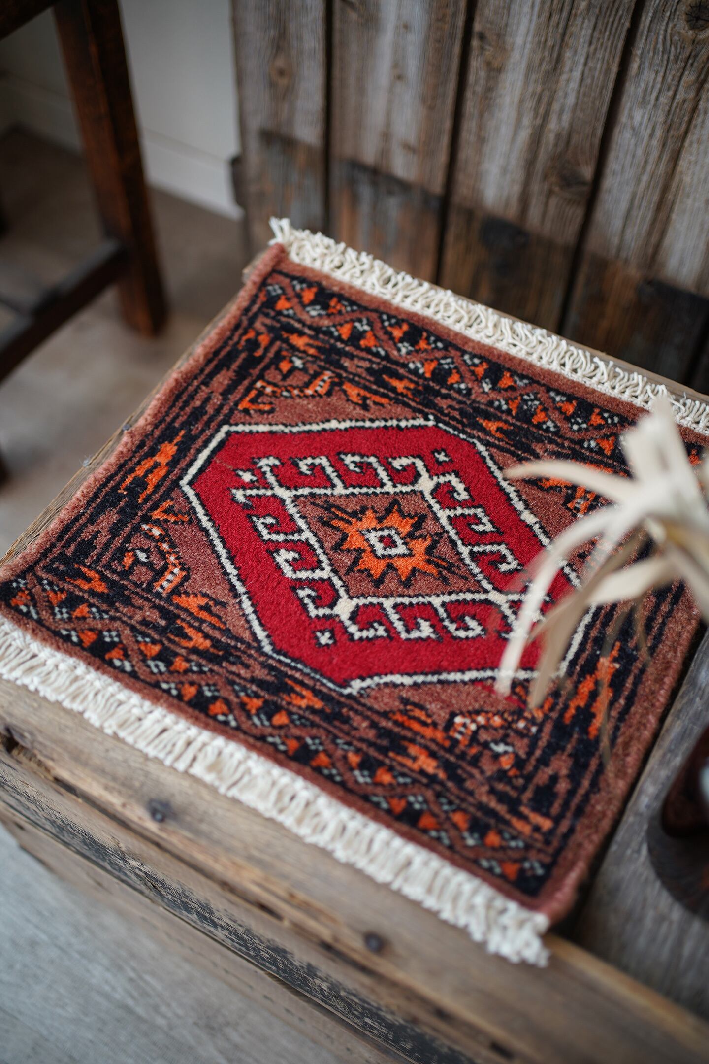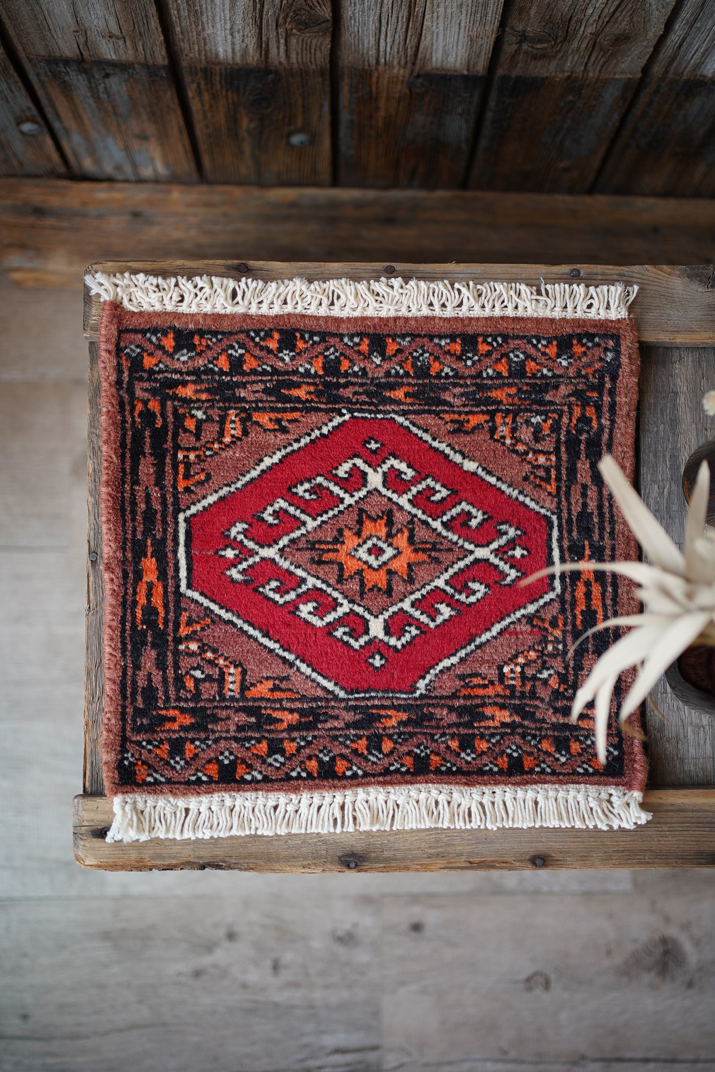 約30年前に織られたパキスタン産のミニラグです。配色はブラウン、オレンジ、赤、黒など。厚みは6mm程度で、表面はふわサラッと滑らかな肌触りをしています。一部赤い糸で線になっている箇所がありますのでお写真最後をご参照ください。コンディションとしては良好です。棚やテーブルの上に敷いて、小物や花瓶などを乗せればお気に入りの空間がとってもオシャレに。タペストリーとして壁に飾っても素敵かと思います♪