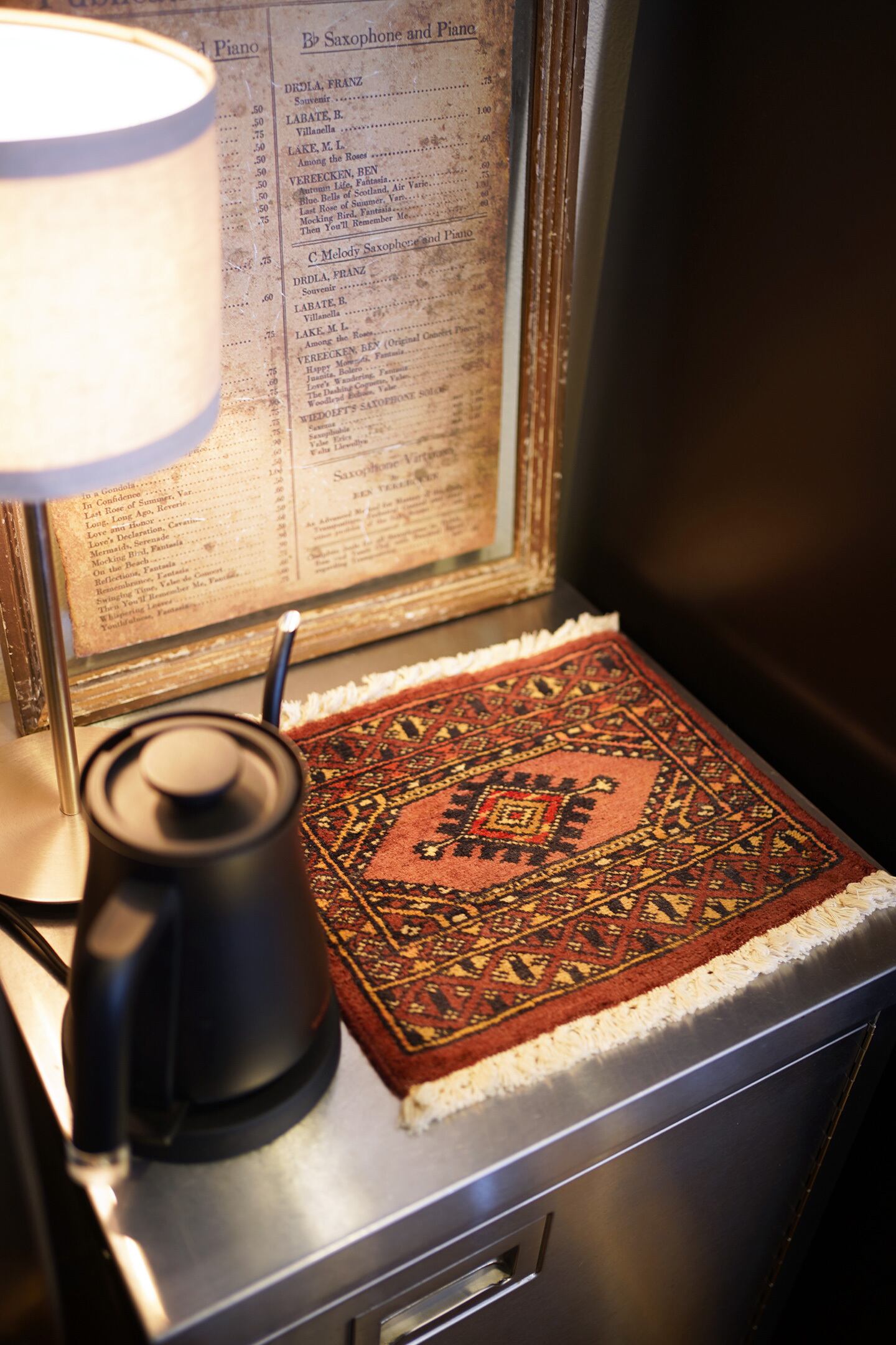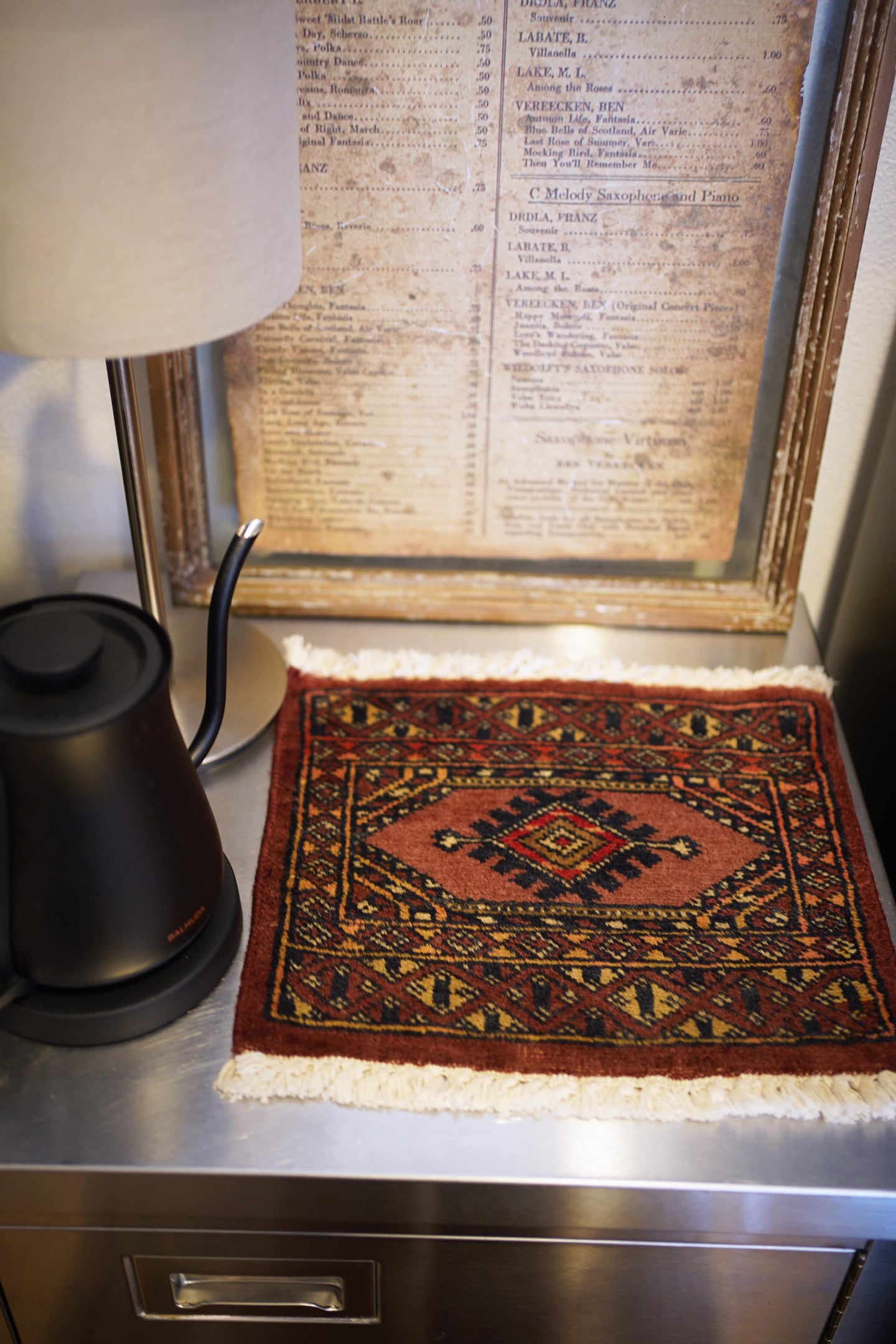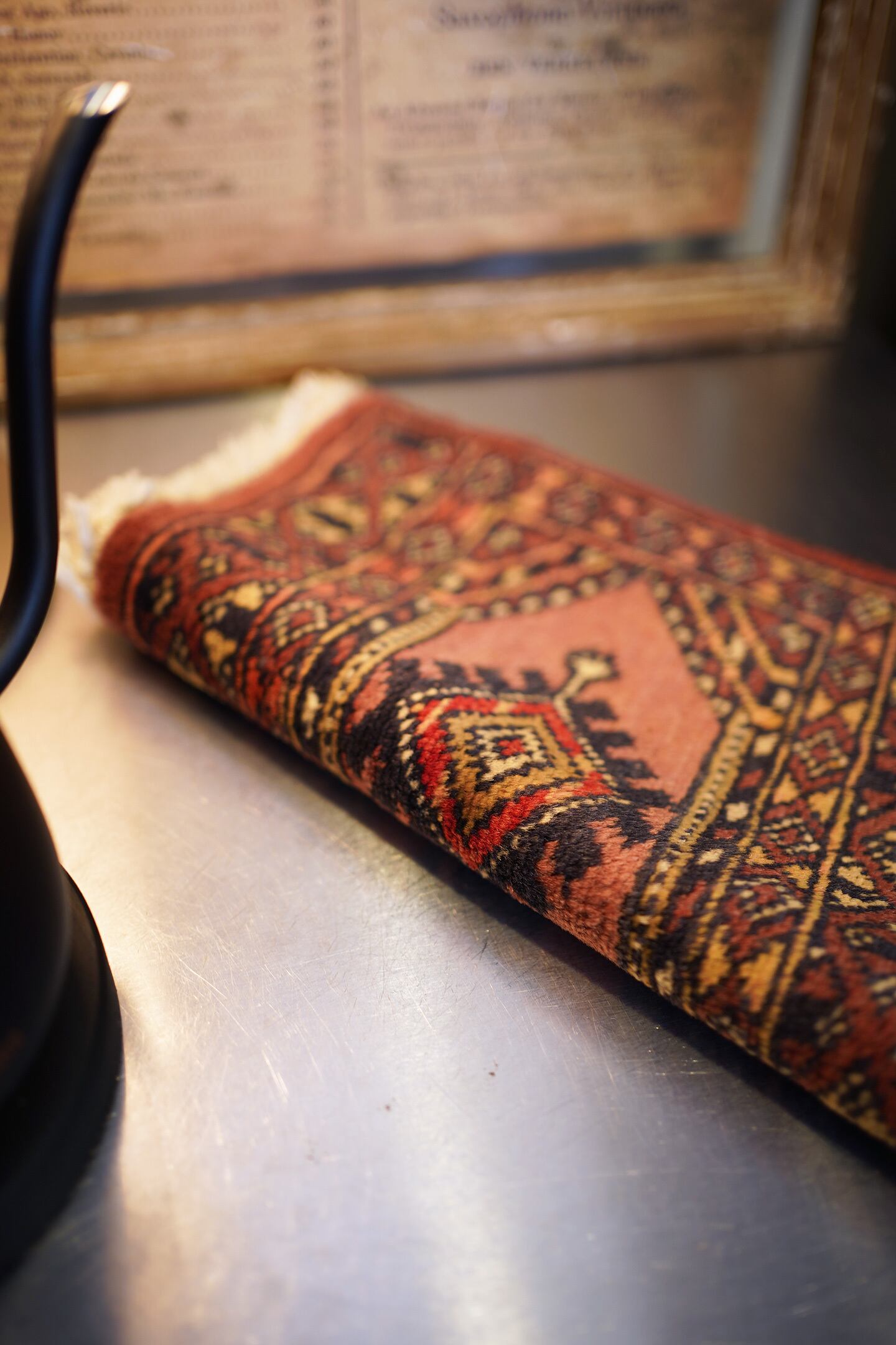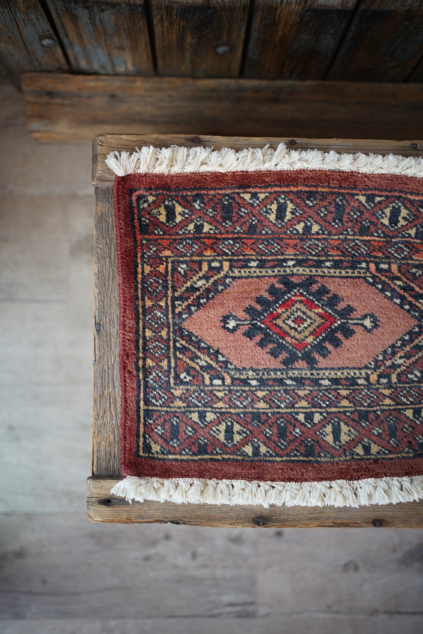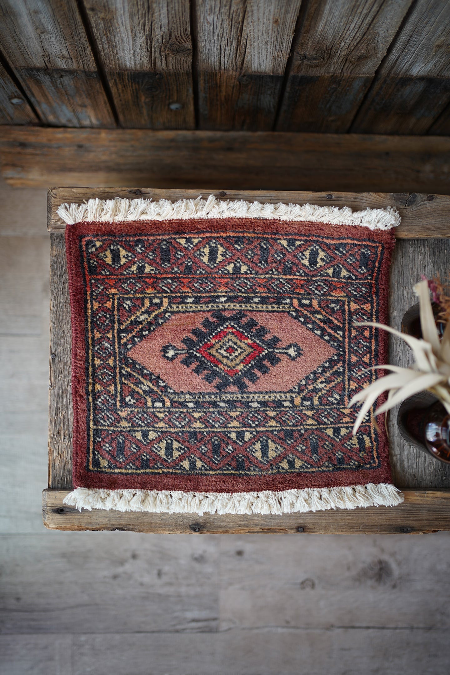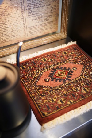 約30年前に織られたパキスタン産のミニラグです。配色はブラウン、テラコッタ、ブラック、ベージュなど。厚みは5mm〜6mm程度で、表面はサラッとなめらかな肌触りをしています。コンディションは良好です。棚やテーブルの上に敷いて、小物や花瓶などを乗せればお気に入りの空間がとってもオシャレに。タペストリーとして壁に飾っても素敵かと思います♪