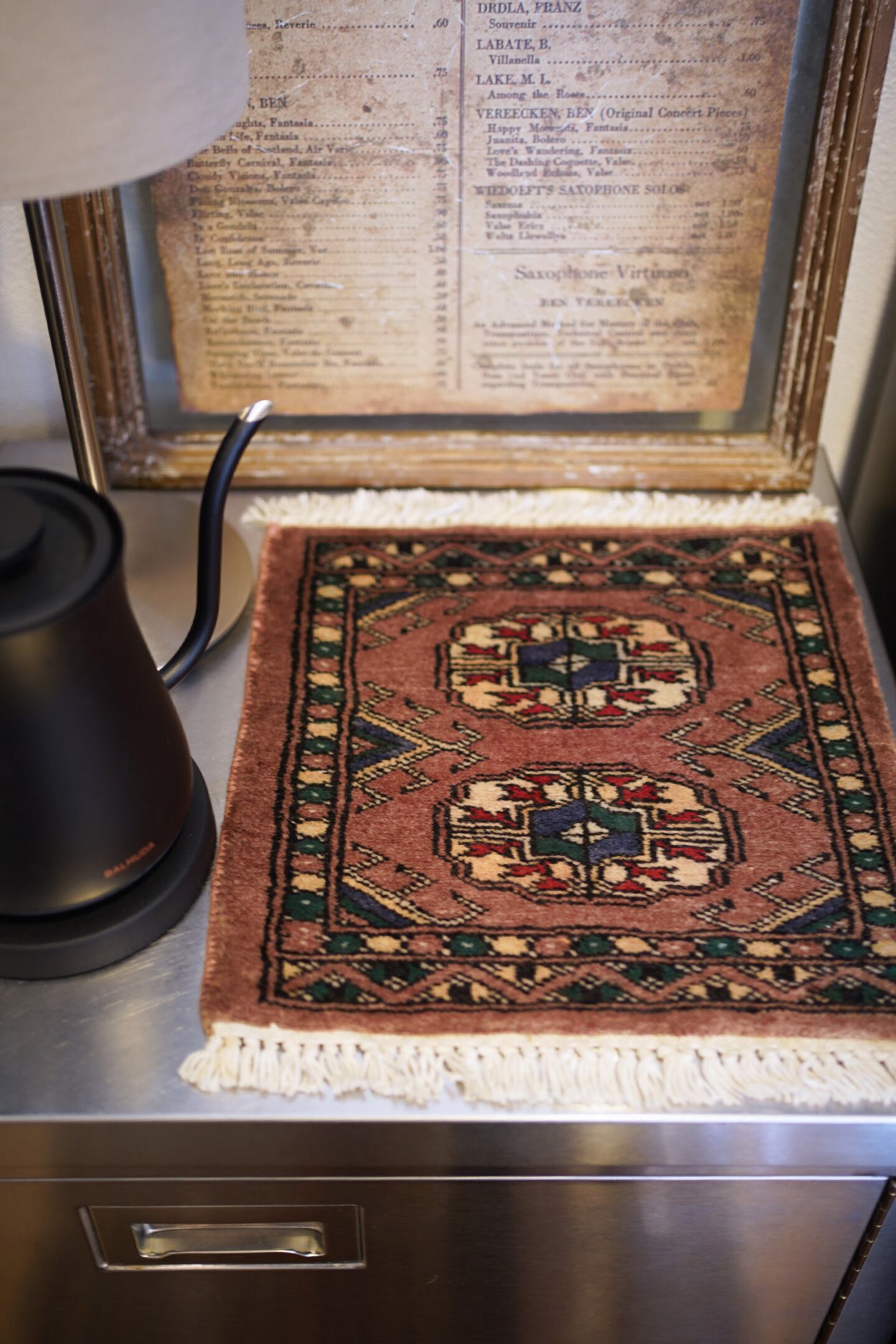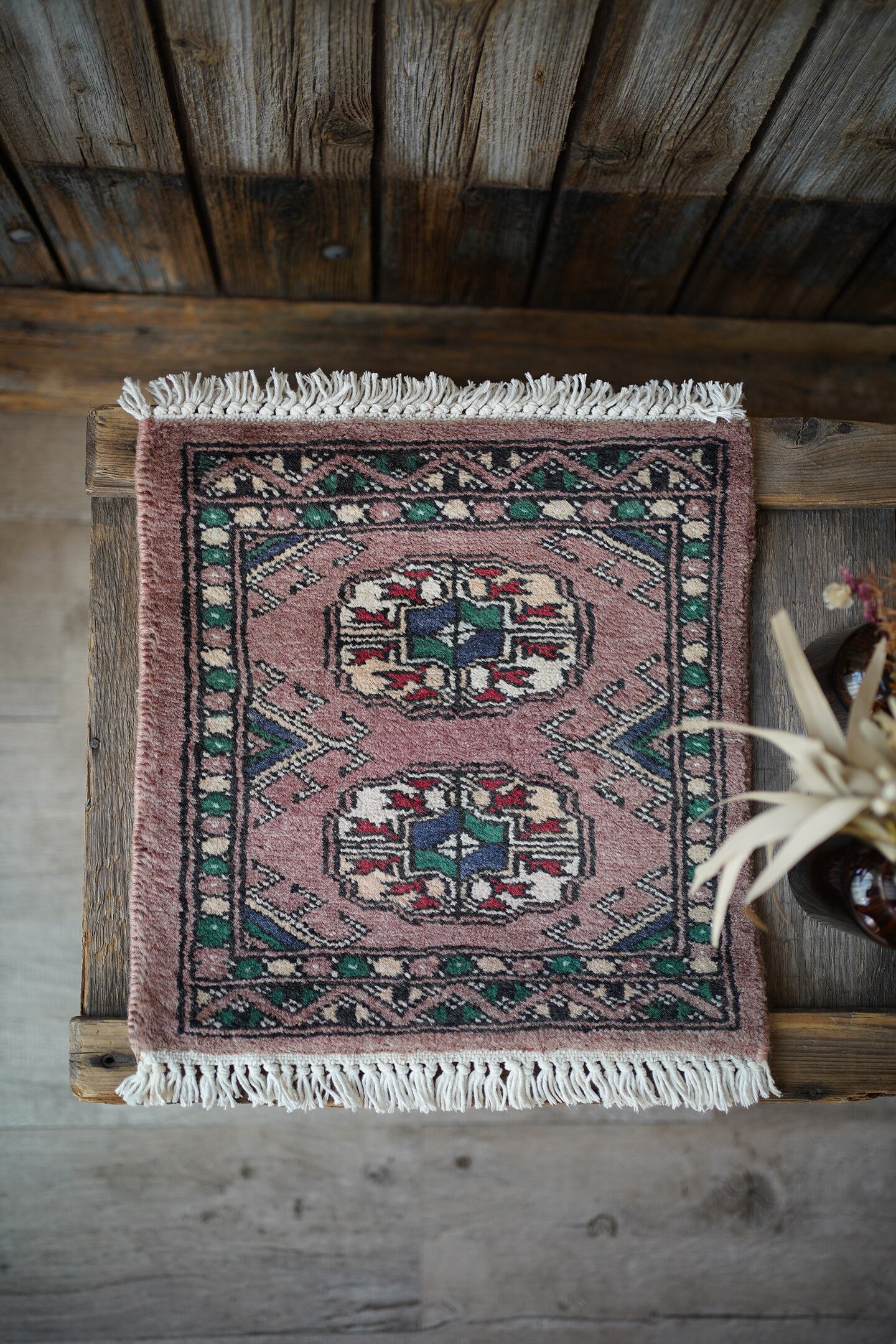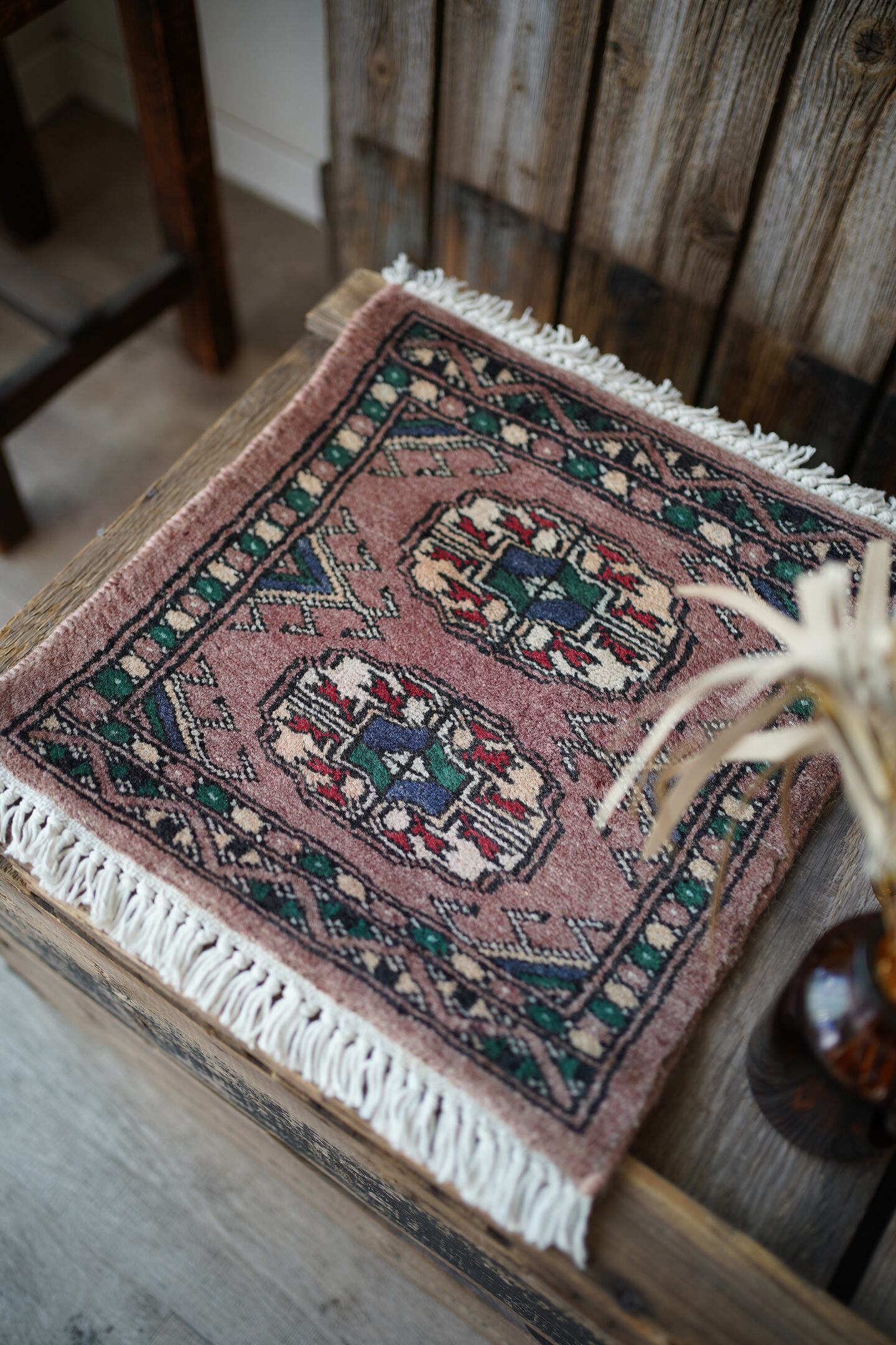 約30年前に織られたパキスタン産のミニラグです。配色は薄い小豆色(少しピンクみのある薄いブラウン)、グリーン、ベージュ、ネイビーなど。厚みは7mm程度で、表面はふわっと滑らかな肌触りをしています。コンディションは大変良好です。棚やテーブルの上に敷いて、小物や花瓶などを乗せればお気に入りの空間がとってもオシャレに。タペストリーとして壁に飾っても素敵かと思います♪