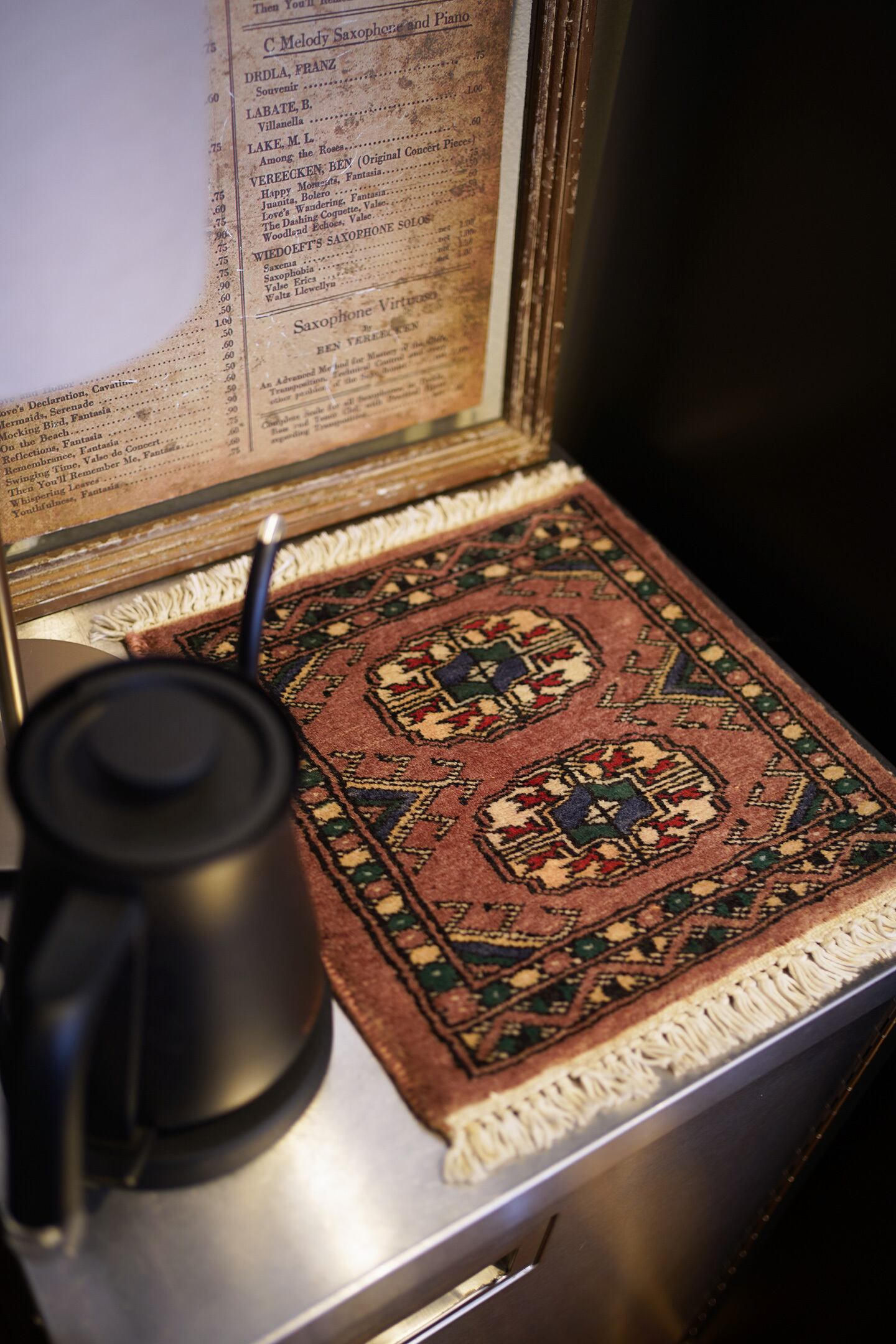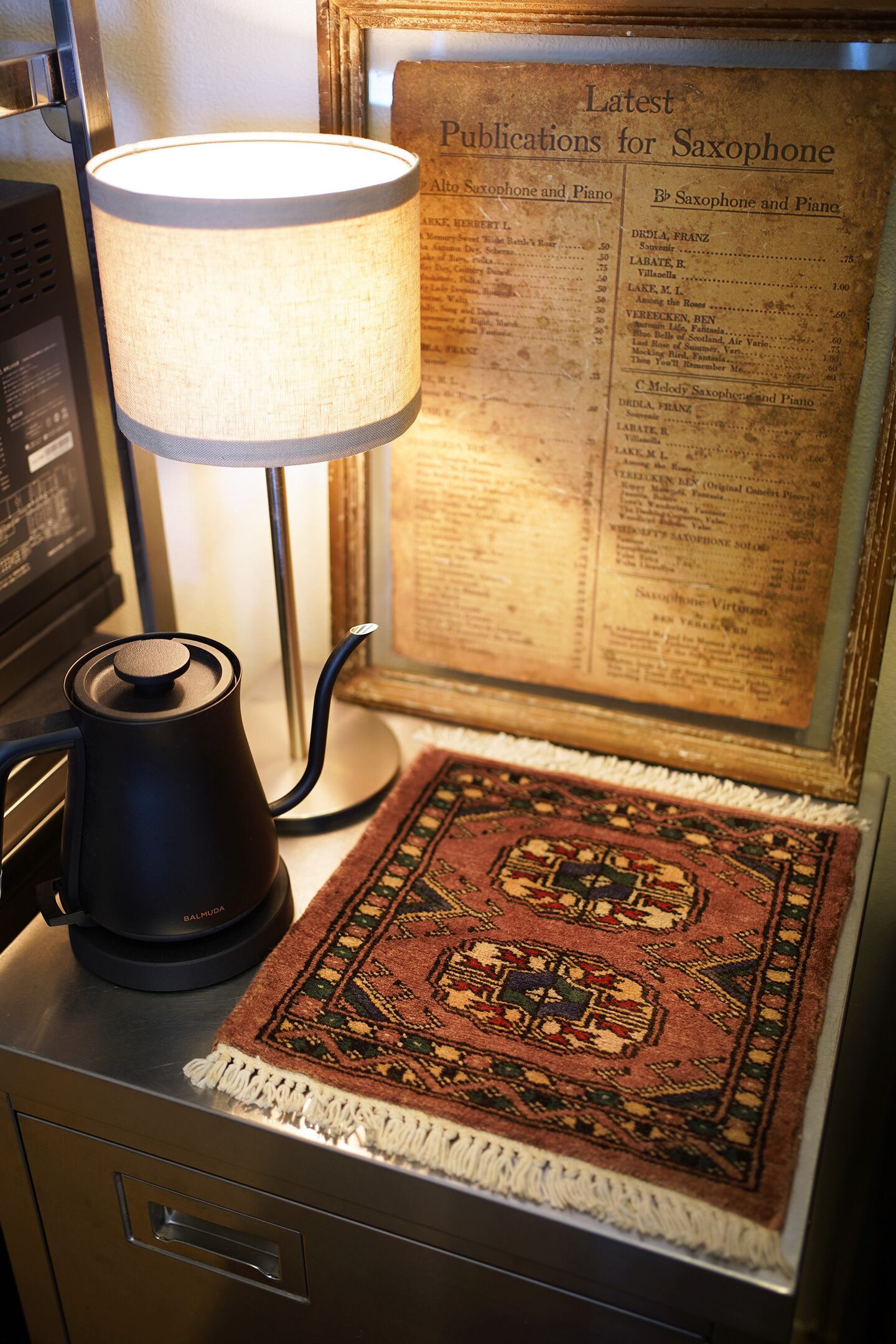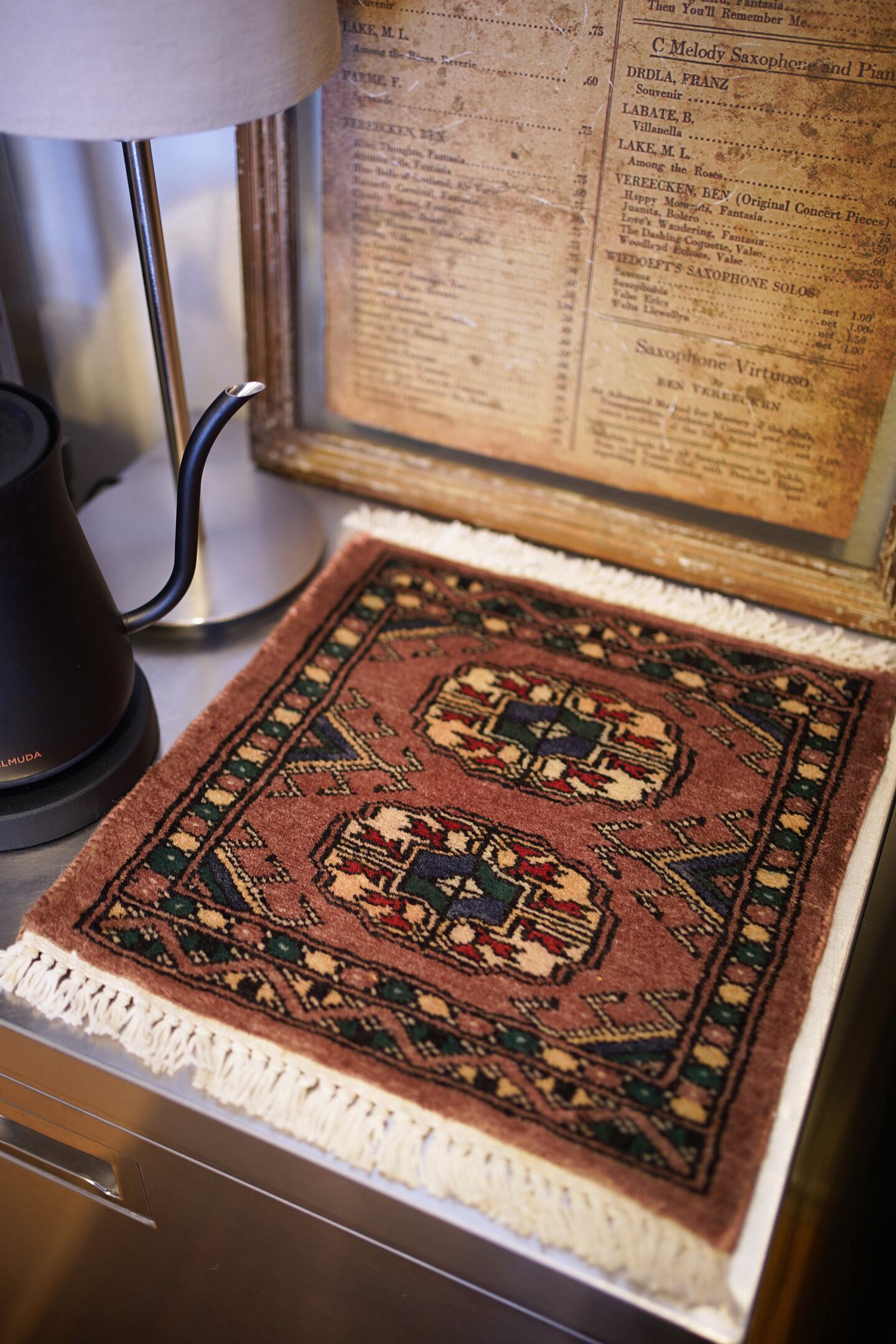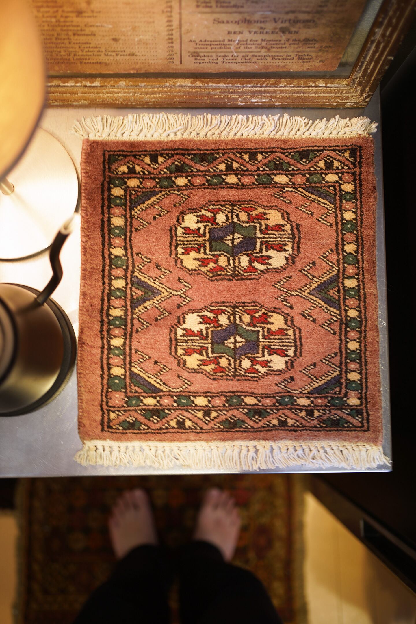 約30年前に織られたパキスタン産のミニラグです。配色は薄い小豆色(少しピンクみのある薄いブラウン)、グリーン、ベージュ、ネイビーなど。厚みは7mm程度で、表面はふわっと滑らかな肌触りをしています。コンディションは大変良好です。棚やテーブルの上に敷いて、小物や花瓶などを乗せればお気に入りの空間がとってもオシャレに。タペストリーとして壁に飾っても素敵かと思います♪