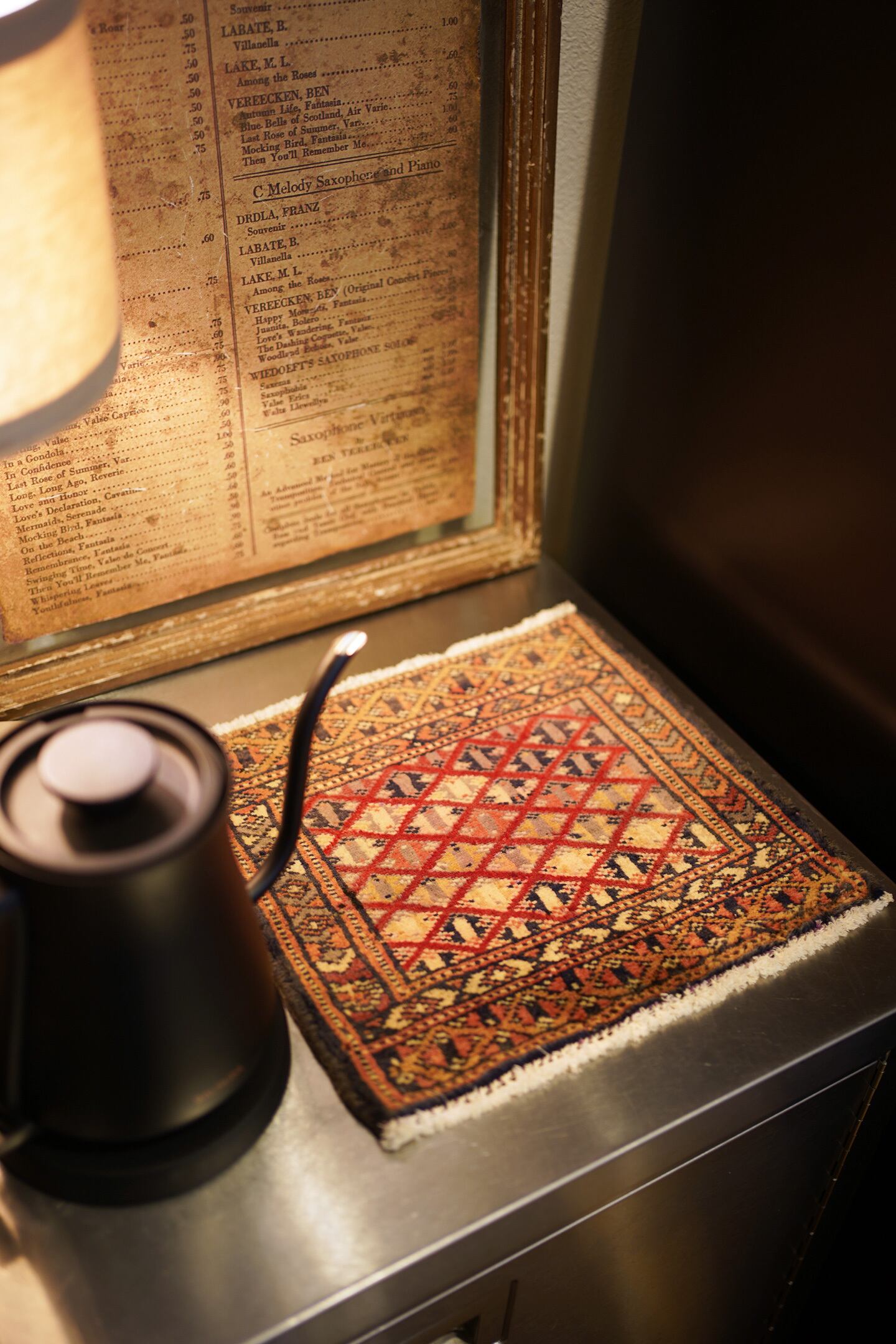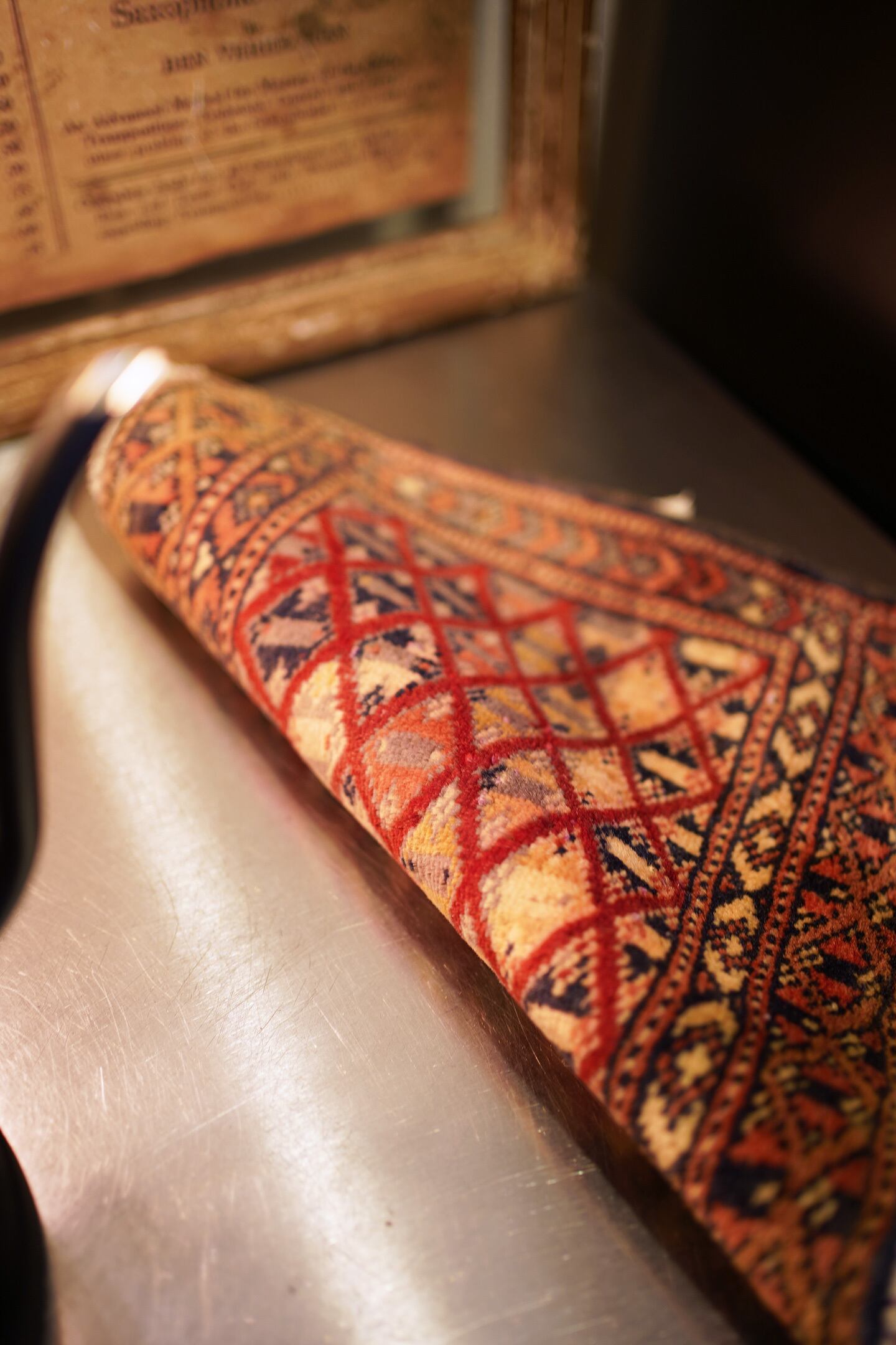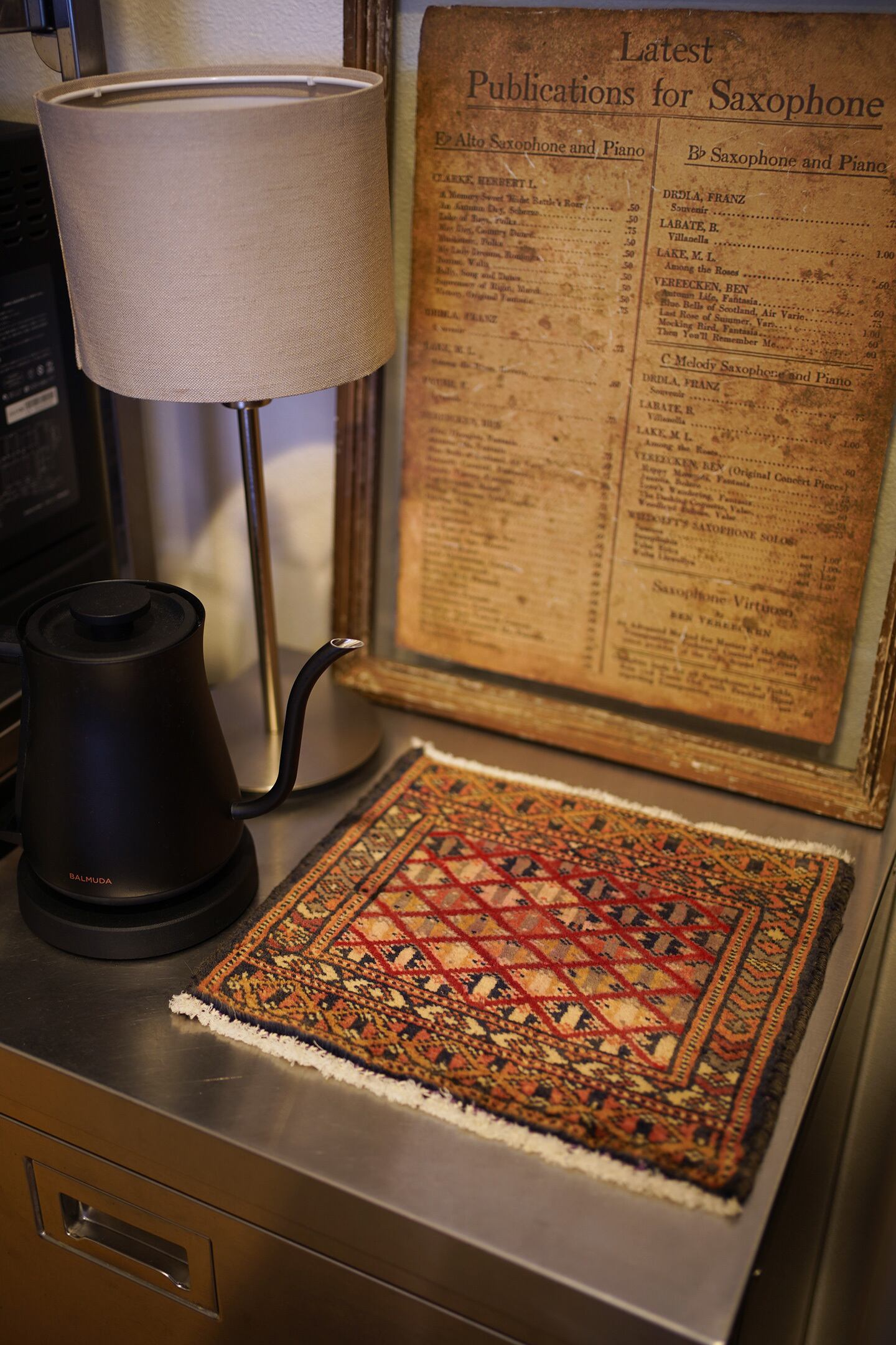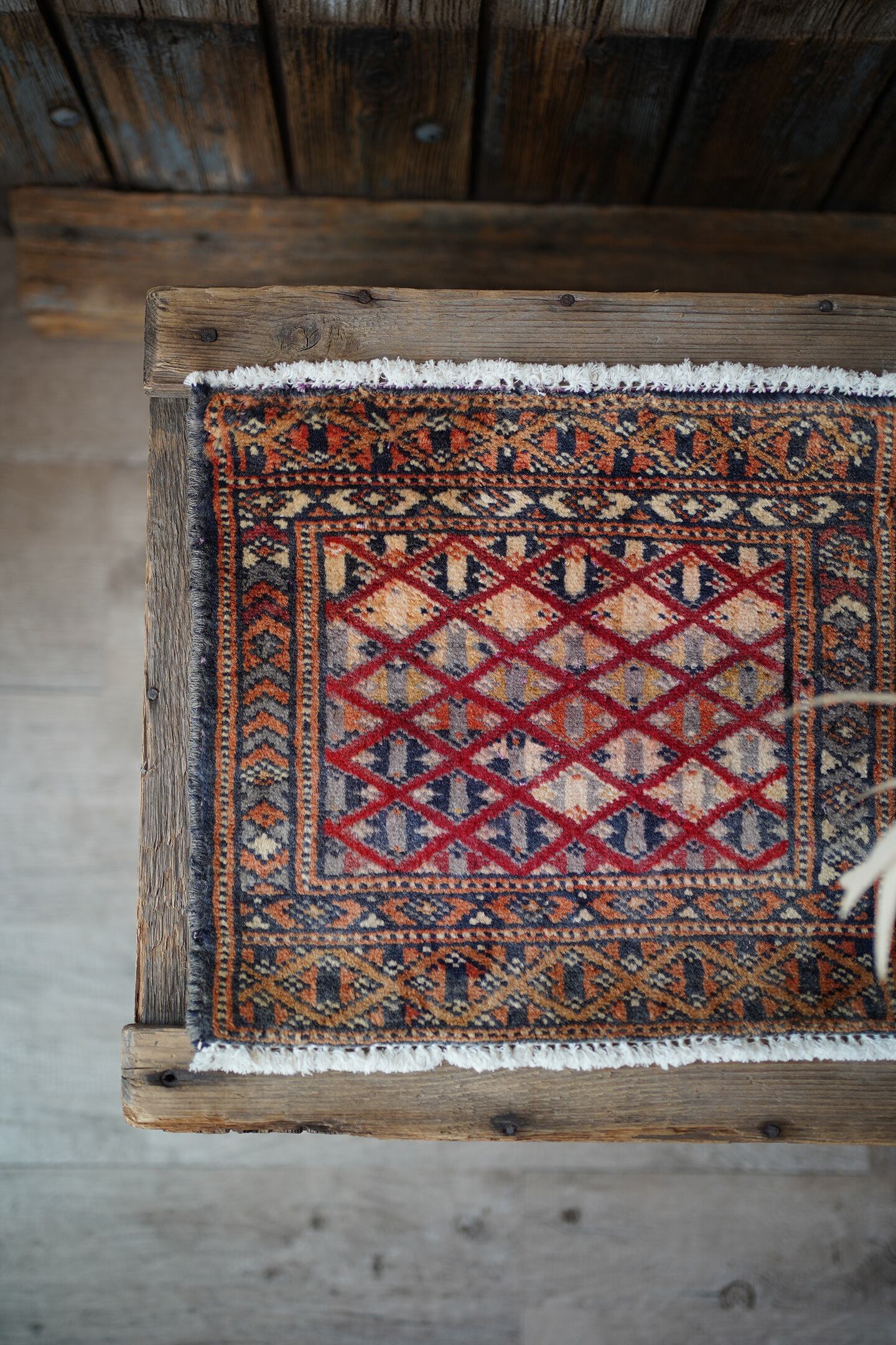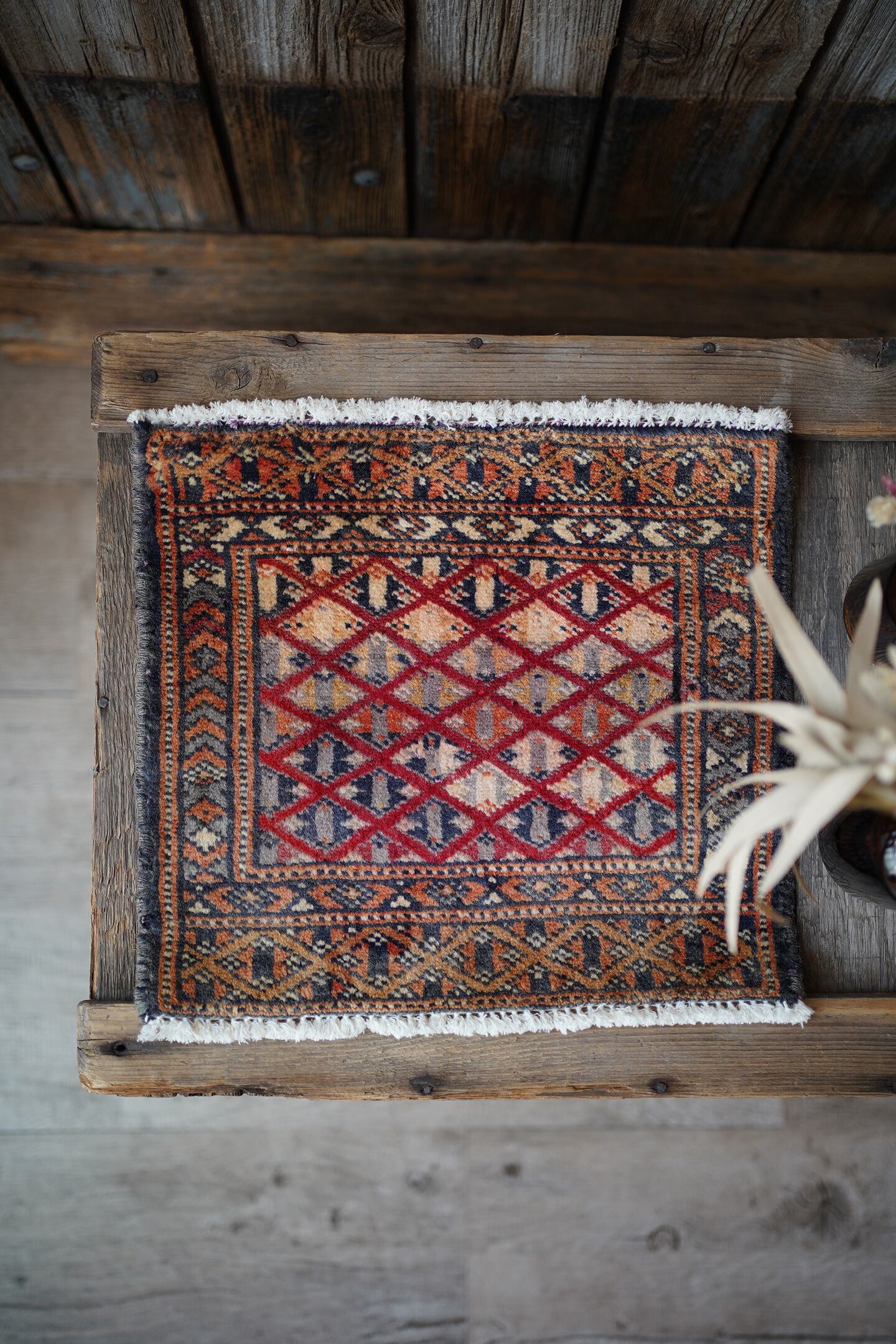 約30年前に織られたパキスタン産のミニラグです。配色は黒、赤、ベージュ、薄いオレンジなど。厚みは5mm程度で、表面はソフトウールで、ふわふわ優しい気持ちの良い肌触りをしています。コンディションは良好です。棚やテーブルの上に敷いて、小物や花瓶などを乗せればお気に入りの空間がとってもオシャレに。タペストリーとして壁に飾っても素敵かと思います♪