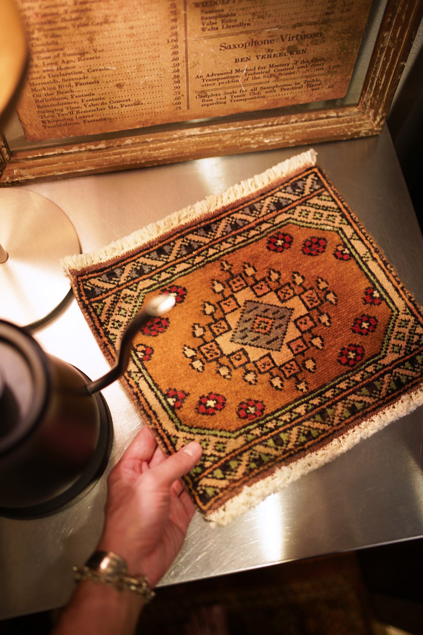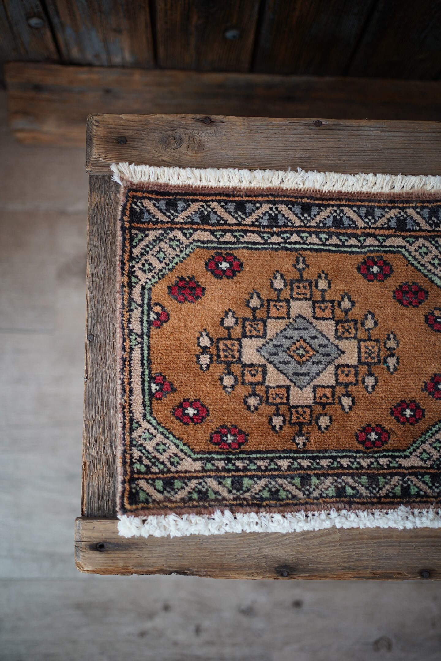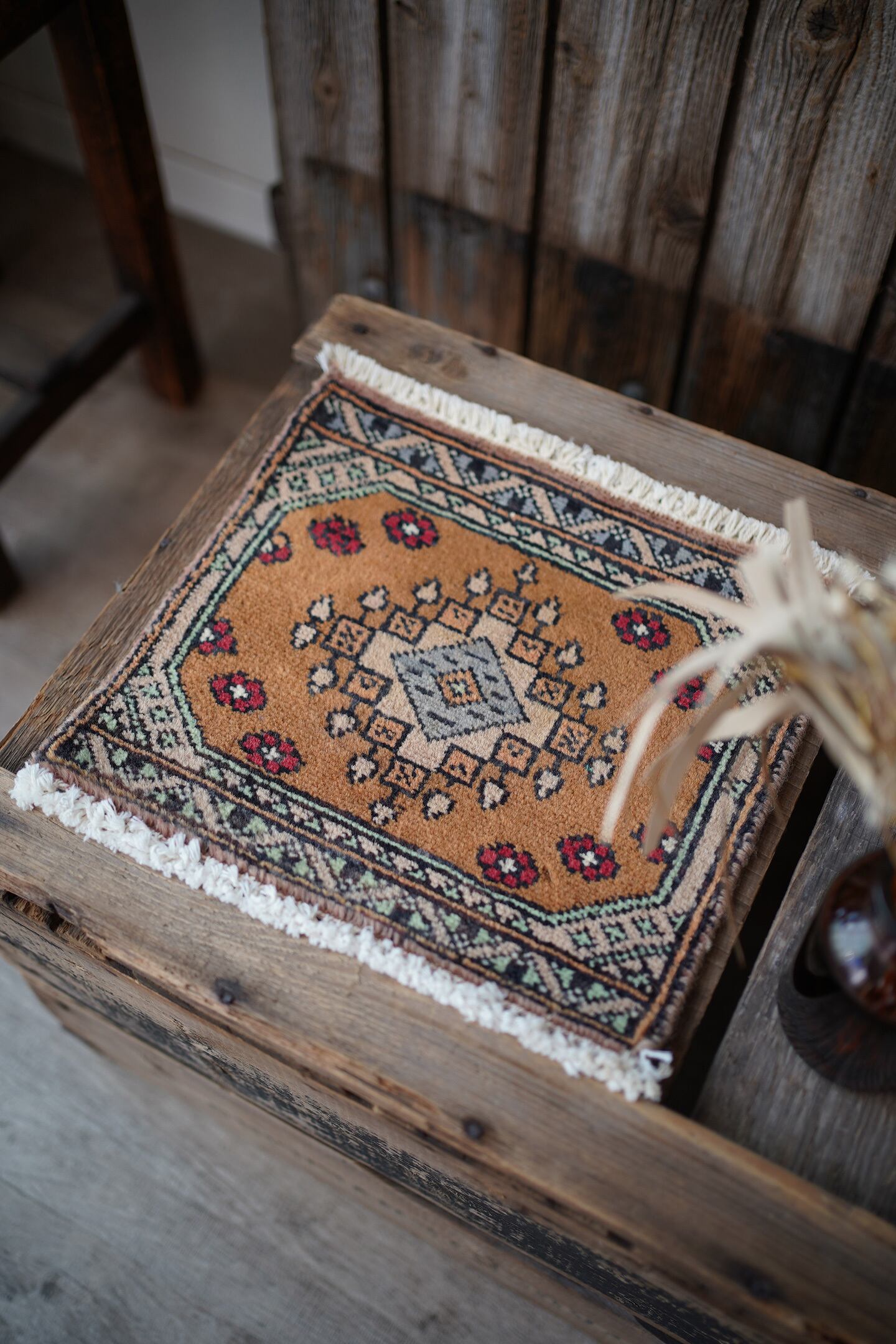 約30年前に織られたパキスタン産のミニラグです。配色はブラウン、グレー、薄いミントグリーン、ベージュ、赤など。厚みは5mm程度で、表面はサラふわっとした肌触りをしています。コンディションは良好です。棚やテーブルの上に敷いて、小物や花瓶などを乗せればお気に入りの空間がとってもオシャレに。タペストリーとして壁に飾っても素敵かと思います♪
