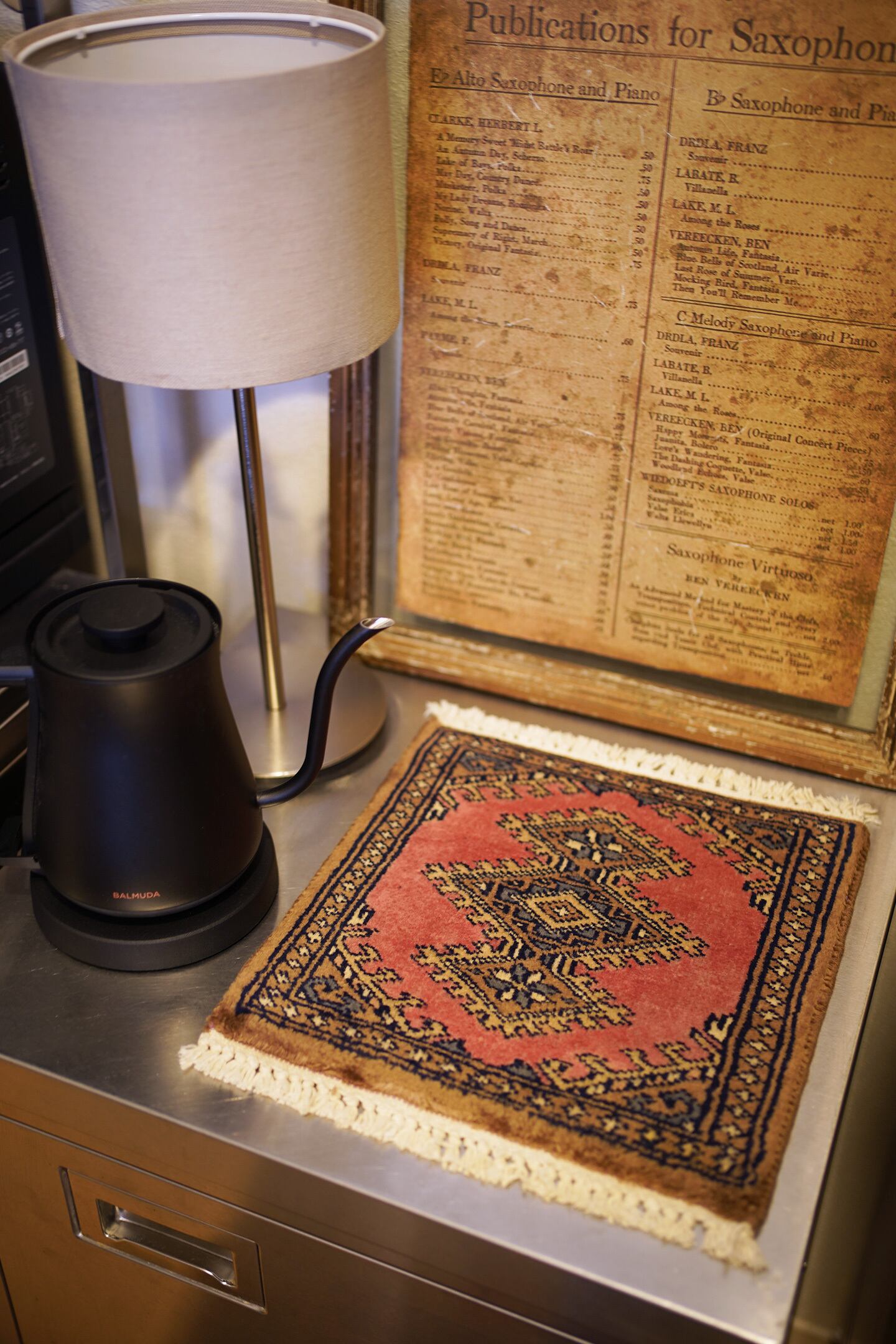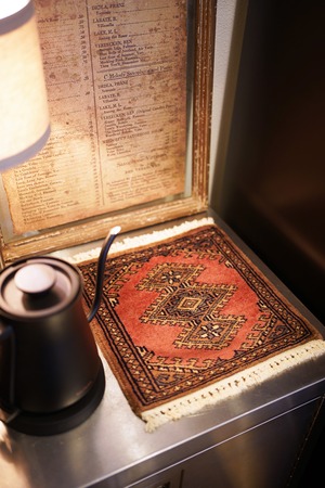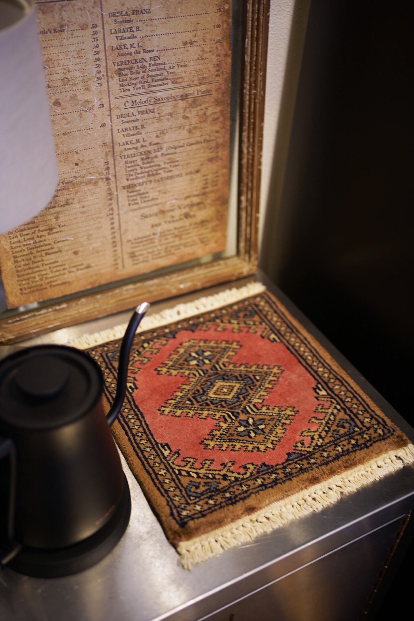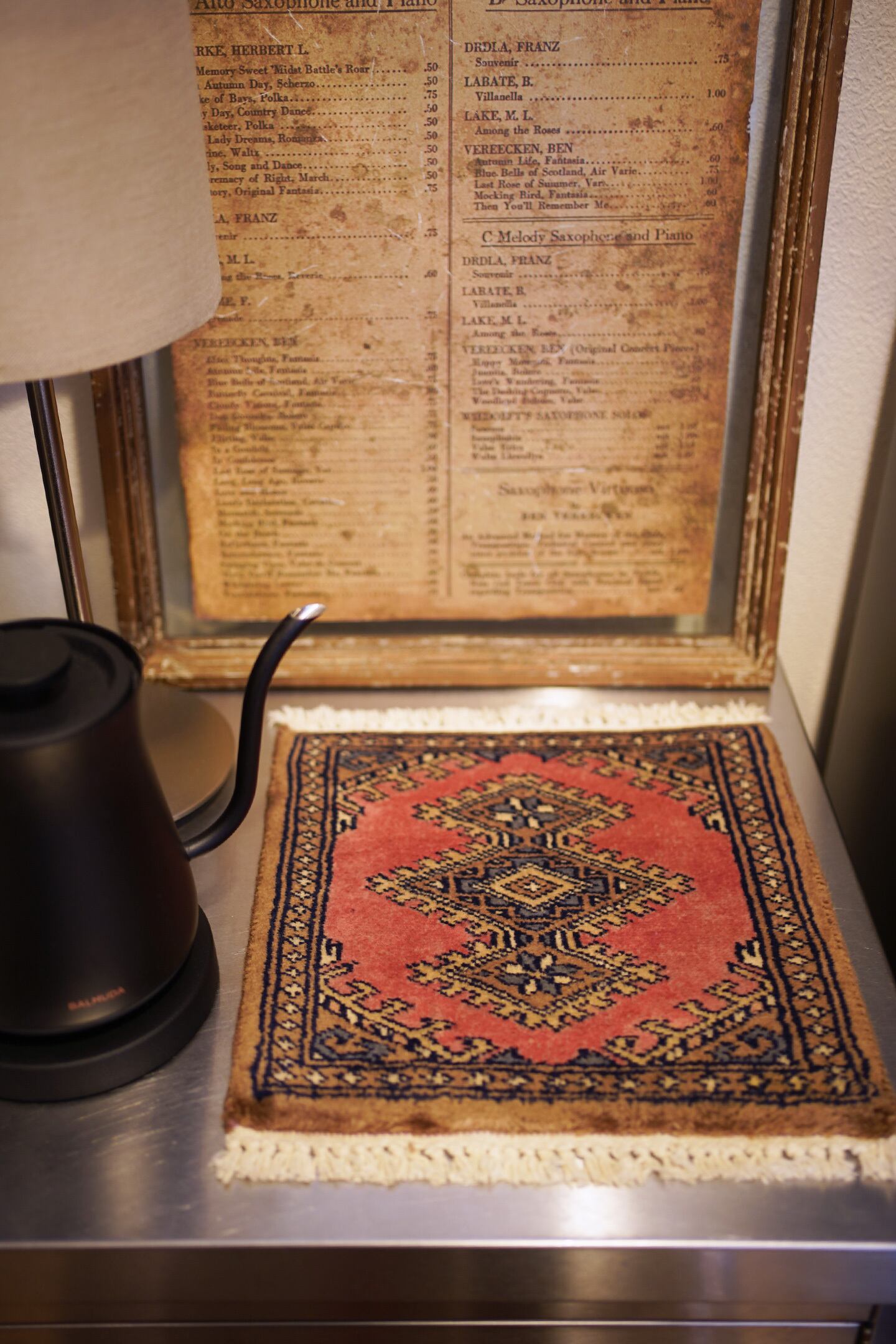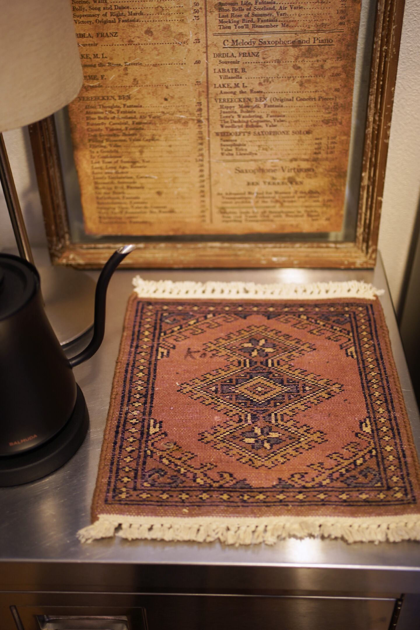 約30年前に織られたパキスタン産のミニラグです。配色はレッドピンク、ブラウン、ベージュ、グレーなど。厚みは6mm程度で、表面はふわっと滑らかな優しい肌触りをしています。裏にうっすらと文字の跡がありますのでお写真最後をご参照ください。コンディションとしては大変良好です。棚やテーブルの上に敷いて、小物や花瓶などを乗せればお気に入りの空間がとってもオシャレに。タペストリーとして壁に飾っても素敵かと思います♪