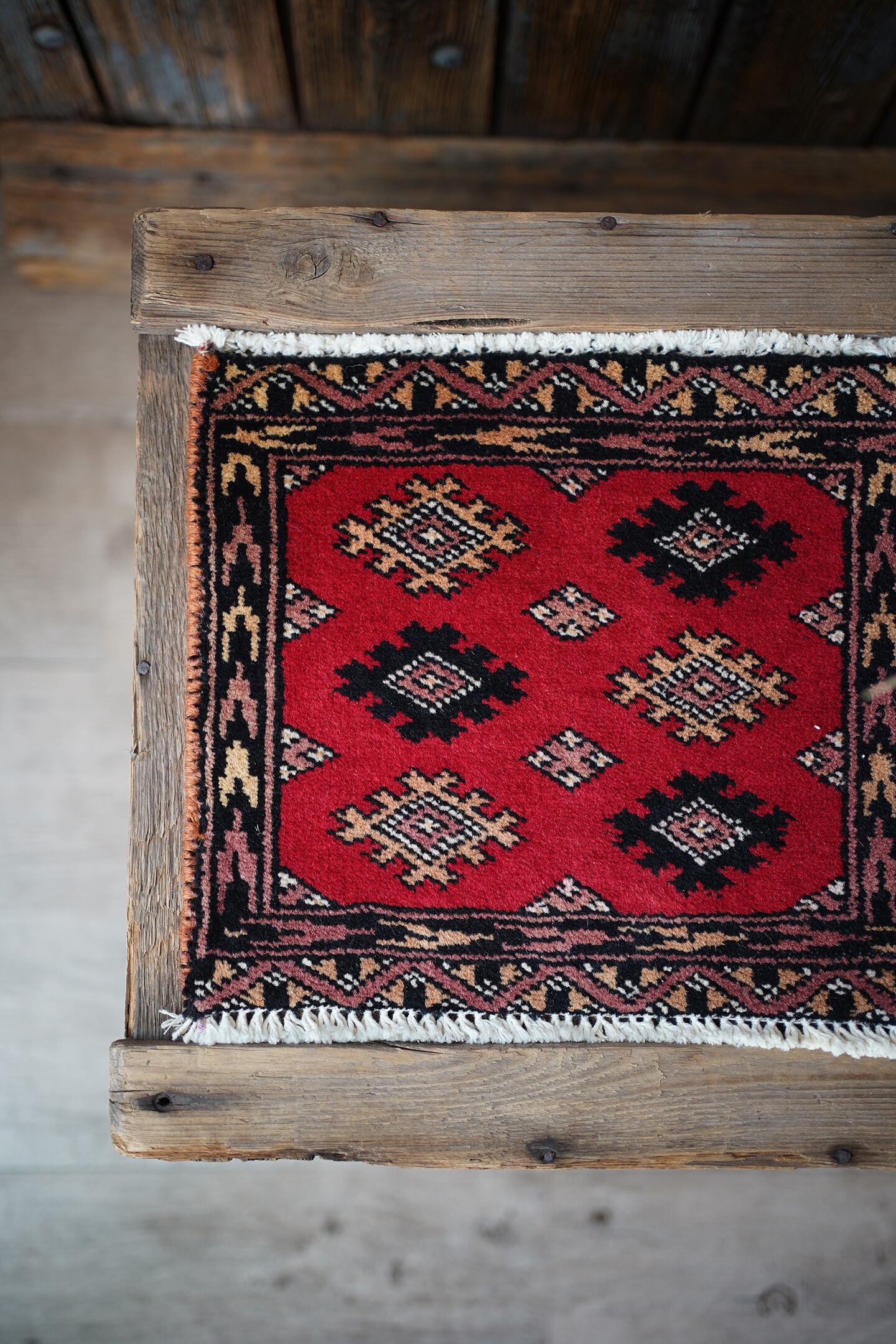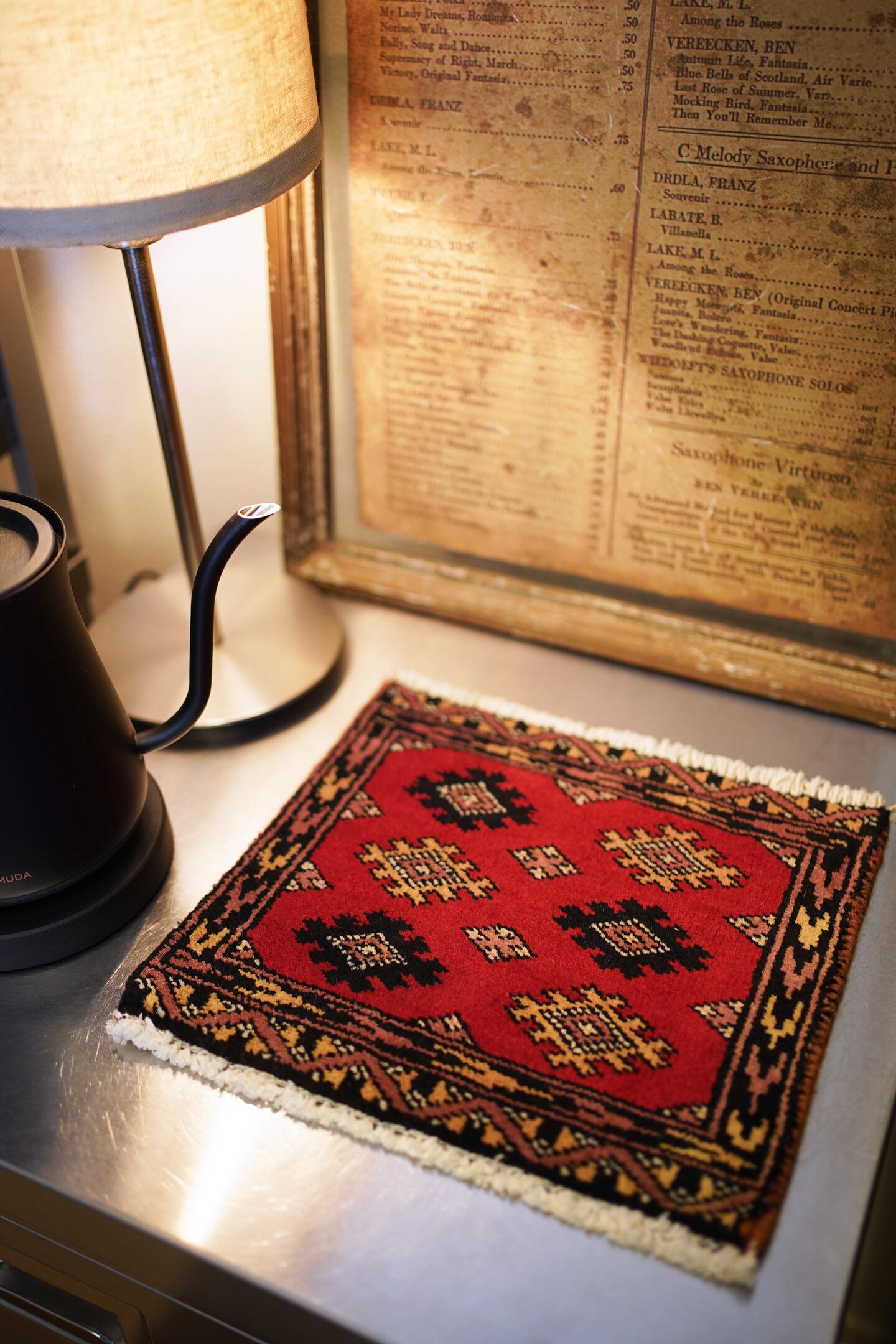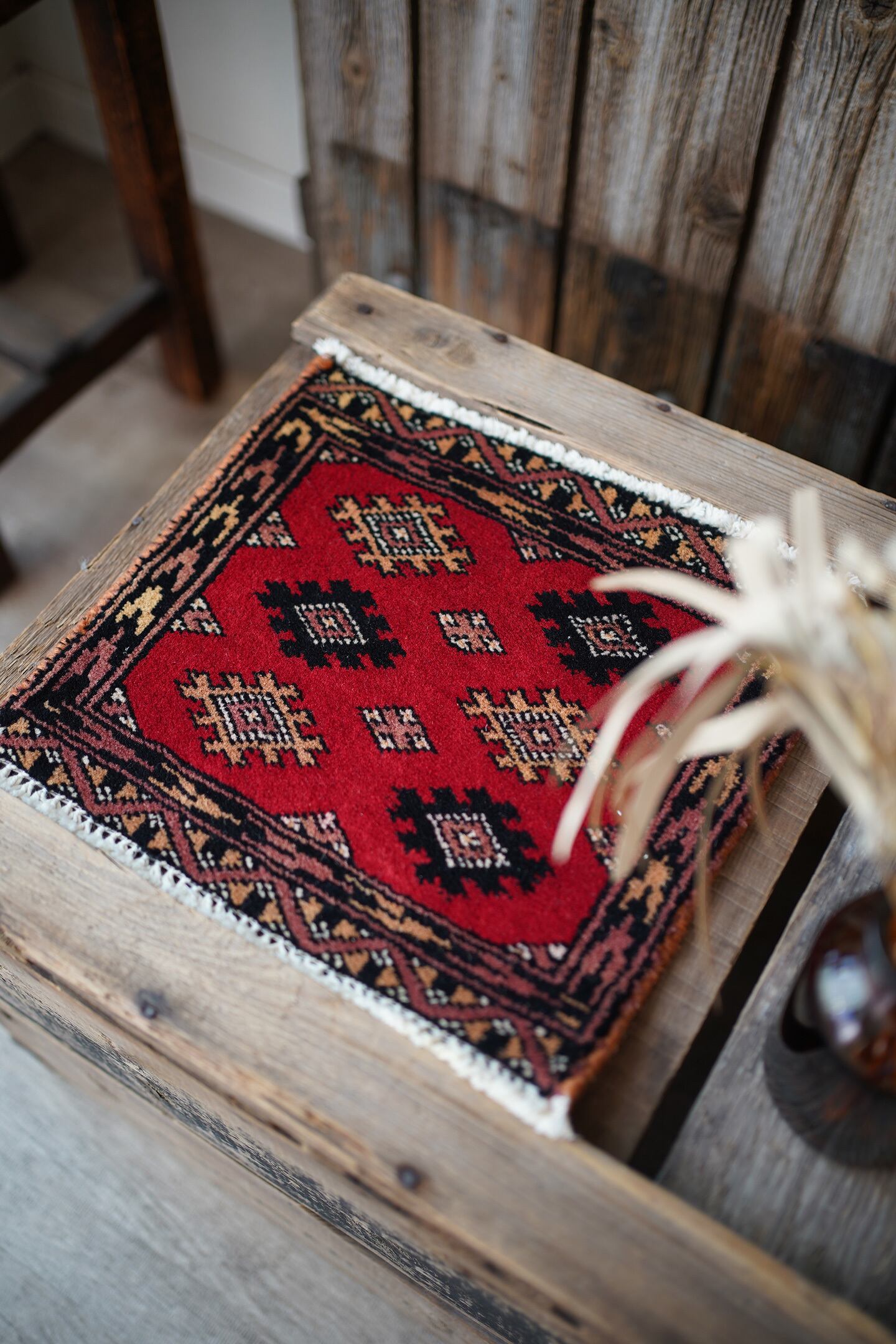 約30年前に織られたパキスタン産のミニラグです。配色は濃い赤、黒、ベージュブラウンなど。厚みは6mm〜7mm程度で、表面はサラふわっとした肌触りをしています。コンディションはパーフェクト。棚やテーブルの上に敷いて、小物や花瓶などを乗せればお気に入りの空間がとってもオシャレに。タペストリーとして壁に飾っても素敵かと思います♪