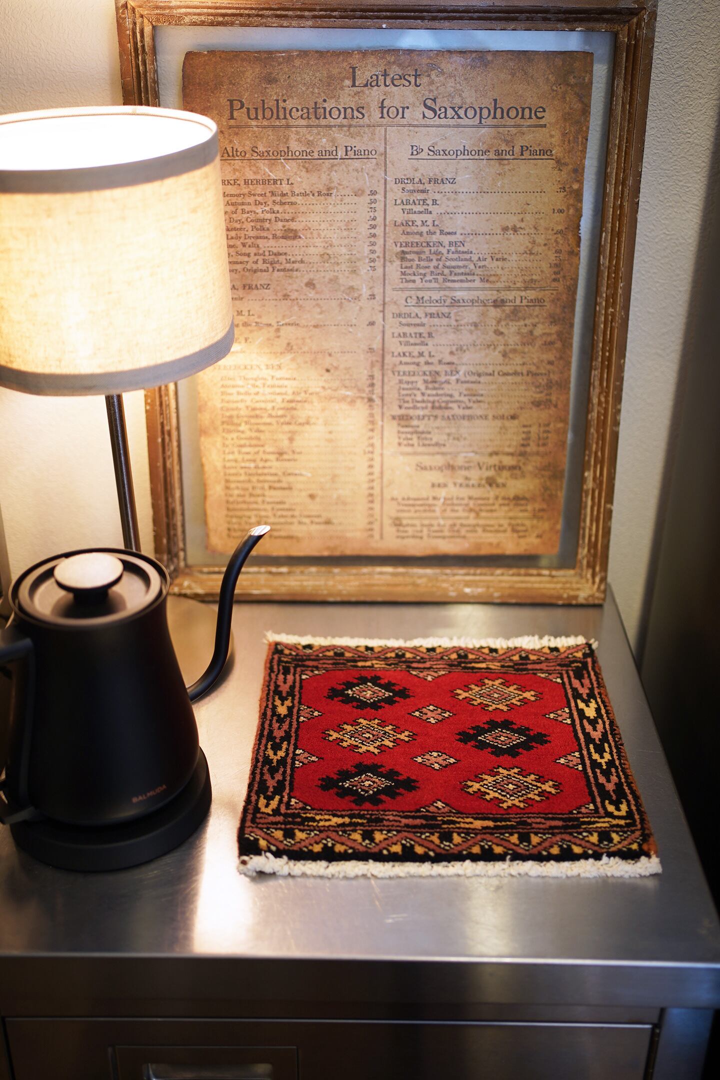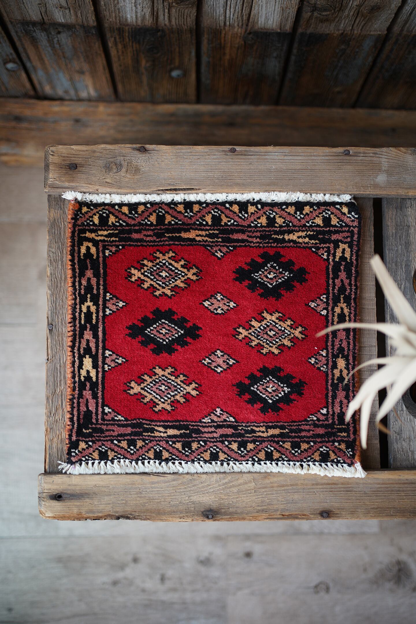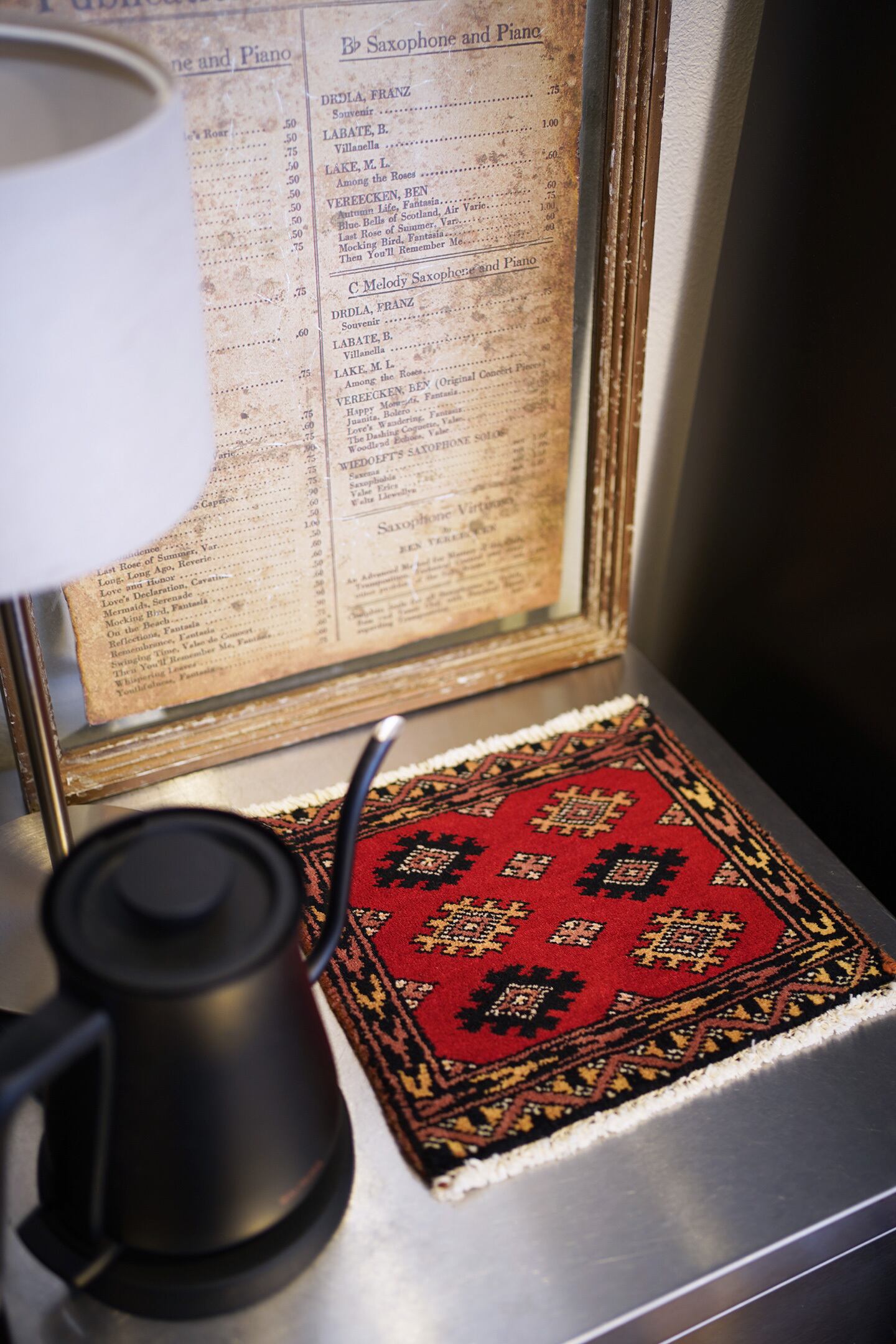 約30年前に織られたパキスタン産のミニラグです。配色は濃い赤、黒、ベージュブラウンなど。厚みは6mm〜7mm程度で、表面はサラふわっとした肌触りをしています。コンディションはパーフェクト。棚やテーブルの上に敷いて、小物や花瓶などを乗せればお気に入りの空間がとってもオシャレに。タペストリーとして壁に飾っても素敵かと思います♪