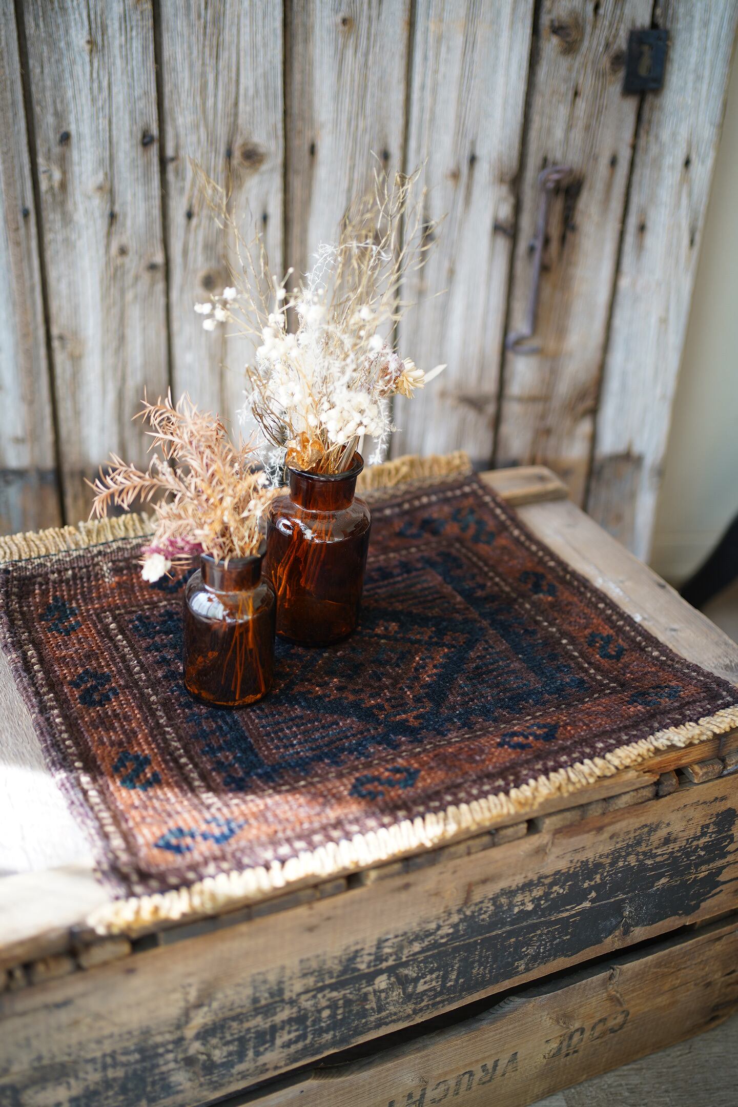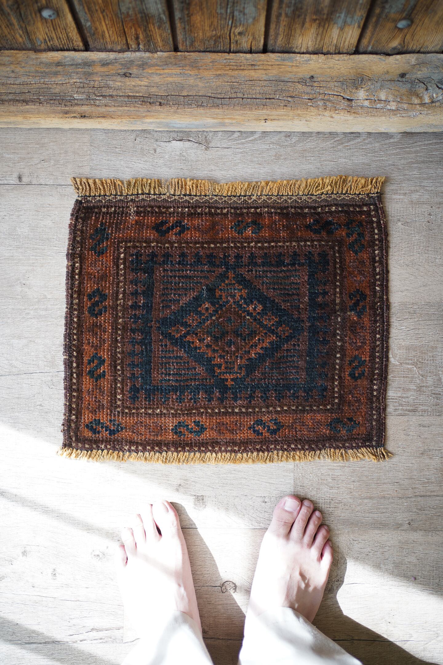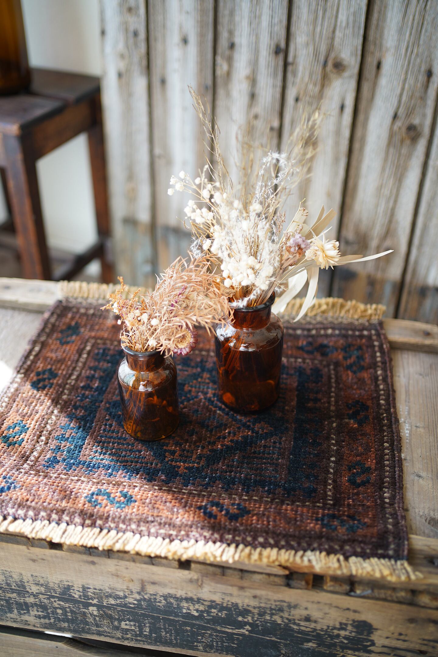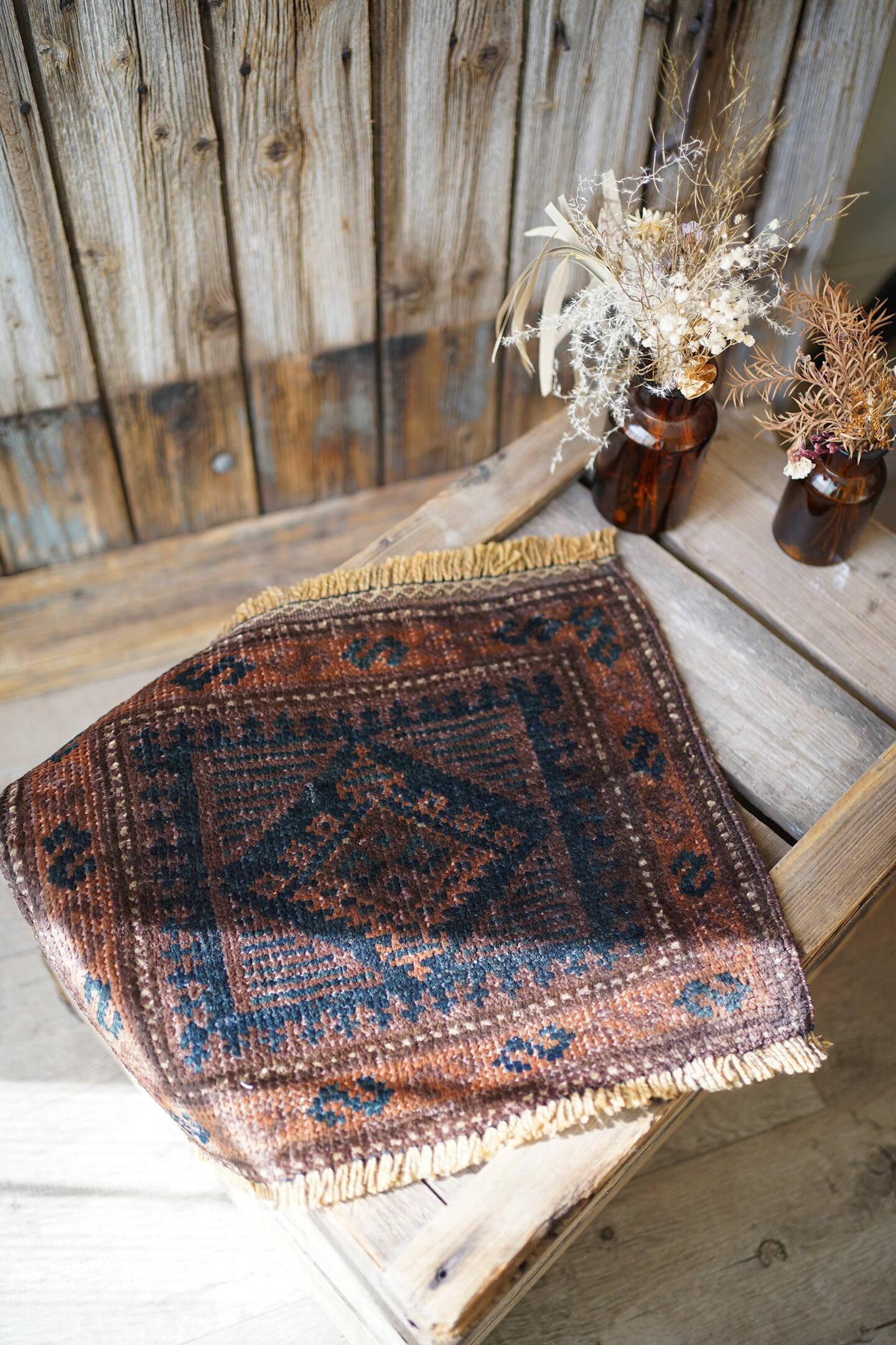 約90年〜100年前にアフガニスタン北西部に居住するタイマニ族によって織られたアンティークのお品です。長い年月を経て醸し出す風合い、深い焦茶と濃紺の渋い配色、艶のあるパイルが魅力的な一枚。中央にはシンプルな菱形紋様、周りにはS字紋様が織り込まれています。厚みは4mm程度と薄く、表面はサラッと滑らかなパイルを感じる肌触り。目立たない補修跡が2箇所ありますが、それ以外は状態も良好です(お写真最後の1枚、中央と左上をご確認ください)。アンティーク家具との相性が非常に良さそうですね♫