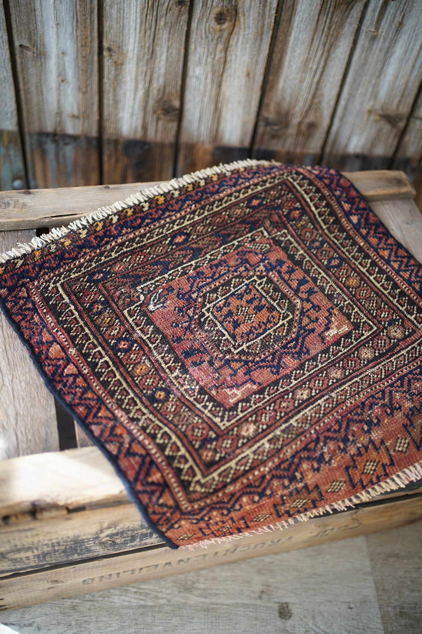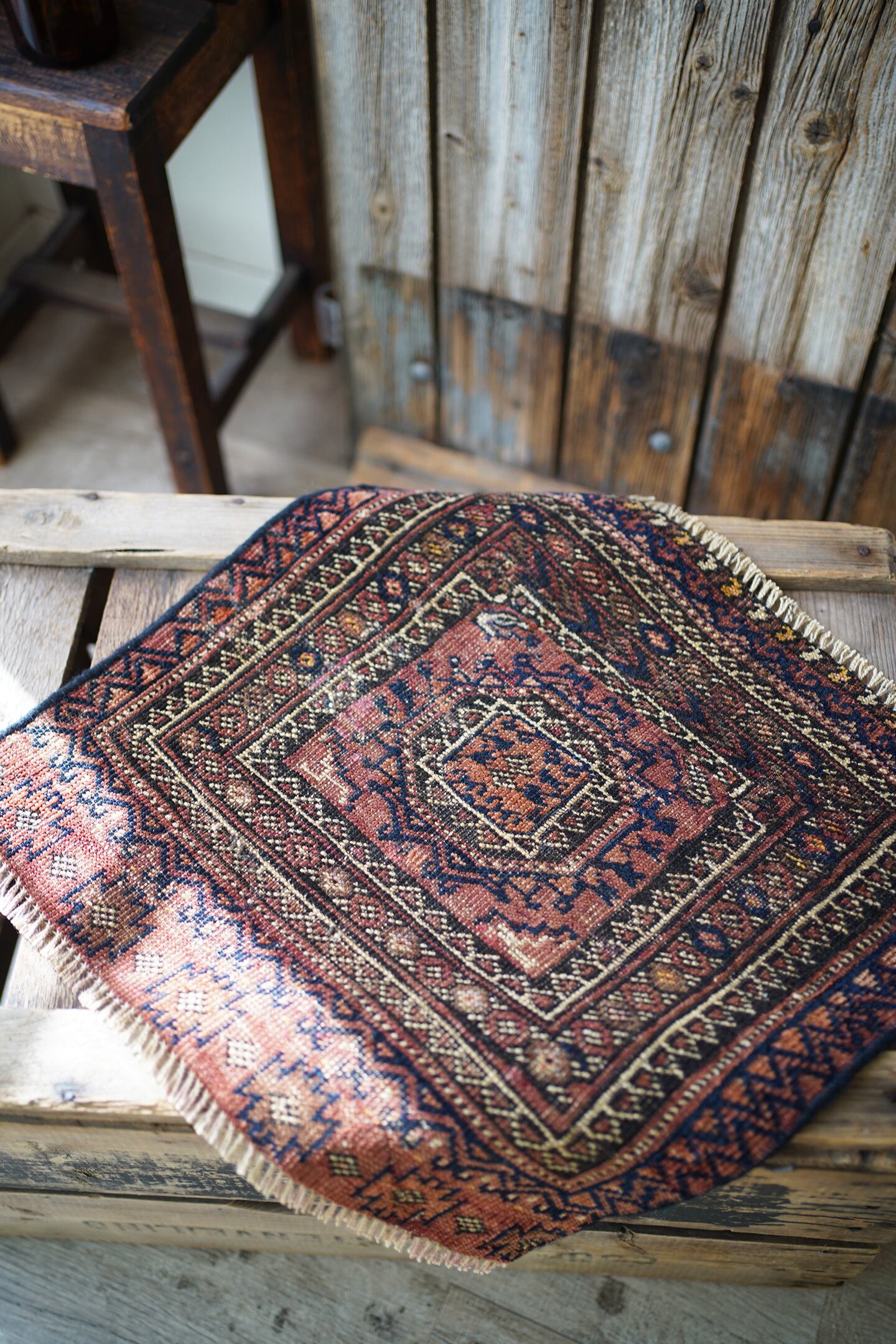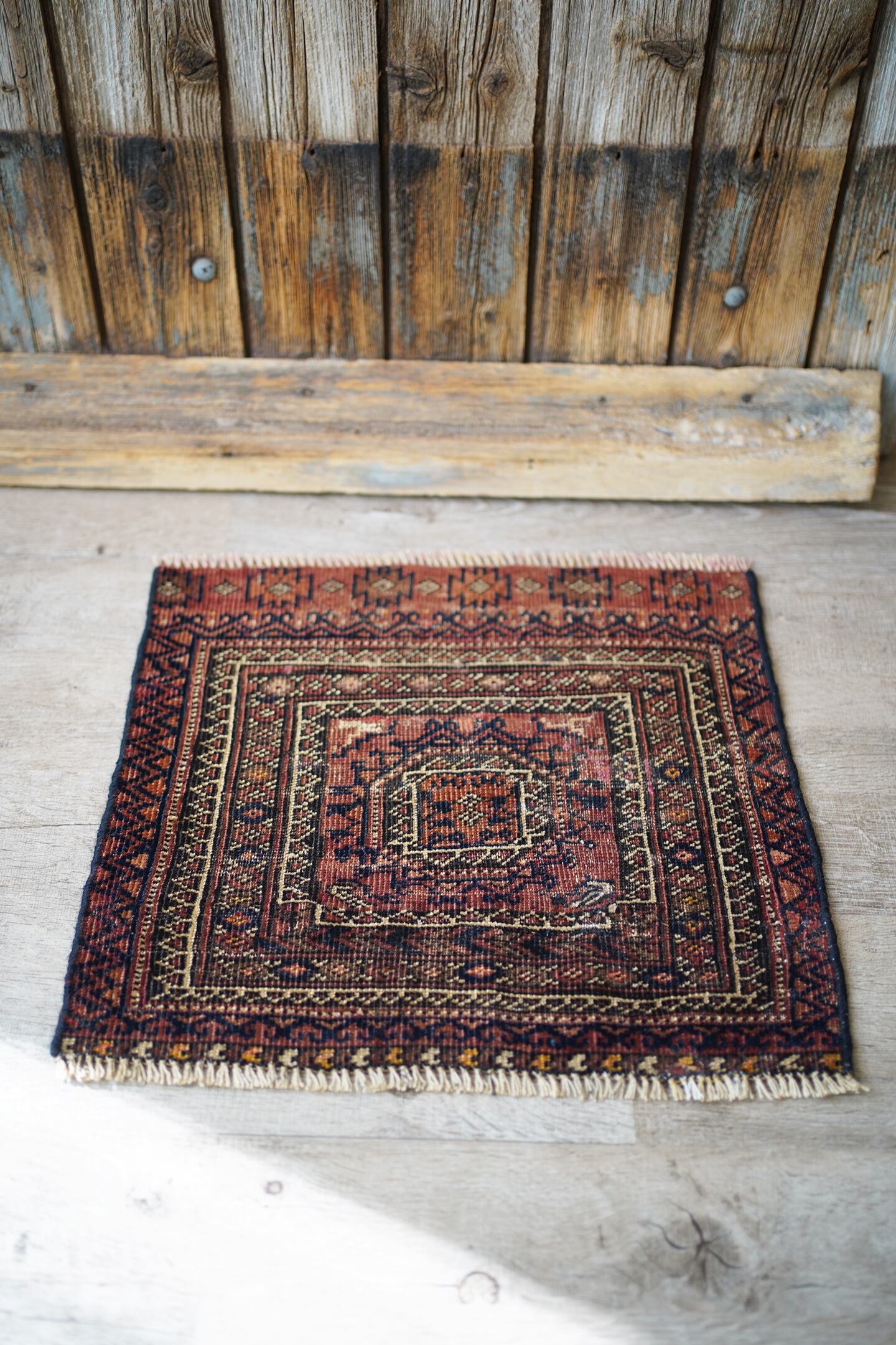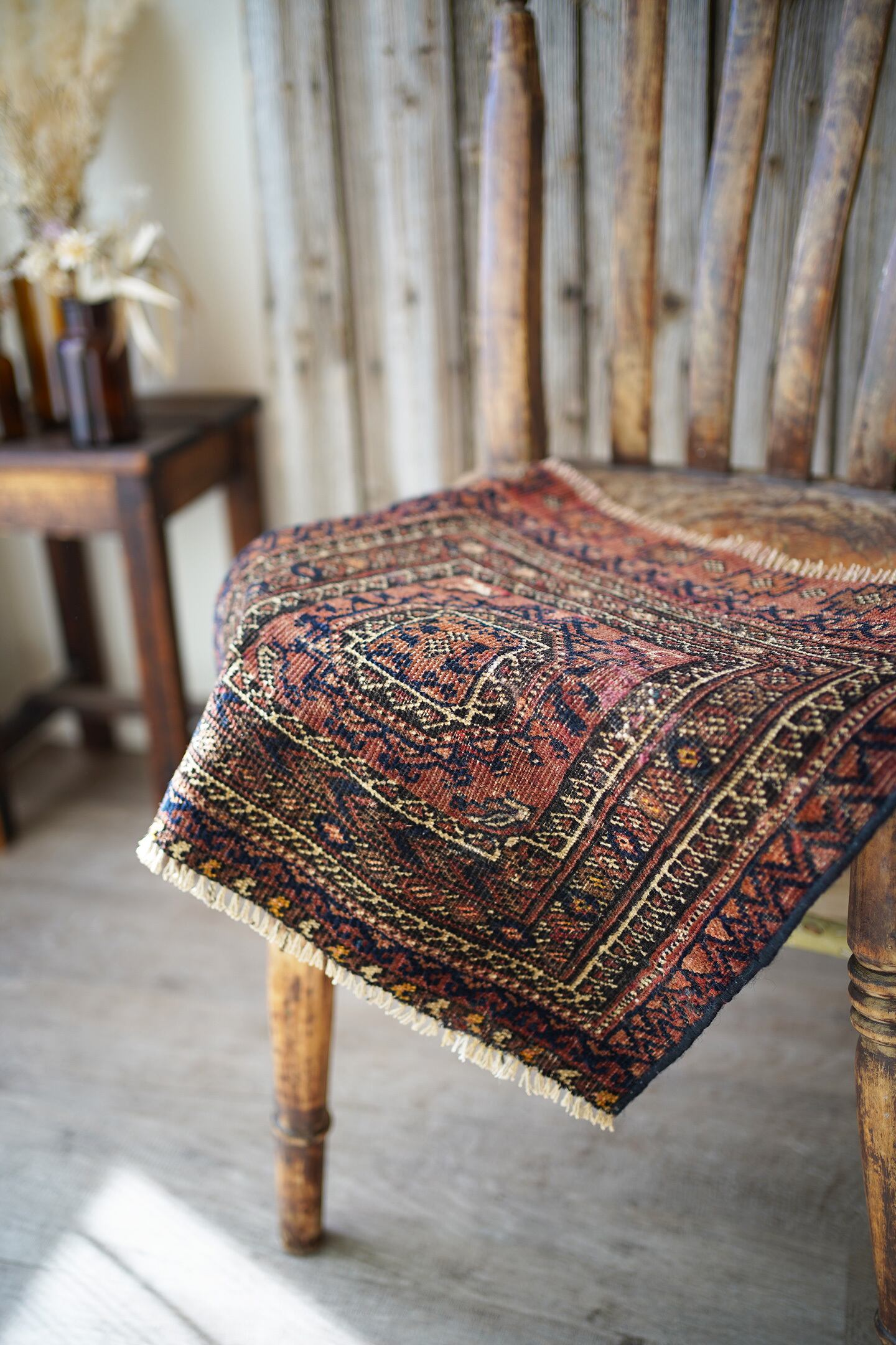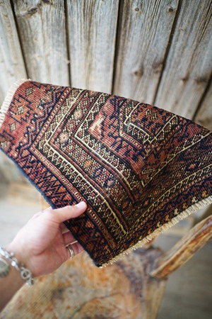 おおよそ100年〜120年前に織られたイラン産のアンティークのバルーチラグ。100年以上の経年を感じさせる味のある擦れた風合いが渋く、小さいながらも非常に存在感があります。テラコッタ、ブラック、ベージュの統一感のある配色も素敵です。表面はサラッとしつつも、ほんのりパイルを感じる優しい肌触り。厚みは3mm〜4mm程度と薄く、ペラっとした質感です。所々補修されておりますが、綺麗に修理されておりよく見ないとわからない程度です(お写真最後をご参照ください)。タペストリーとして、いつも眺められる位置に飾っていただきたい素晴らしい一枚です。