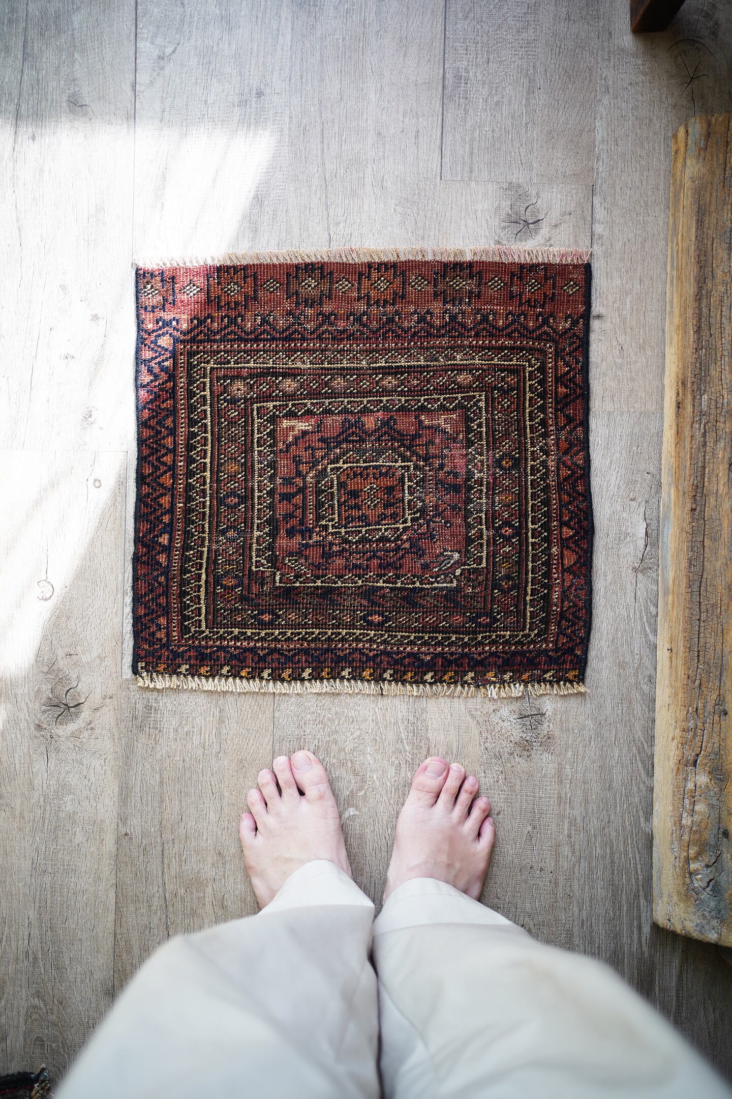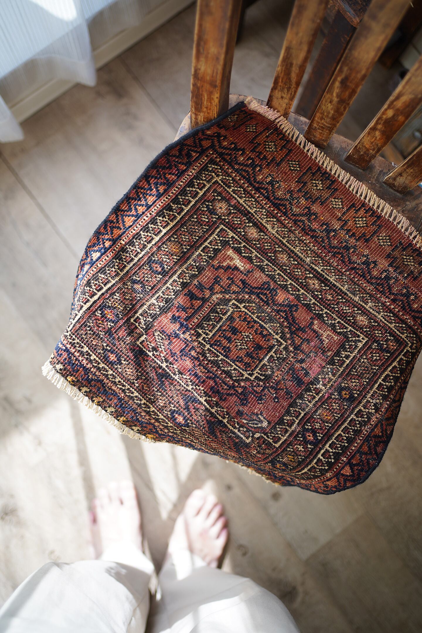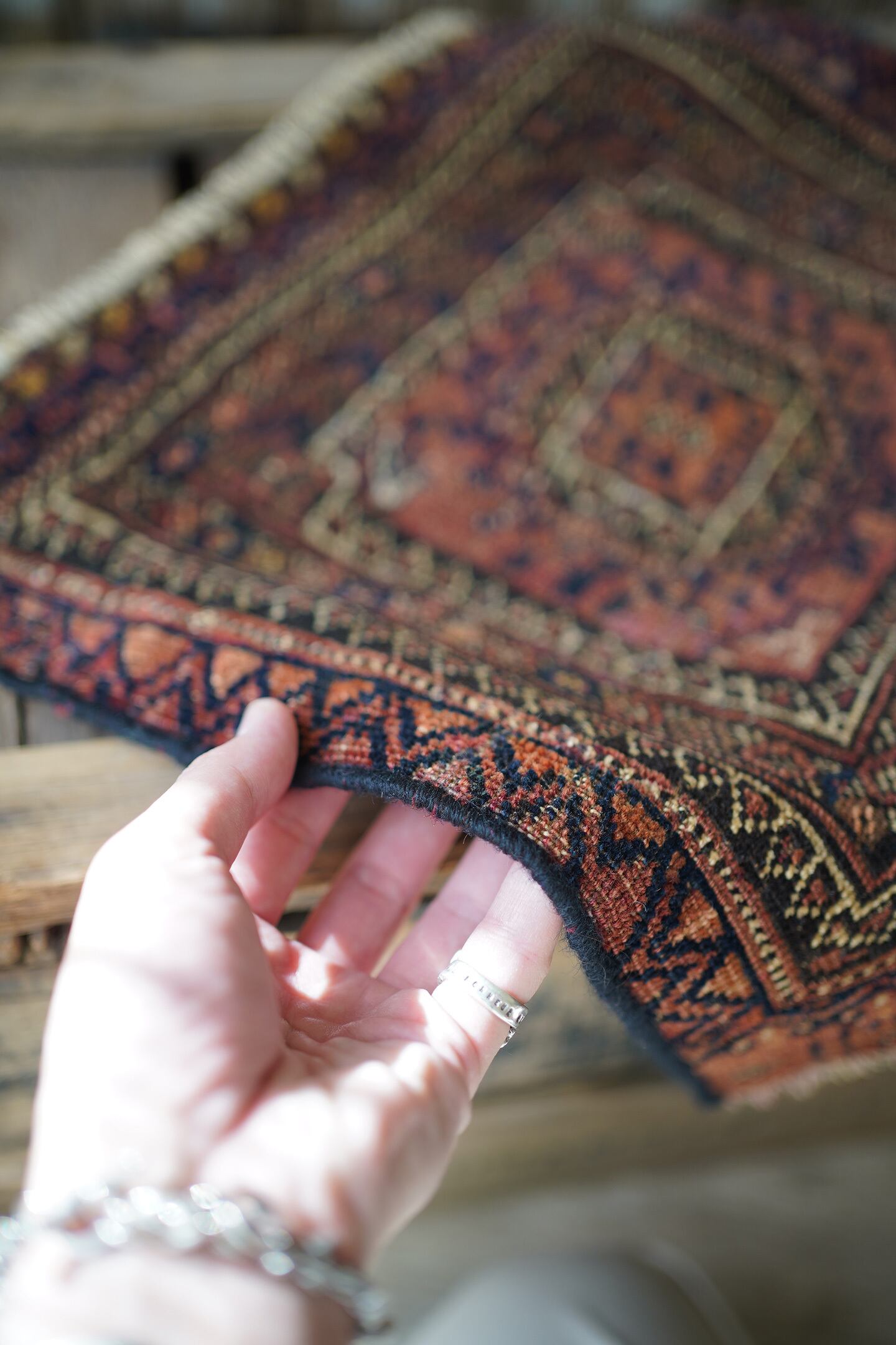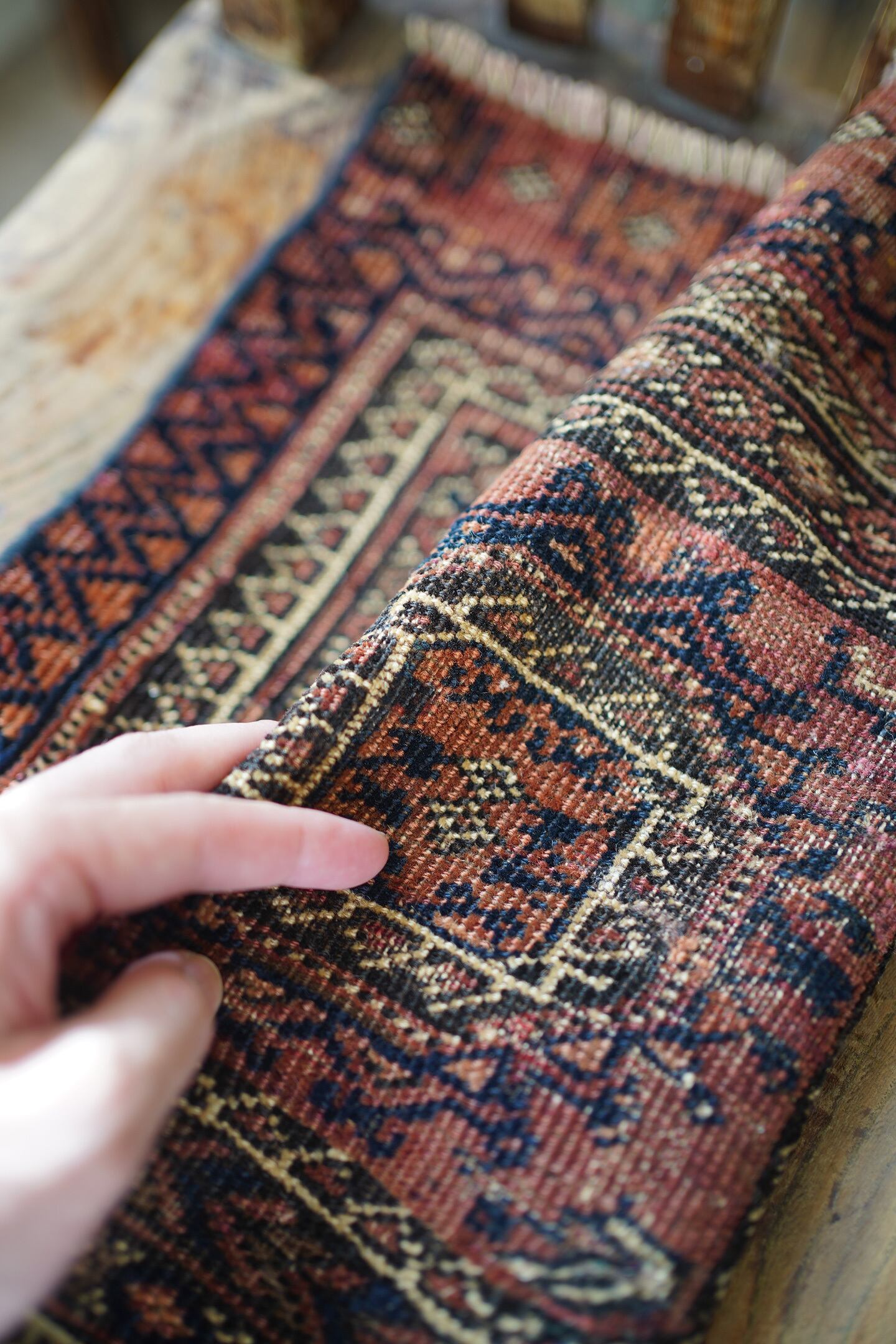 おおよそ100年〜120年前に織られたイラン産のアンティークのバルーチラグ。100年以上の経年を感じさせる味のある擦れた風合いが渋く、小さいながらも非常に存在感があります。テラコッタ、ブラック、ベージュの統一感のある配色も素敵です。表面はサラッとしつつも、ほんのりパイルを感じる優しい肌触り。厚みは3mm〜4mm程度と薄く、ペラっとした質感です。所々補修されておりますが、綺麗に修理されておりよく見ないとわからない程度です(お写真最後をご参照ください)。タペストリーとして、いつも眺められる位置に飾っていただきたい素晴らしい一枚です。