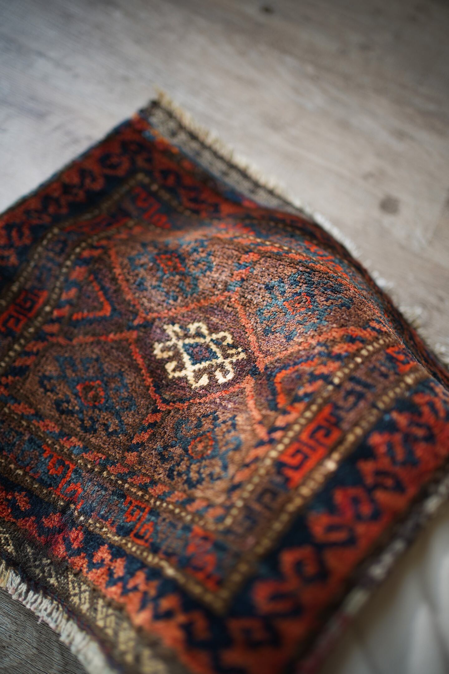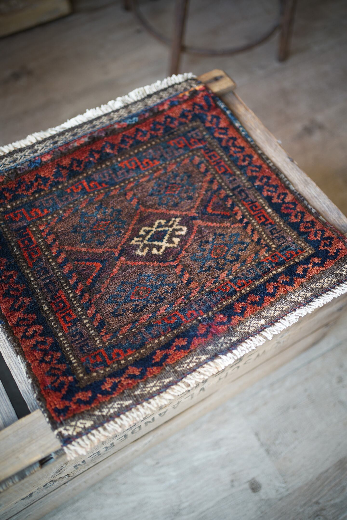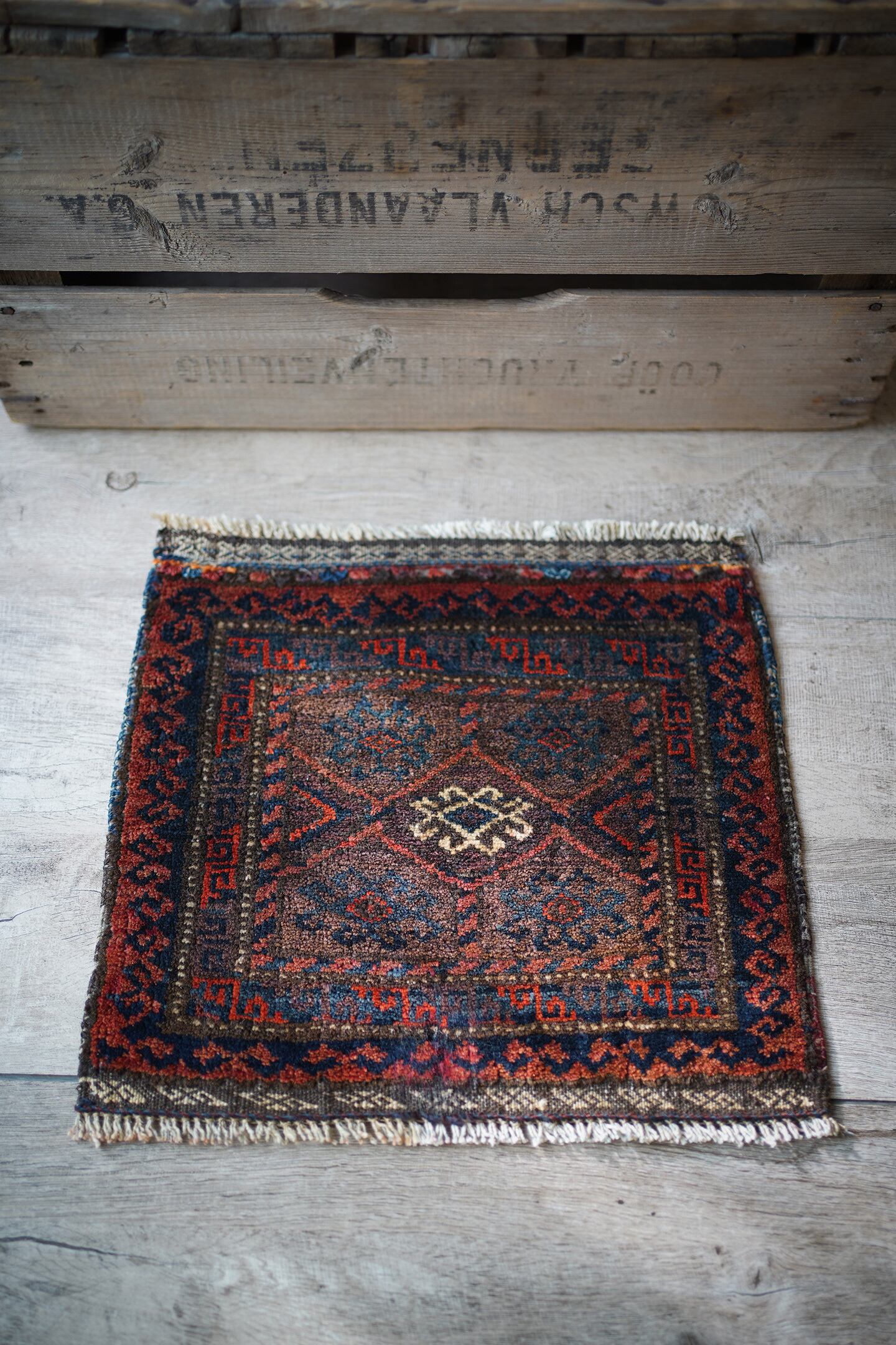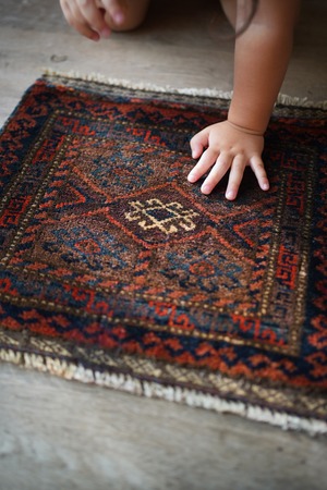 おおよそ90年前〜100年前に織られたイラン産のアンティークのバルーチラグ。パイル全体に艶があり美しく、バランスの取れたデザインで、小さいサイズながらも大変魅力的な一枚です。配色は朱色、暗めのブルーグリーン、ベージュのシックな色合い。上下フリンジの箇所はキリムエンドになっています。表面はサラふわっとした肌触りで、厚みは5mm〜6mm程度です。下のフリンジ箇所の細い糸がほつれていますのでお写真最後にてご確認ください(こういった細い糸はヴィンテージやアンティークでは綺麗に整っていることは非常に稀ですので、経年の味わいとしてお楽しみいただければと思います)。タペストリーとして飾ったり、棚の上のアクセントにもGOODです♫