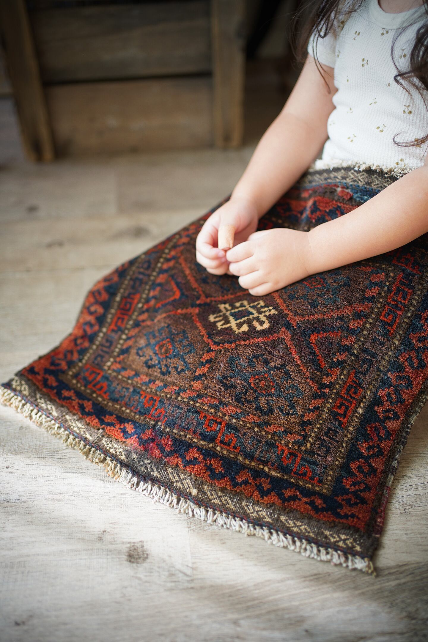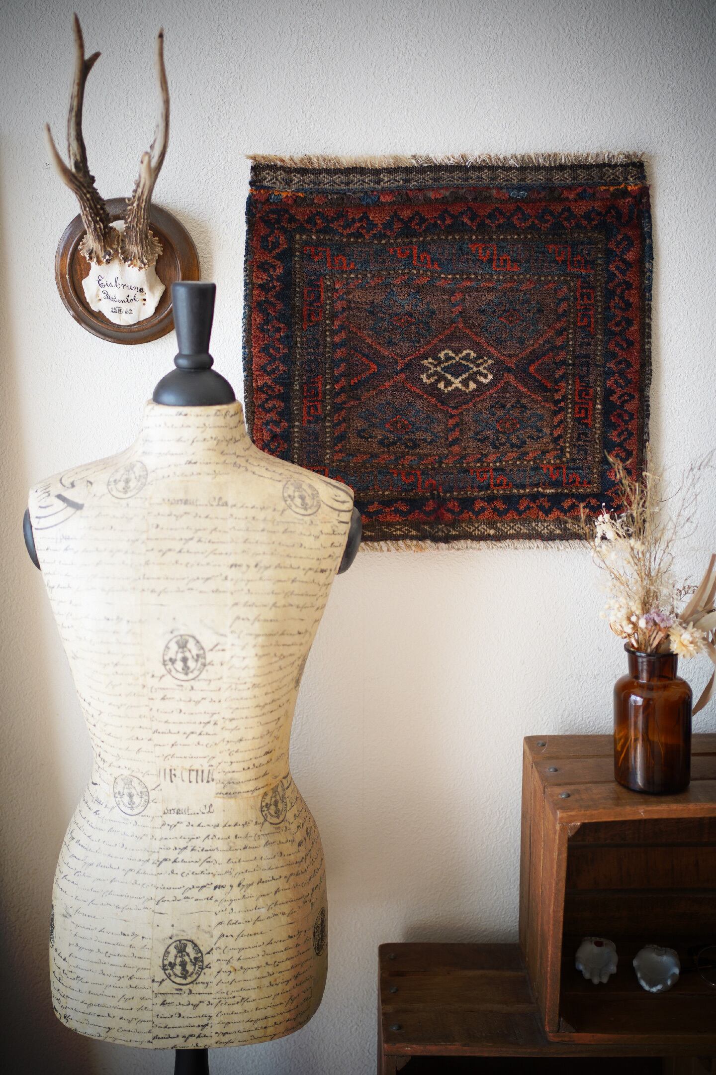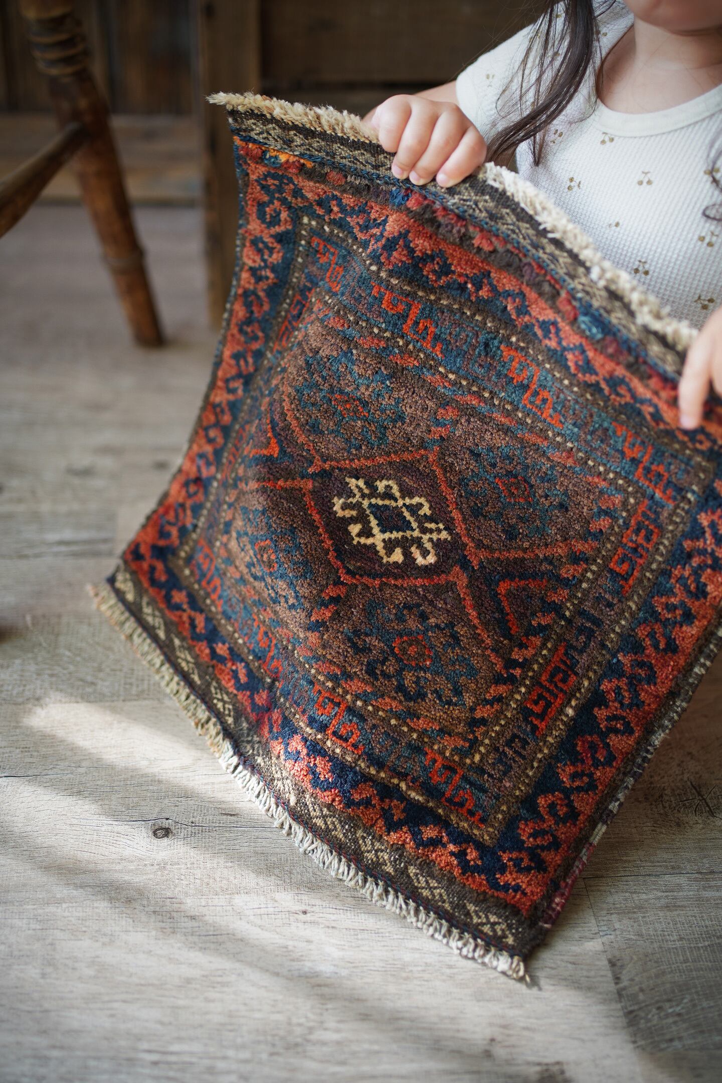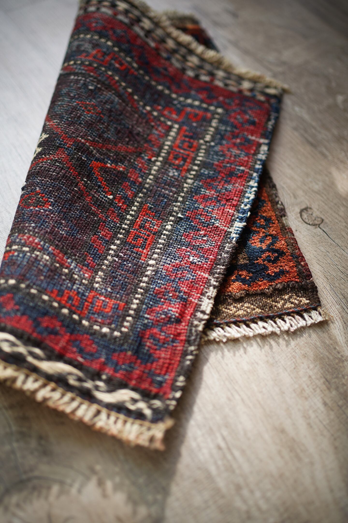 おおよそ90年前〜100年前に織られたイラン産のアンティークのバルーチラグ。パイル全体に艶があり美しく、バランスの取れたデザインで、小さいサイズながらも大変魅力的な一枚です。配色は朱色、暗めのブルーグリーン、ベージュのシックな色合い。上下フリンジの箇所はキリムエンドになっています。表面はサラふわっとした肌触りで、厚みは5mm〜6mm程度です。下のフリンジ箇所の細い糸がほつれていますのでお写真最後にてご確認ください(こういった細い糸はヴィンテージやアンティークでは綺麗に整っていることは非常に稀ですので、経年の味わいとしてお楽しみいただければと思います)。タペストリーとして飾ったり、棚の上のアクセントにもGOODです♫
