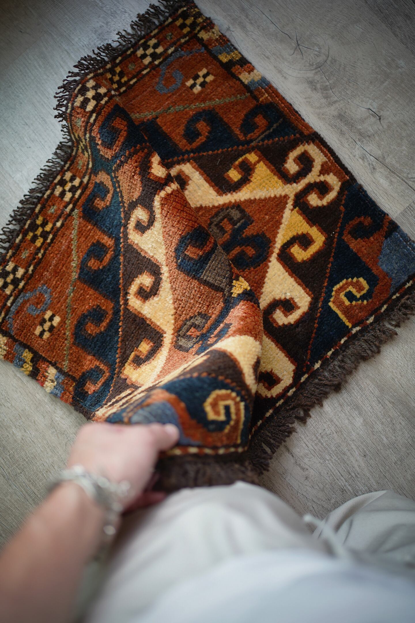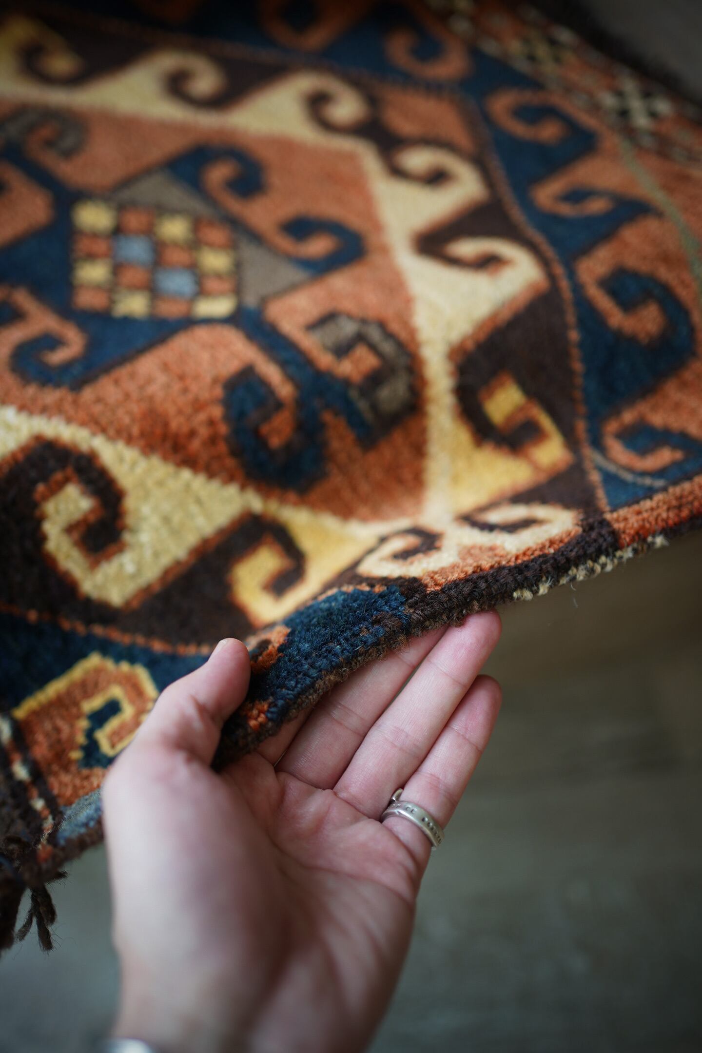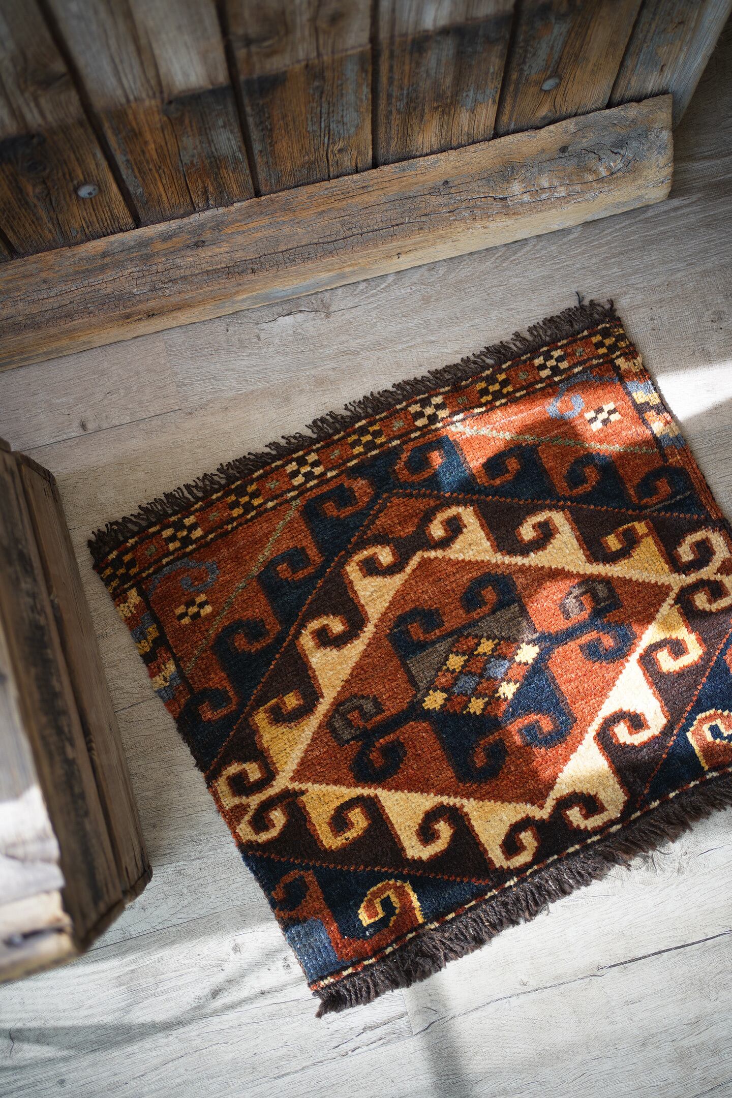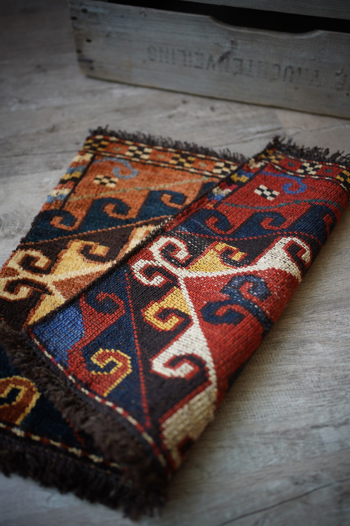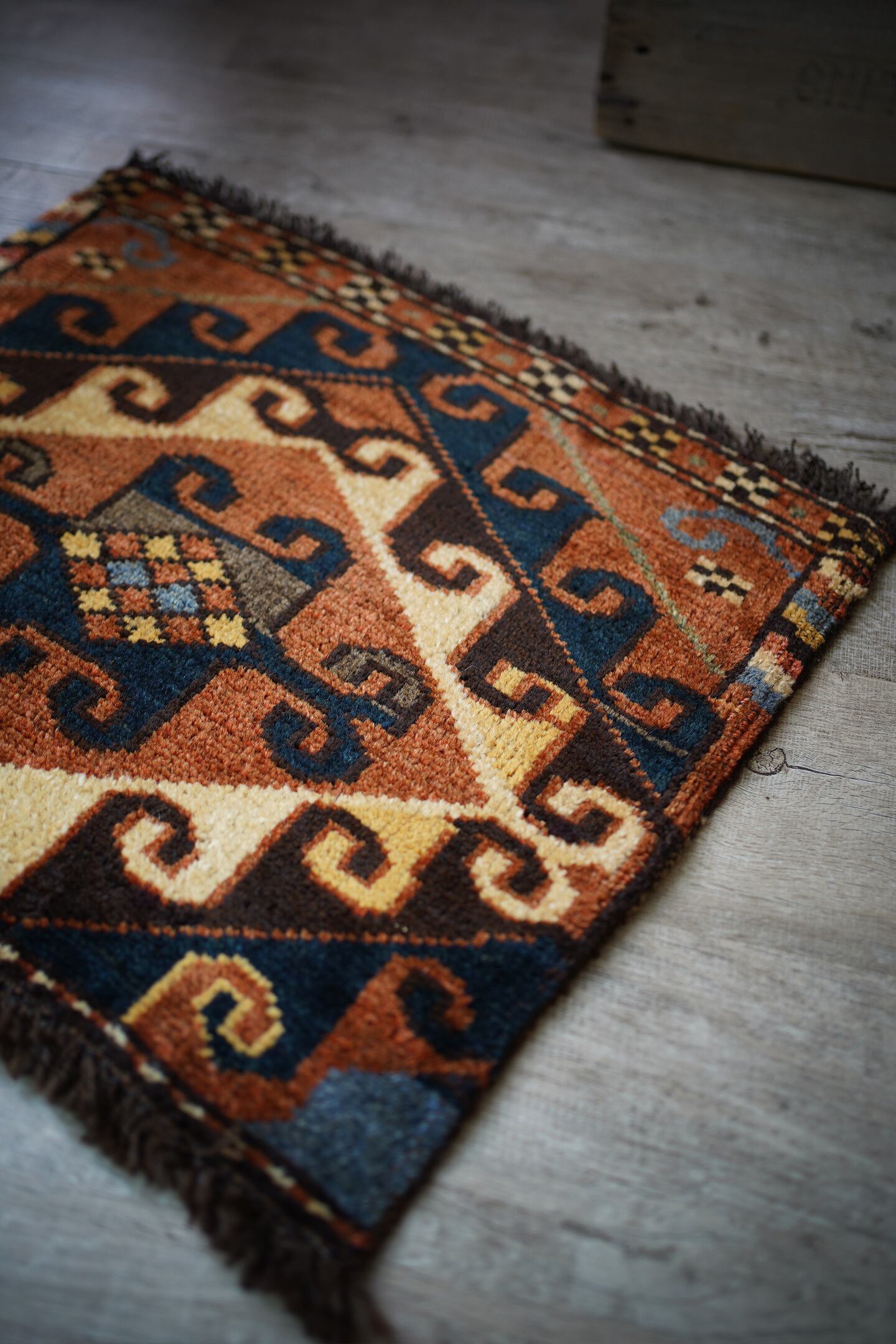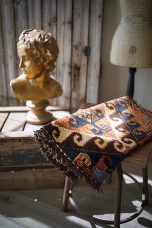 イラン東北部からウズベキスタンにかけて住むウズベク族によって織られたラグです。元々、遊牧民が移動する際に家畜のロバや馬の背中に掛けて移動用の袋として利用していたサドルバッグの表面を切り取って作られたラグとなります。約90年〜100年前のものですが、非常に状態も良いです。波のような模様が特徴的で、とても珍しいデザインをしています。配色はブラウン、焦茶、ベージュ、濃紺、ブルーグレーなど。表面はソフトウールでふわふわと柔らかく、優しい気持ちの良い肌触り。厚みは6mm〜7mm程度です。ダメージや補修跡も見受けられず、状態も大変良好。タペストリーとして壁に飾ったり、お好きなスペースに♫