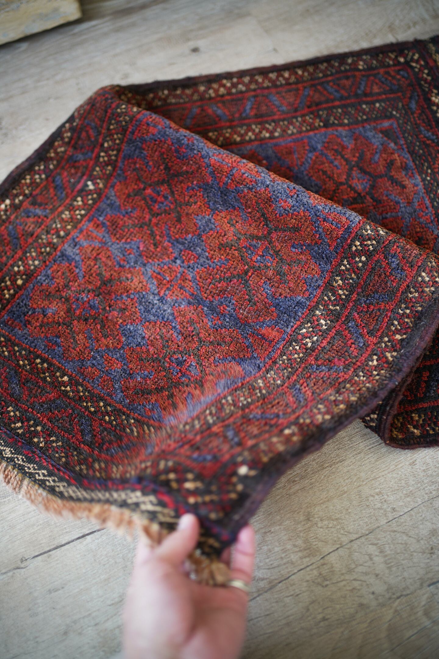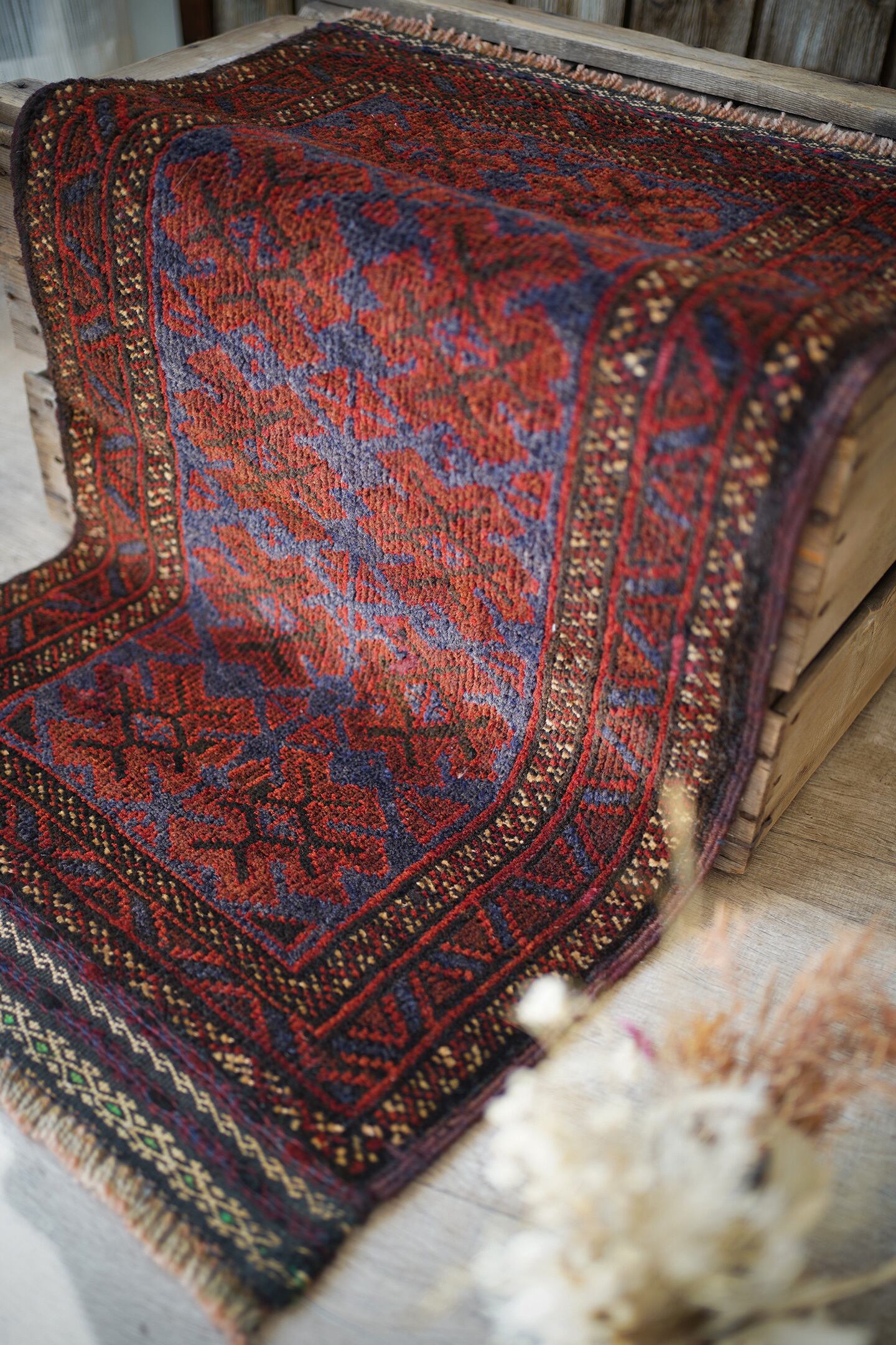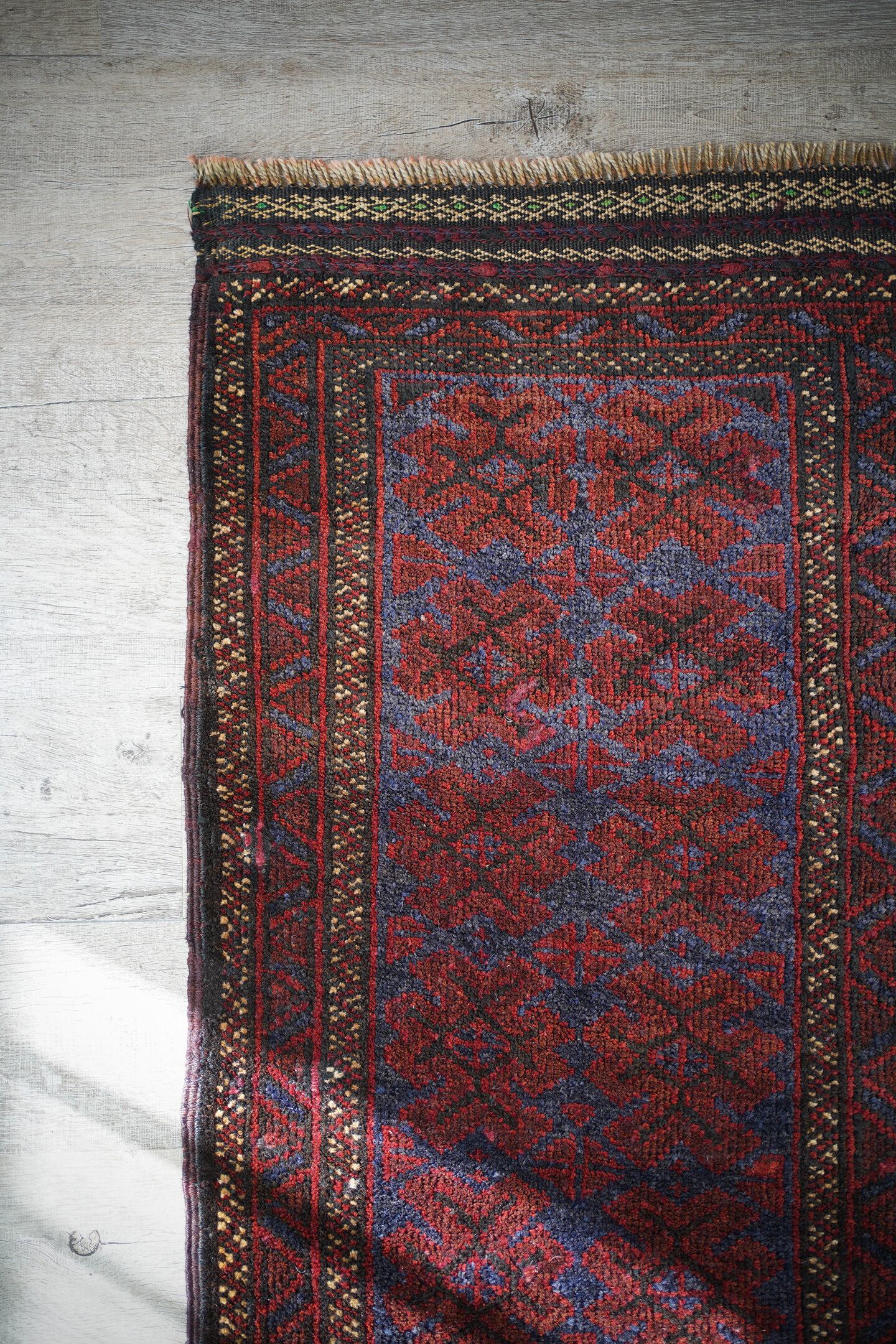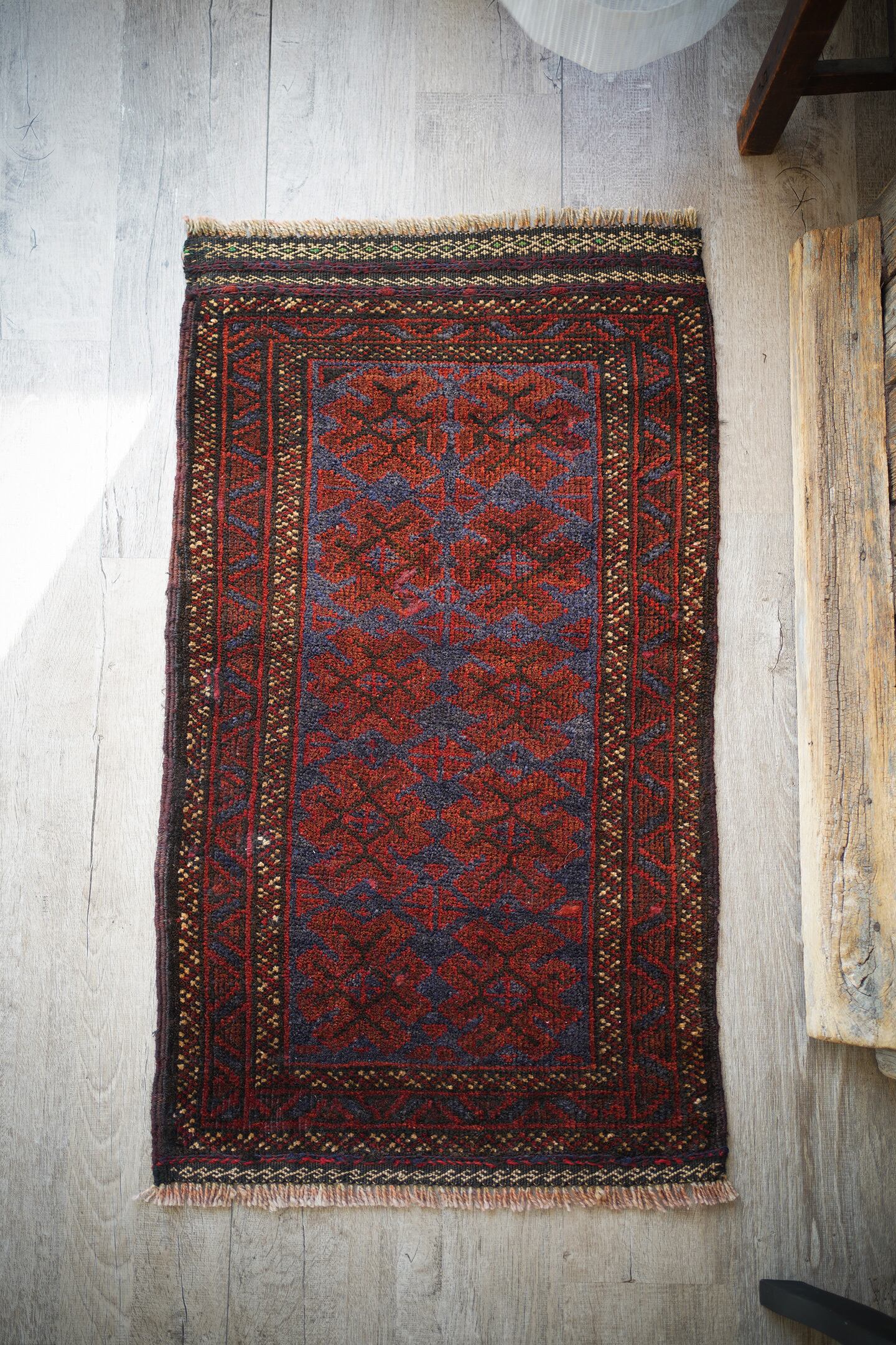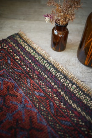 ソフトウールでフワっと柔らかく、気持ちの良い肌触りのアフガニスタン産マルダリラグ。パイル全体に艶が見受けられ、シックかつ上品な雰囲気が素晴らしく、店主イチオシの1枚です。濃紺にダークレッド、ベージュの色構成。フリンジ部分はキリムエンドになっており、片方だけ黄緑が使われているところがポイントです。表面の厚みは5mm〜6mmほど。ダメージや修理された跡などなく状態も良好です。チェスト前や小さめの棚の下などに良さそうです♫