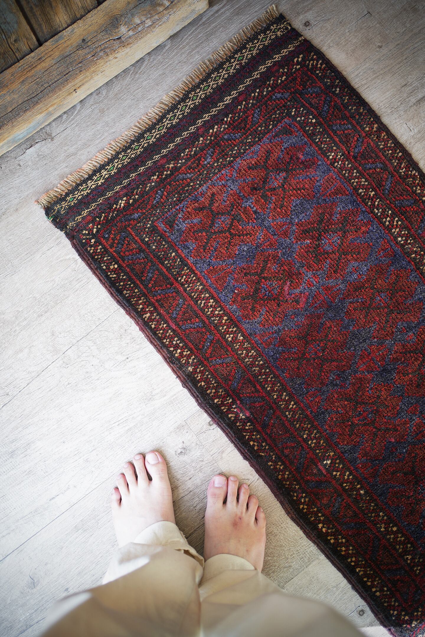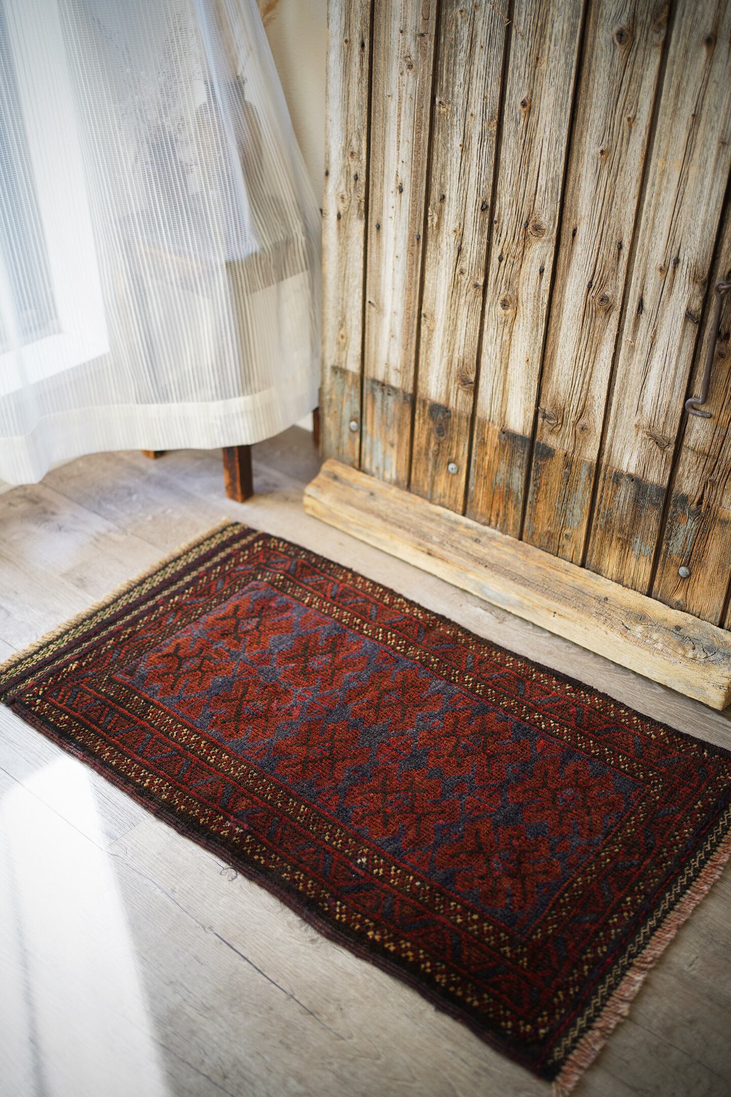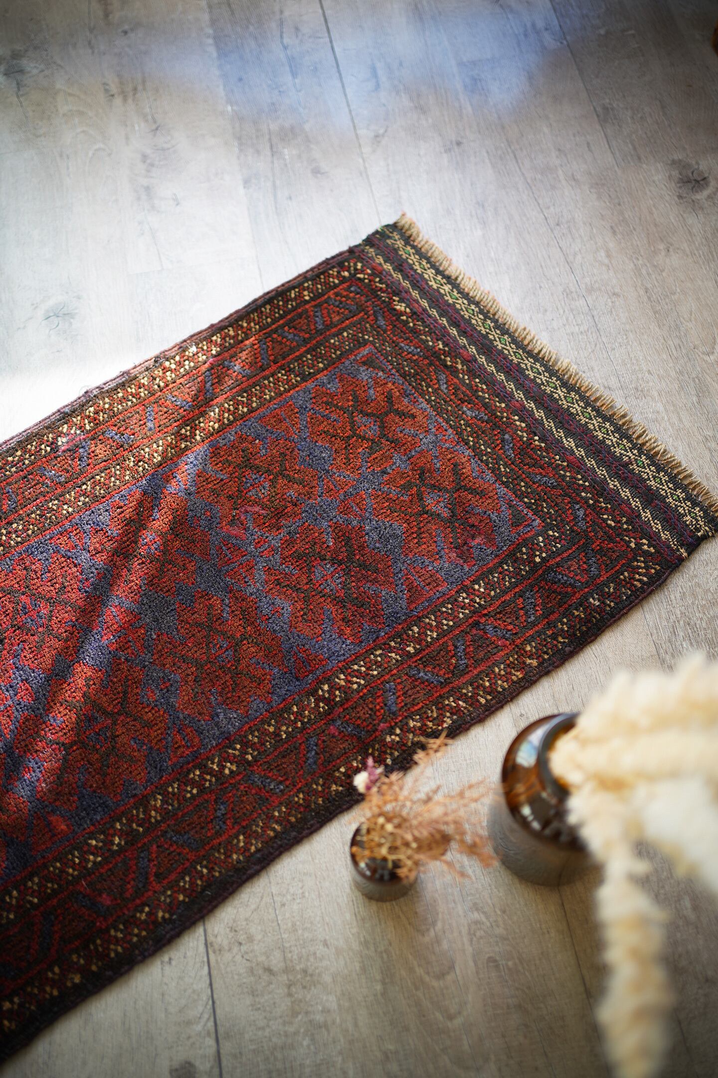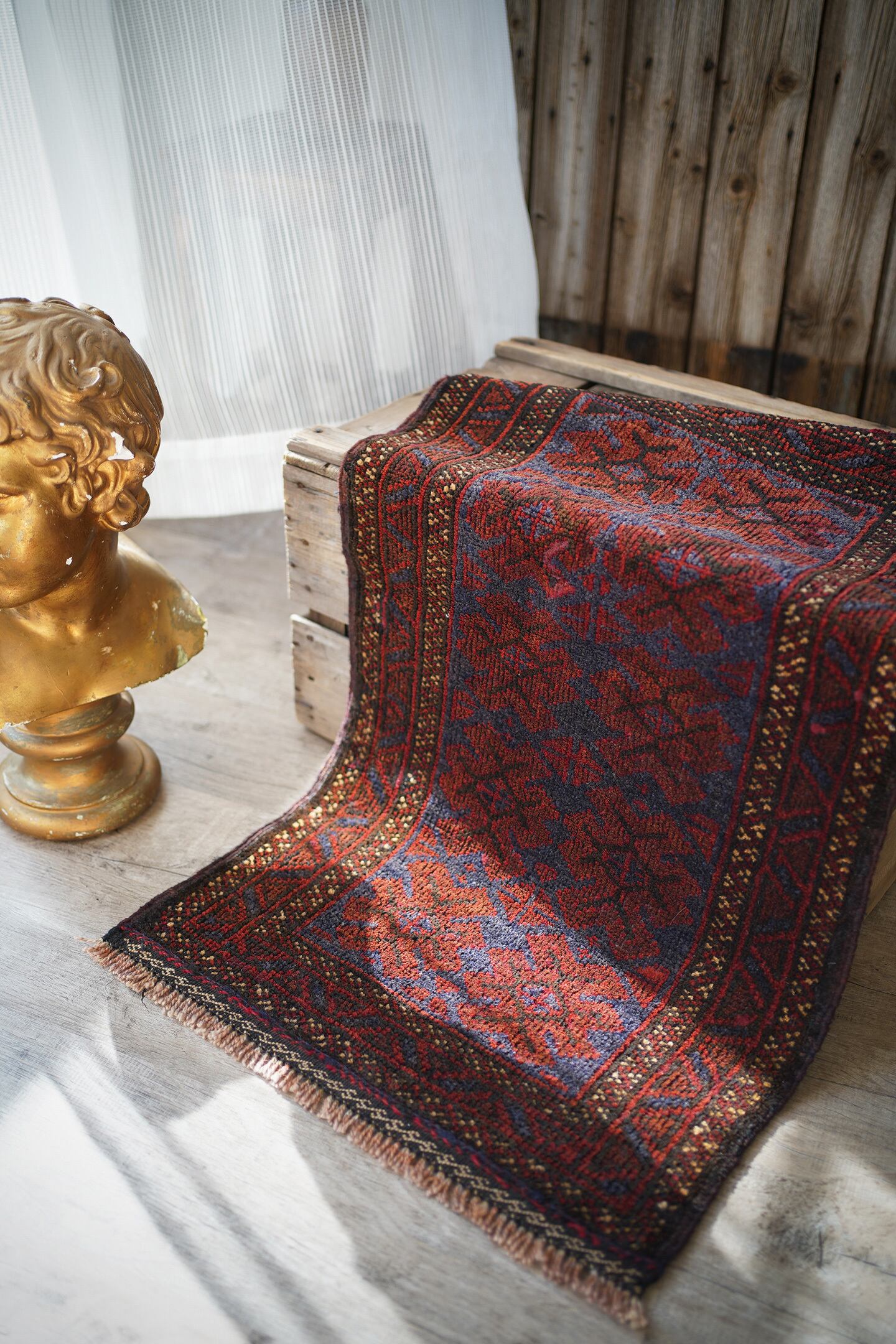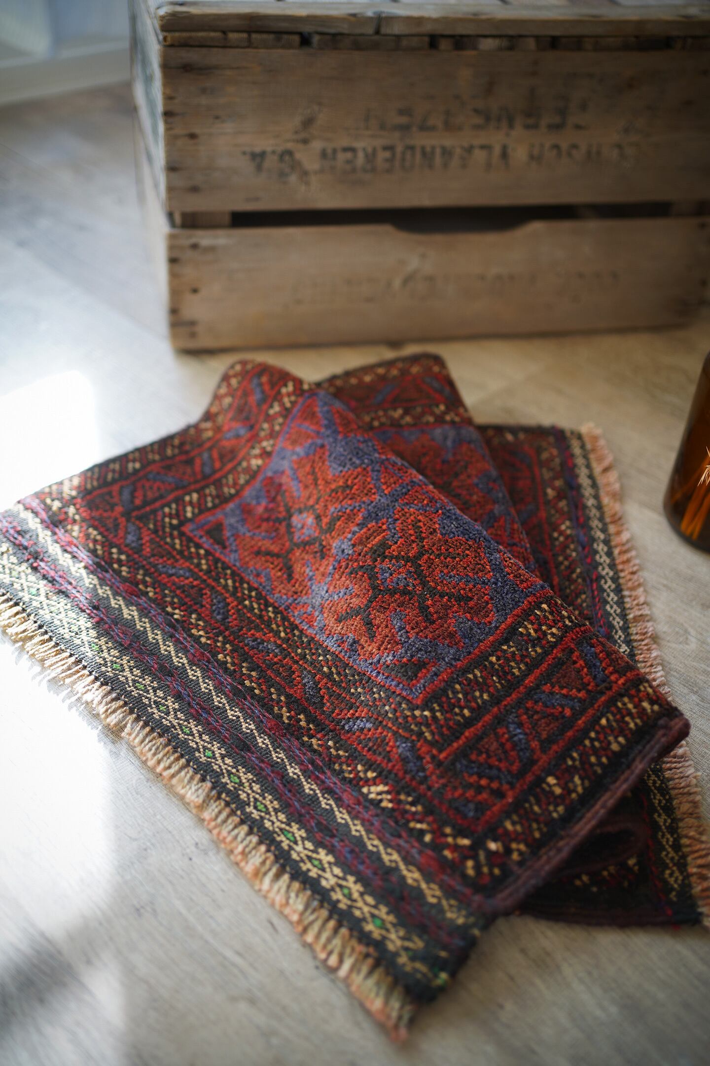 ソフトウールでフワっと柔らかく、気持ちの良い肌触りのアフガニスタン産マルダリラグ。パイル全体に艶が見受けられ、シックかつ上品な雰囲気が素晴らしく、店主イチオシの1枚です。濃紺にダークレッド、ベージュの色構成。フリンジ部分はキリムエンドになっており、片方だけ黄緑が使われているところがポイントです。表面の厚みは5mm〜6mmほど。ダメージや修理された跡などなく状態も良好です。チェスト前や小さめの棚の下などに良さそうです♫