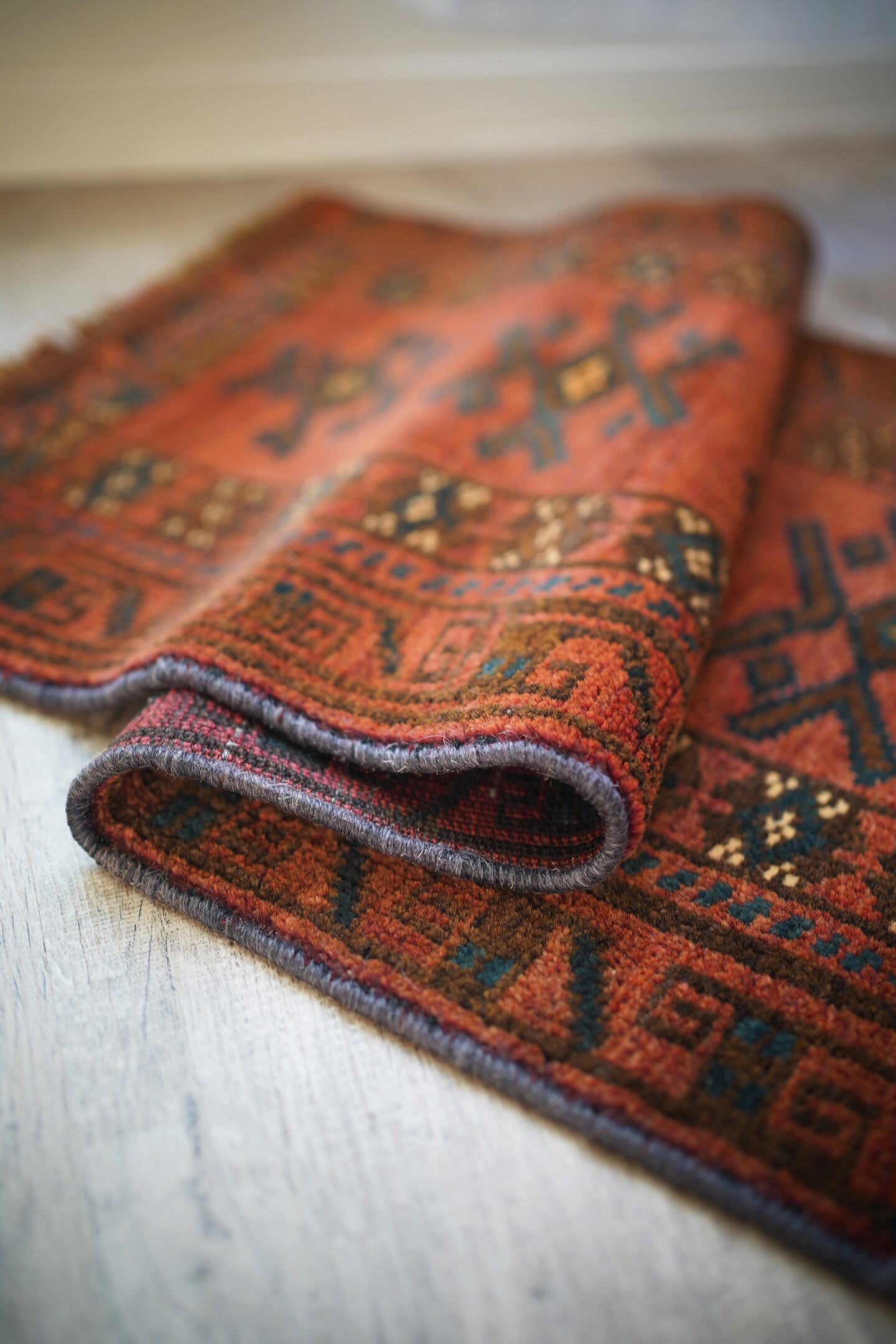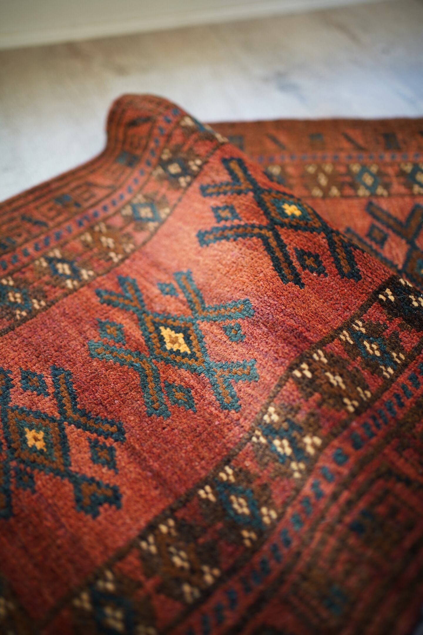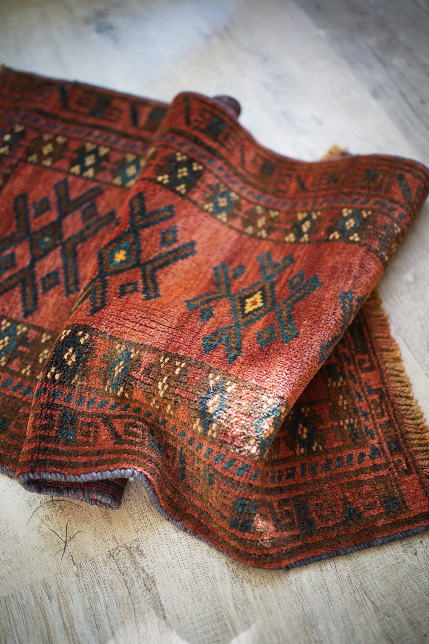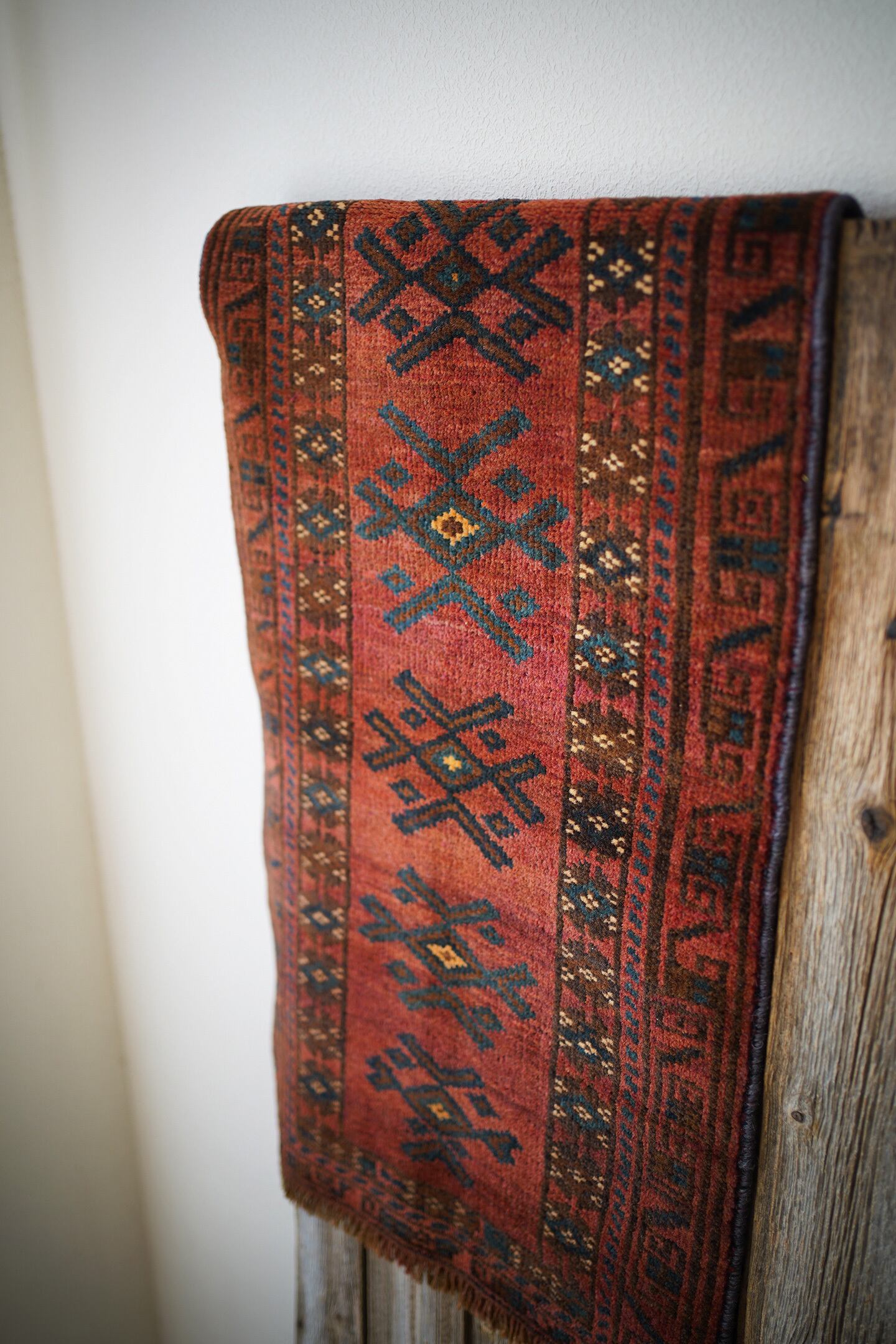 おおよそ50年前に織られたアフガニスタン産マルダリラグ。落ち着いた赤をメインカラーに焦茶、ベージュのカラーリング。アクセントに使われている暗いエメラルドグリーンがとても素敵で店主の好きなポイントです。艶のあるパイルで、表面はふわサラッと滑らかで気持ちの良い肌触り。6mm〜7mm程度の厚みです。状態はダメージと補修跡もなく、大変良好です。チェスト前や小さめの棚の下などにオススメです。