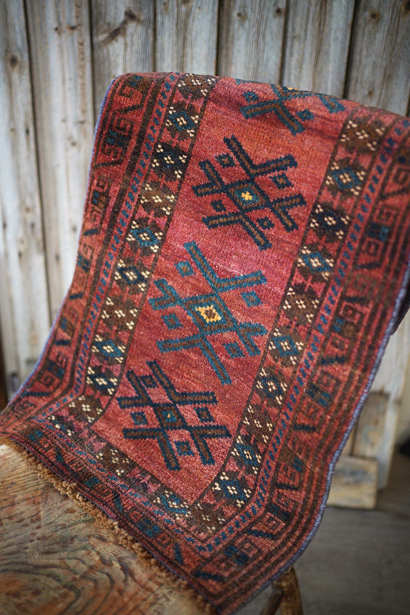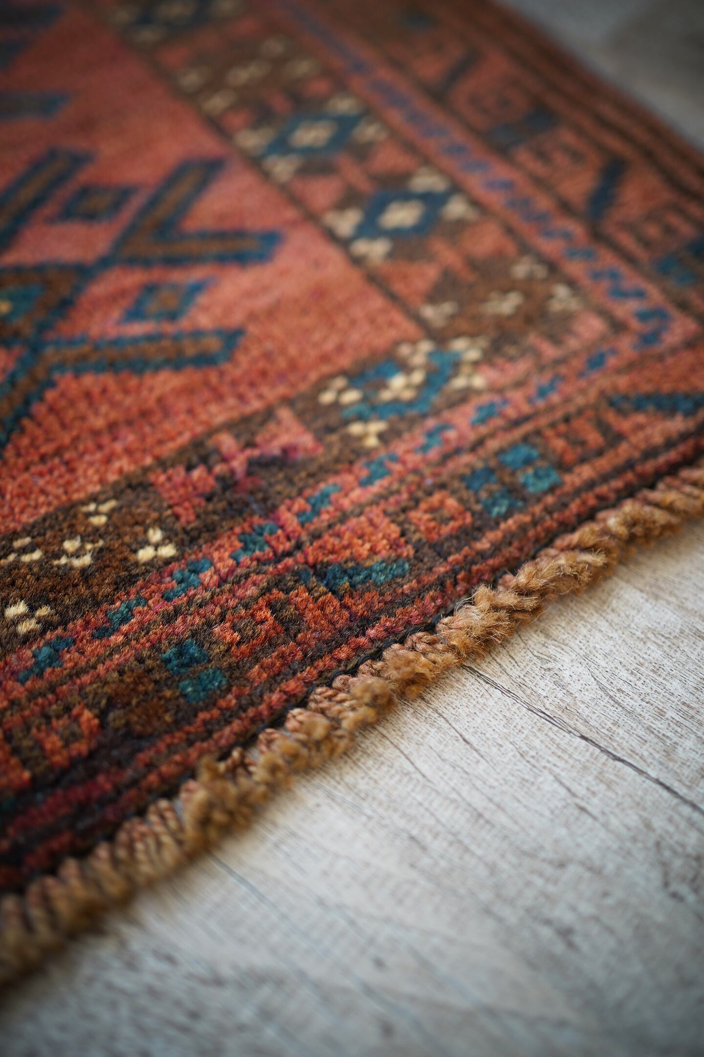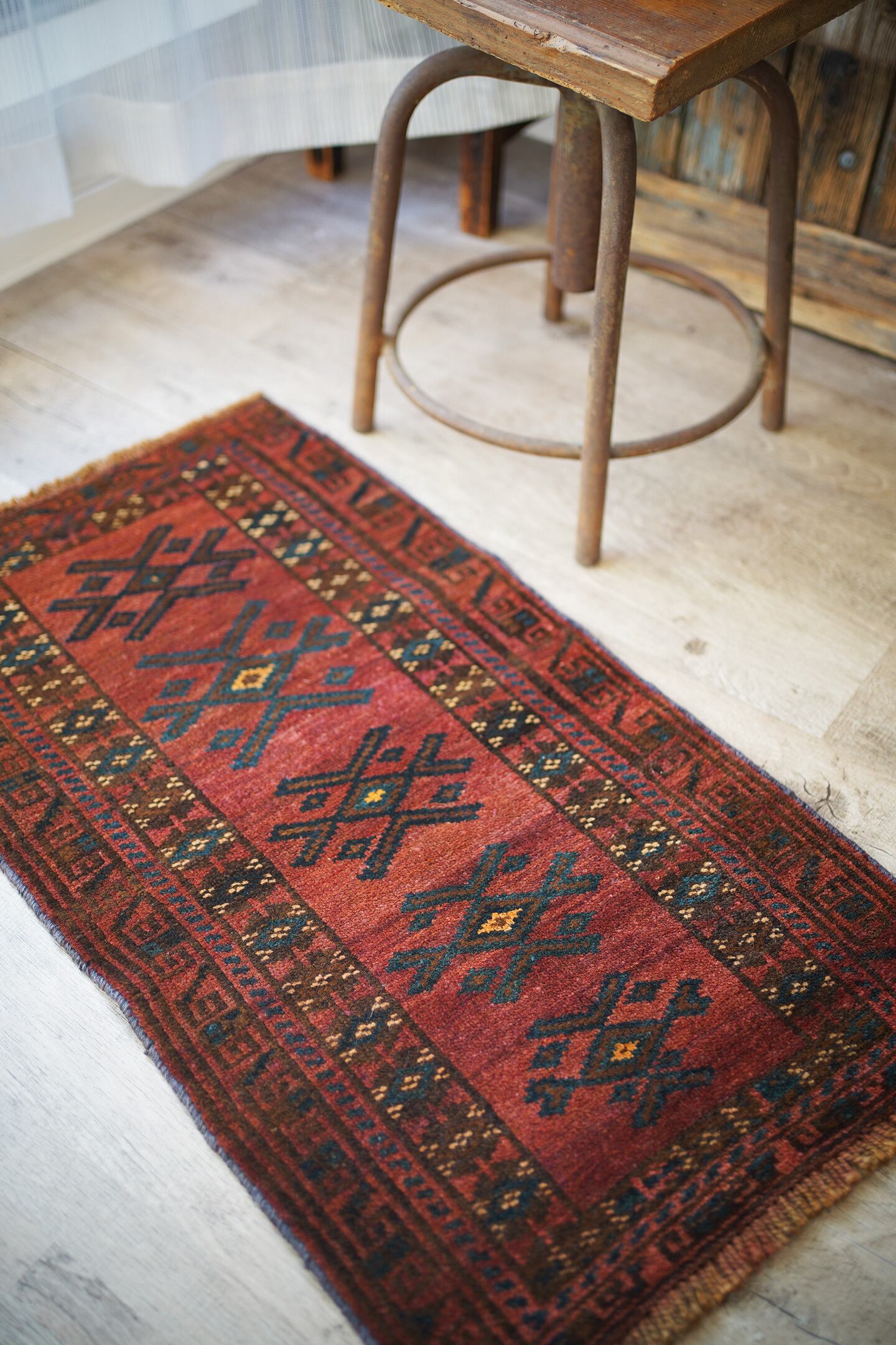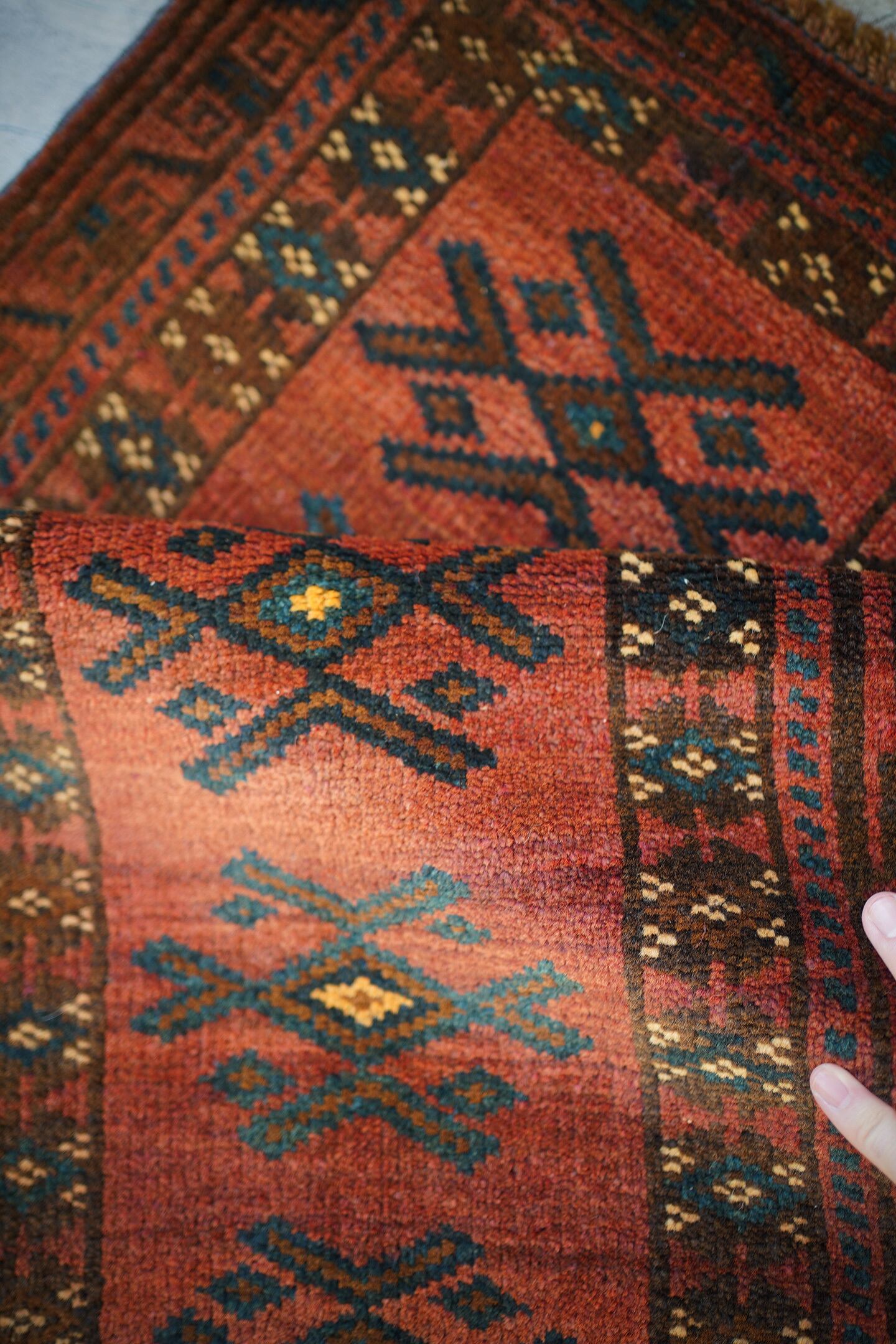 おおよそ50年前に織られたアフガニスタン産マルダリラグ。落ち着いた赤をメインカラーに焦茶、ベージュのカラーリング。アクセントに使われている暗いエメラルドグリーンがとても素敵で店主の好きなポイントです。艶のあるパイルで、表面はふわサラッと滑らかで気持ちの良い肌触り。6mm〜7mm程度の厚みです。状態はダメージと補修跡もなく、大変良好です。チェスト前や小さめの棚の下などにオススメです。