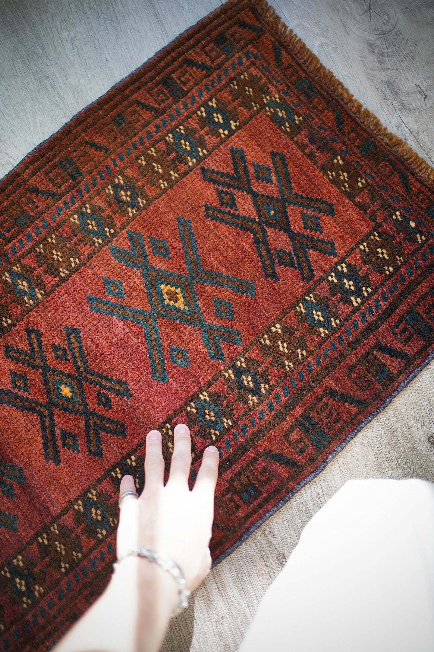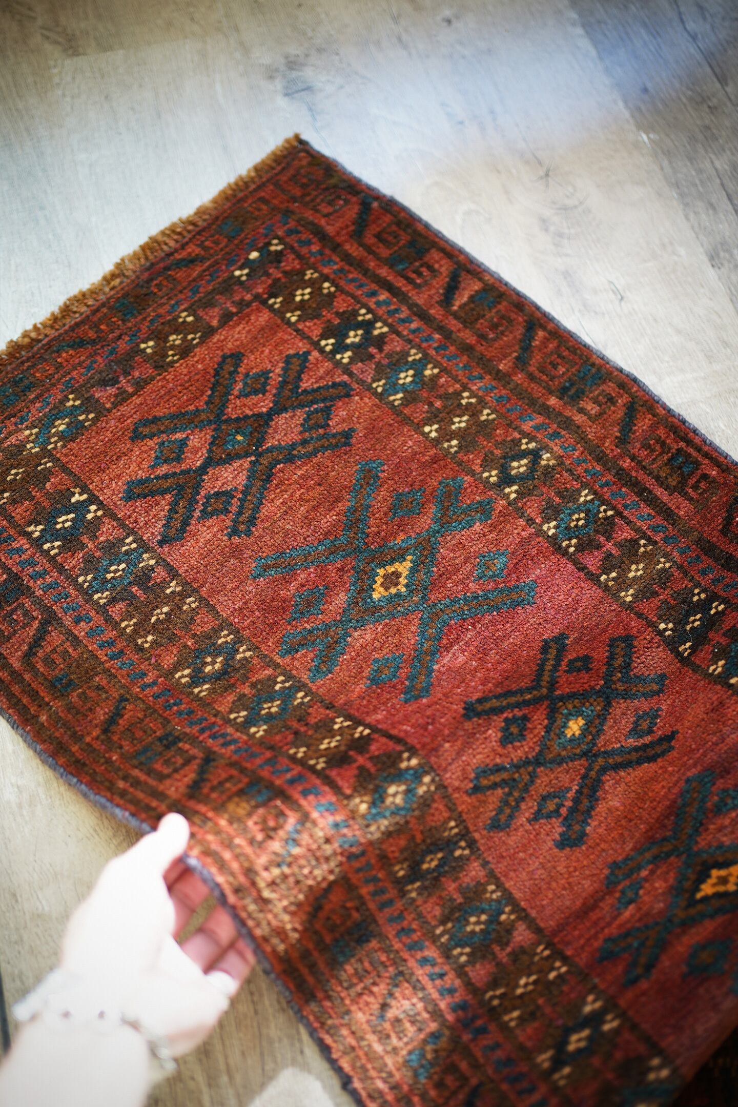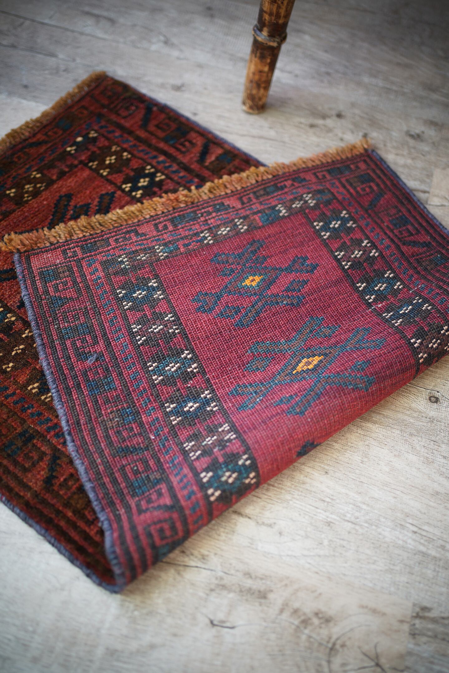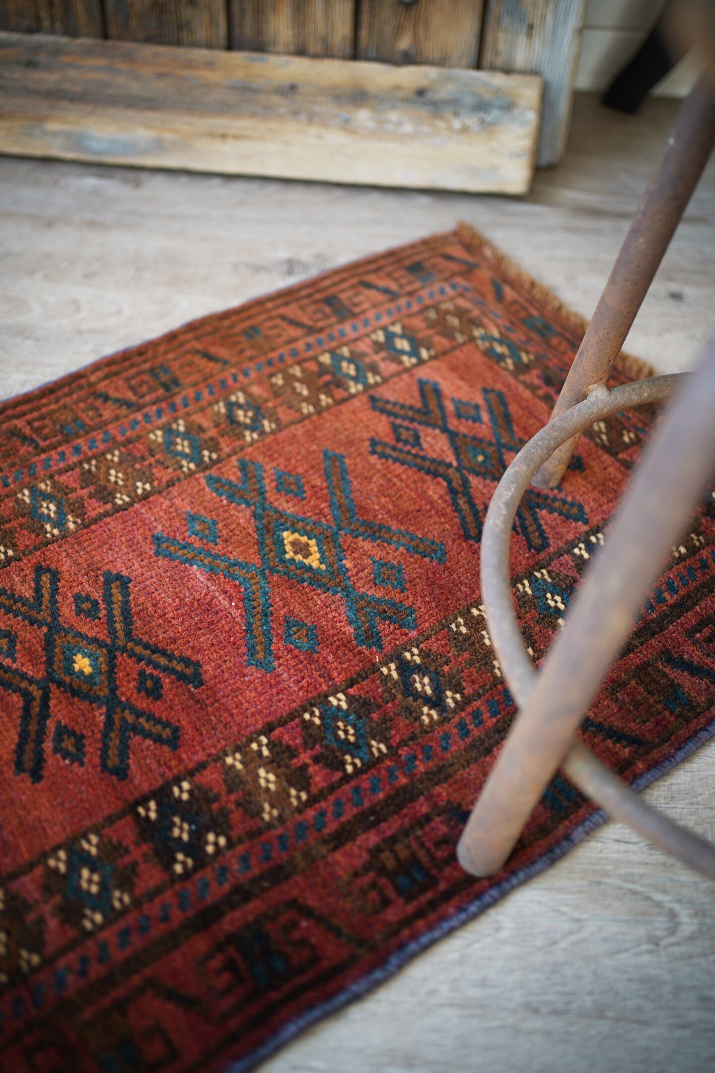おおよそ50年前に織られたアフガニスタン産マルダリラグ。落ち着いた赤をメインカラーに焦茶、ベージュのカラーリング。アクセントに使われている暗いエメラルドグリーンがとても素敵で店主の好きなポイントです。艶のあるパイルで、表面はふわサラッと滑らかで気持ちの良い肌触り。6mm〜7mm程度の厚みです。状態はダメージと補修跡もなく、大変良好です。チェスト前や小さめの棚の下などにオススメです。