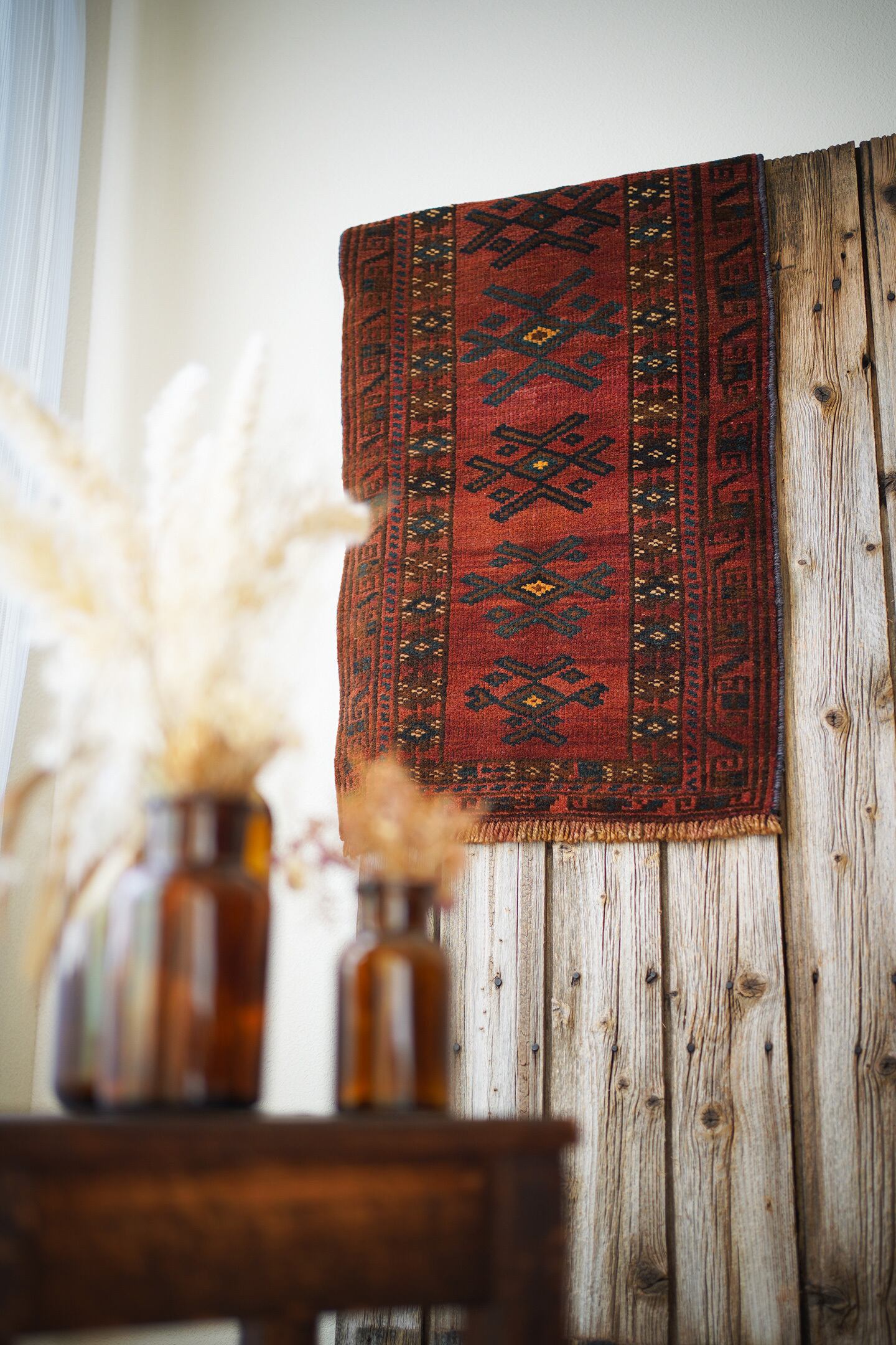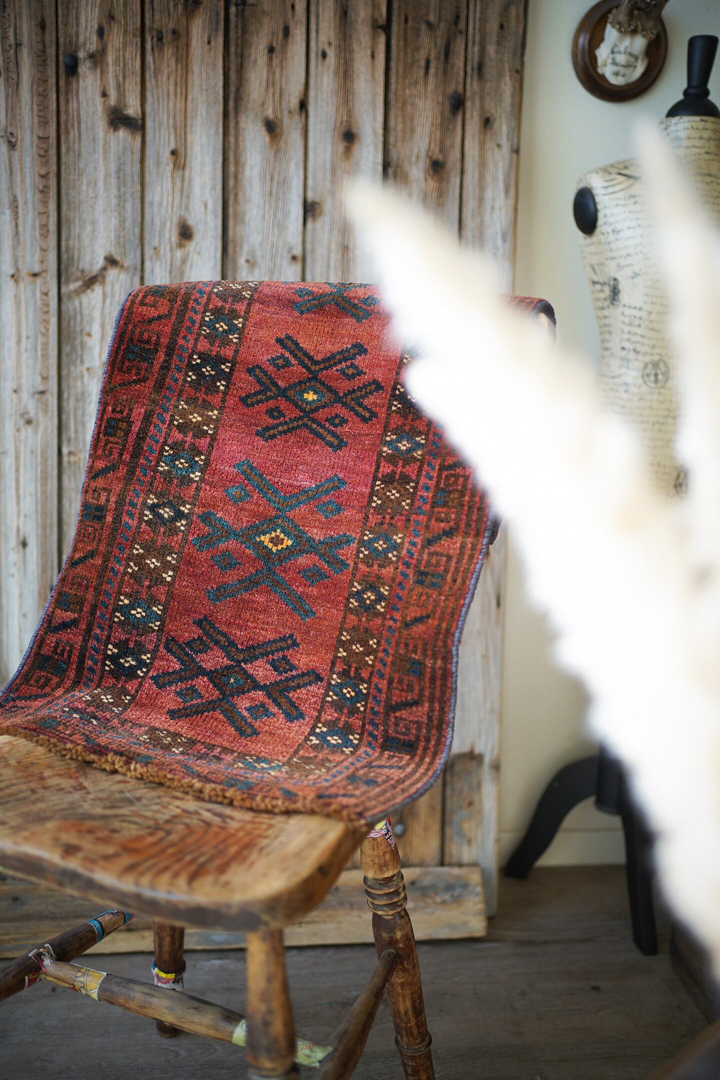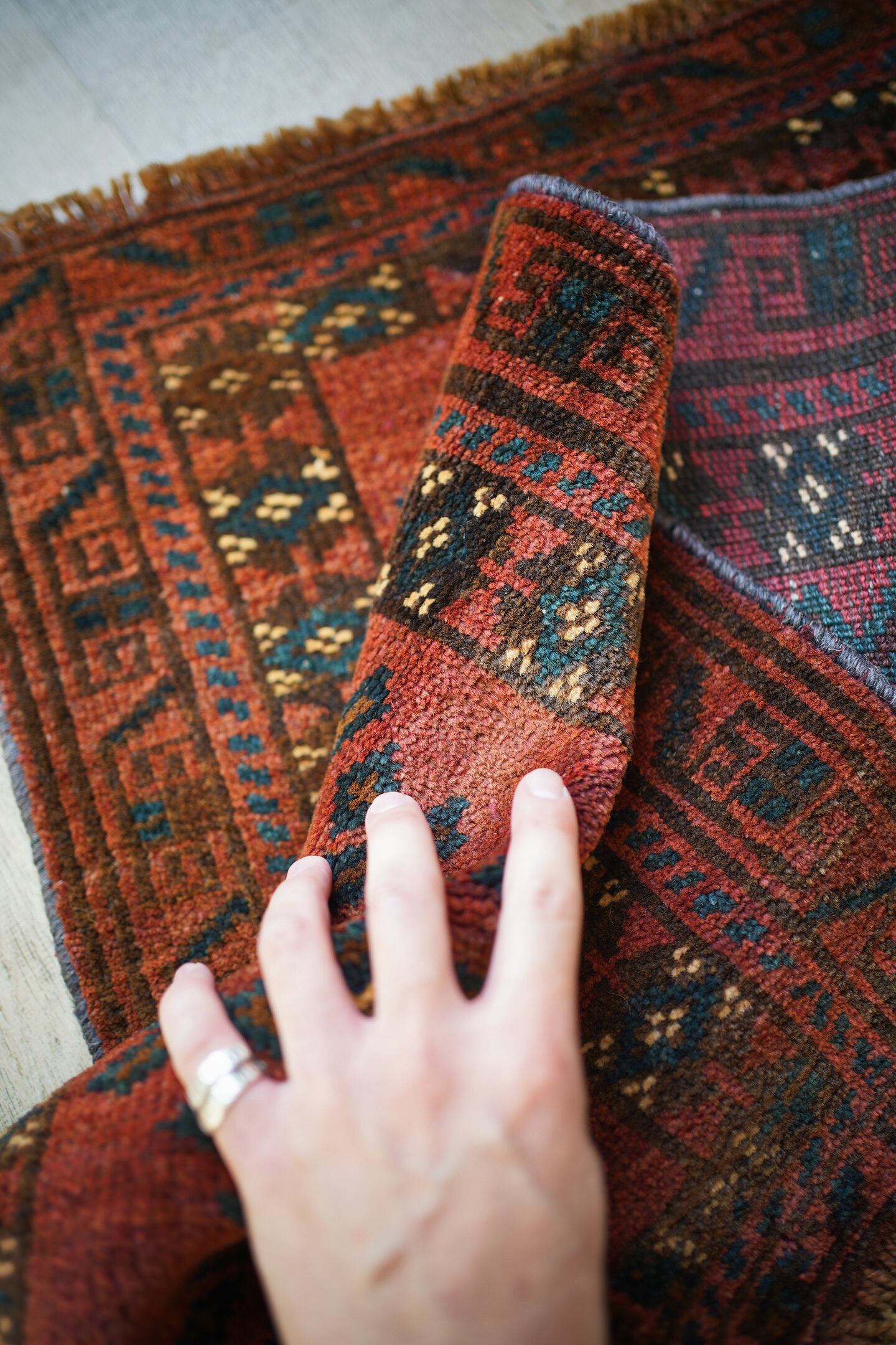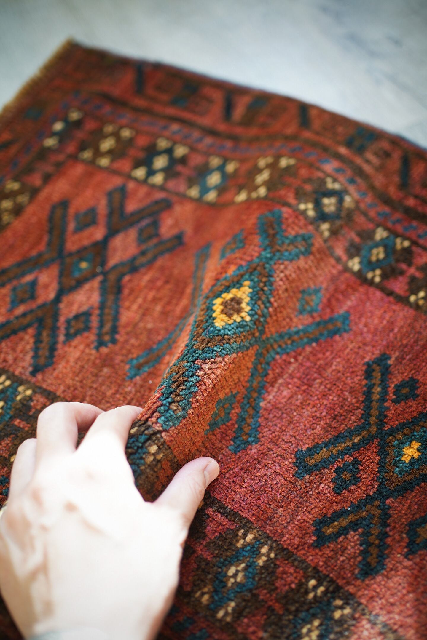 おおよそ50年前に織られたアフガニスタン産マルダリラグ。落ち着いた赤をメインカラーに焦茶、ベージュのカラーリング。アクセントに使われている暗いエメラルドグリーンがとても素敵で店主の好きなポイントです。艶のあるパイルで、表面はふわサラッと滑らかで気持ちの良い肌触り。6mm〜7mm程度の厚みです。状態はダメージと補修跡もなく、大変良好です。チェスト前や小さめの棚の下などにオススメです。