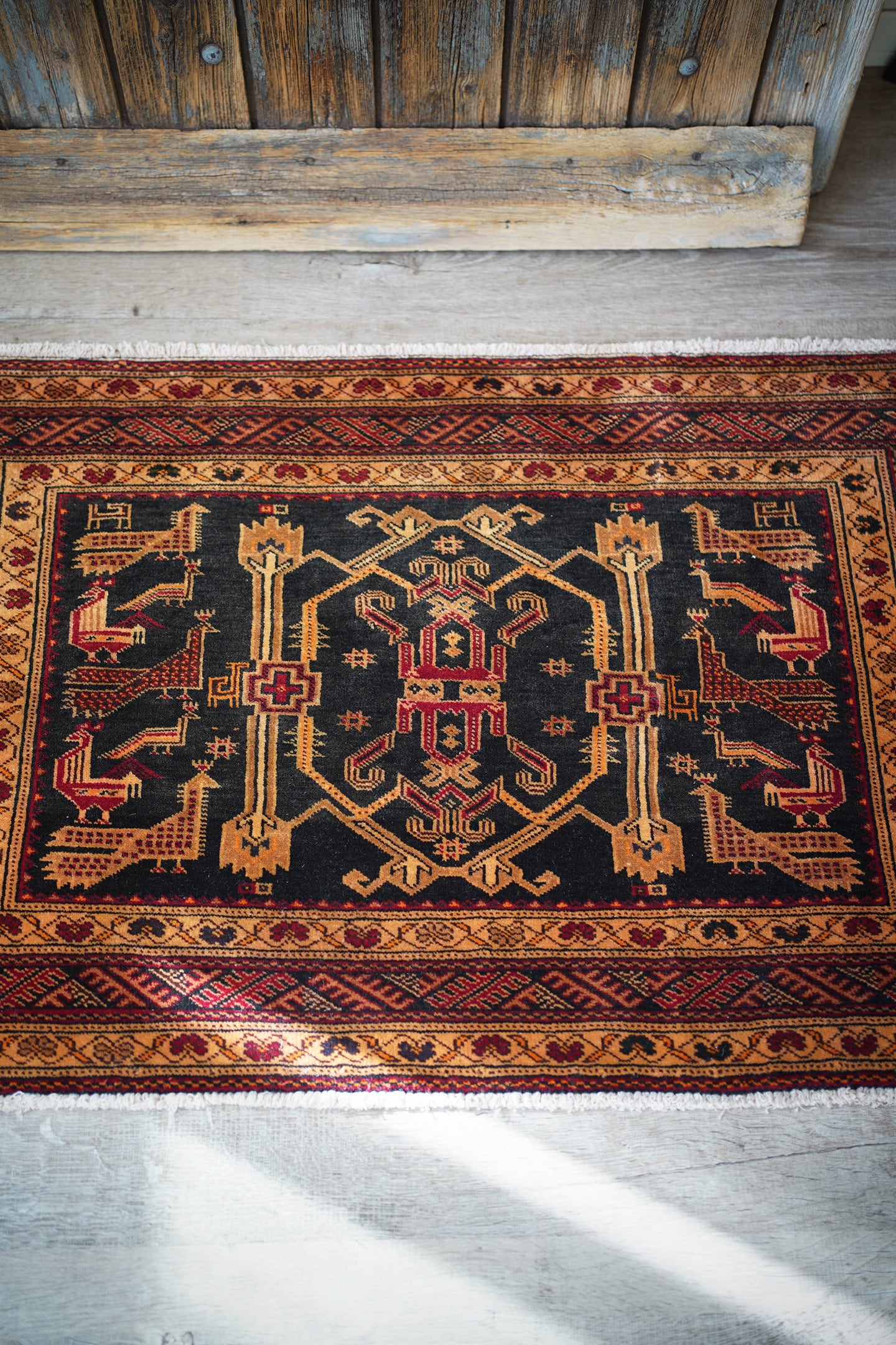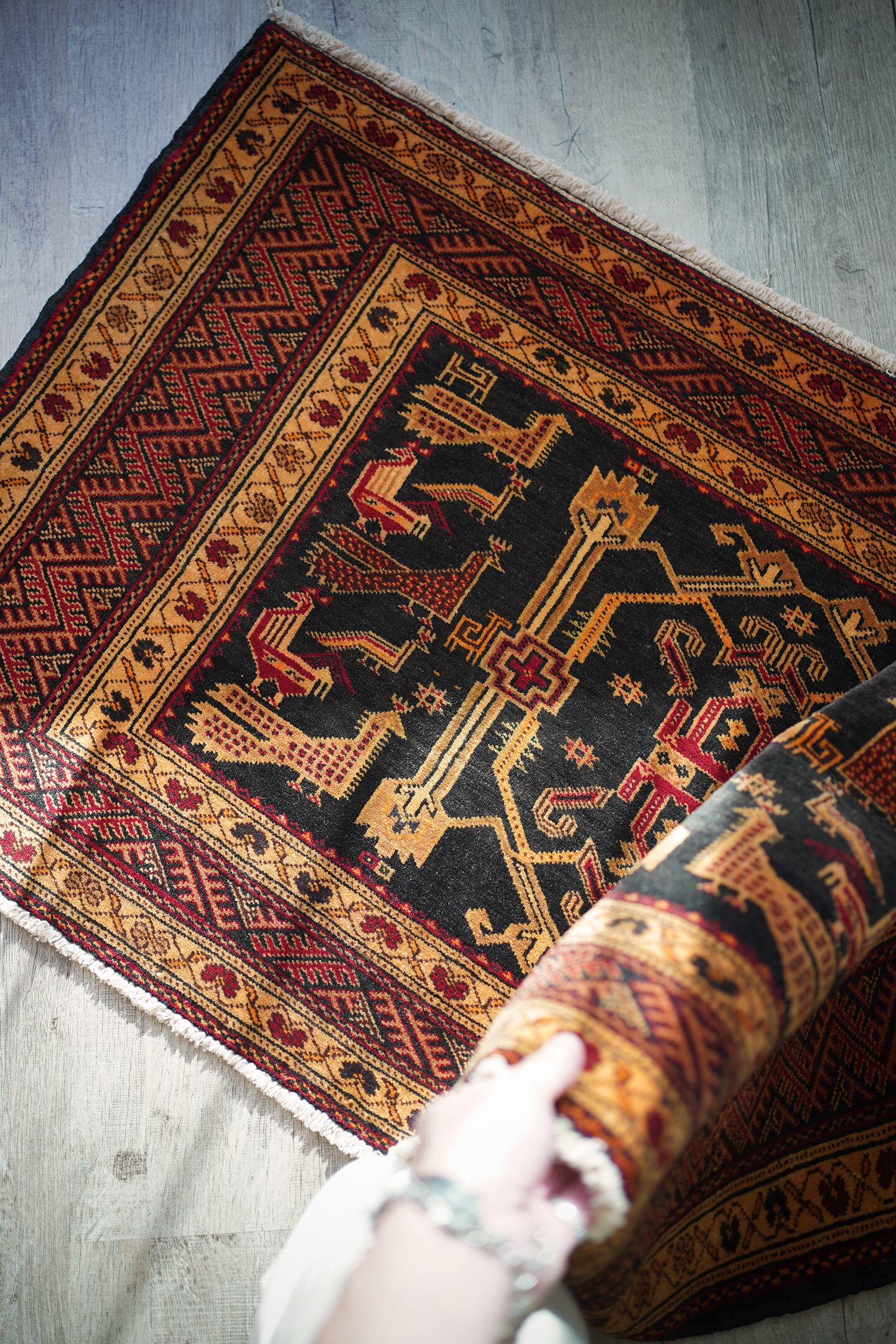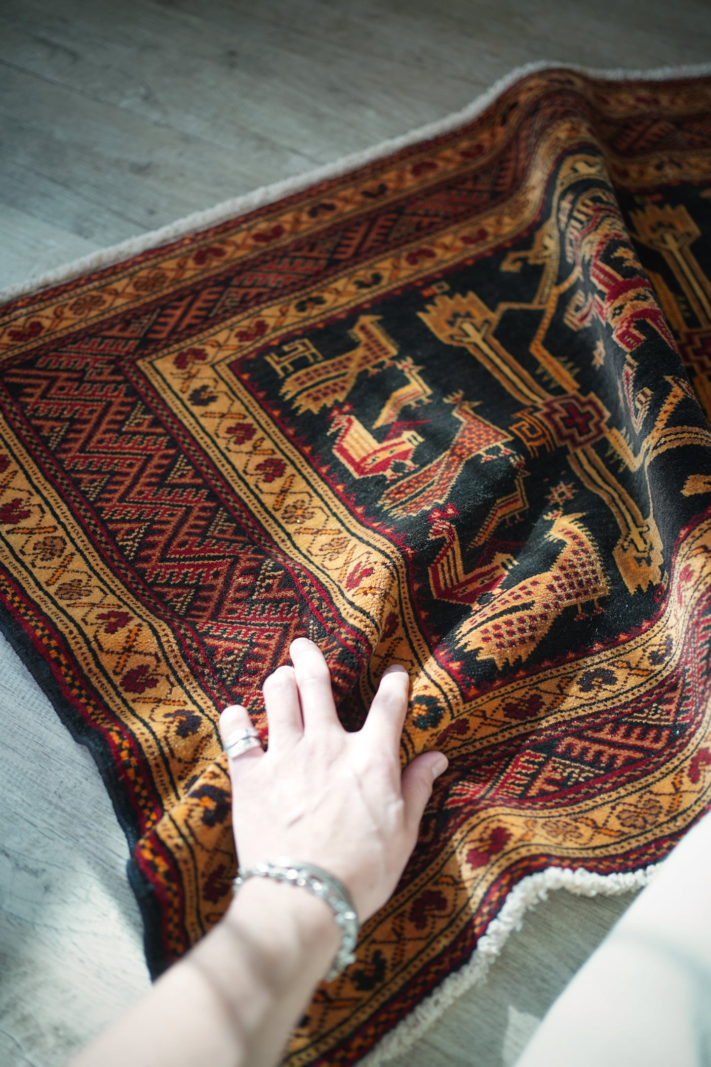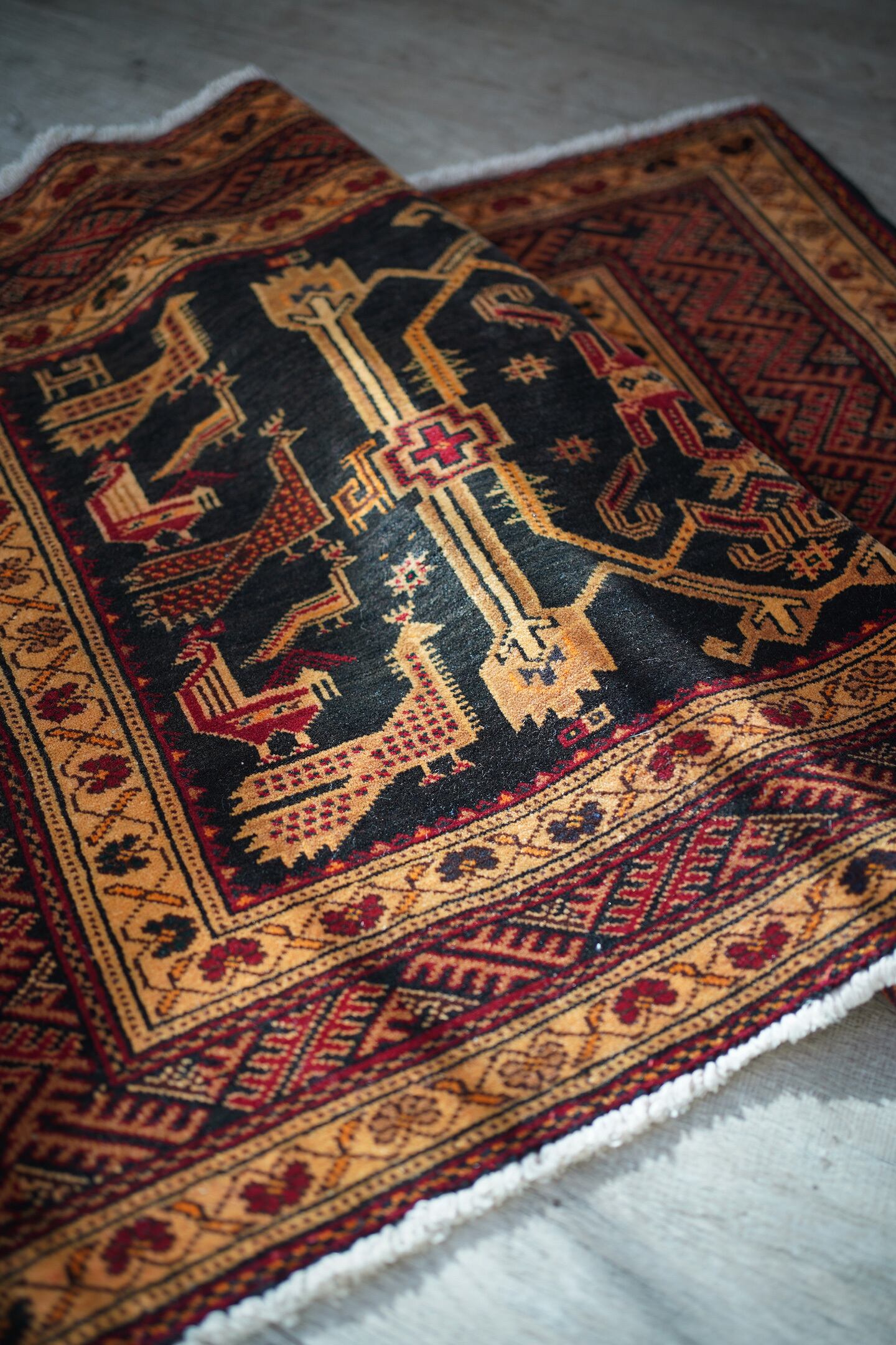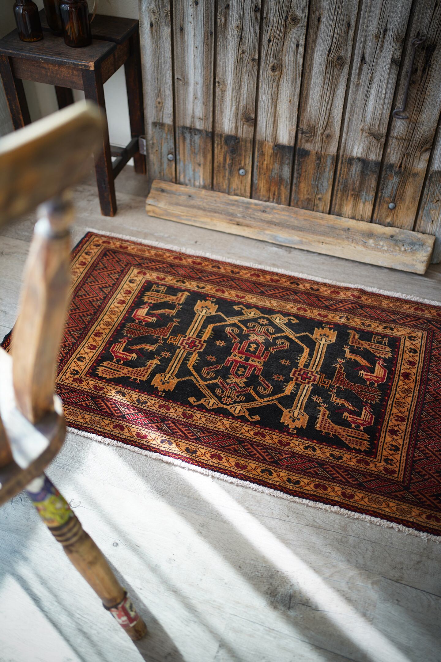 約40年前にバルーチ族によって織られたヴィンテージのラグです。様々な可愛い鳥たちが織り込まれた孔雀モチーフのデザインに一目惚れしました。このサイズ感ではあまり見かけないタイプの珍しいデザインかと思います。全体的な配色はブラック、ダークレッド、ブラウン、薄いオレンジなどが使われています。パイルは目の詰まった質感で、毛並みの長さの統一感含めてとても上質感があります。表面はソフトウールで、さらモチっとした気持ちの良い肌触り。厚みは6mmほど。状態も非常に良くパーフェクト。タペストリーとしては大きめですが壁にかけて飾っても大変カッコ良いと思います。店主イチオシの一枚。