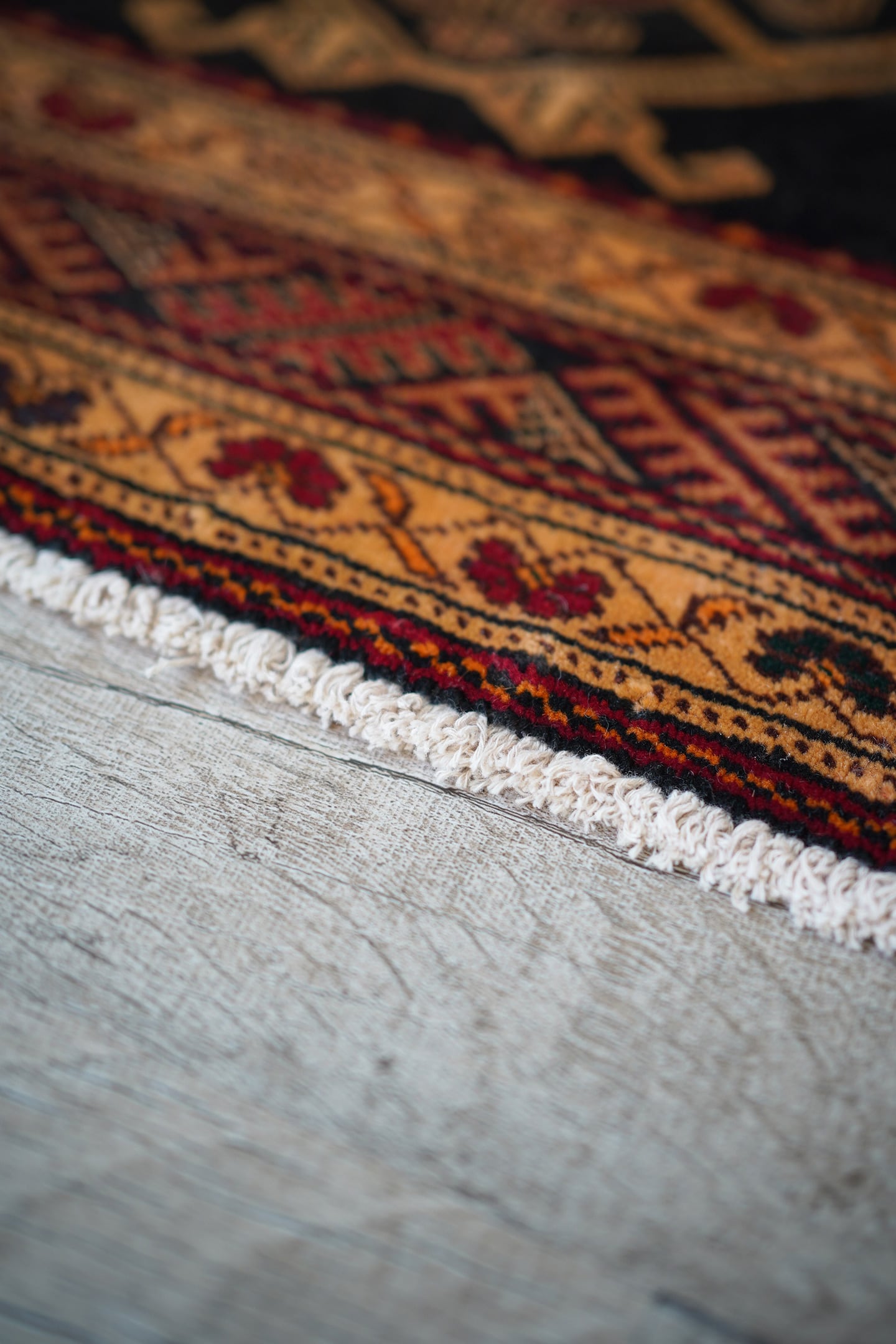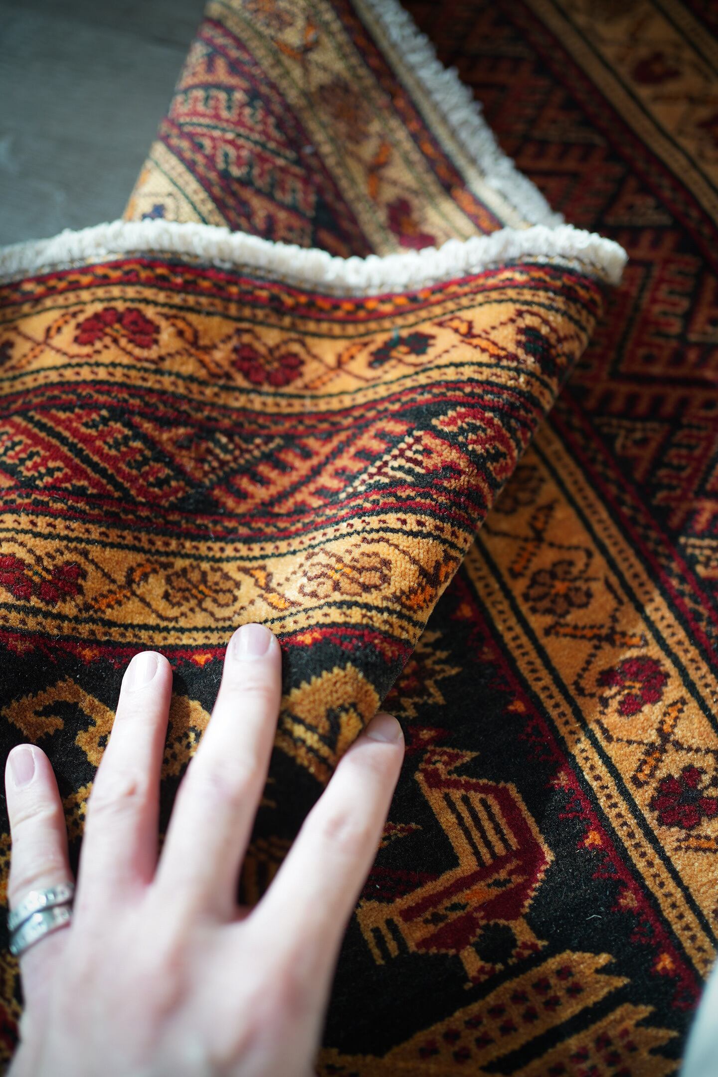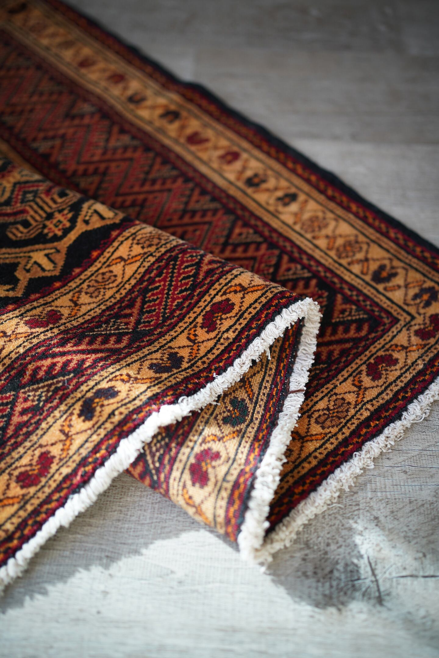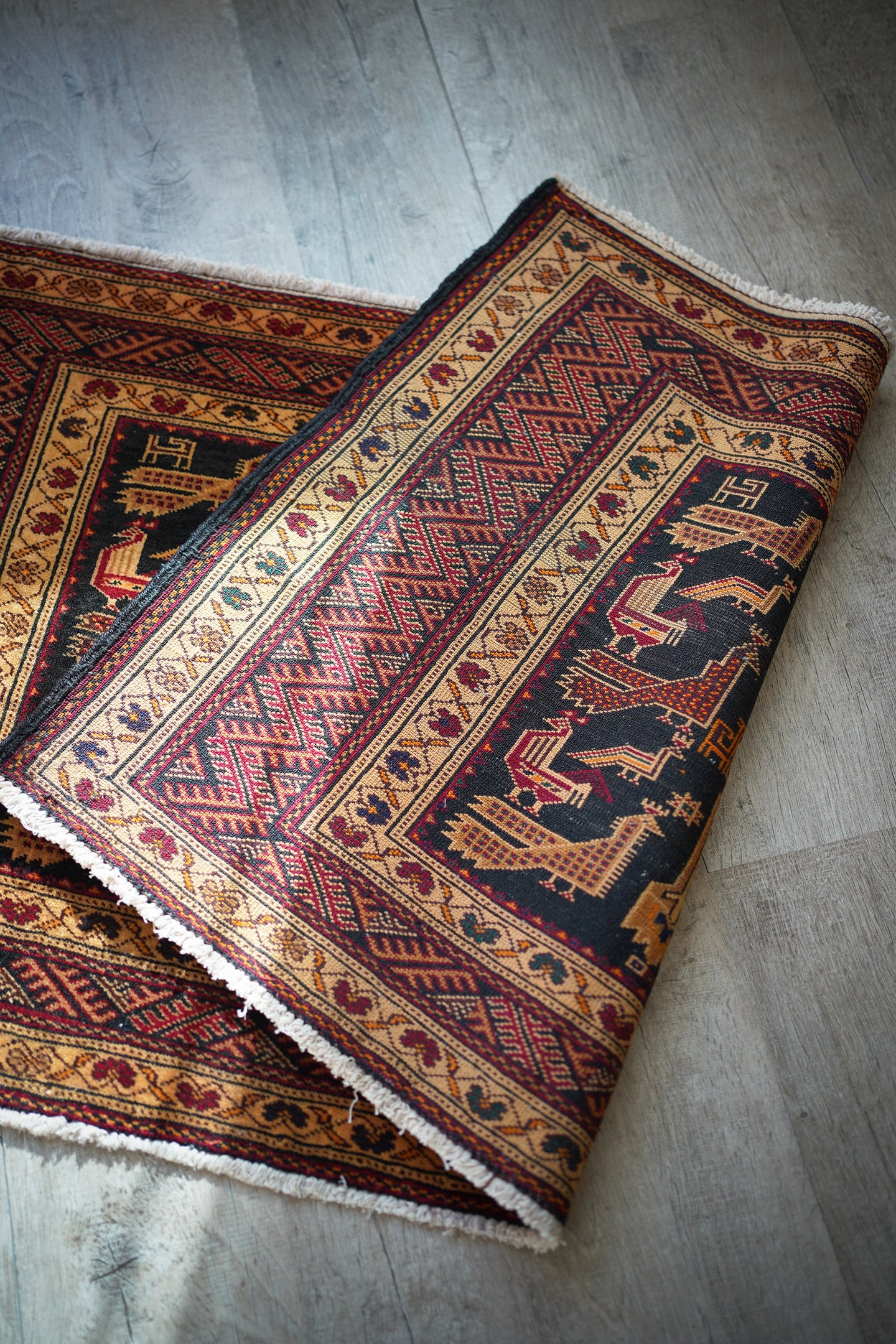 約40年前にバルーチ族によって織られたヴィンテージのラグです。様々な可愛い鳥たちが織り込まれた孔雀モチーフのデザインに一目惚れしました。このサイズ感ではあまり見かけないタイプの珍しいデザインかと思います。全体的な配色はブラック、ダークレッド、ブラウン、薄いオレンジなどが使われています。パイルは目の詰まった質感で、毛並みの長さの統一感含めてとても上質感があります。表面はソフトウールで、さらモチっとした気持ちの良い肌触り。厚みは6mmほど。状態も非常に良くパーフェクト。タペストリーとしては大きめですが壁にかけて飾っても大変カッコ良いと思います。店主イチオシの一枚。