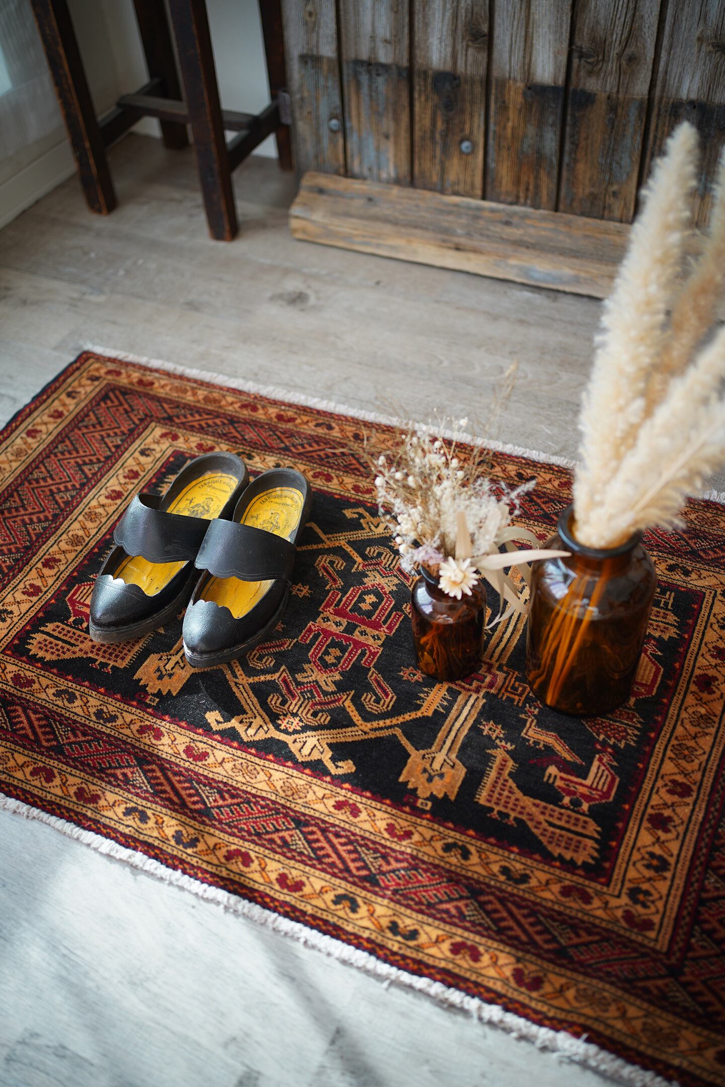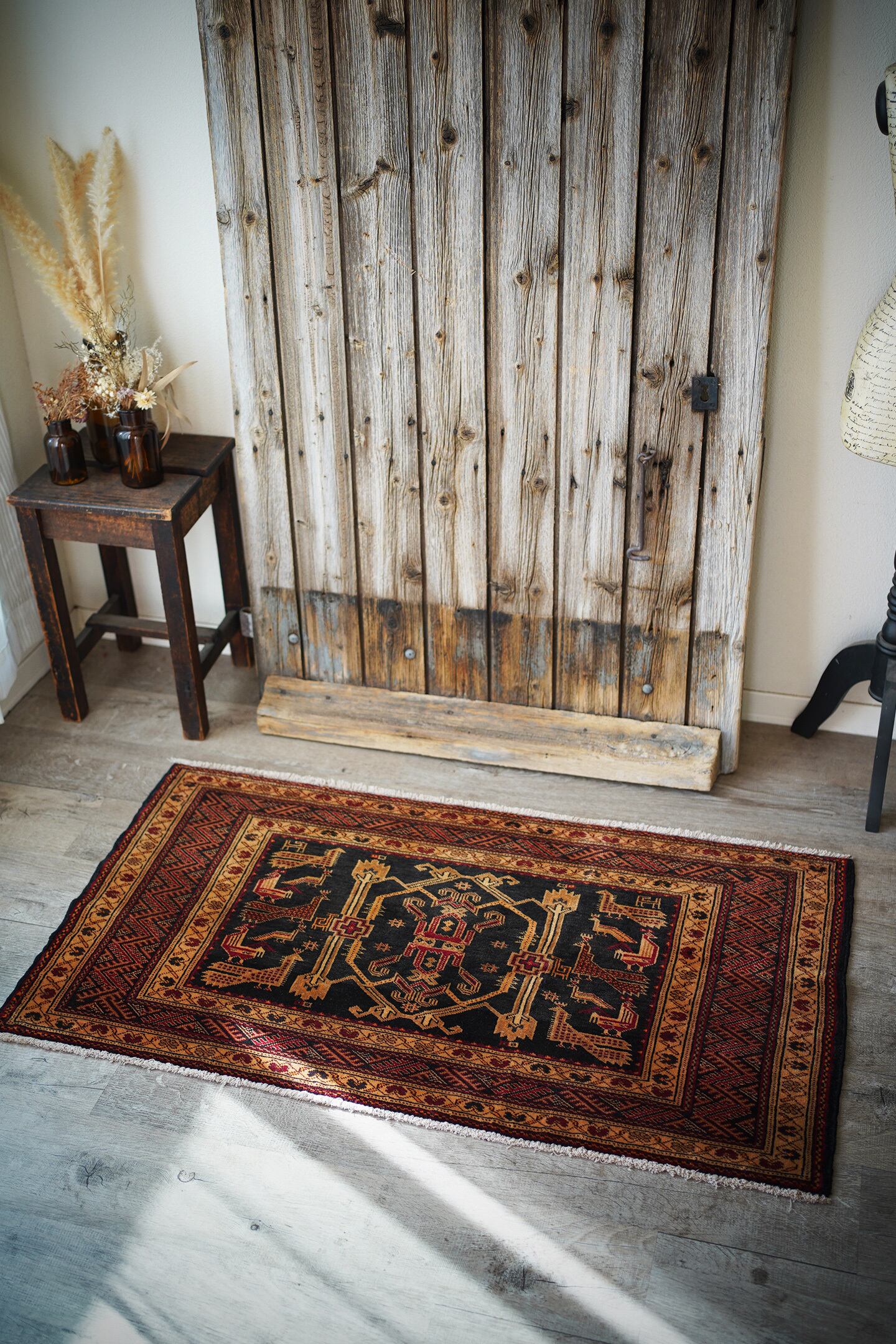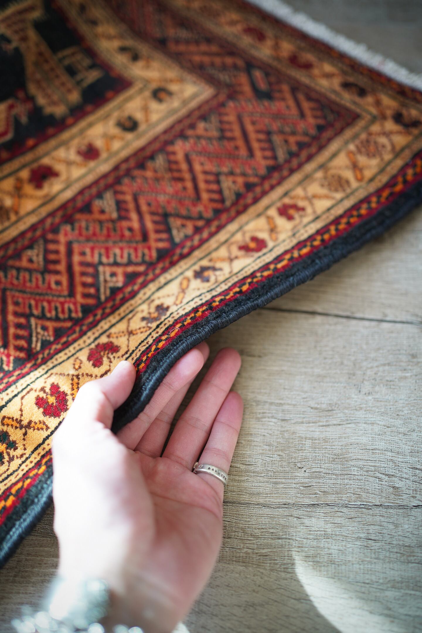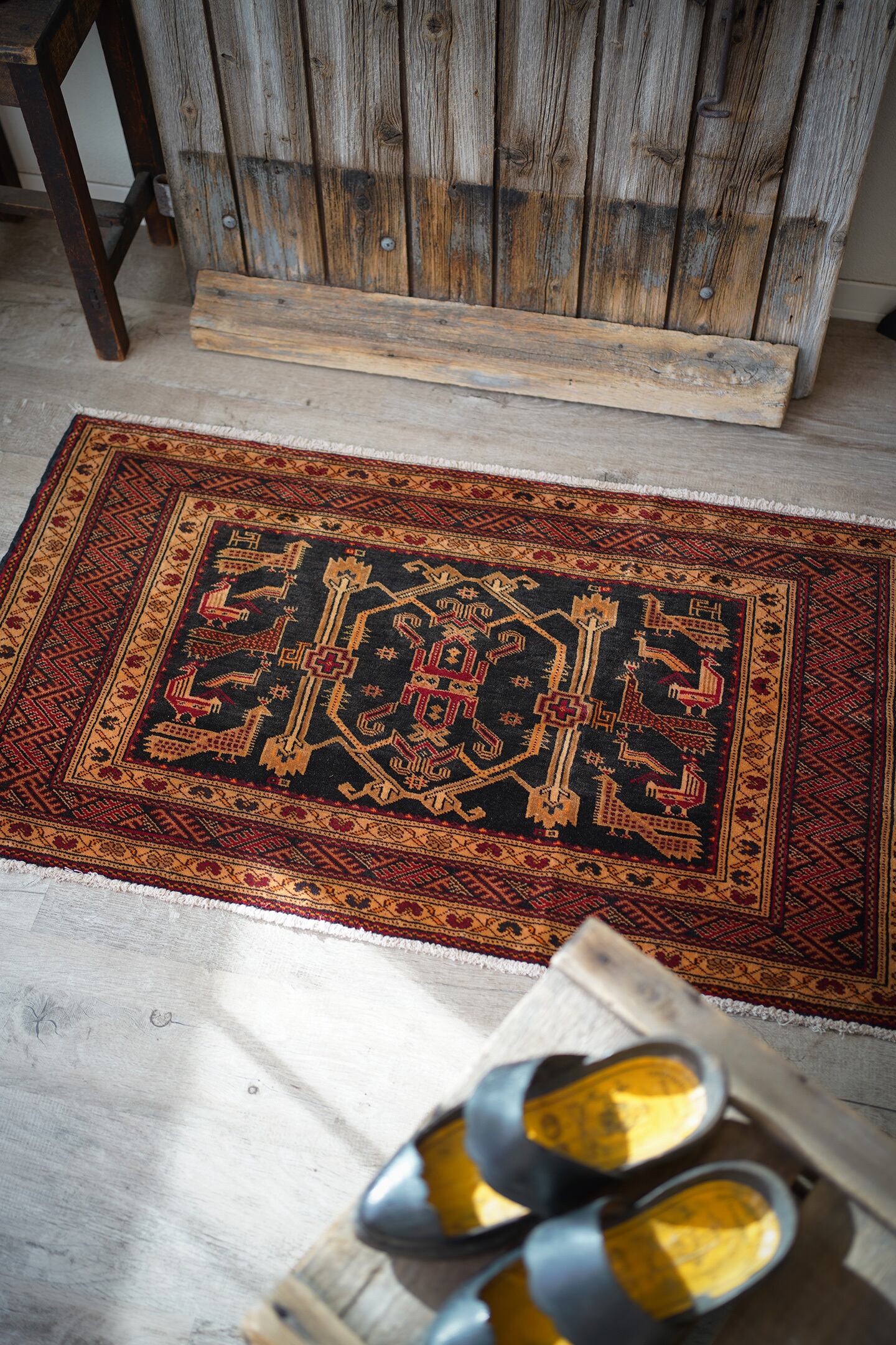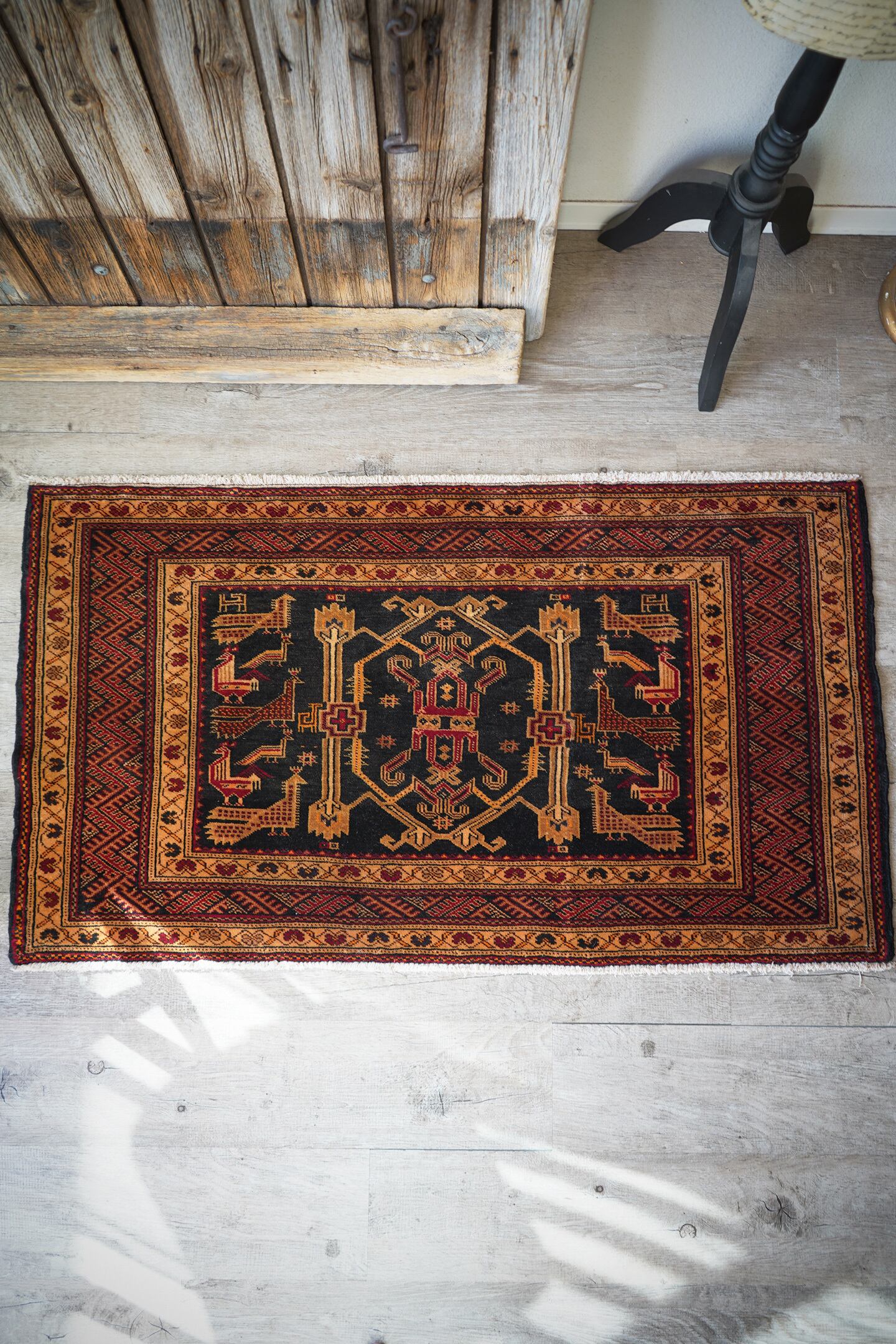 約40年前にバルーチ族によって織られたヴィンテージのラグです。様々な可愛い鳥たちが織り込まれた孔雀モチーフのデザインに一目惚れしました。このサイズ感ではあまり見かけないタイプの珍しいデザインかと思います。全体的な配色はブラック、ダークレッド、ブラウン、薄いオレンジなどが使われています。パイルは目の詰まった質感で、毛並みの長さの統一感含めてとても上質感があります。表面はソフトウールで、さらモチっとした気持ちの良い肌触り。厚みは6mmほど。状態も非常に良くパーフェクト。タペストリーとしては大きめですが壁にかけて飾っても大変カッコ良いと思います。店主イチオシの一枚。