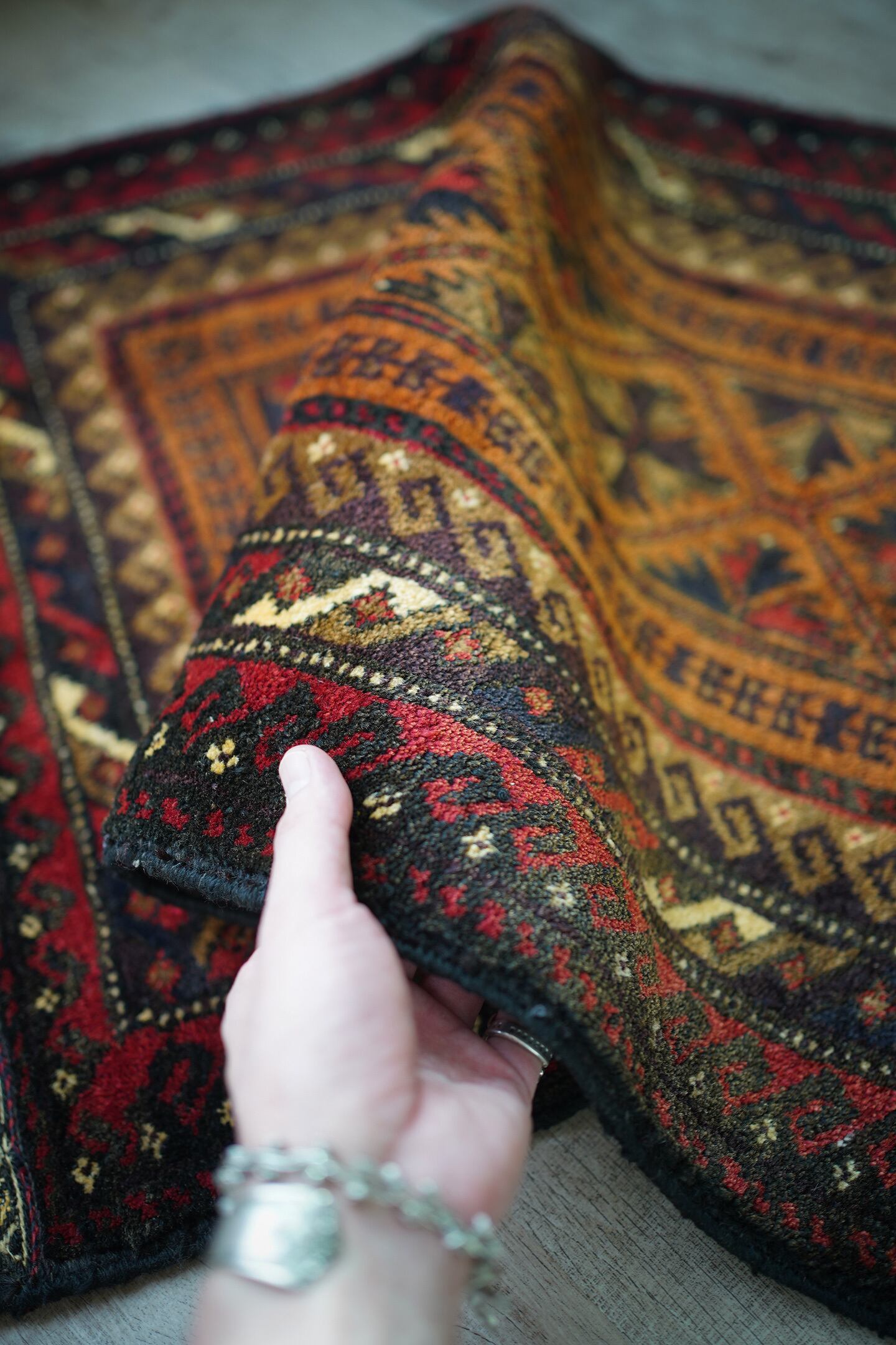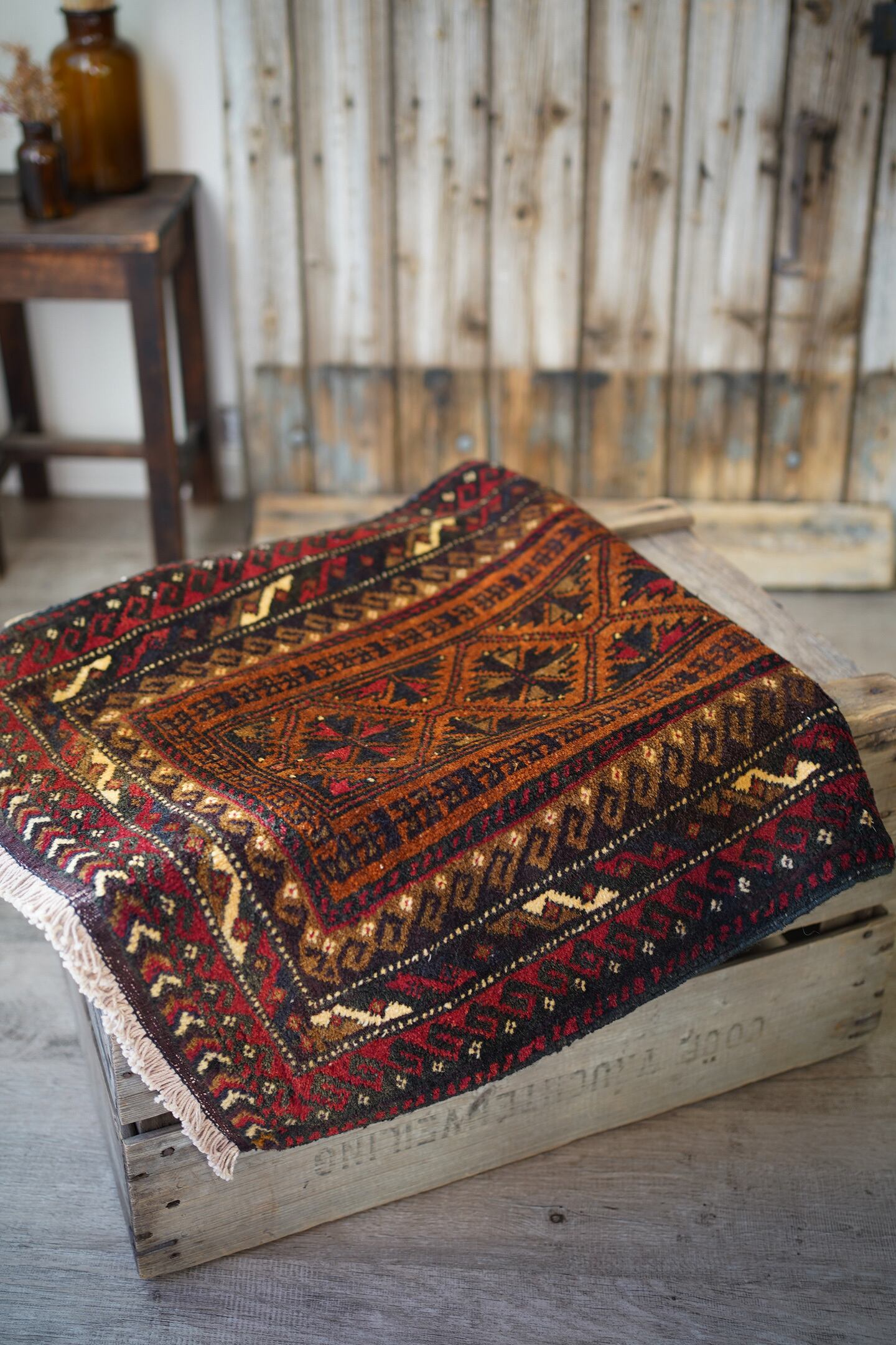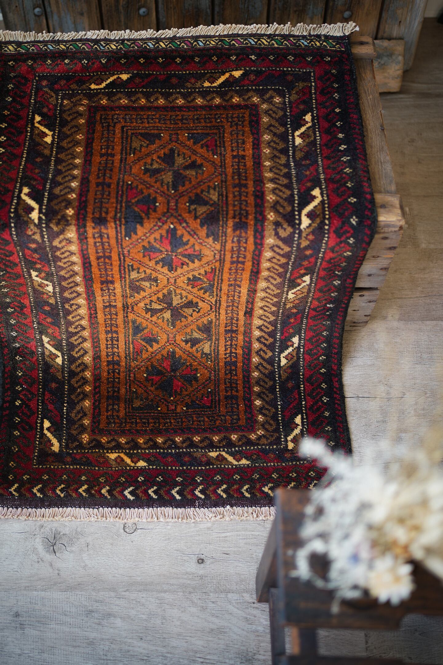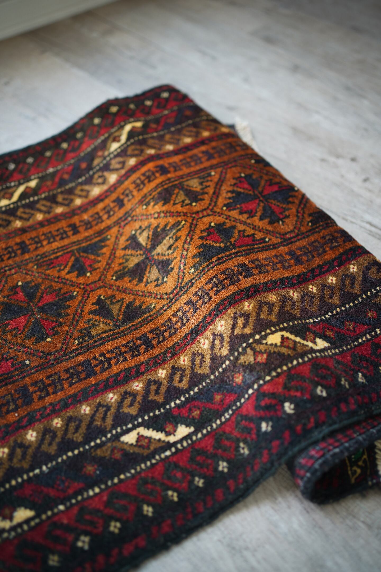 おおよそ80年前にイラン南東部のシスターン地方で織られたセミアンティークのバルーチラグです。ポプラや楓のような形の葉っぱの"チナール紋様"が織り込まれたデザインで、ブラウン、ブラック、ダークレッド、ベージュの配色です。フリンジ部分が片方キリムエンドになっており、カラフルで可愛らしいデザインをしています。表面はふわっとした優しくて気持ちの良い肌触りで、8mm程度の厚みです。状態も良く、パイルに艶もある大変美しいラグです。使い勝手の良いサイズ感なので色んな場所で活躍してくれると思います♫