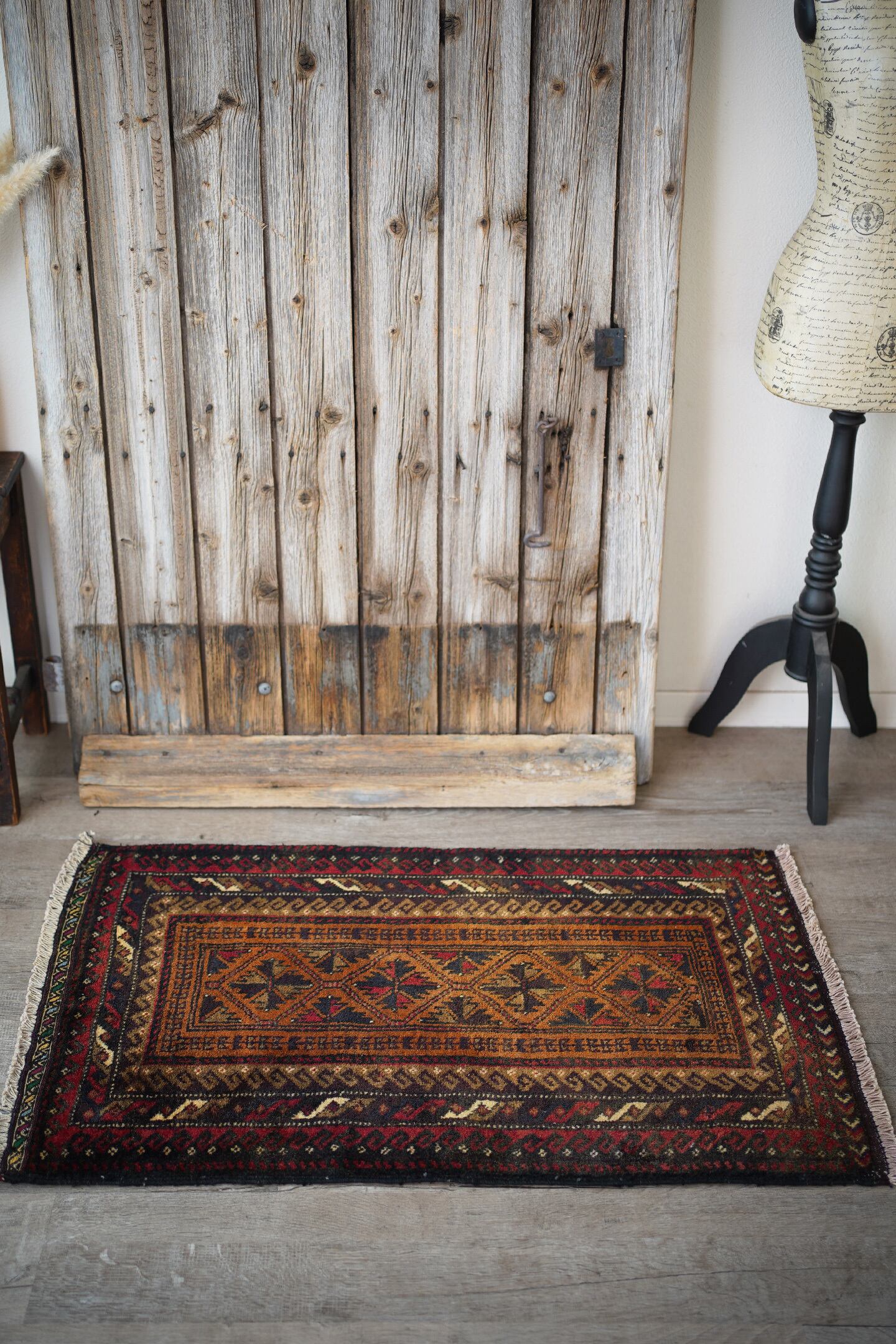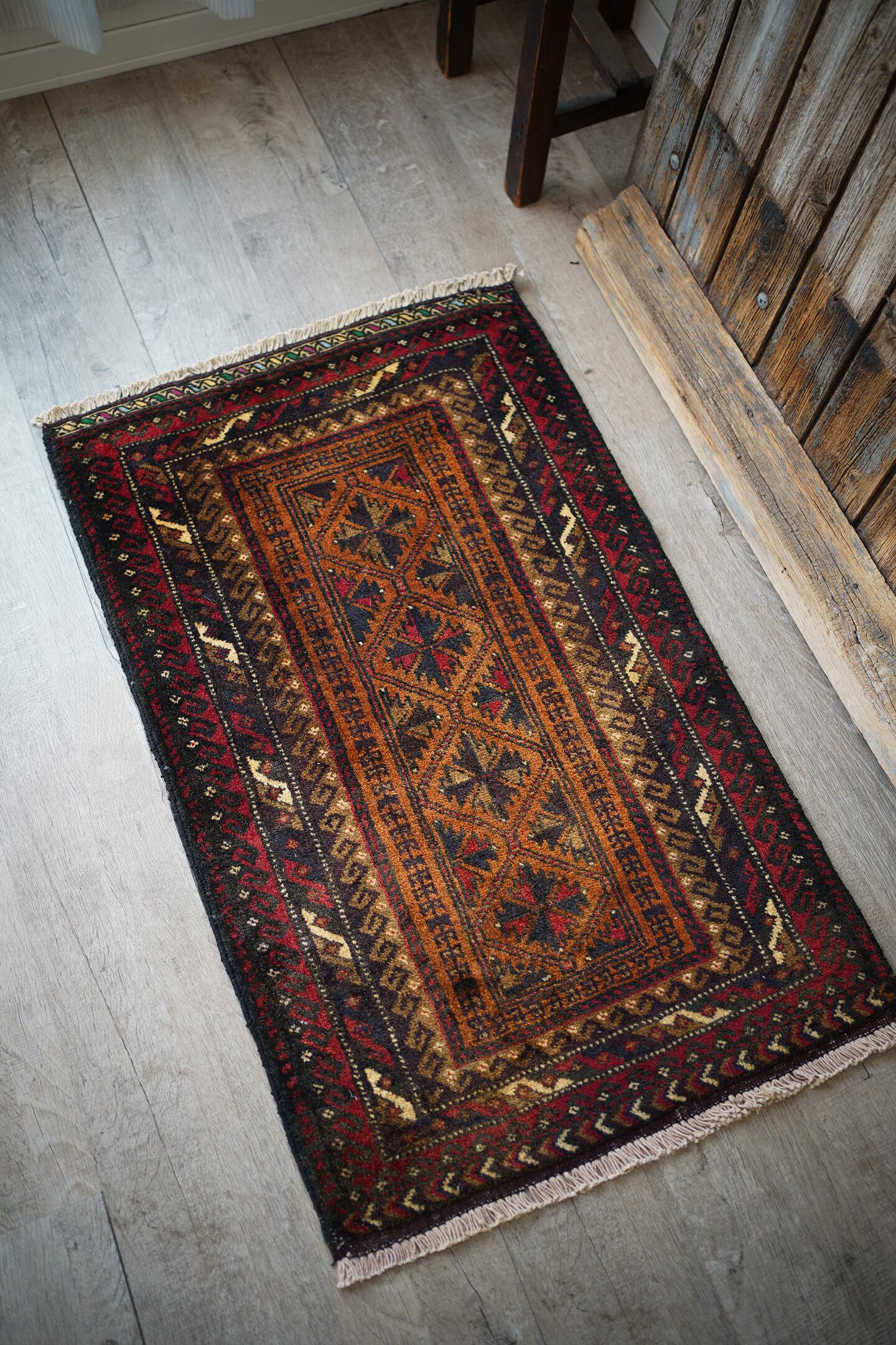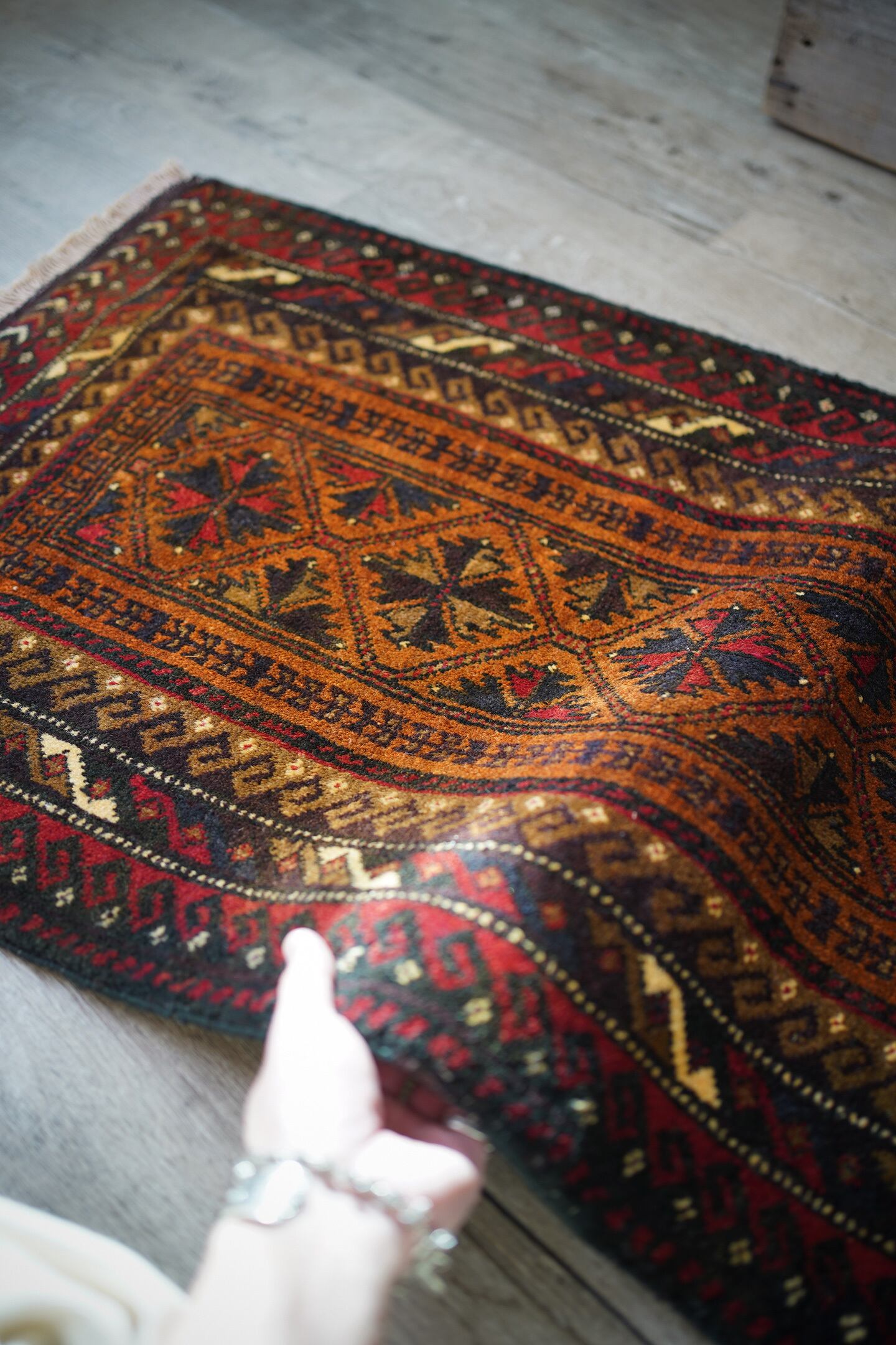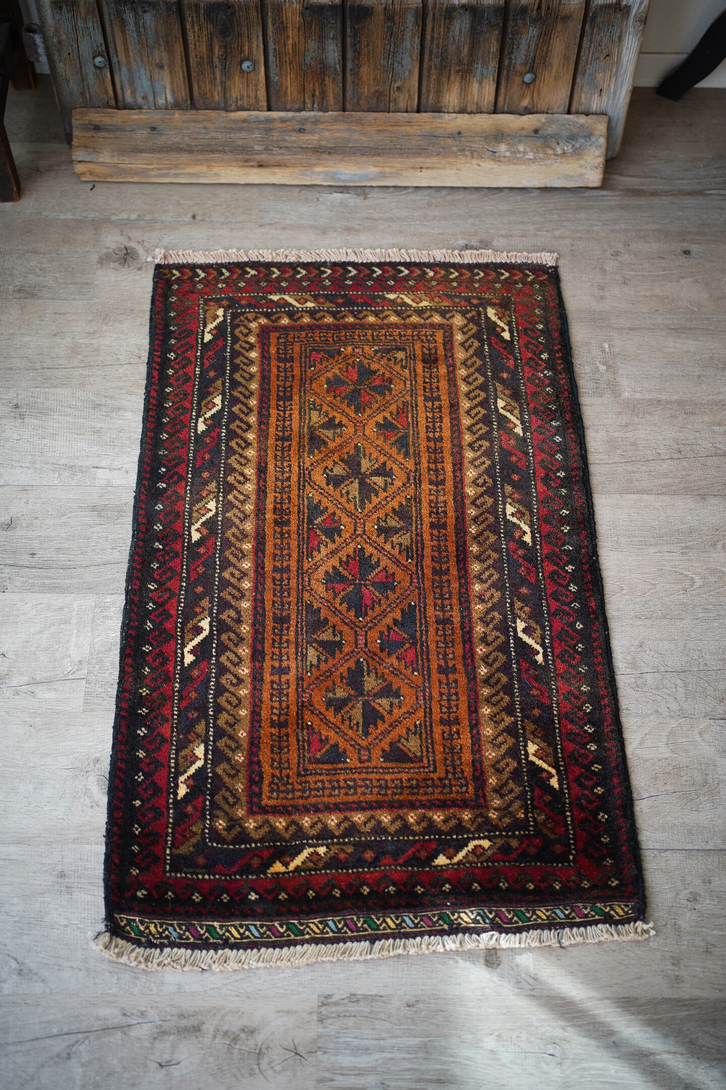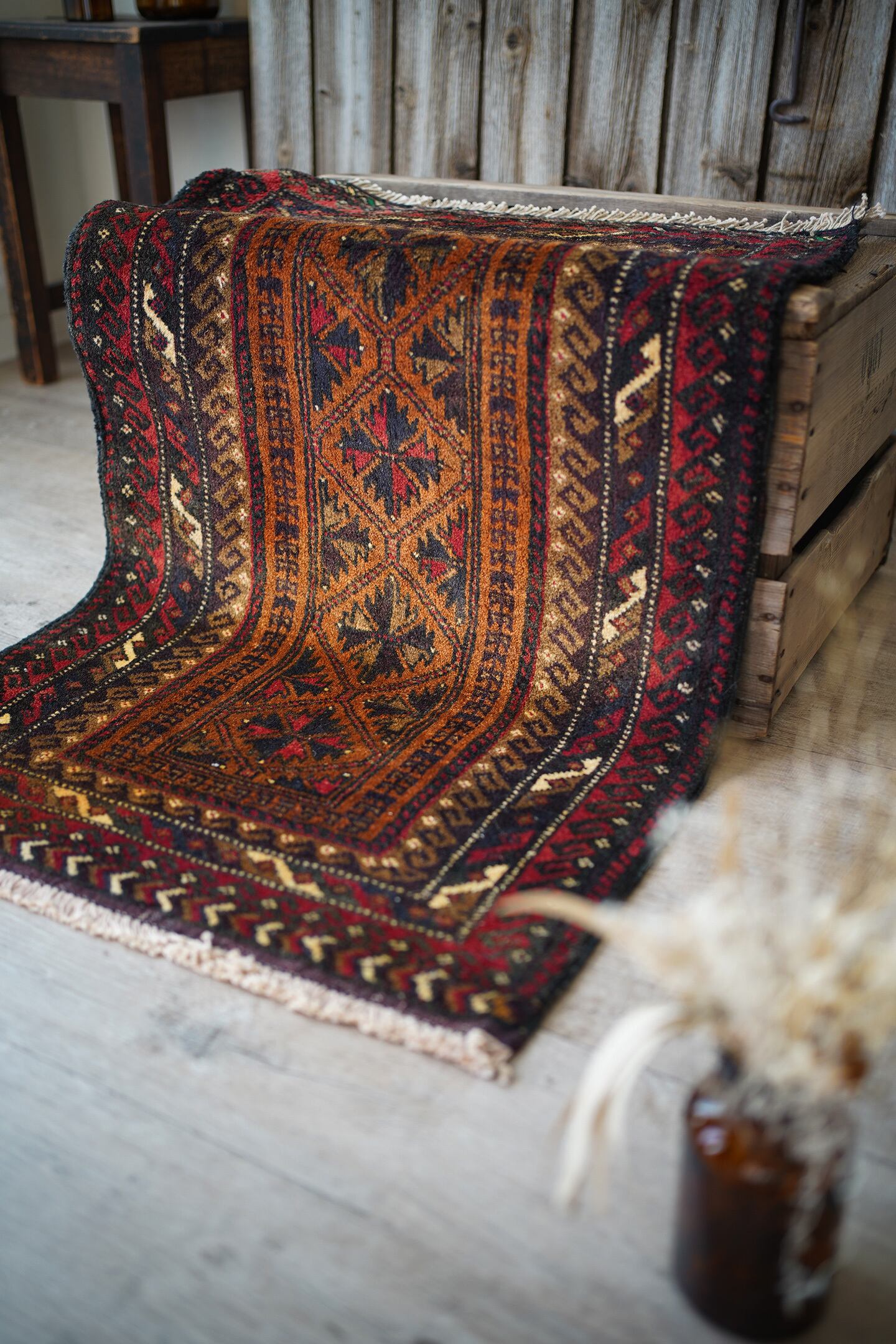 おおよそ80年前にイラン南東部のシスターン地方で織られたセミアンティークのバルーチラグです。ポプラや楓のような形の葉っぱの"チナール紋様"が織り込まれたデザインで、ブラウン、ブラック、ダークレッド、ベージュの配色です。フリンジ部分が片方キリムエンドになっており、カラフルで可愛らしいデザインをしています。表面はふわっとした優しくて気持ちの良い肌触りで、8mm程度の厚みです。状態も良く、パイルに艶もある大変美しいラグです。使い勝手の良いサイズ感なので色んな場所で活躍してくれると思います♫