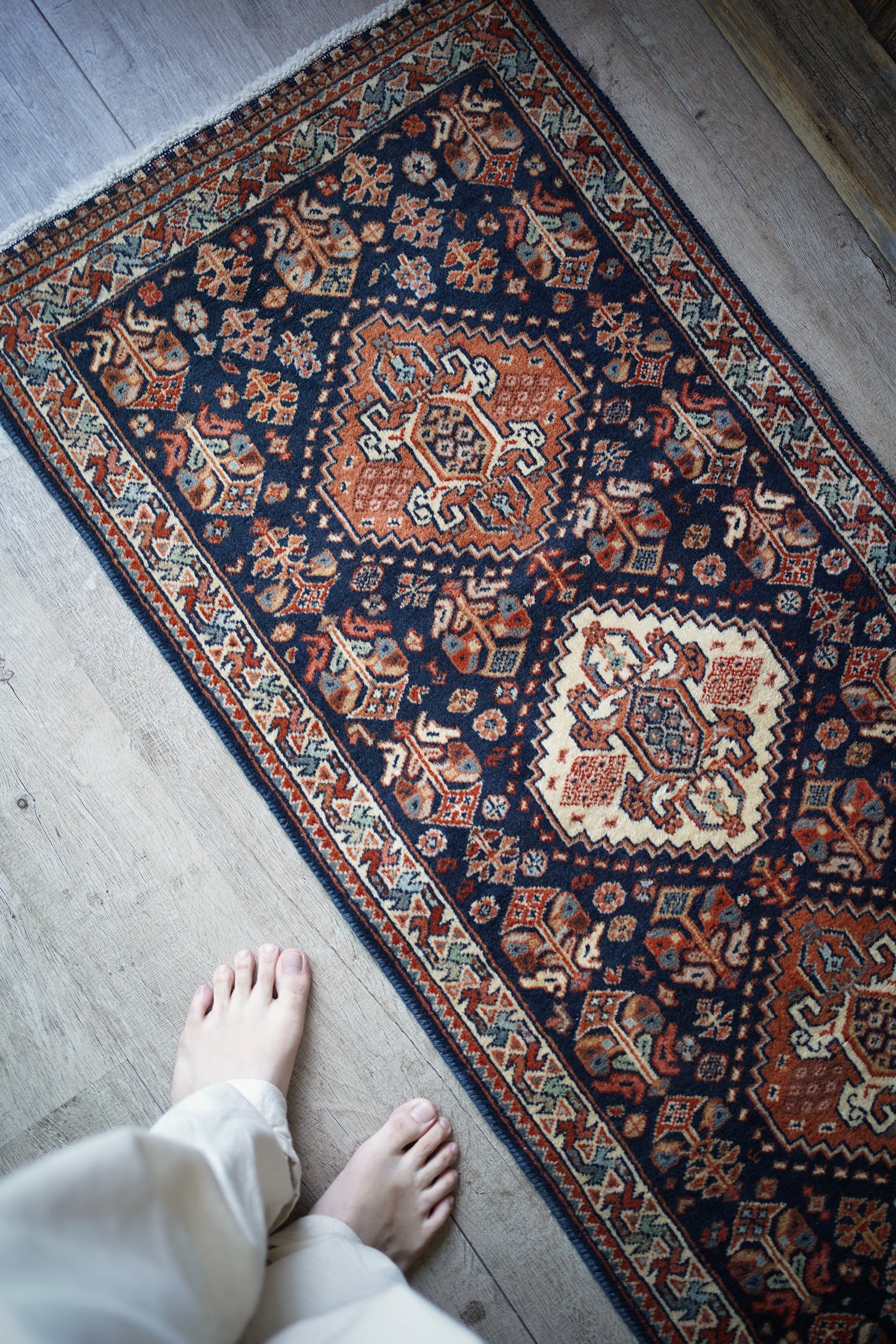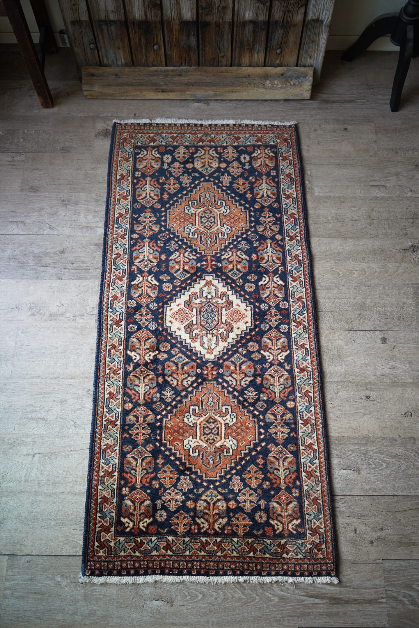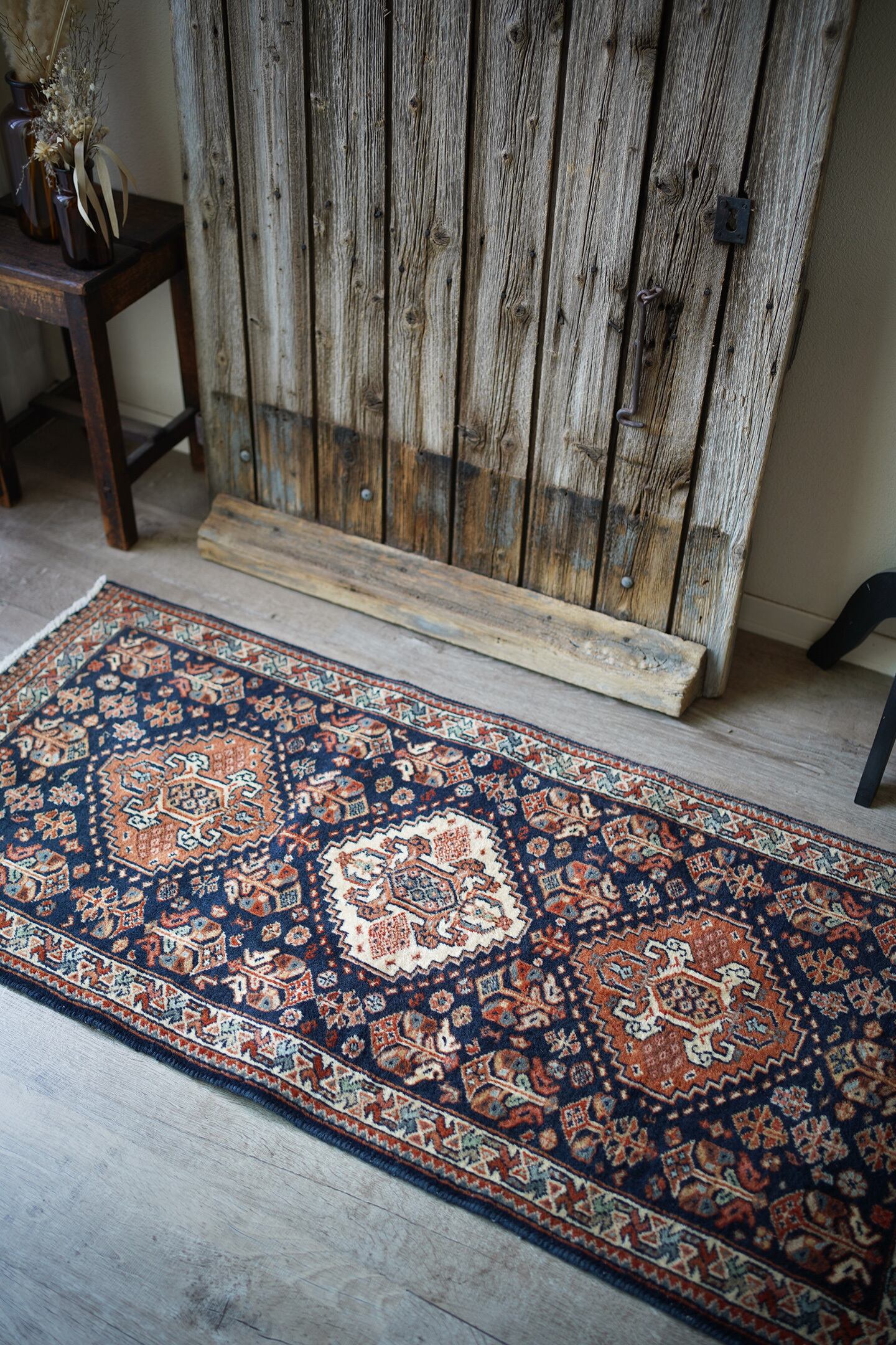 おおよそ60年前に織られたイラン・シーラーズ産、ランナータイプのカシュガイラグです。3連のメダリオンの周りには等間隔で織り込まれた可愛らしい花紋様。フィールドはネイビーカラー、紋様には淡いピンクやライトブルー、クリーム色などの優しい色合いが使われており、全体的に柔らかい雰囲気の一枚です。表面のパイルはふわサラッと、優しく滑らかな肌触りをしています。しっかりとした堅牢な作りで、厚みは9mm程度。ダメージや補修跡もなく、コンディションもパーフェクトです。廊下や玄関スペースなどで活躍してくれそうなサイズ感♫