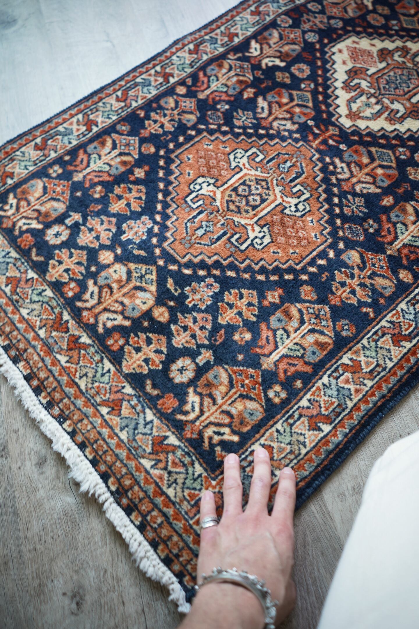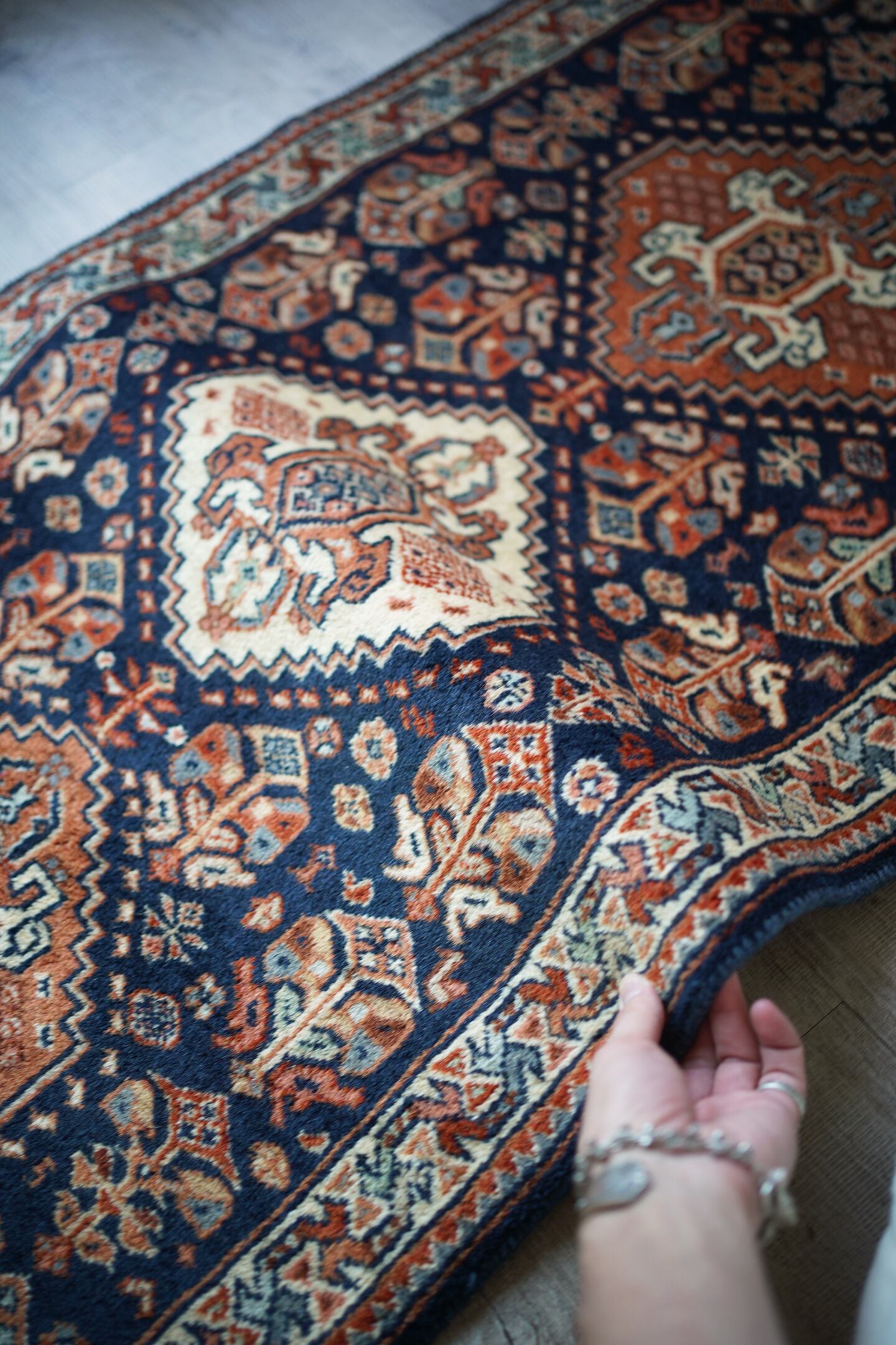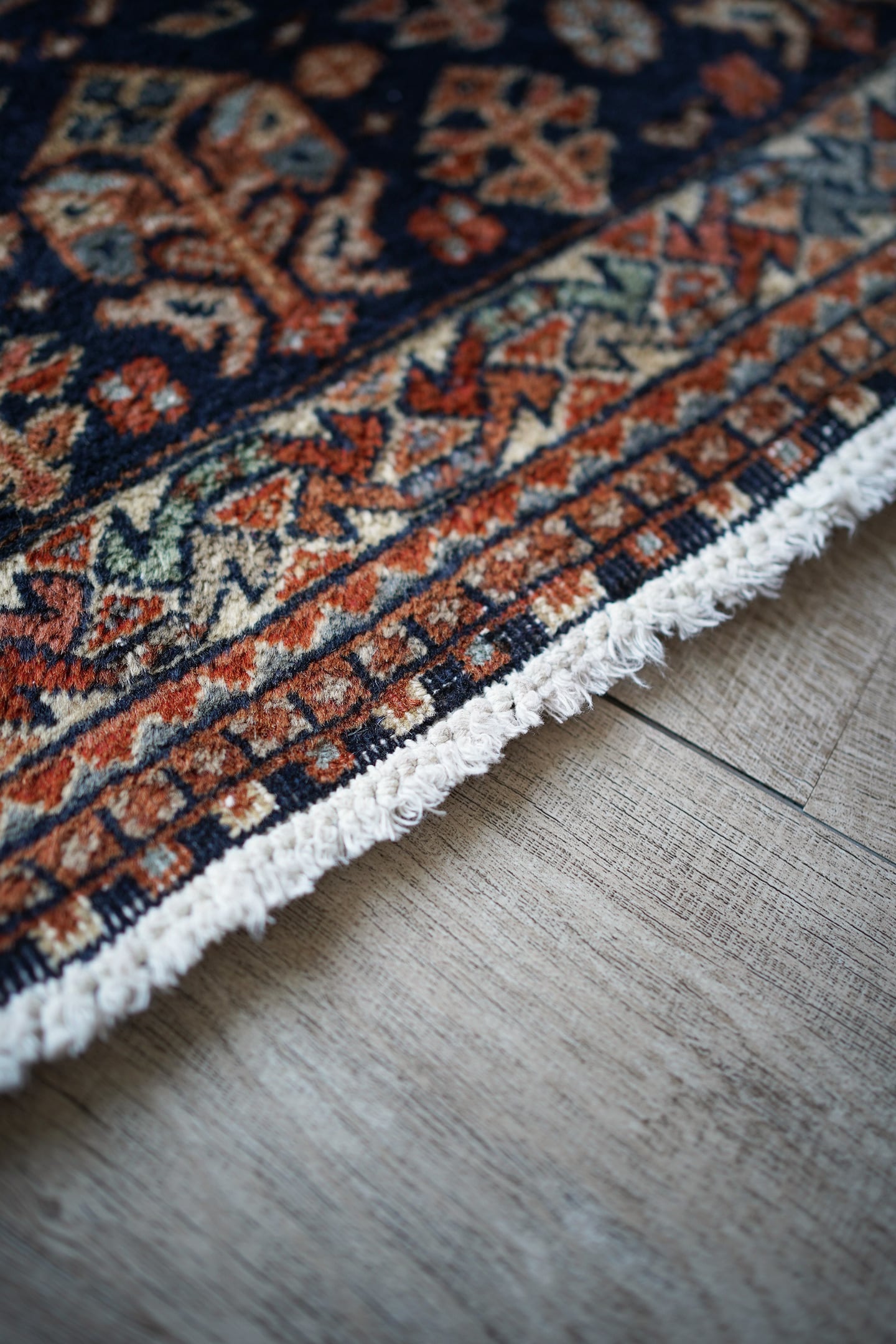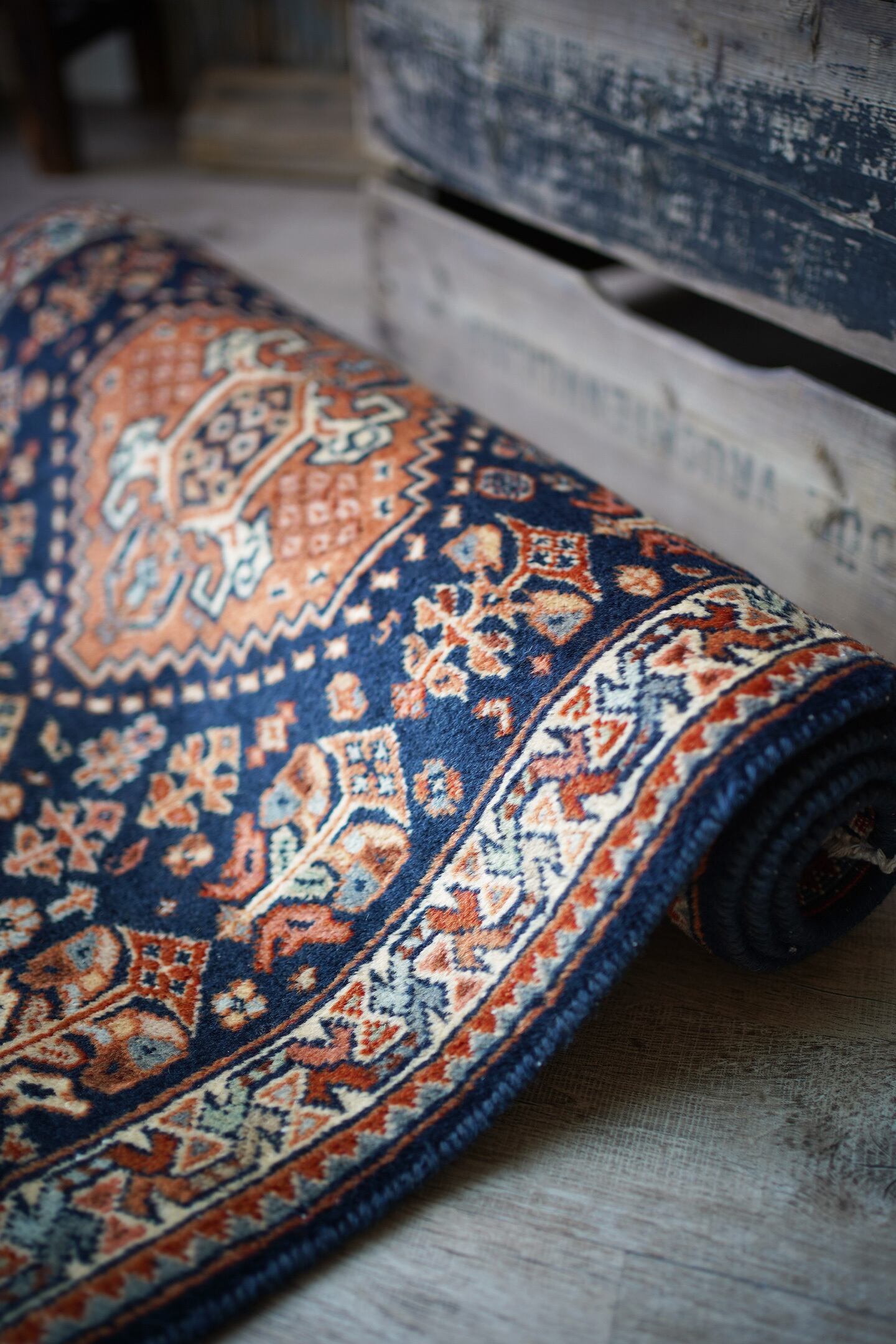 おおよそ60年前に織られたイラン・シーラーズ産、ランナータイプのカシュガイラグです。3連のメダリオンの周りには等間隔で織り込まれた可愛らしい花紋様。フィールドはネイビーカラー、紋様には淡いピンクやライトブルー、クリーム色などの優しい色合いが使われており、全体的に柔らかい雰囲気の一枚です。表面のパイルはふわサラッと、優しく滑らかな肌触りをしています。しっかりとした堅牢な作りで、厚みは9mm程度。ダメージや補修跡もなく、コンディションもパーフェクトです。廊下や玄関スペースなどで活躍してくれそうなサイズ感♫