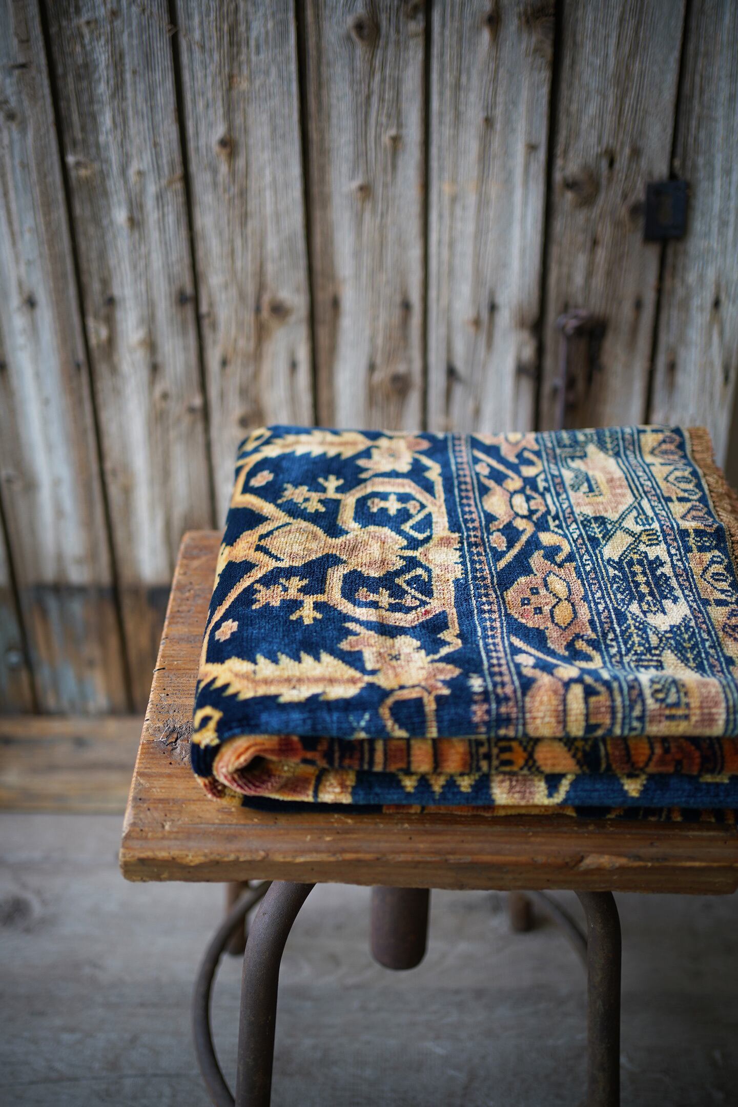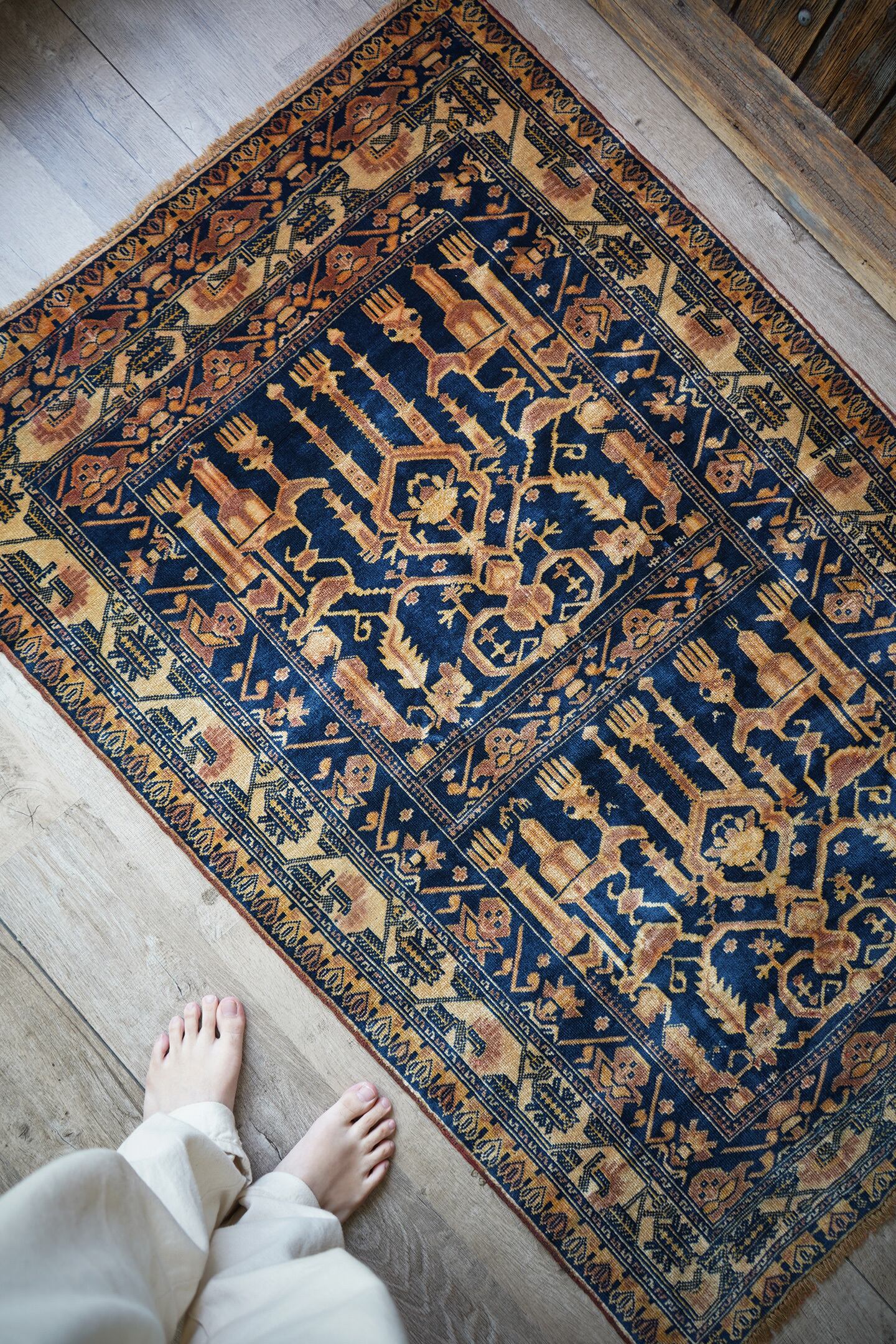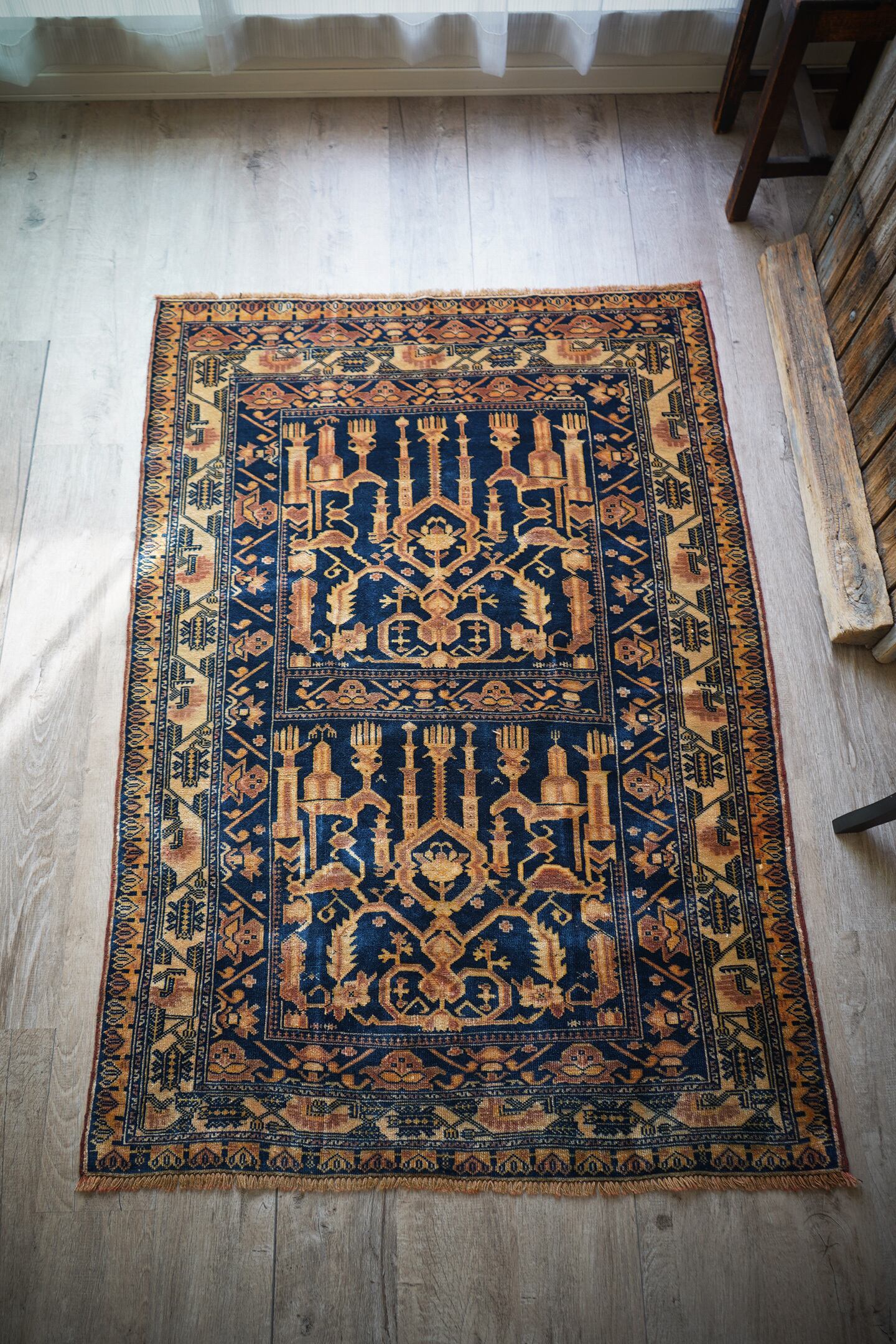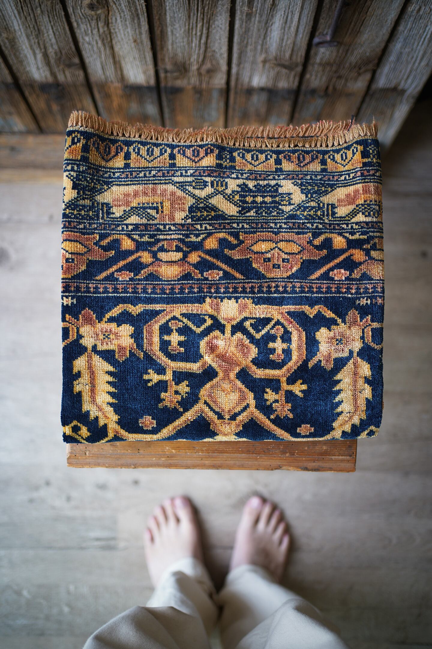 神々しい宝石のような煌くオーラを放つ経年50年のアリホジャラグ。広げた瞬間にジュエリーのようなキラキラとした輝きに、とても感動したのを覚えています。濃紺、黄金色のようなベージュカラー、ブラウンの配色で敷く向きによって暗めな濃紺に見えたり、一方では綺麗な青い艶が際立ちます。パイルは短めながら統一感のある長さで上質感があり、表面はサラふわっと滑らかなで気持ちの良い肌触り。厚みは5mm〜6mm程度。 ダメージなどもなく、パーフェクトなコンディション。改めてラグの世界は面白くて素晴らしいなと思わせてくれるほど素敵なラグです。