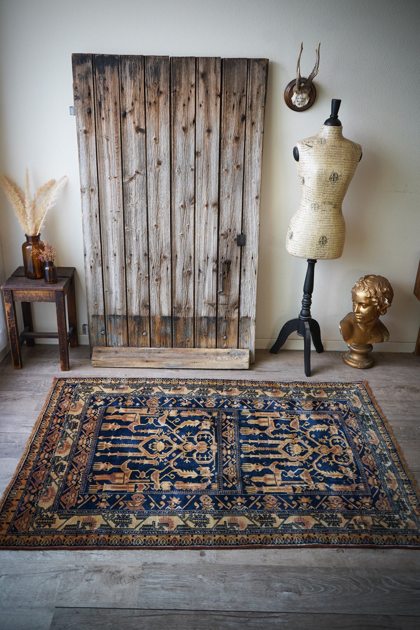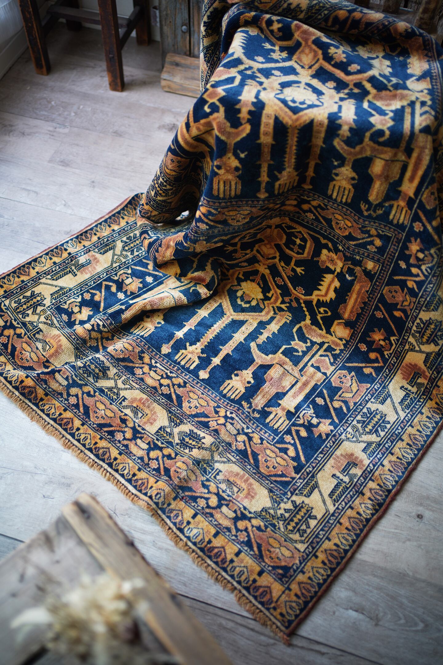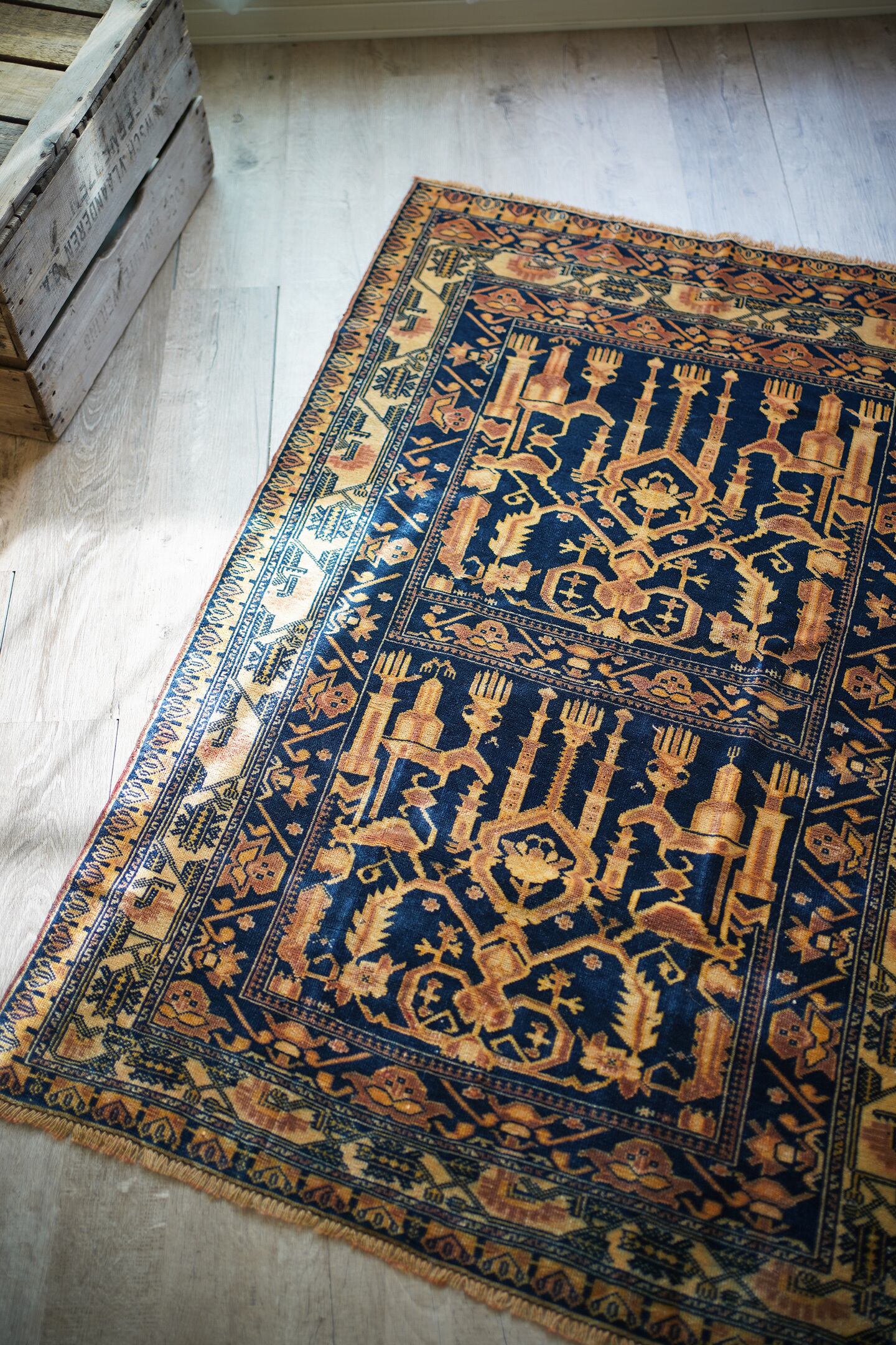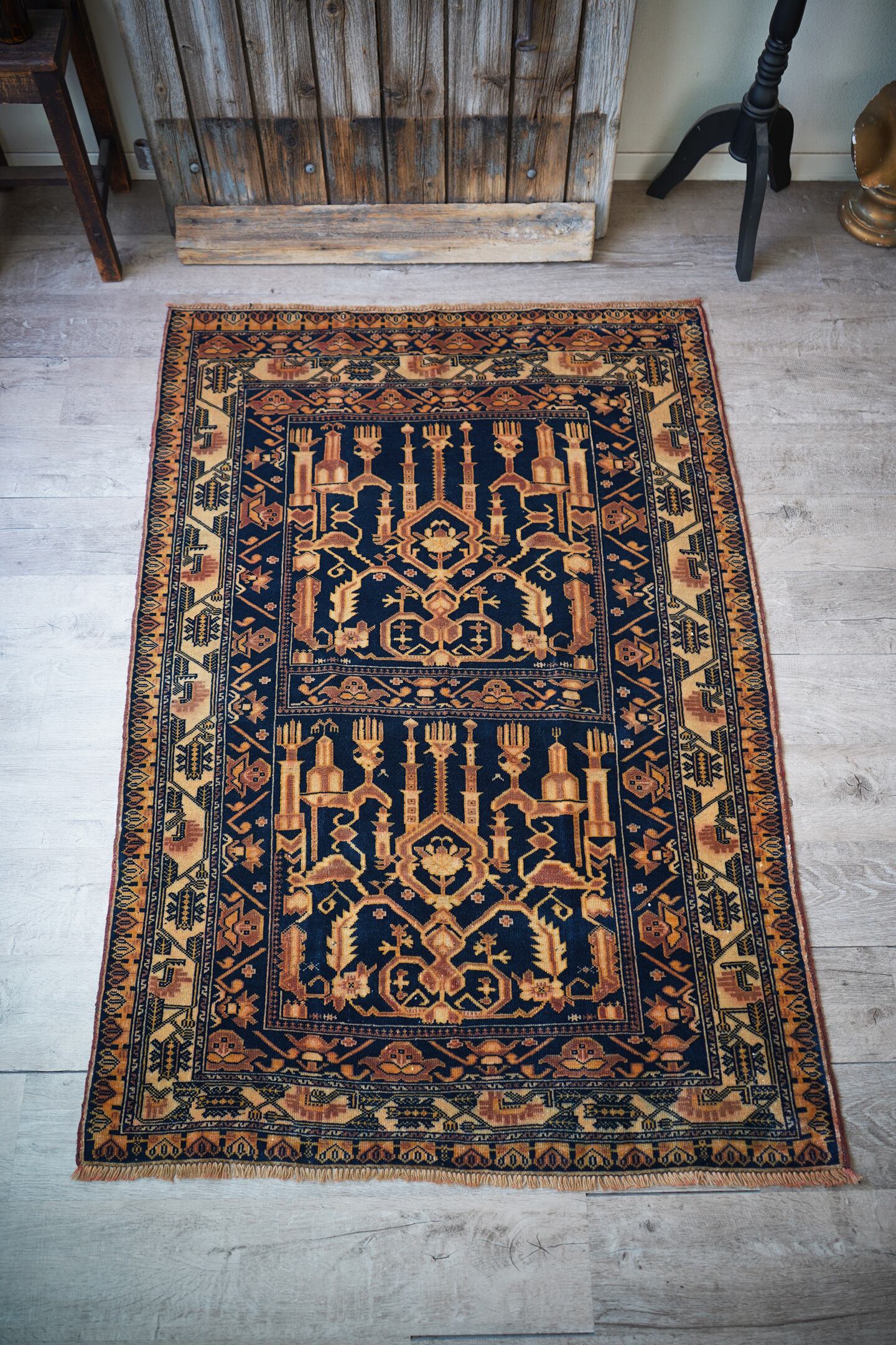 神々しい宝石のような煌くオーラを放つ経年50年のアリホジャラグ。広げた瞬間にジュエリーのようなキラキラとした輝きに、とても感動したのを覚えています。濃紺、黄金色のようなベージュカラー、ブラウンの配色で敷く向きによって暗めな濃紺に見えたり、一方では綺麗な青い艶が際立ちます。パイルは短めながら統一感のある長さで上質感があり、表面はサラふわっと滑らかなで気持ちの良い肌触り。厚みは5mm〜6mm程度。 ダメージなどもなく、パーフェクトなコンディション。改めてラグの世界は面白くて素晴らしいなと思わせてくれるほど素敵なラグです。