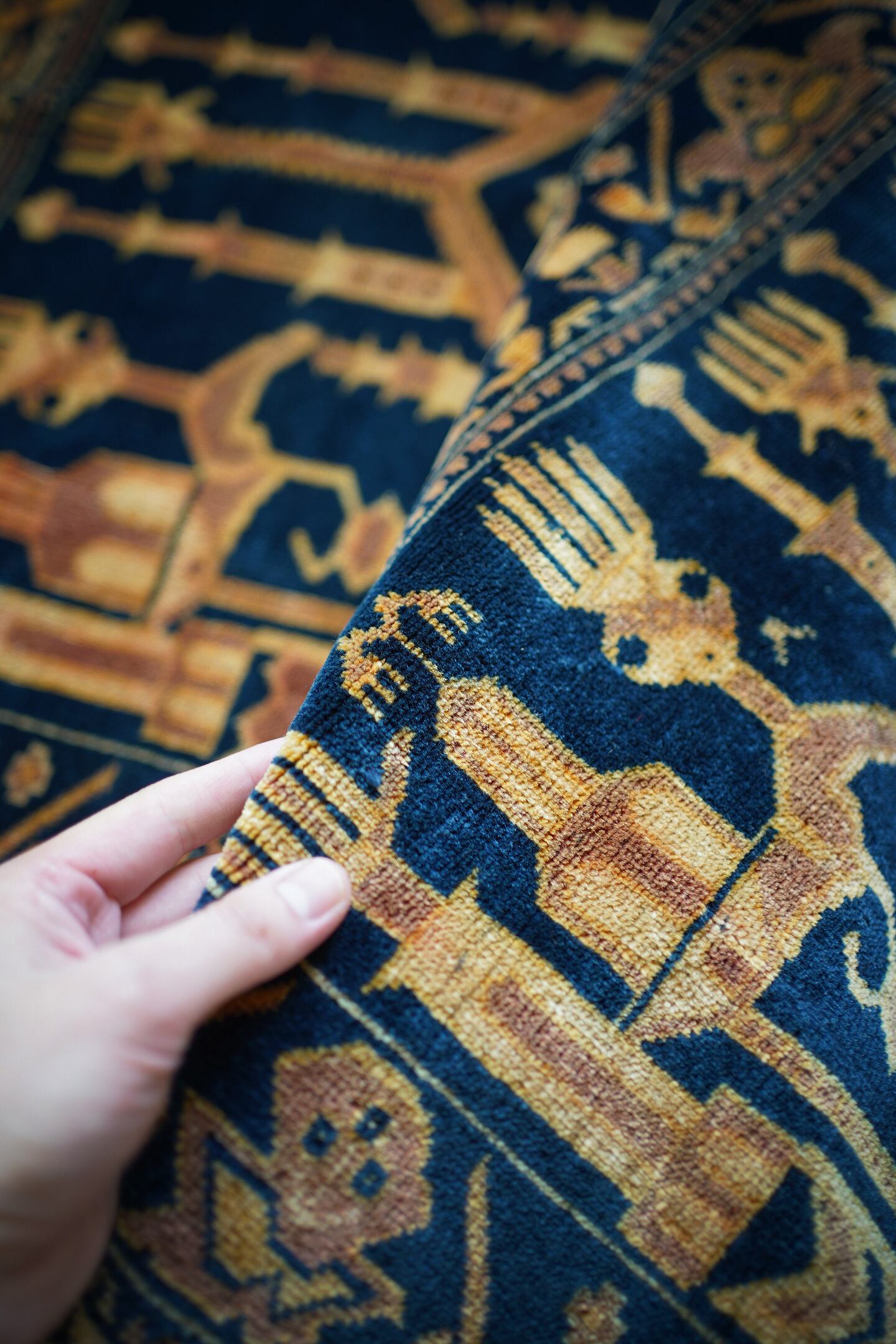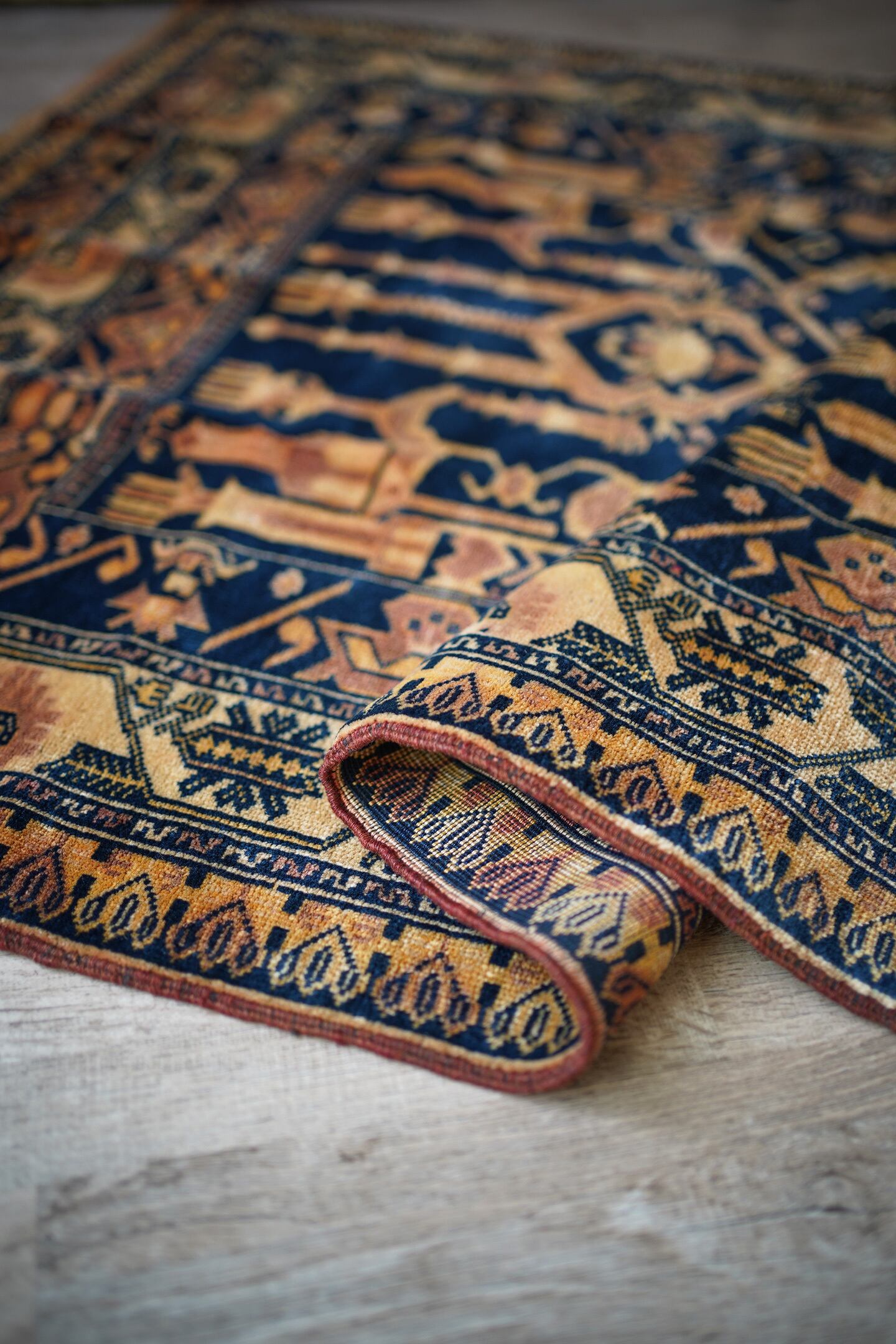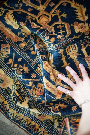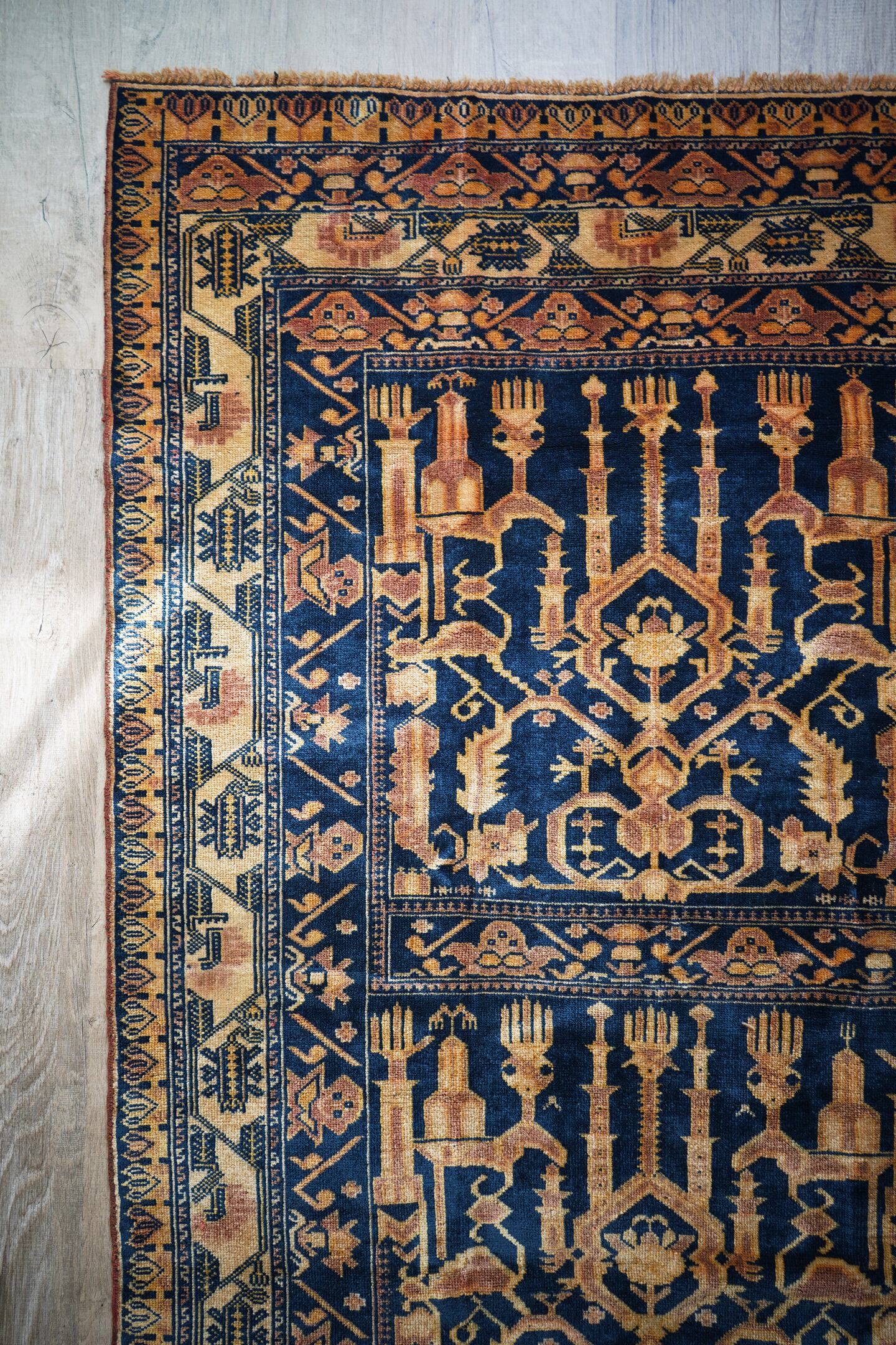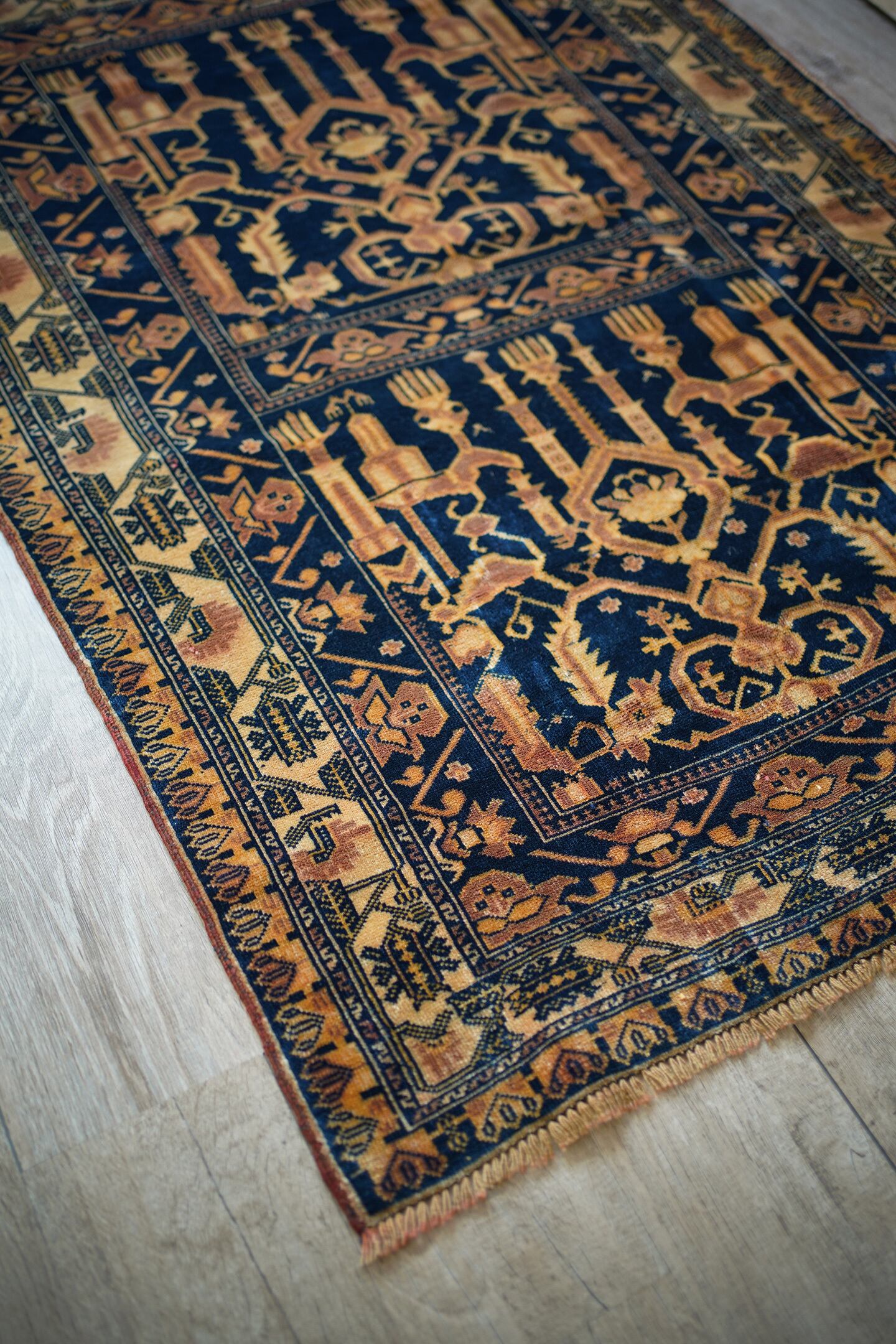 神々しい宝石のような煌くオーラを放つ経年50年のアリホジャラグ。広げた瞬間にジュエリーのようなキラキラとした輝きに、とても感動したのを覚えています。濃紺、黄金色のようなベージュカラー、ブラウンの配色で敷く向きによって暗めな濃紺に見えたり、一方では綺麗な青い艶が際立ちます。パイルは短めながら統一感のある長さで上質感があり、表面はサラふわっと滑らかなで気持ちの良い肌触り。厚みは5mm〜6mm程度。 ダメージなどもなく、パーフェクトなコンディション。改めてラグの世界は面白くて素晴らしいなと思わせてくれるほど素敵なラグです。