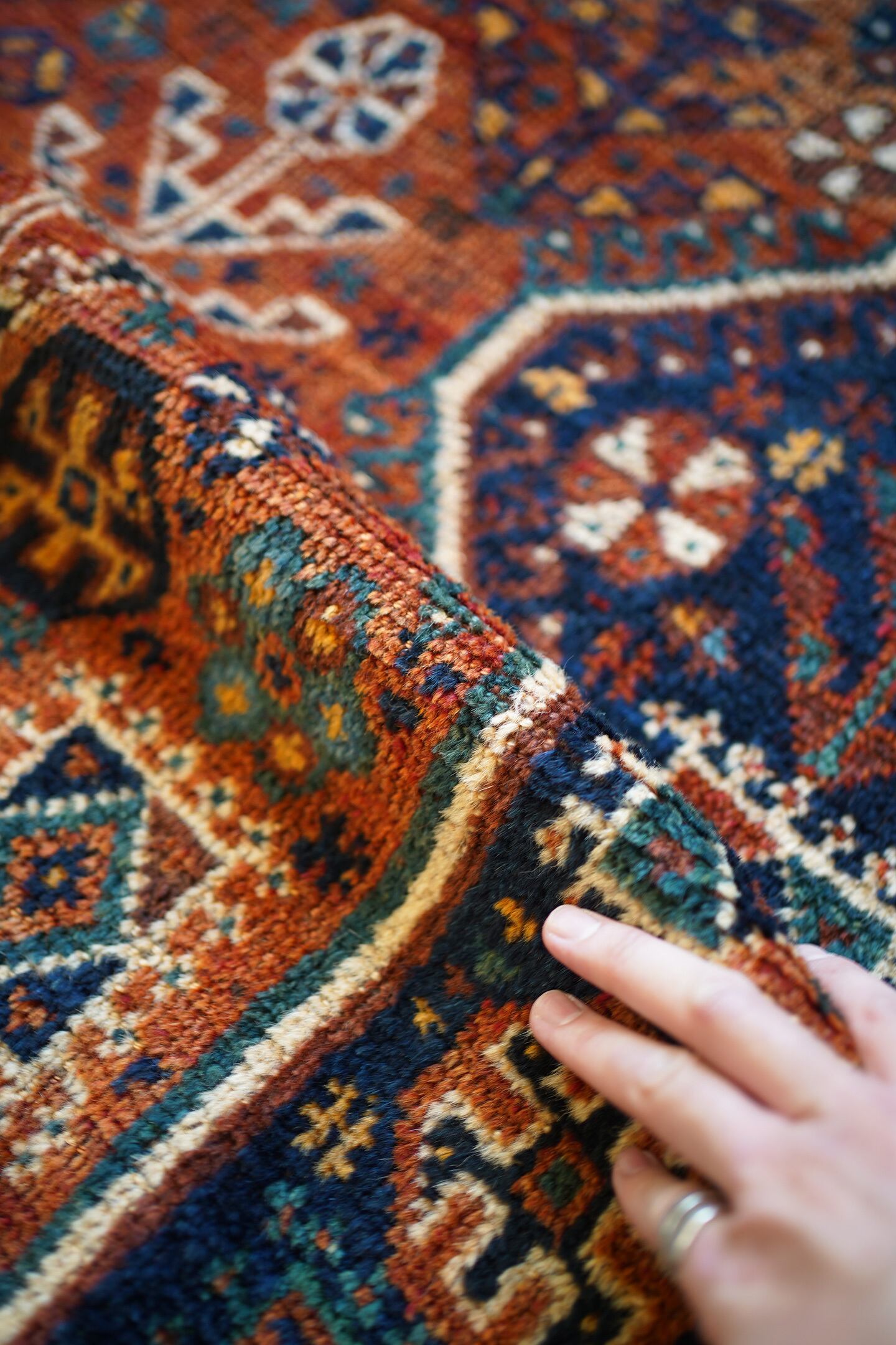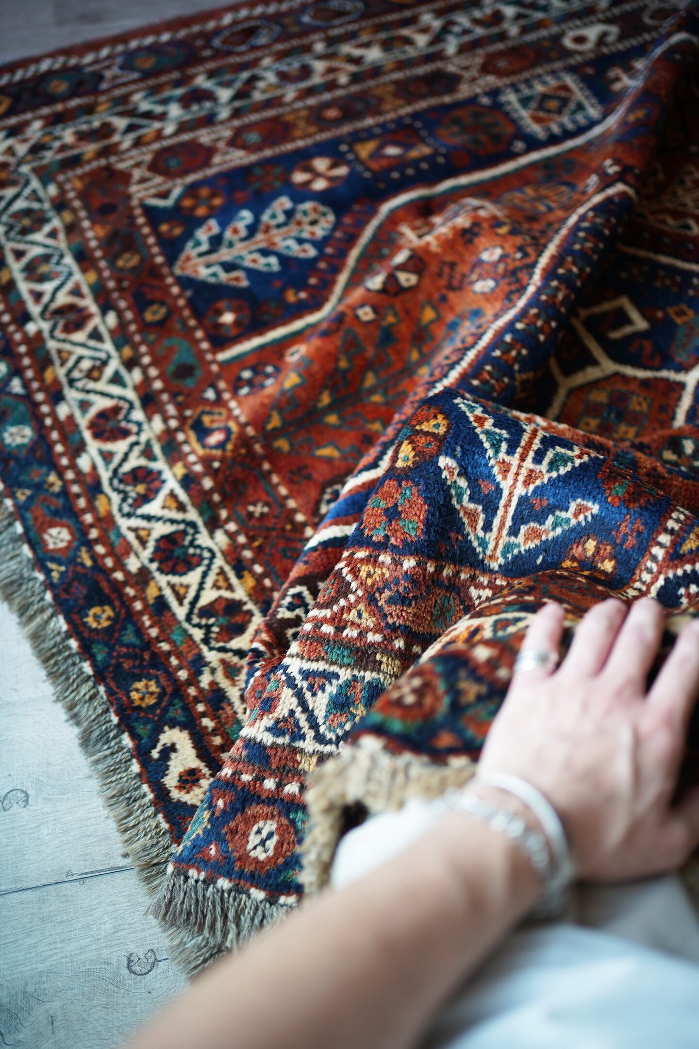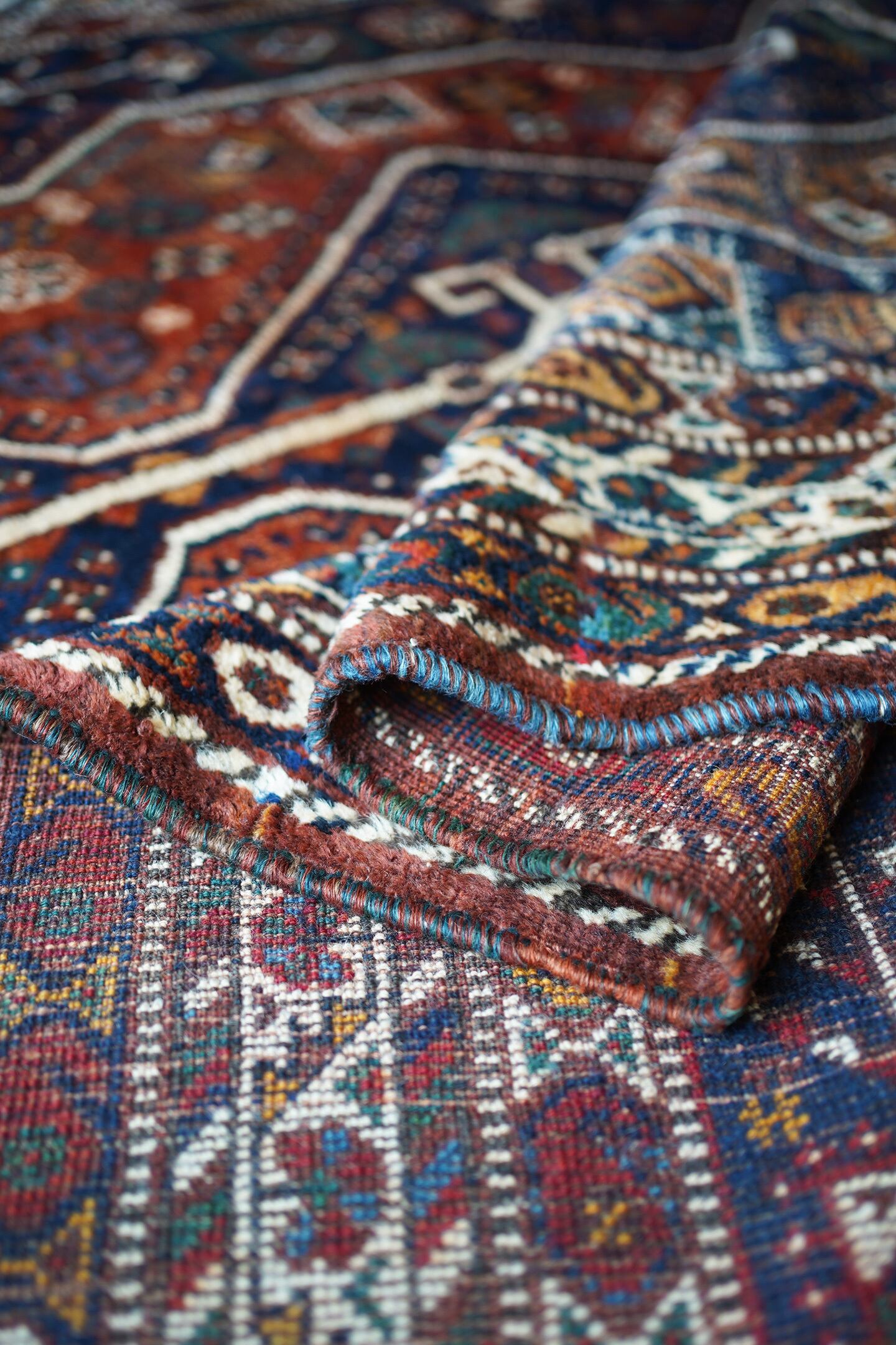 ハムセ連合によって約80年前に作られたセミアンティークのラグです。少しオレンジ味がかったブラウンカラーと深めのネイビーがメインカラー。パイル全体に美しい艶があり、現物を広げて眺めた際に感動しました。表面はふわっと滑らか、柔らかく優しい肌触りで、とても気持ちの良い質感です。厚みは7mm程度と程よい厚さがございます。パイルが少し薄くなっている箇所もありますが、全体的にパイルも綺麗に残っており、補修跡も見受けられず状態も大変良好です。お部屋の主役として、ぜひお迎えいただければと思います。