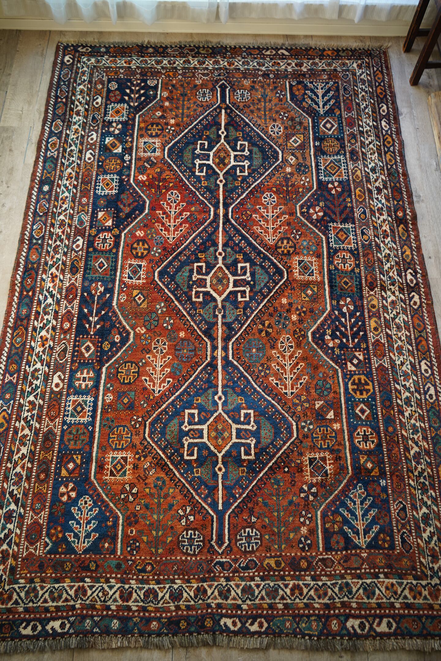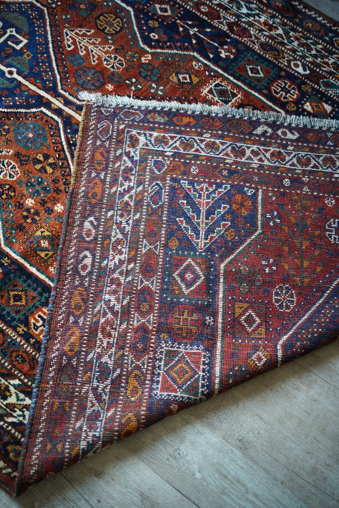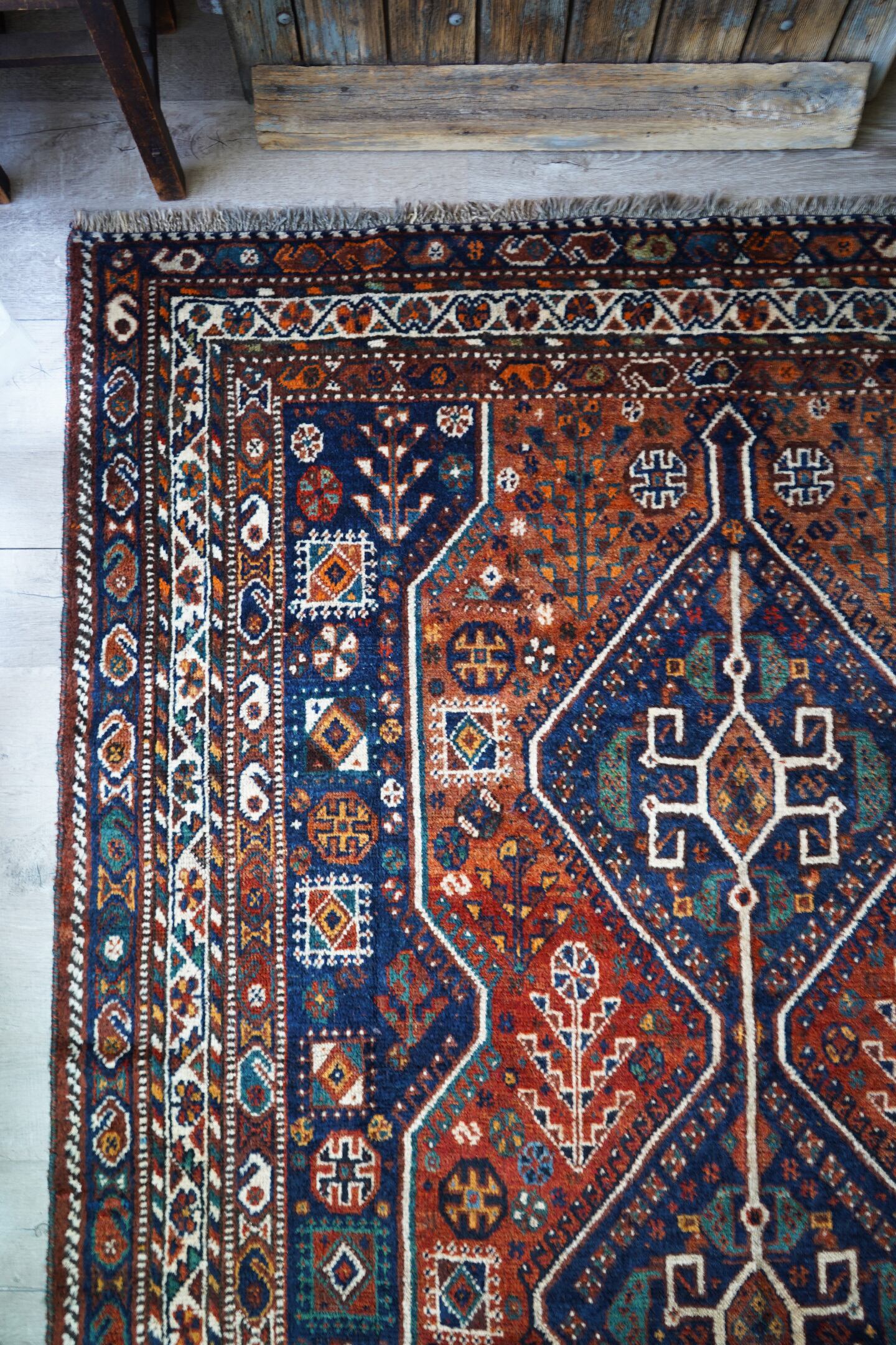 ハムセ連合によって約80年前に作られたセミアンティークのラグです。少しオレンジ味がかったブラウンカラーと深めのネイビーがメインカラー。パイル全体に美しい艶があり、現物を広げて眺めた際に感動しました。表面はふわっと滑らか、柔らかく優しい肌触りで、とても気持ちの良い質感です。厚みは7mm程度と程よい厚さがございます。パイルが少し薄くなっている箇所もありますが、全体的にパイルも綺麗に残っており、補修跡も見受けられず状態も大変良好です。お部屋の主役として、ぜひお迎えいただければと思います。