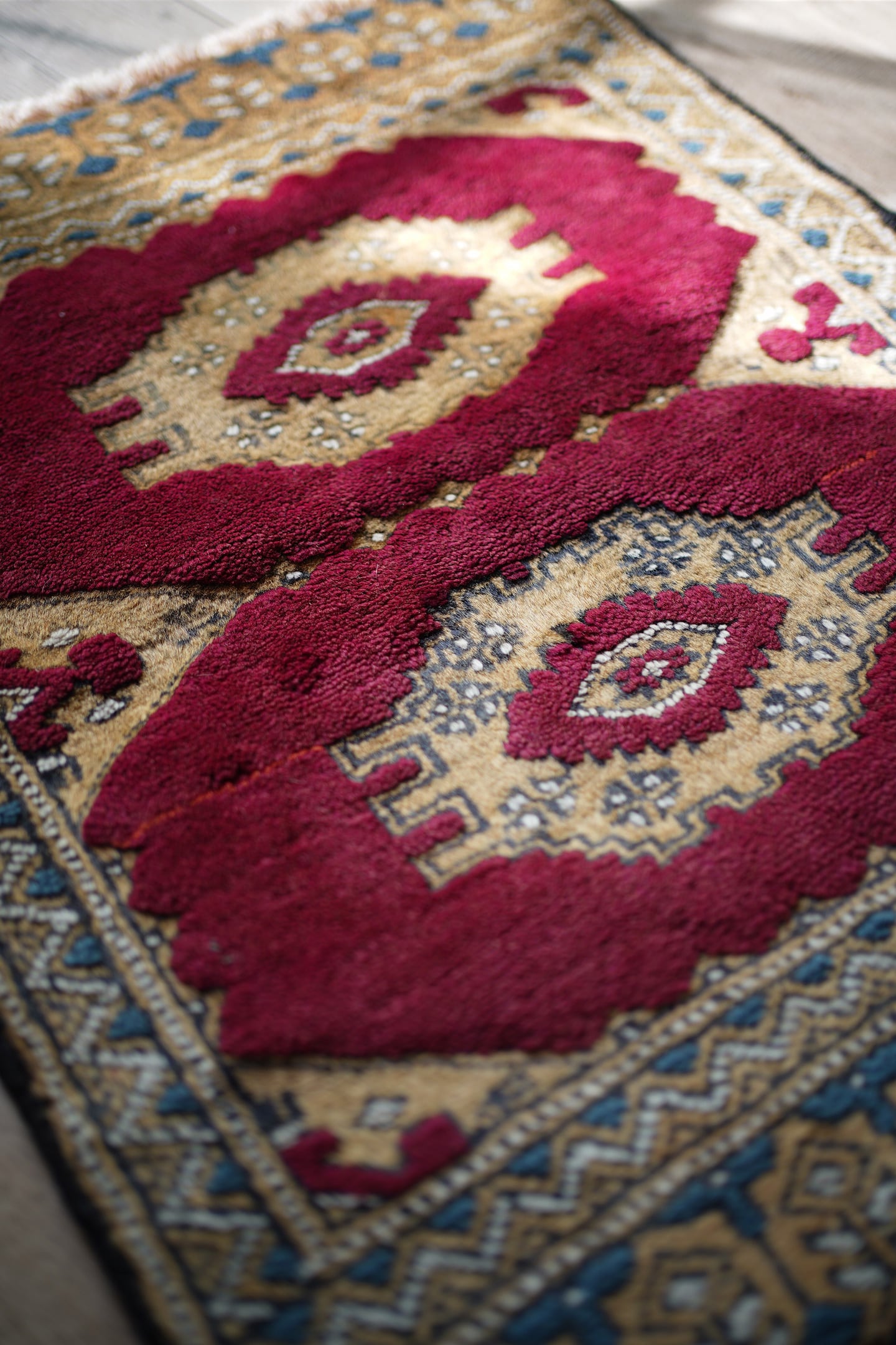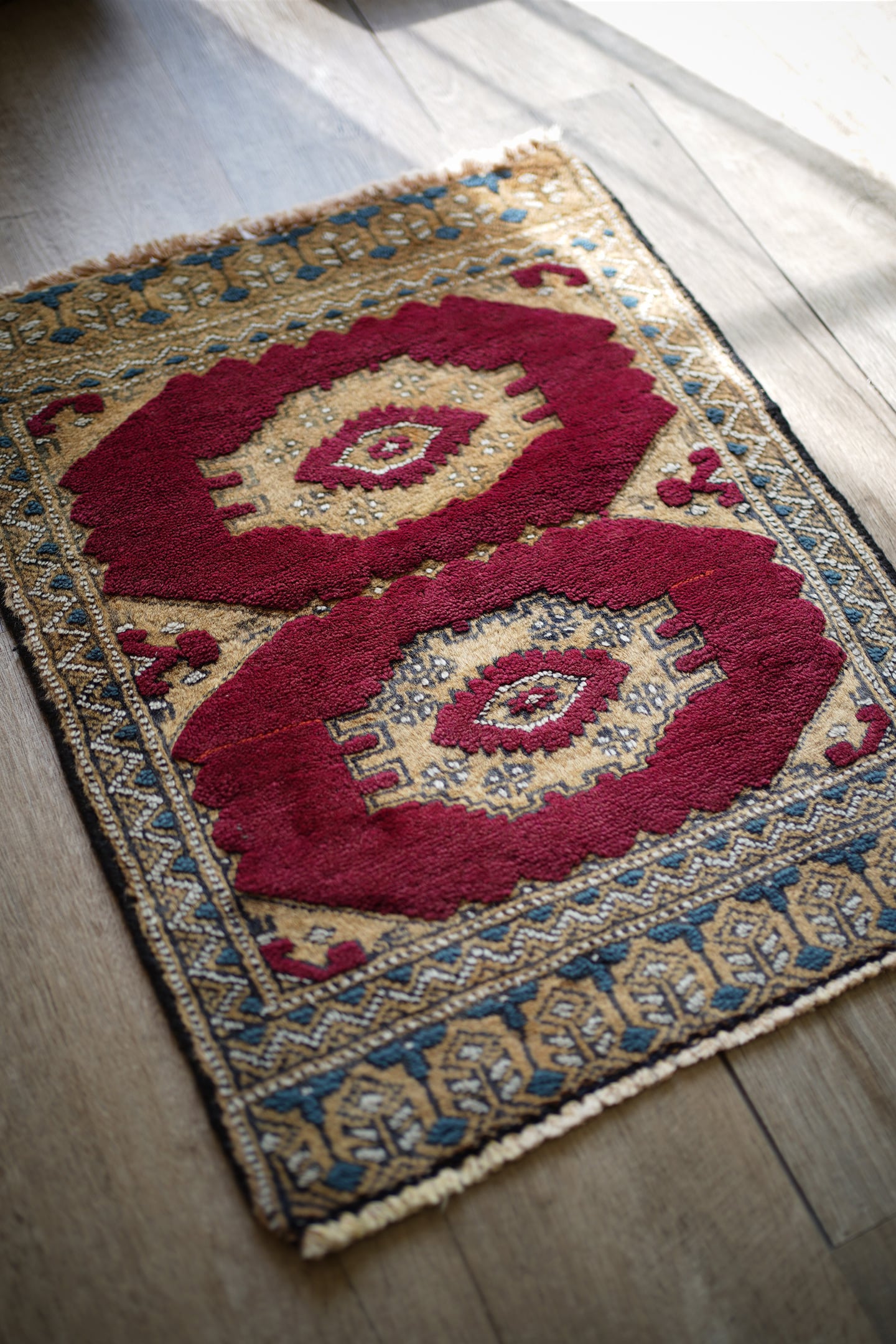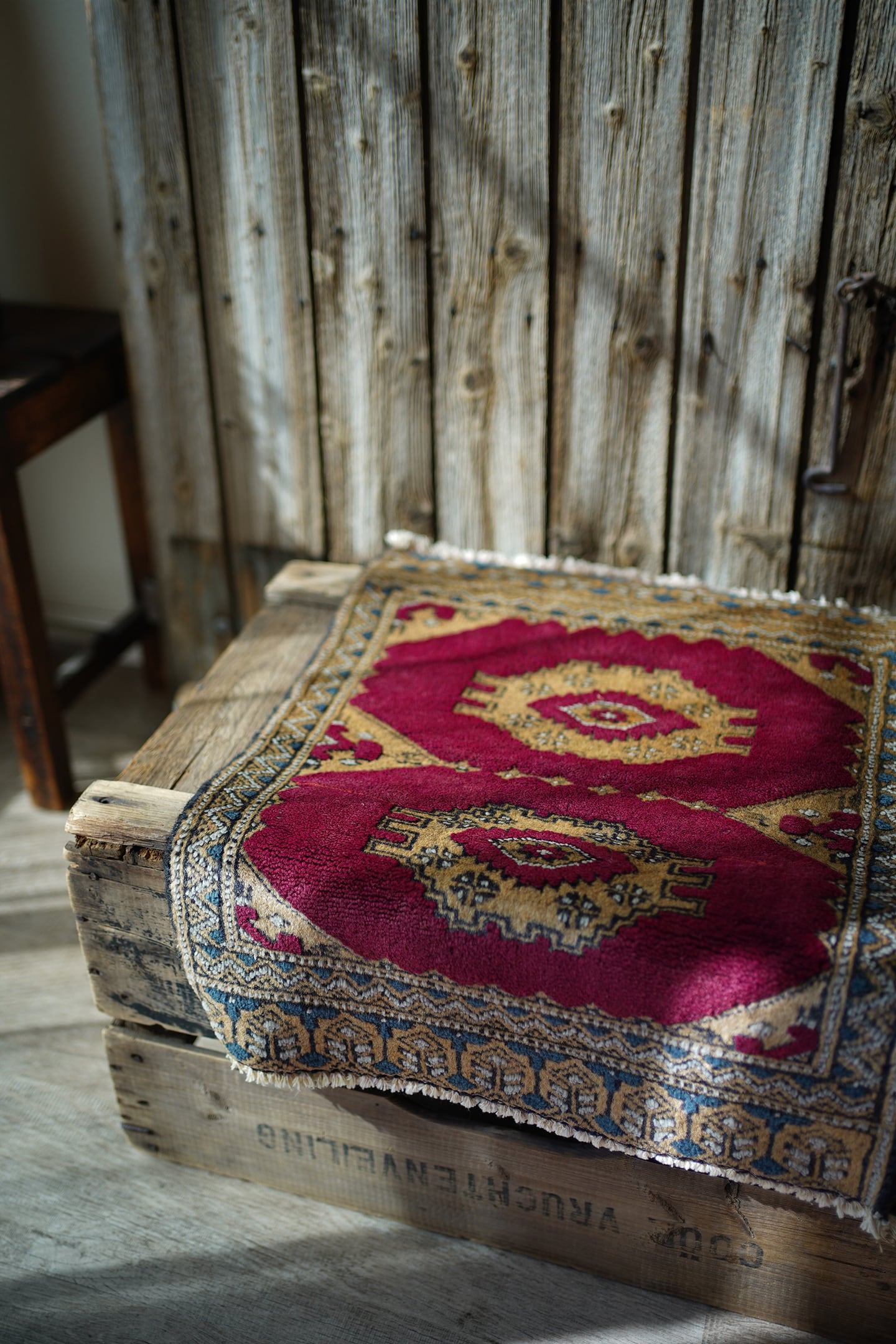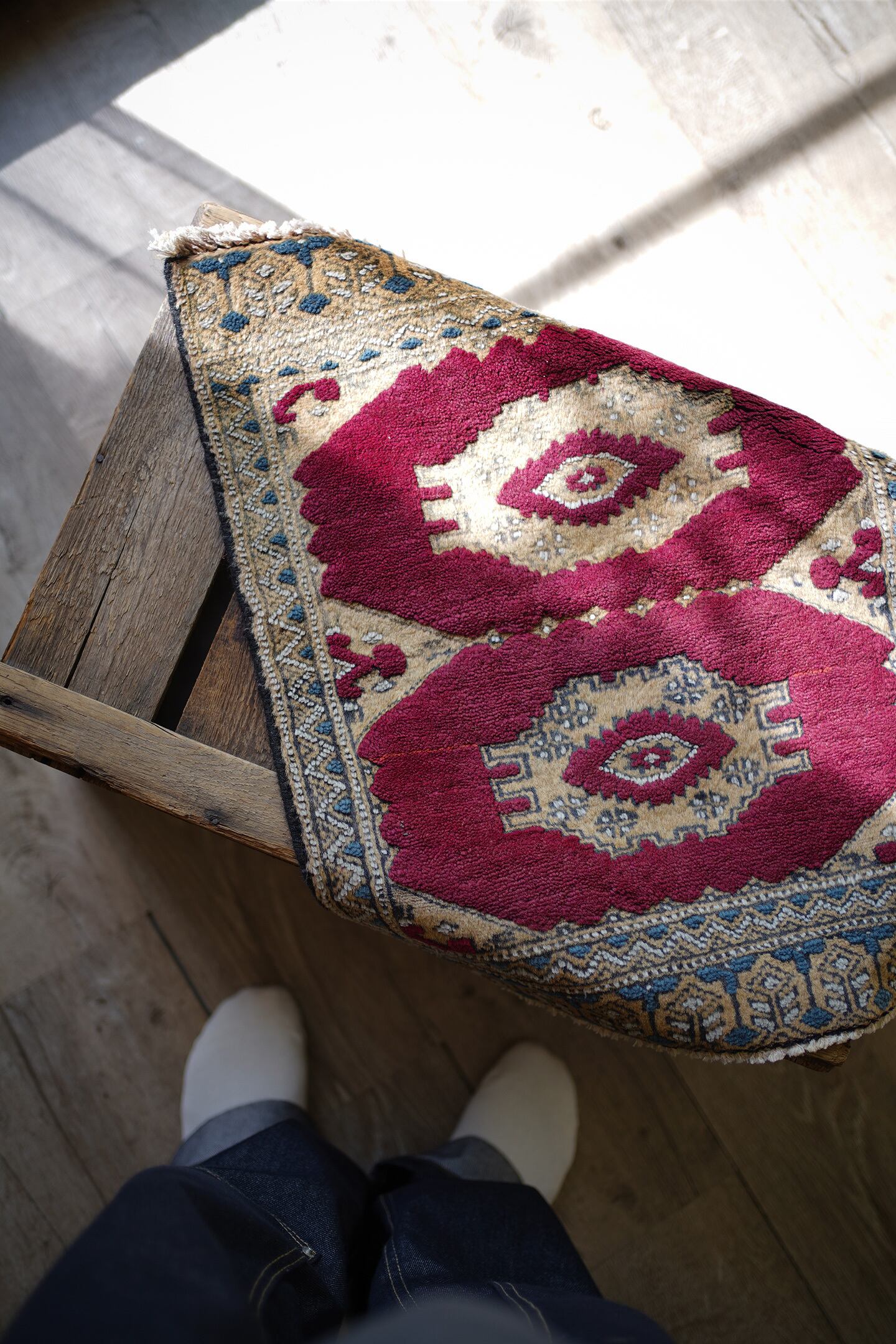 モコモコとした表面が可愛らしい経年約40年のパキスタン産ラグ。ふわもちっとした気持ちの良い肌触りの表面で、赤紫色の箇所だけ少しだけ高さがあり、ふっくら盛り上がった面白い質感をしています。アフガニスタンのマシュワニラグなどで見かけるパイル織りと平織りをMIXした表面の凹凸はよくあるタイプですが、こちらはすべてパイル織りのラグとなります。配色は赤紫、ベージュブラウン、ブルーグリーン、グレーなど。厚みは6mm〜8mm程度。裏に何か貼り付けてあったような跡がございますが、全体的にコンディションは良く、ご使用には問題ありません(お写真にてご確認ください)。また補修により異なる色の糸を使っている箇所がございます。全身鏡の前に敷いたり、ちょっとしたスペースにどうぞ♪