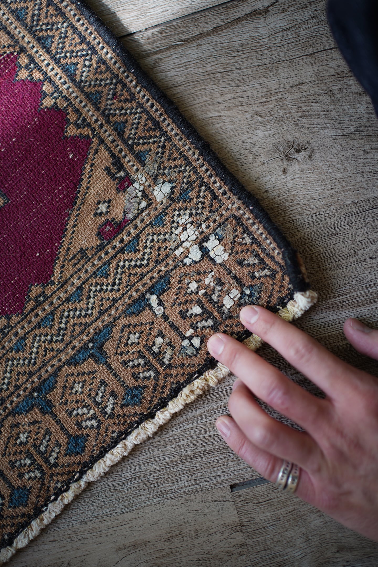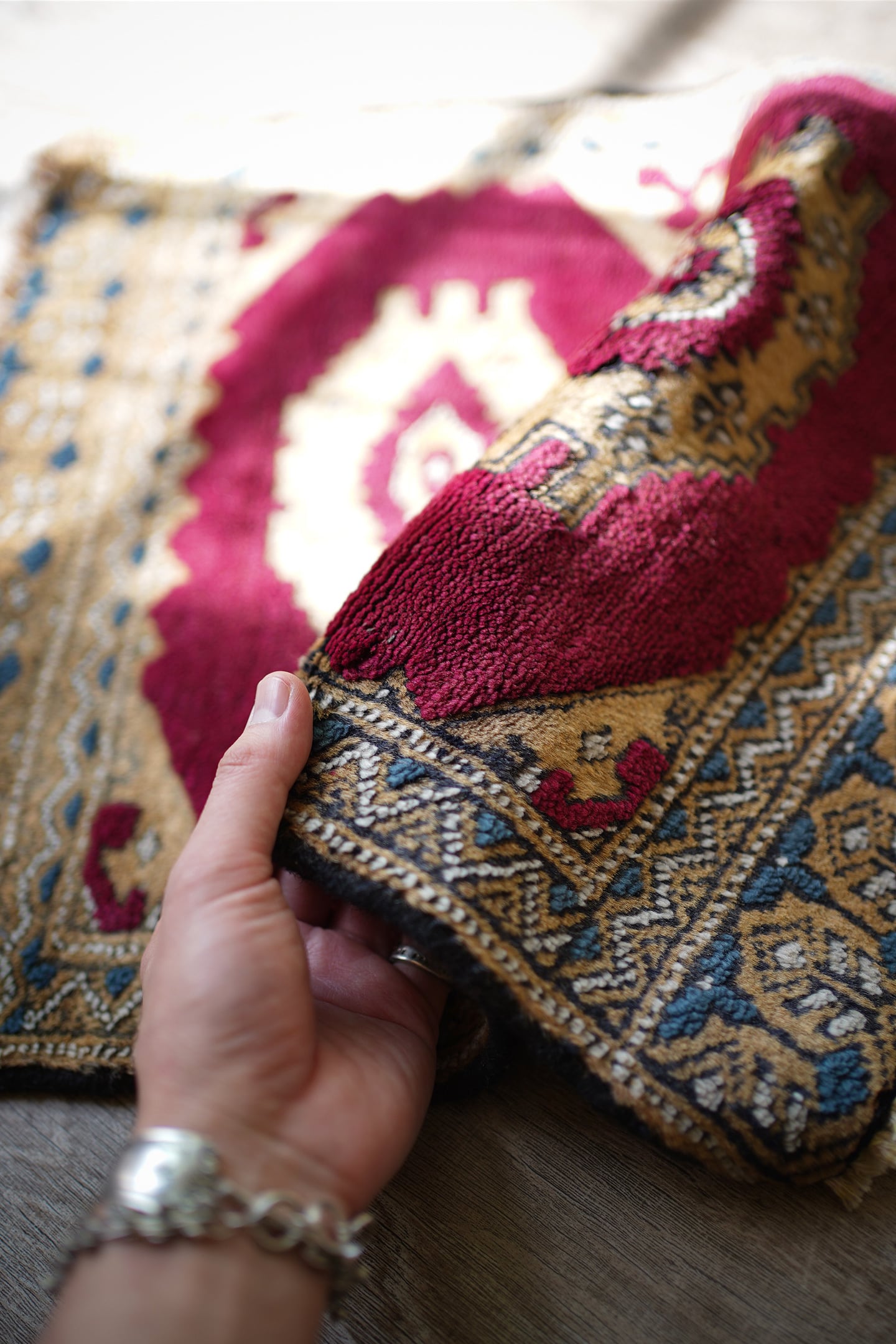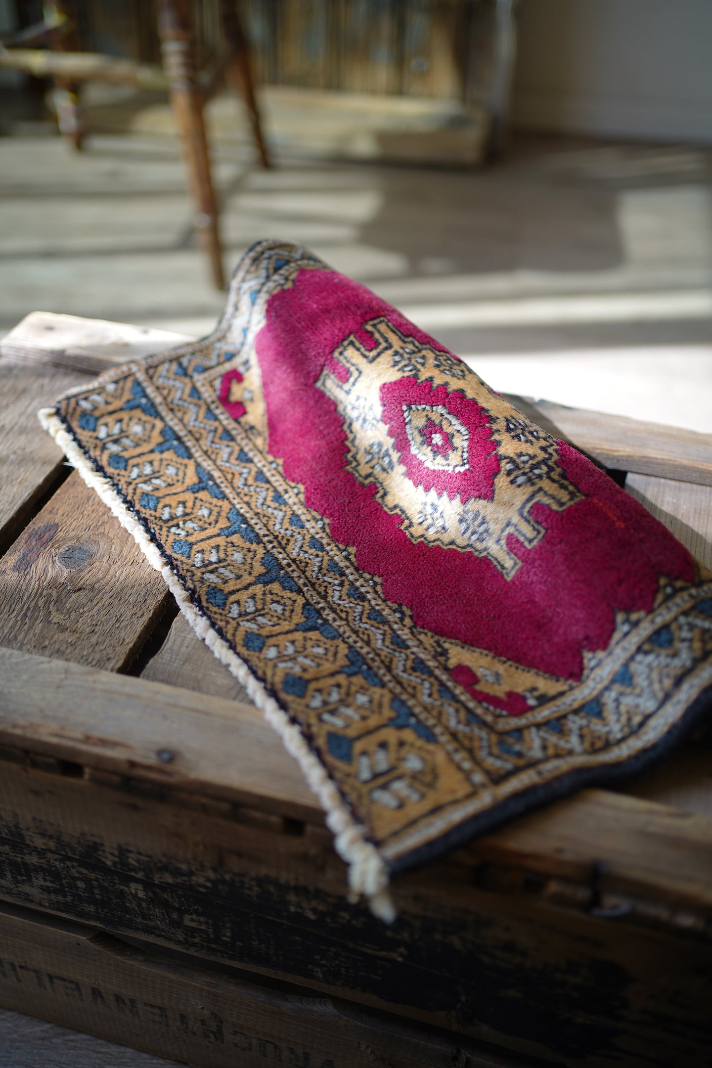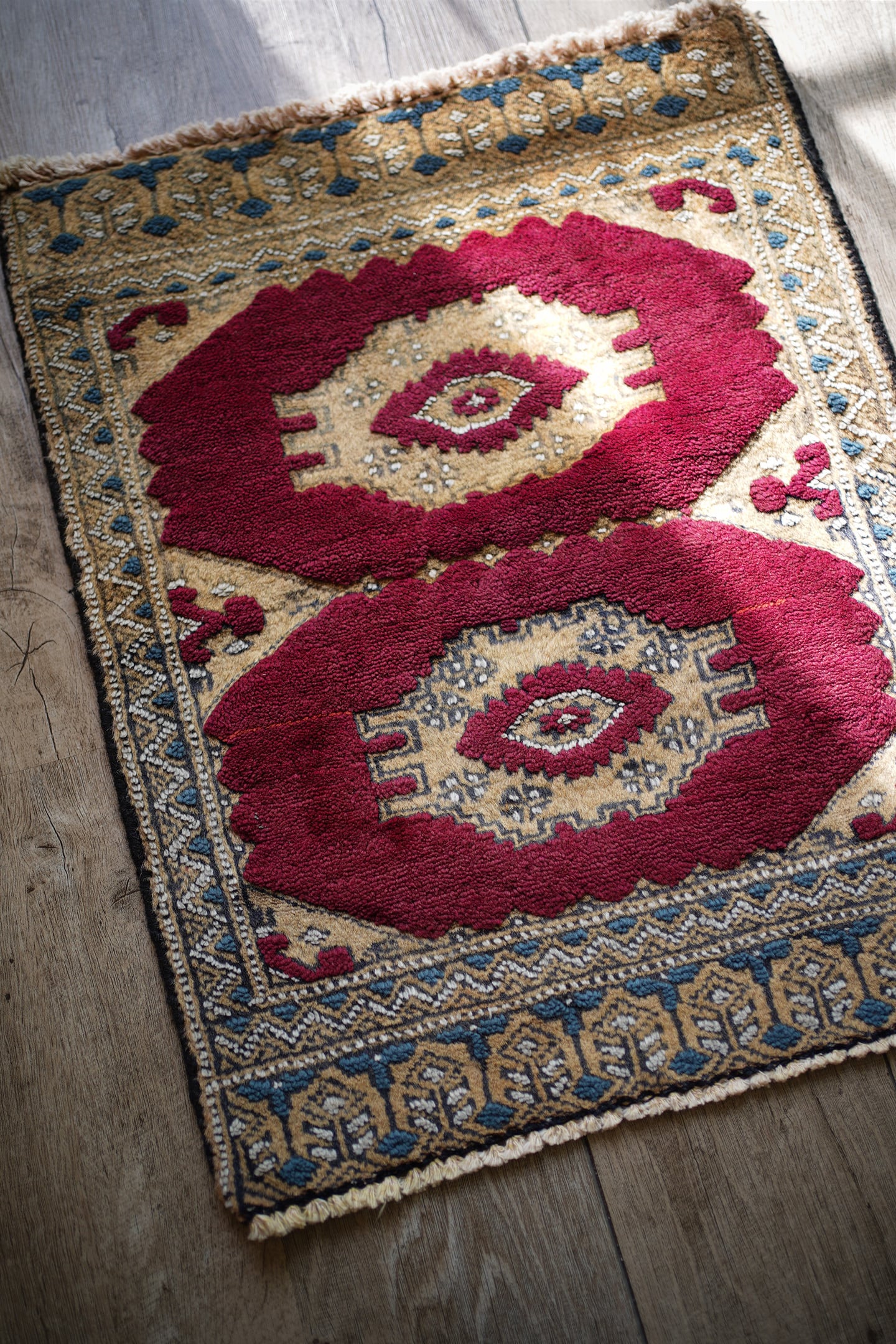 モコモコとした表面が可愛らしい経年約40年のパキスタン産ラグ。ふわもちっとした気持ちの良い肌触りの表面で、赤紫色の箇所だけ少しだけ高さがあり、ふっくら盛り上がった面白い質感をしています。アフガニスタンのマシュワニラグなどで見かけるパイル織りと平織りをMIXした表面の凹凸はよくあるタイプですが、こちらはすべてパイル織りのラグとなります。配色は赤紫、ベージュブラウン、ブルーグリーン、グレーなど。厚みは6mm〜8mm程度。裏に何か貼り付けてあったような跡がございますが、全体的にコンディションは良く、ご使用には問題ありません(お写真にてご確認ください)。また補修により異なる色の糸を使っている箇所がございます。全身鏡の前に敷いたり、ちょっとしたスペースにどうぞ♪