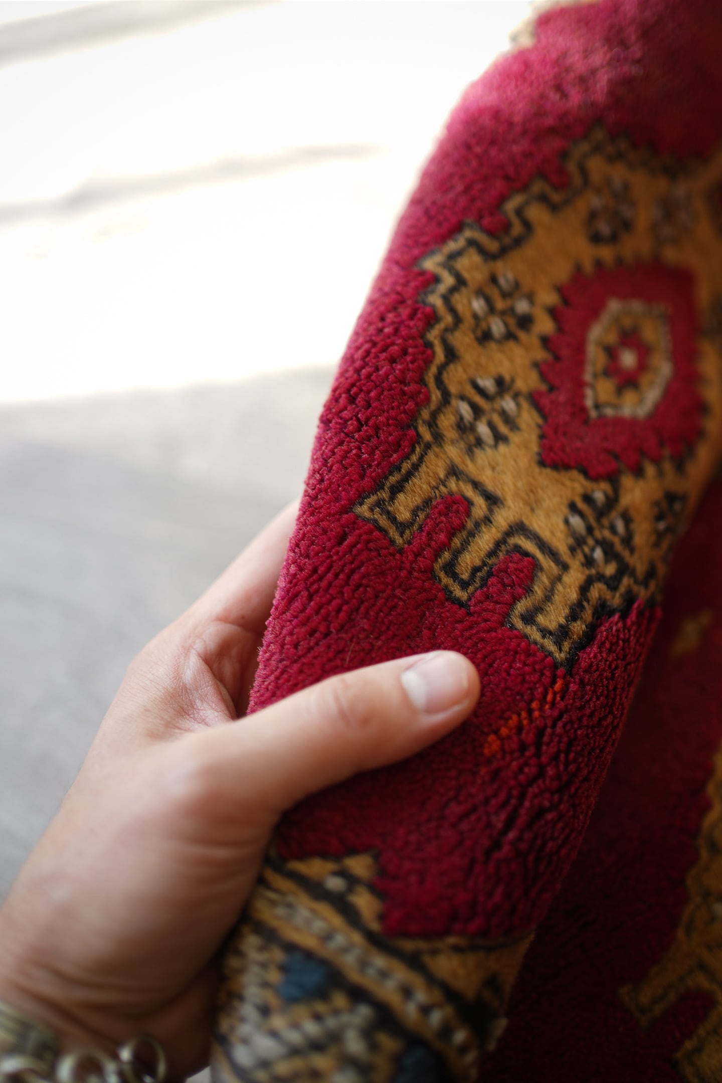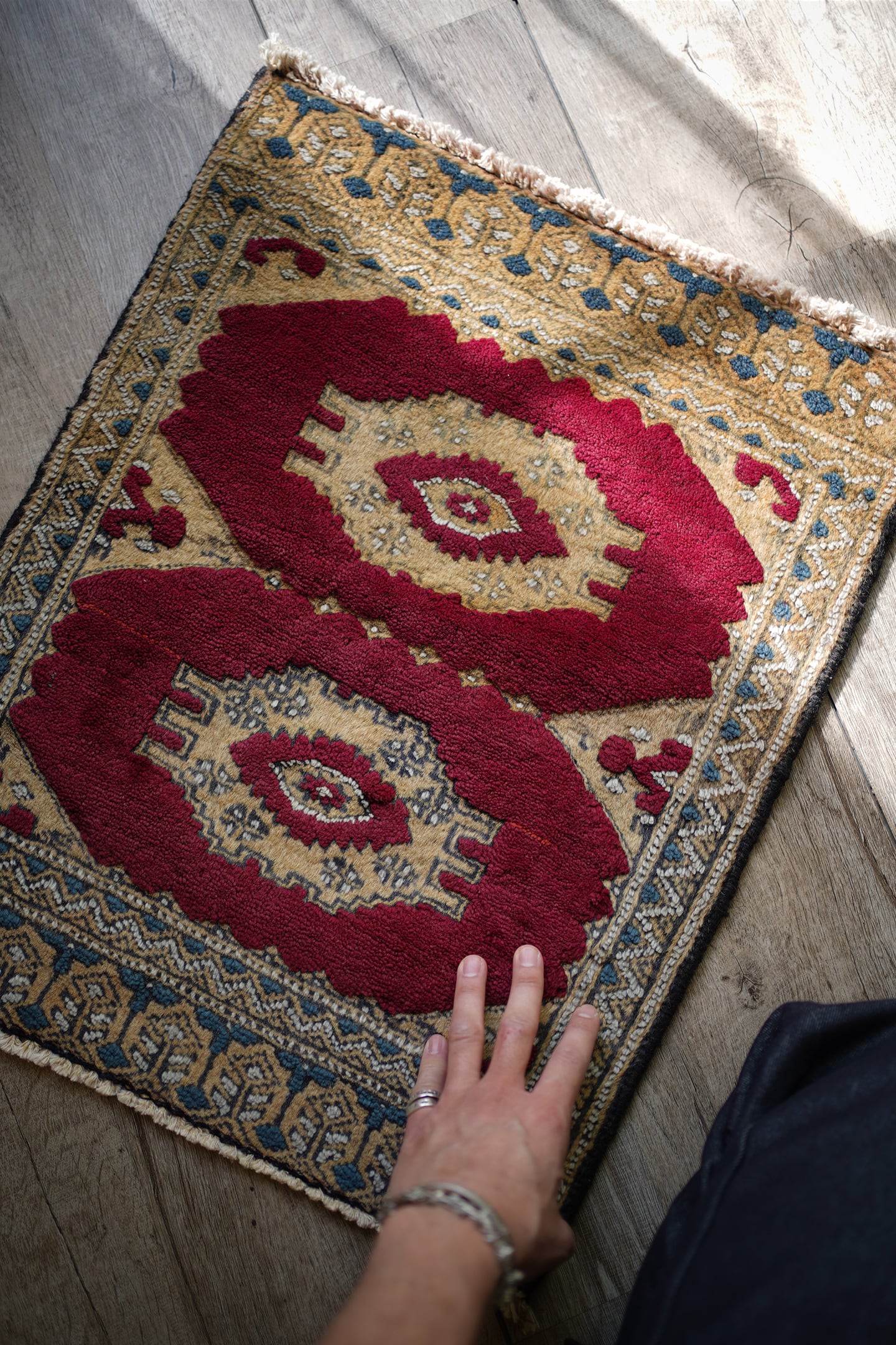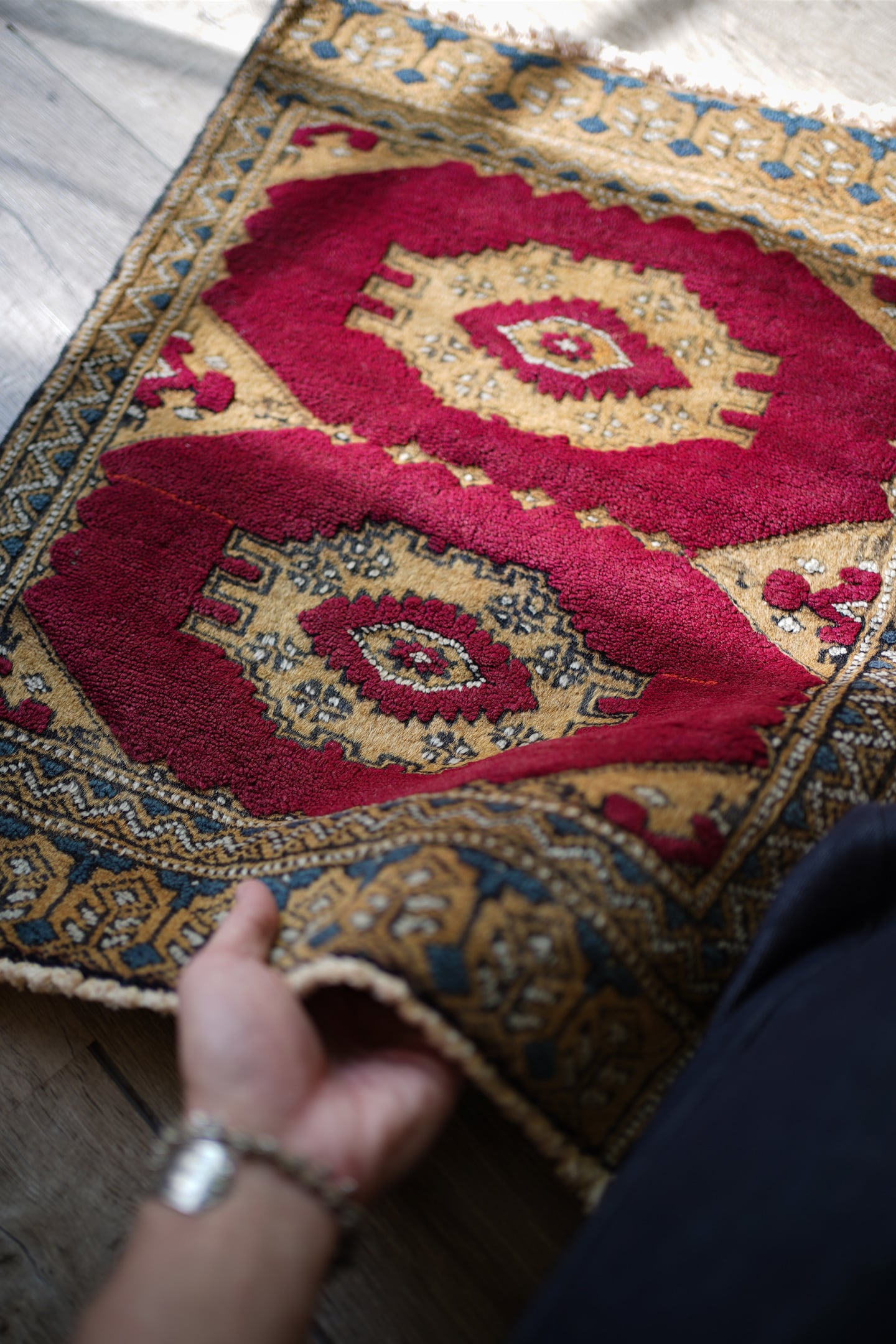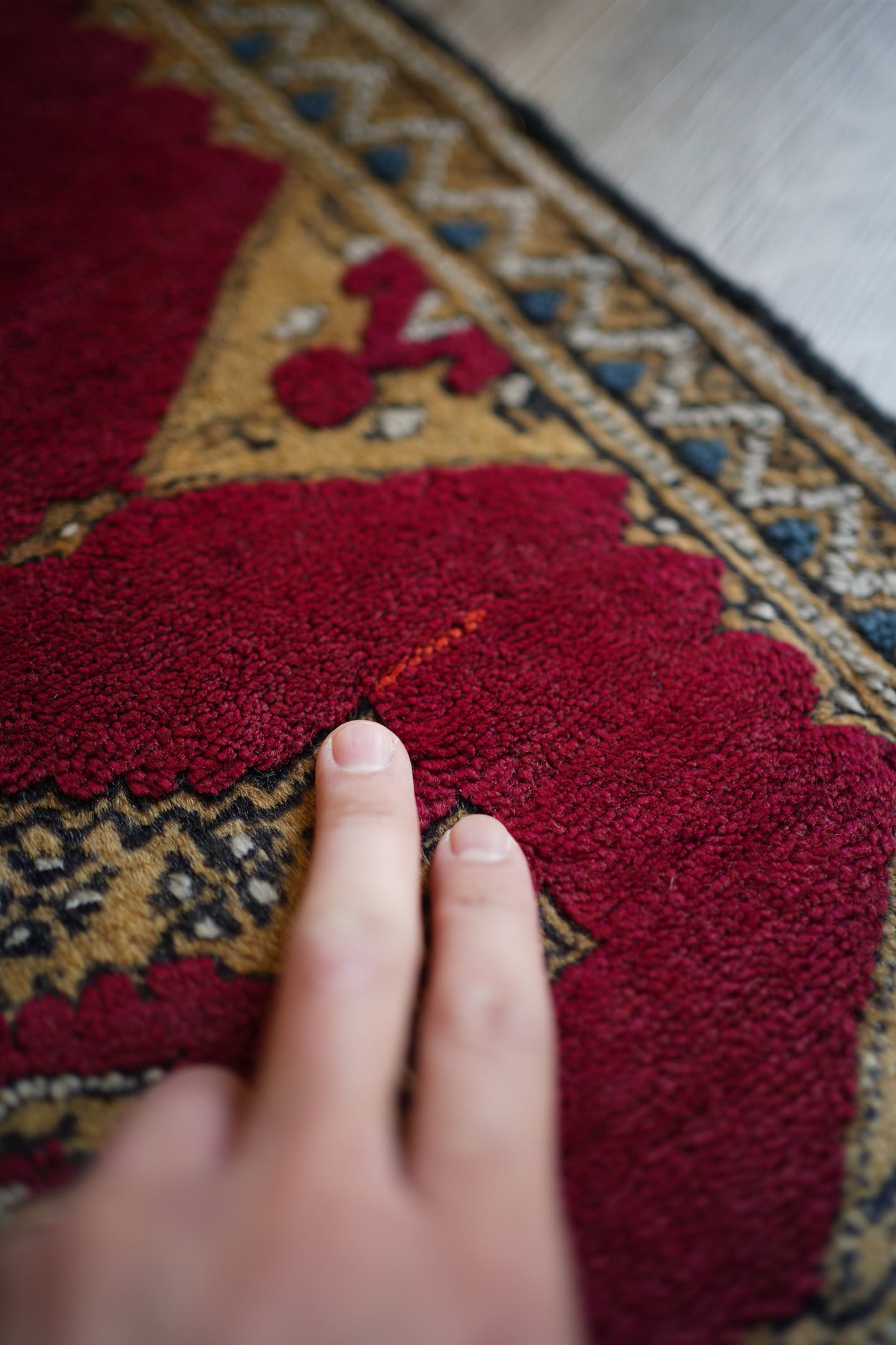 モコモコとした表面が可愛らしい経年約40年のパキスタン産ラグ。ふわもちっとした気持ちの良い肌触りの表面で、赤紫色の箇所だけ少しだけ高さがあり、ふっくら盛り上がった面白い質感をしています。アフガニスタンのマシュワニラグなどで見かけるパイル織りと平織りをMIXした表面の凹凸はよくあるタイプですが、こちらはすべてパイル織りのラグとなります。配色は赤紫、ベージュブラウン、ブルーグリーン、グレーなど。厚みは6mm〜8mm程度。裏に何か貼り付けてあったような跡がございますが、全体的にコンディションは良く、ご使用には問題ありません(お写真にてご確認ください)。また補修により異なる色の糸を使っている箇所がございます。全身鏡の前に敷いたり、ちょっとしたスペースにどうぞ♪