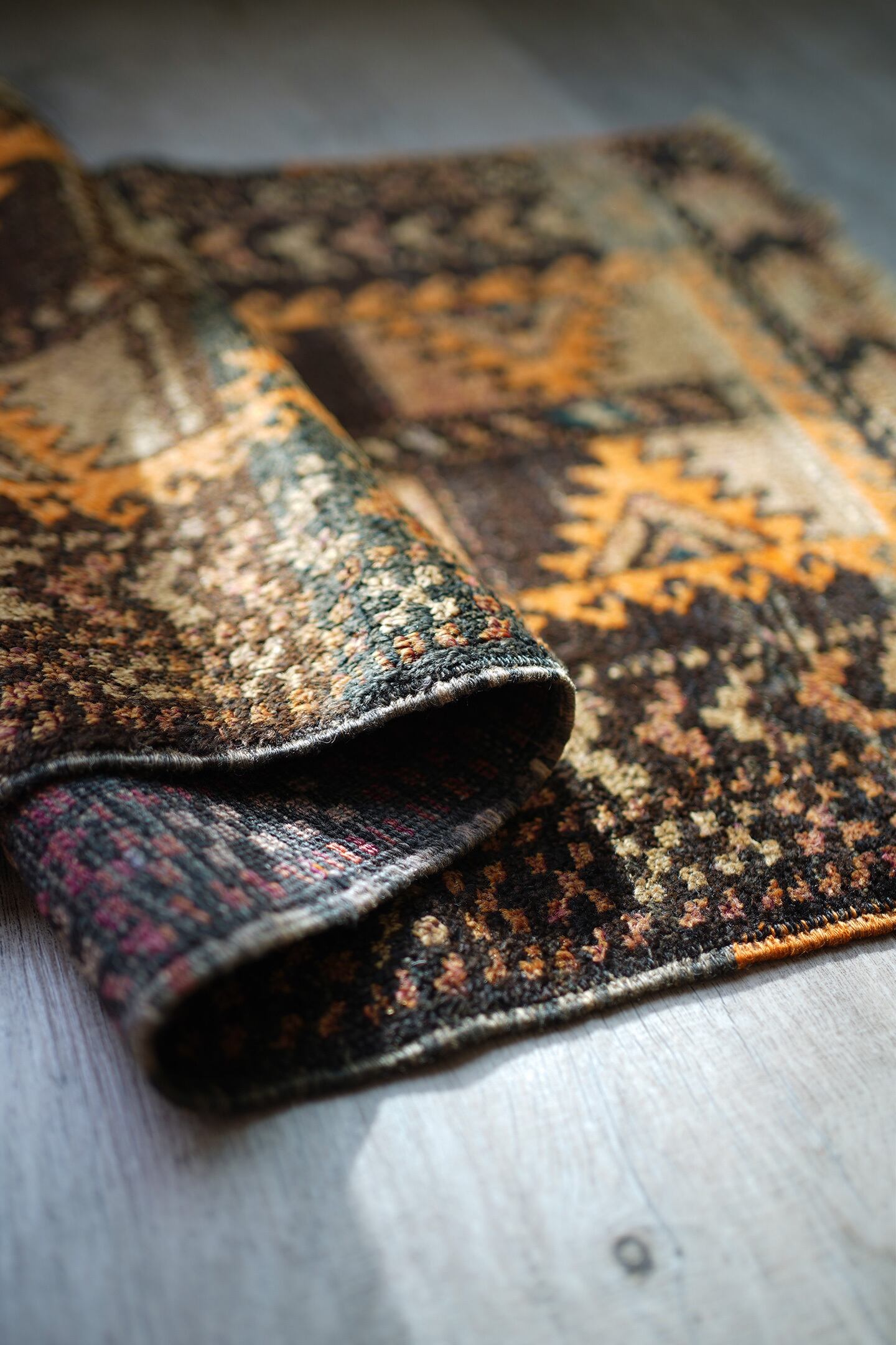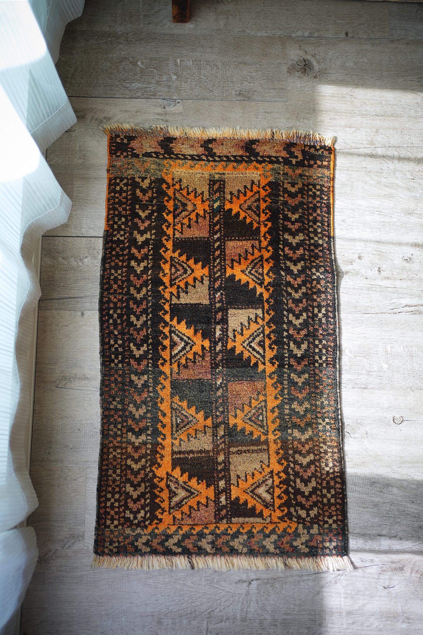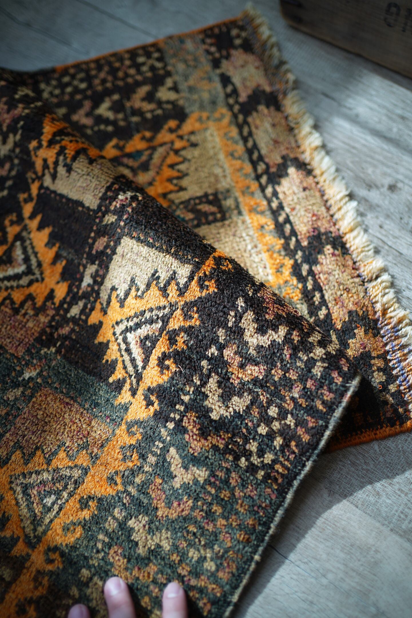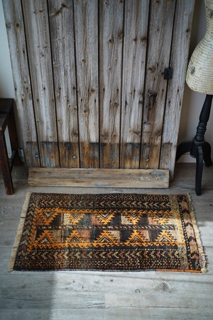 ギザギザの模様が特徴的な約80年前のセミアンティークのバルーチラグ。こちらのお品は"バーリシト"と呼ばれる遊牧民が家財道具や食材を入れる袋状のものを表面のみに加工して作られています。オレンジ、焦茶、ブラウンなどの配色で、観葉植物との相性が良さそうな色合いです。サラふわっとした滑らかで優しい肌触りで、厚みは4mm〜5mm程度。目立ったダメージなどもなく状態良好です。小さめのフラワーラックやフラワースタンド下などにもよろしいかと思います。