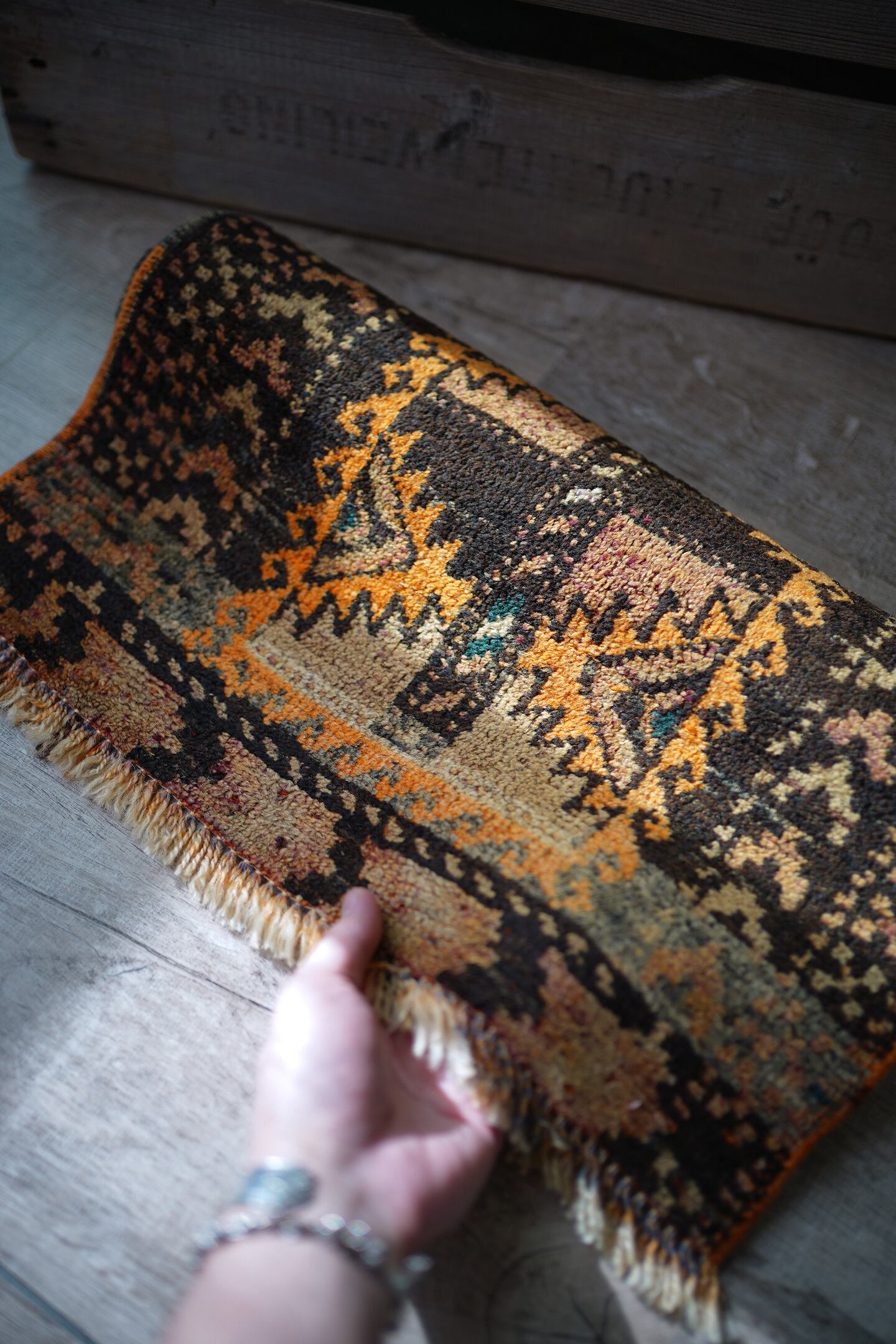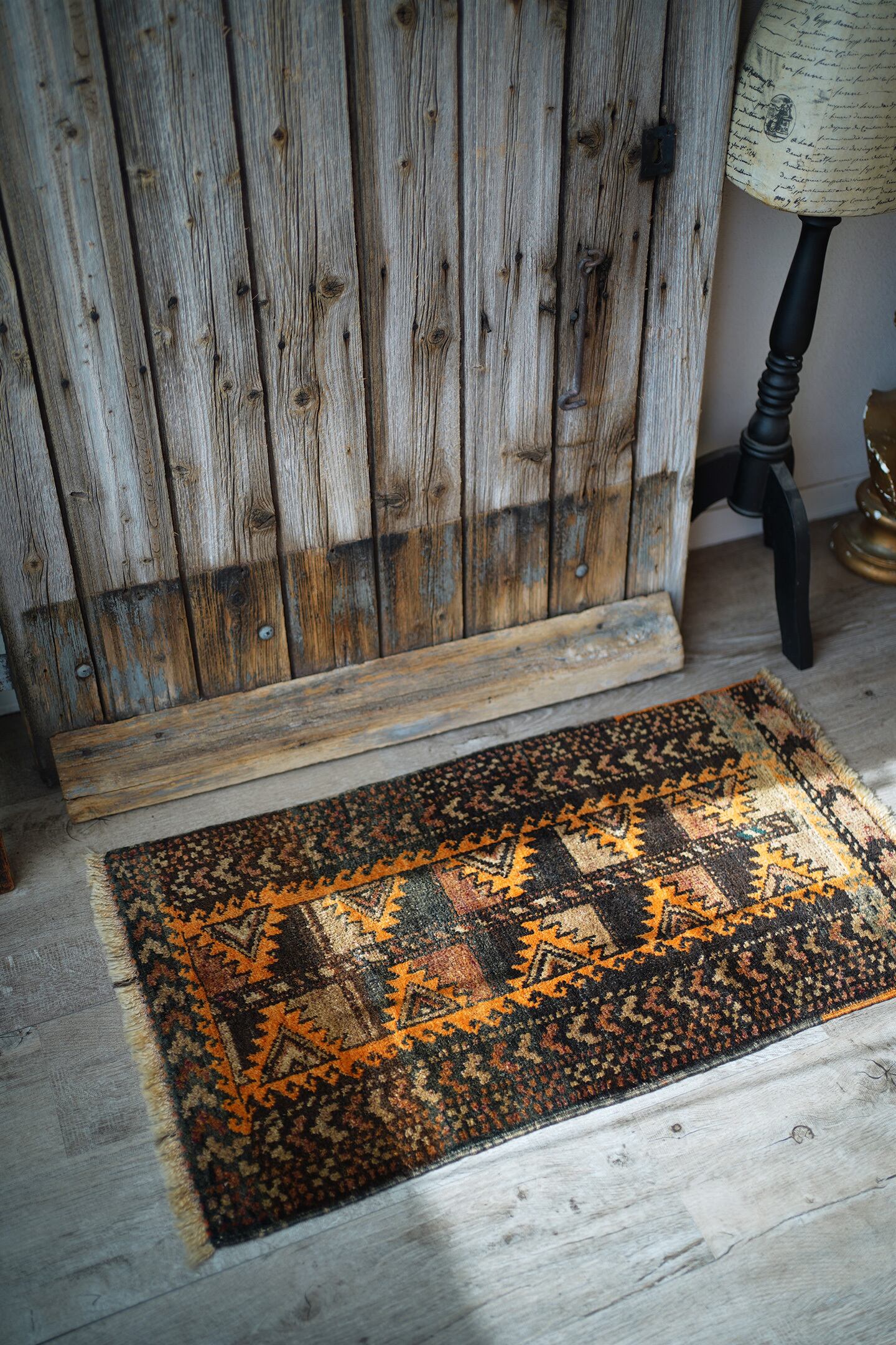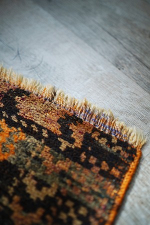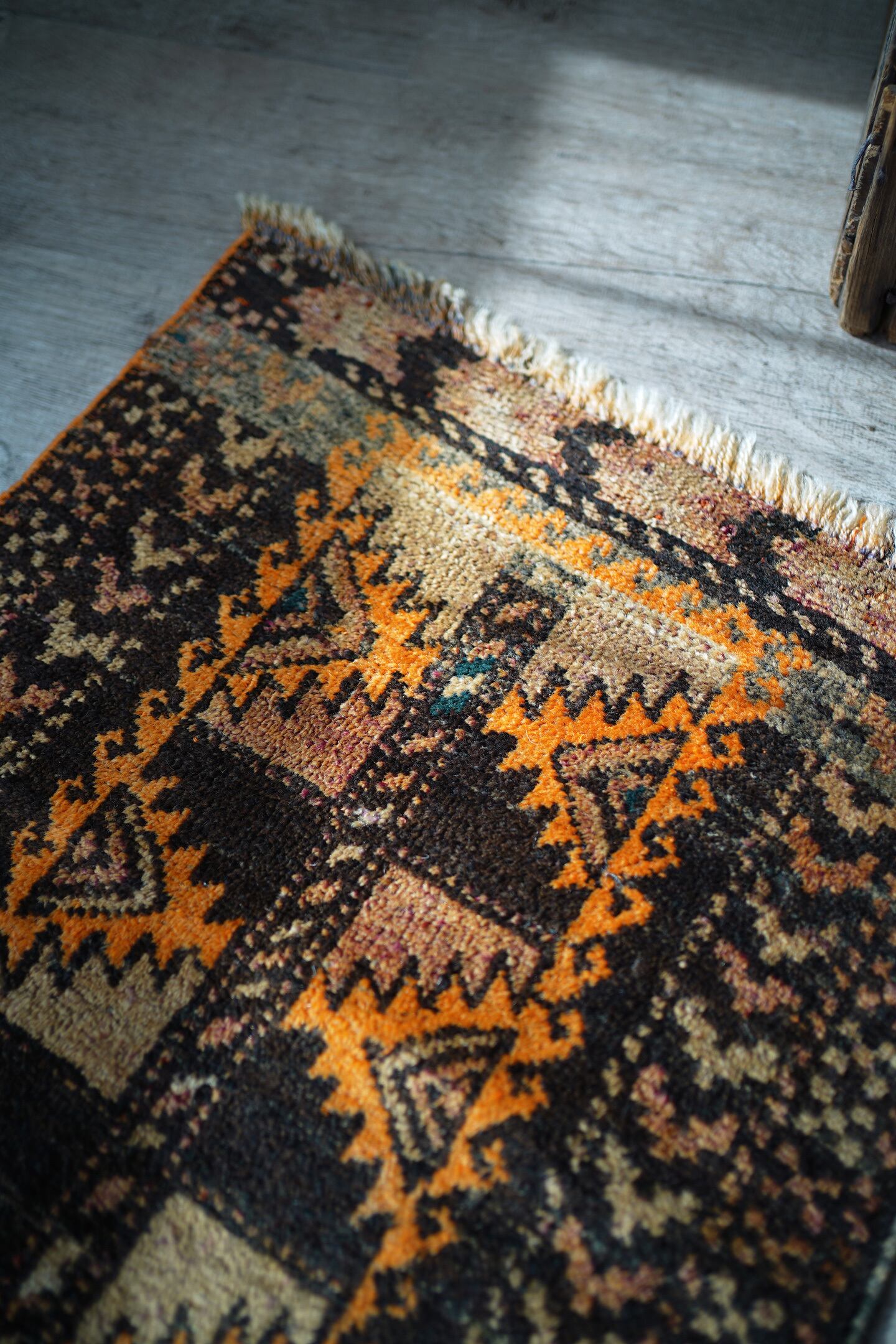ギザギザの模様が特徴的な約80年前のセミアンティークのバルーチラグ。こちらのお品は"バーリシト"と呼ばれる遊牧民が家財道具や食材を入れる袋状のものを表面のみに加工して作られています。オレンジ、焦茶、ブラウンなどの配色で、観葉植物との相性が良さそうな色合いです。サラふわっとした滑らかで優しい肌触りで、厚みは4mm〜5mm程度。目立ったダメージなどもなく状態良好です。小さめのフラワーラックやフラワースタンド下などにもよろしいかと思います。