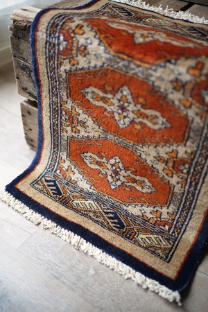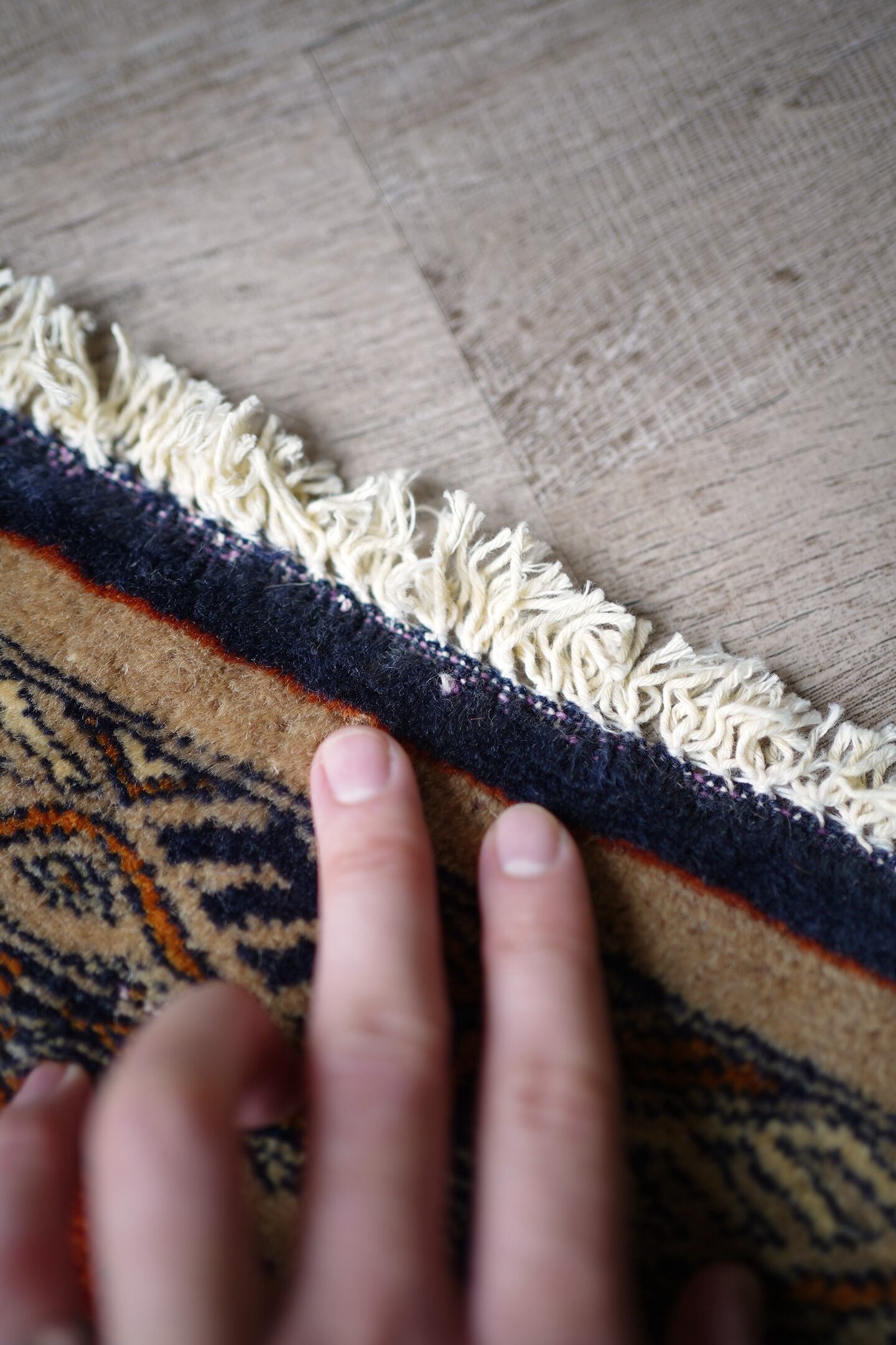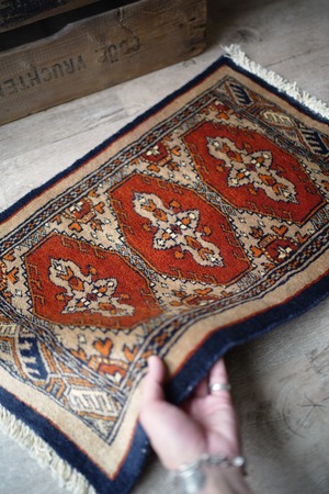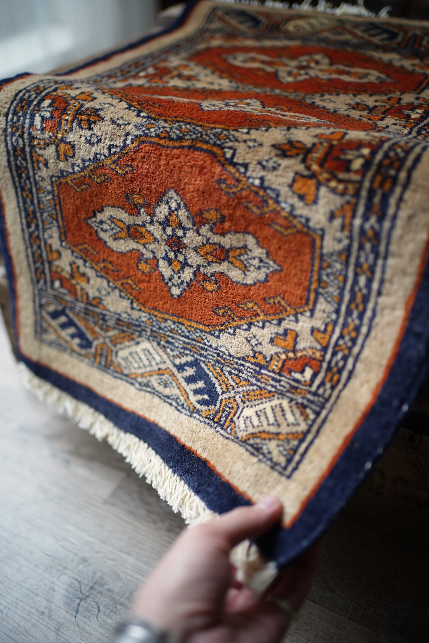 約30年前に織られたパキスタン産のラグです。ソフトウールで、ふわもちっとした気持ちの良い肌触りの一枚で、パイルに光が差し込むと艶も見受けられる美しい質感です。配色は暗めのオレンジ、ベージュ、濃紺など。厚みは7mm程度です。片側フリンジ箇所で少しだけパイルが薄くなっている箇所ありますが、全体的にはダメージなどもなく状態も大変良好です(お写真最後から2番目をご参照ください)。また裏面にうっすら文字の跡がございますので、お写真最後をご確認ください。棚の上に敷いて、観葉植物や小物類を上に置いたりすると、とってもオシャレになるのでオススメです♪