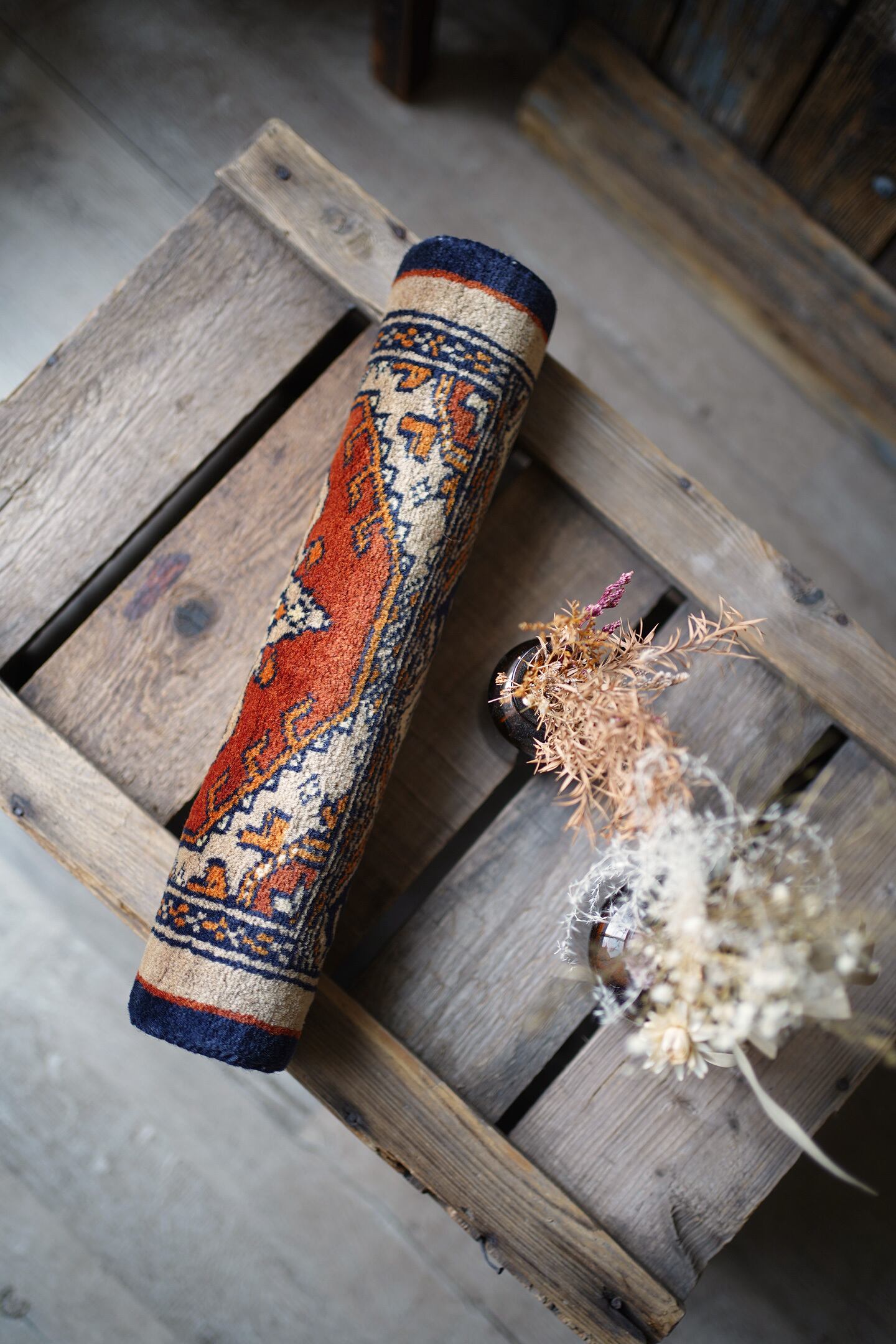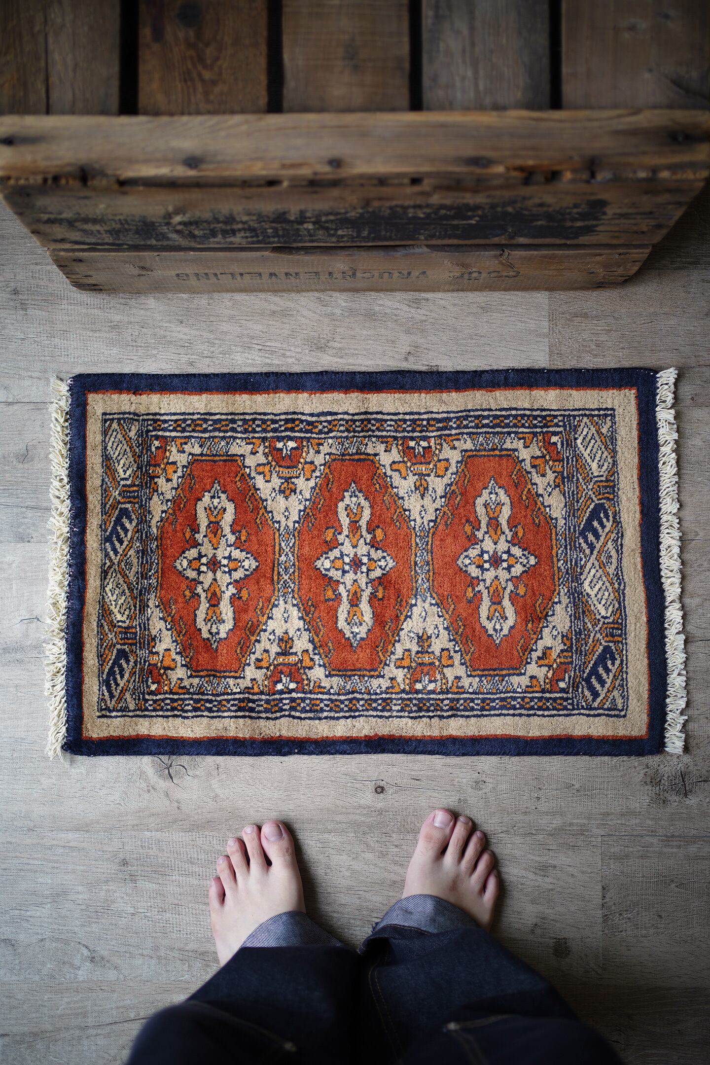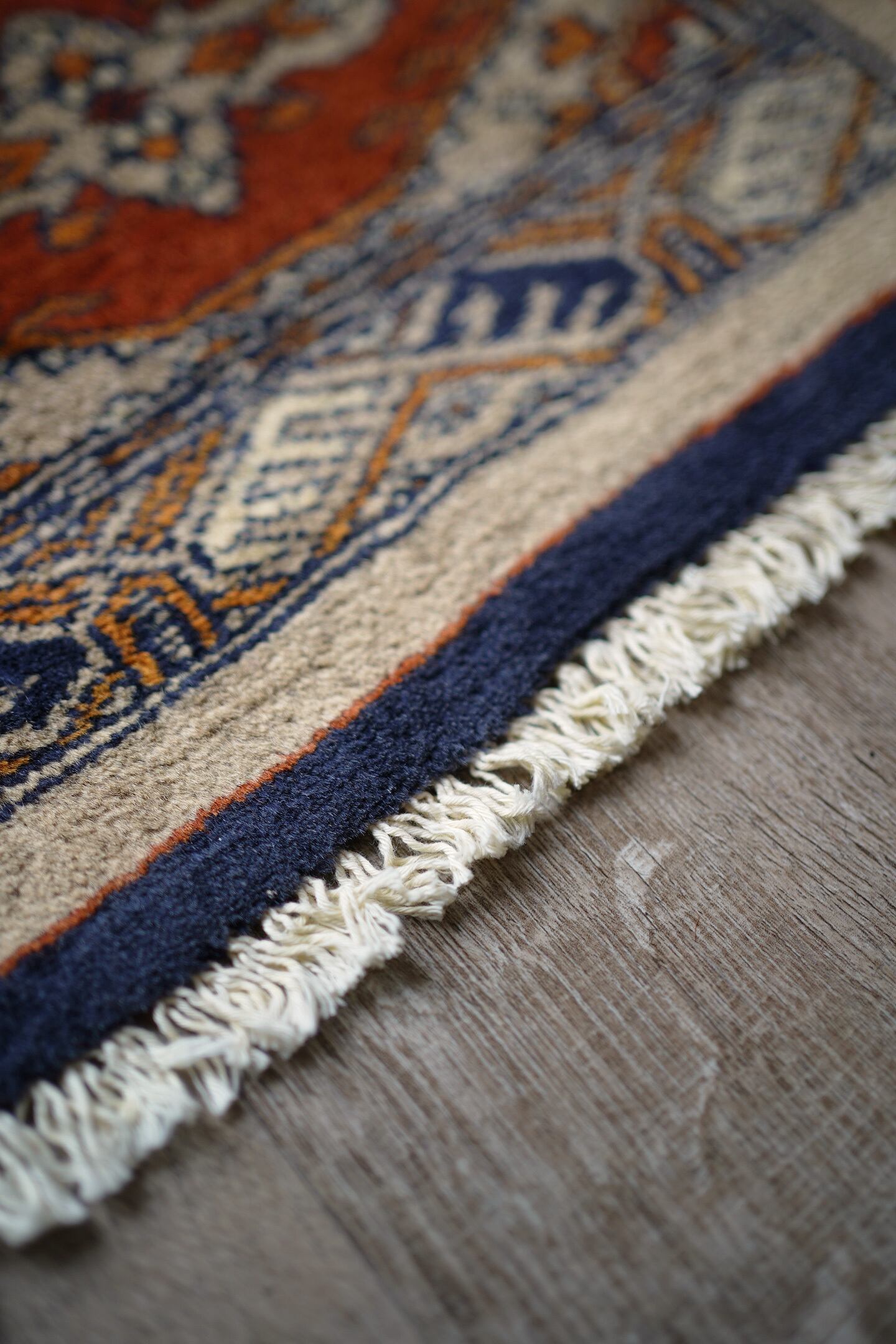 約30年前に織られたパキスタン産のラグです。ソフトウールで、ふわもちっとした気持ちの良い肌触りの一枚で、パイルに光が差し込むと艶も見受けられる美しい質感です。配色は暗めのオレンジ、ベージュ、濃紺など。厚みは7mm程度です。片側フリンジ箇所で少しだけパイルが薄くなっている箇所ありますが、全体的にはダメージなどもなく状態も大変良好です(お写真最後から2番目をご参照ください)。また裏面にうっすら文字の跡がございますので、お写真最後をご確認ください。棚の上に敷いて、観葉植物や小物類を上に置いたりすると、とってもオシャレになるのでオススメです♪