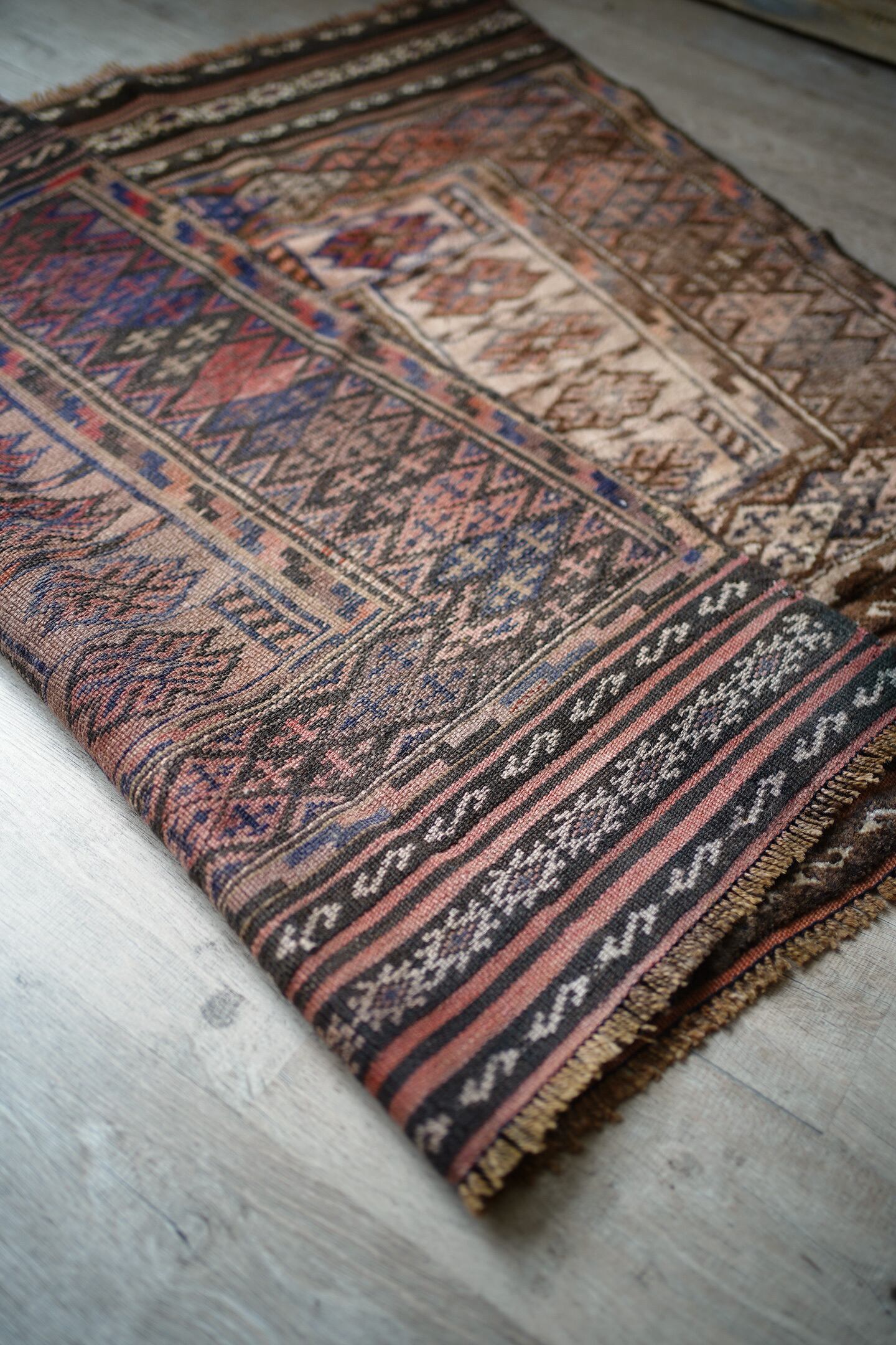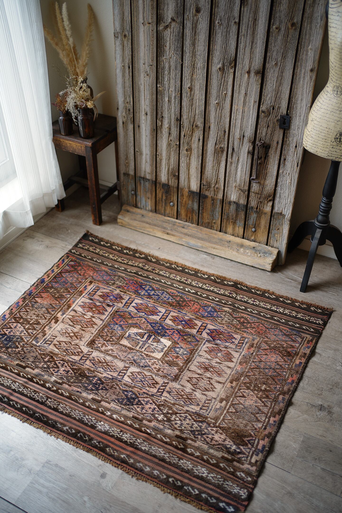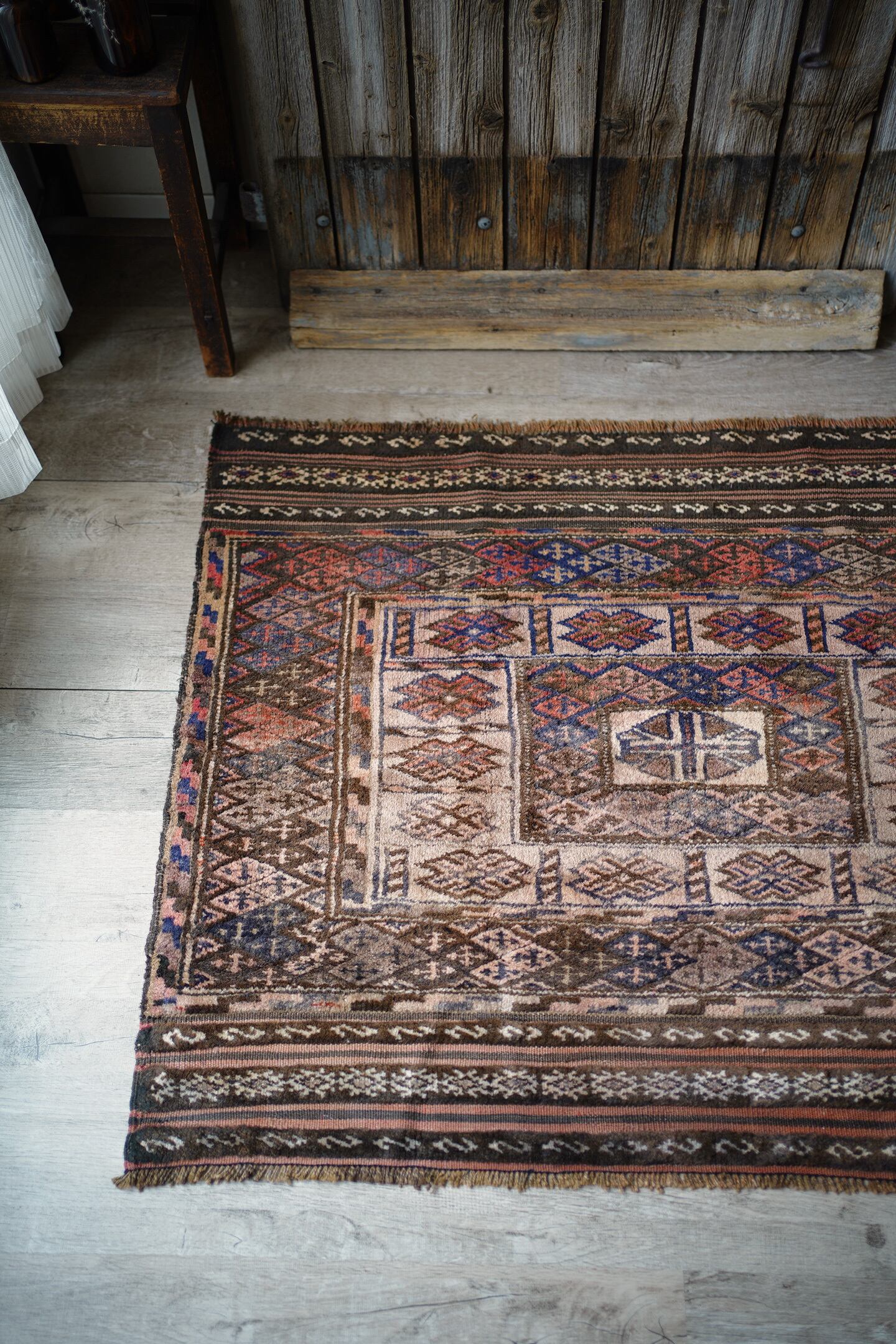 不思議な色合いが魅力の経年約45年のバルーチラグ。退色したブラウンと焦茶色の渋いカラーをベースに、濃紺・薄い赤がグラデーションのように織り込まれています。敷かれる向きによって色味の見え方がやや変わります。ソフトウールで、フワフワとした大変気持ちの良い肌触り。6mm〜8mm程度の厚みです。フリンジ近辺はキリムとパイルの凹凸の差がありますが、それ以外は全体的に平面な質感となっています。目立った補修跡もなく、状態も良好です。スクエアに近いサイズ感で、小さいデスク下に敷いたり、寒い時期は暖房器具と合わせたりしても良さそうです。